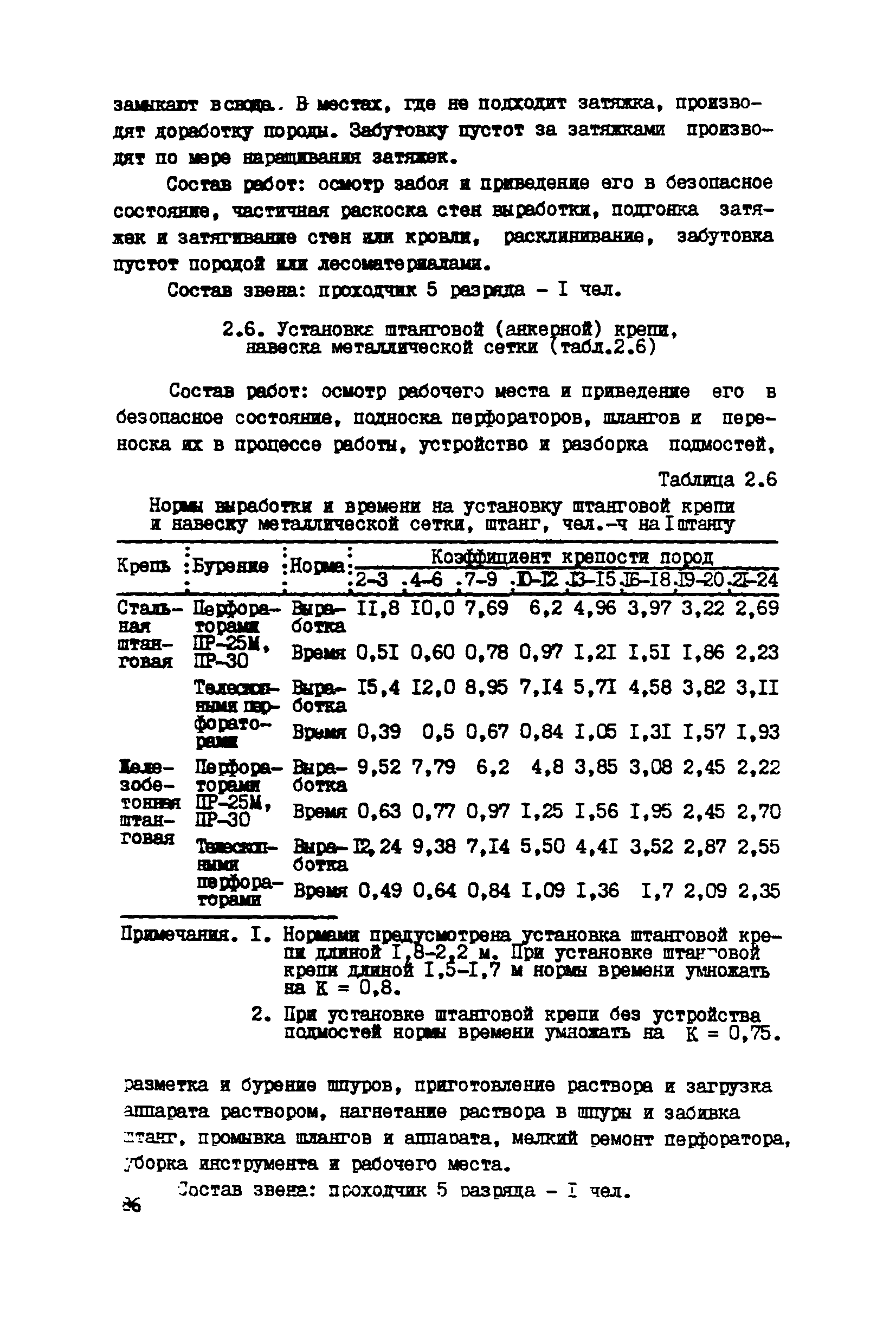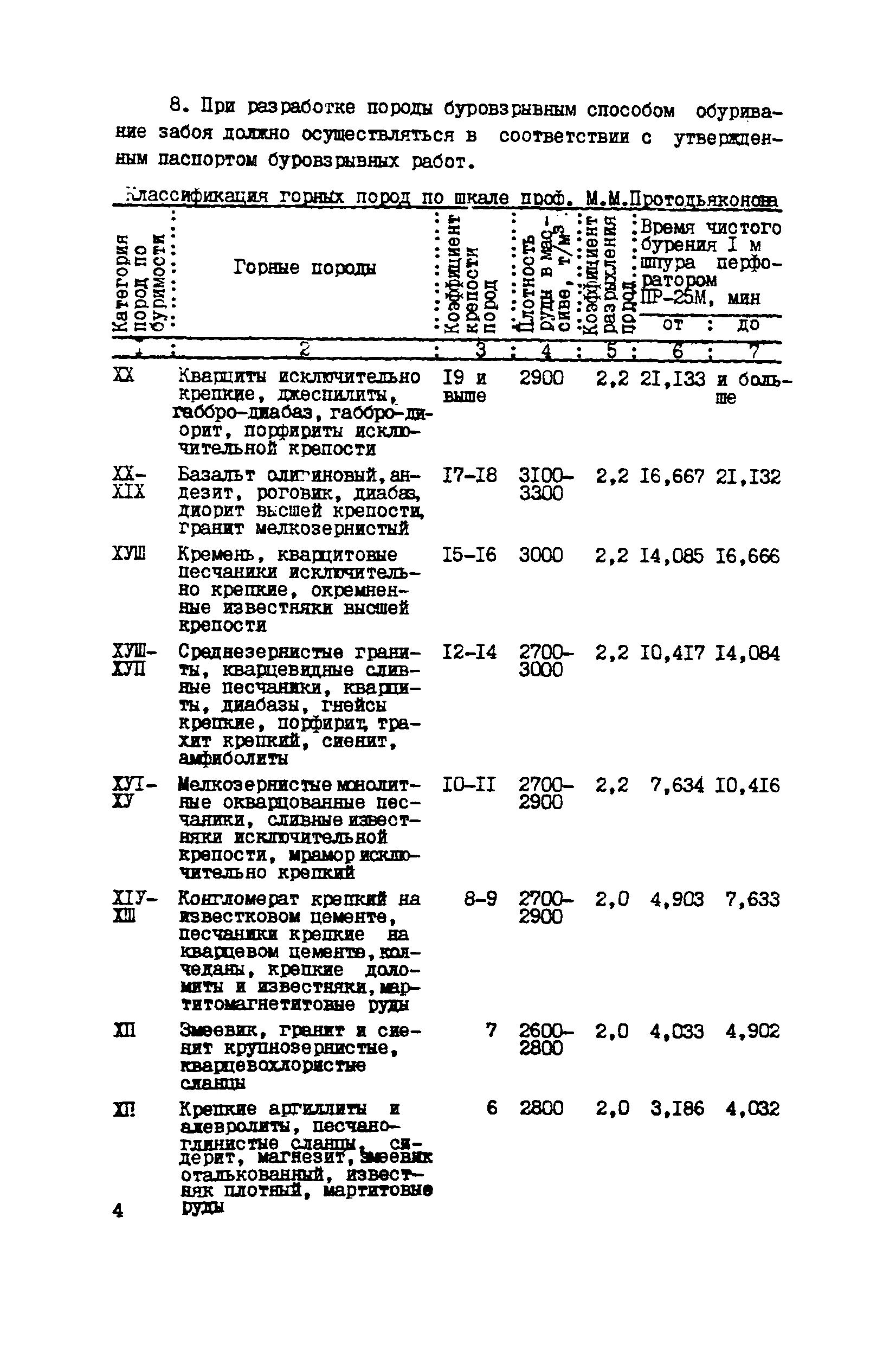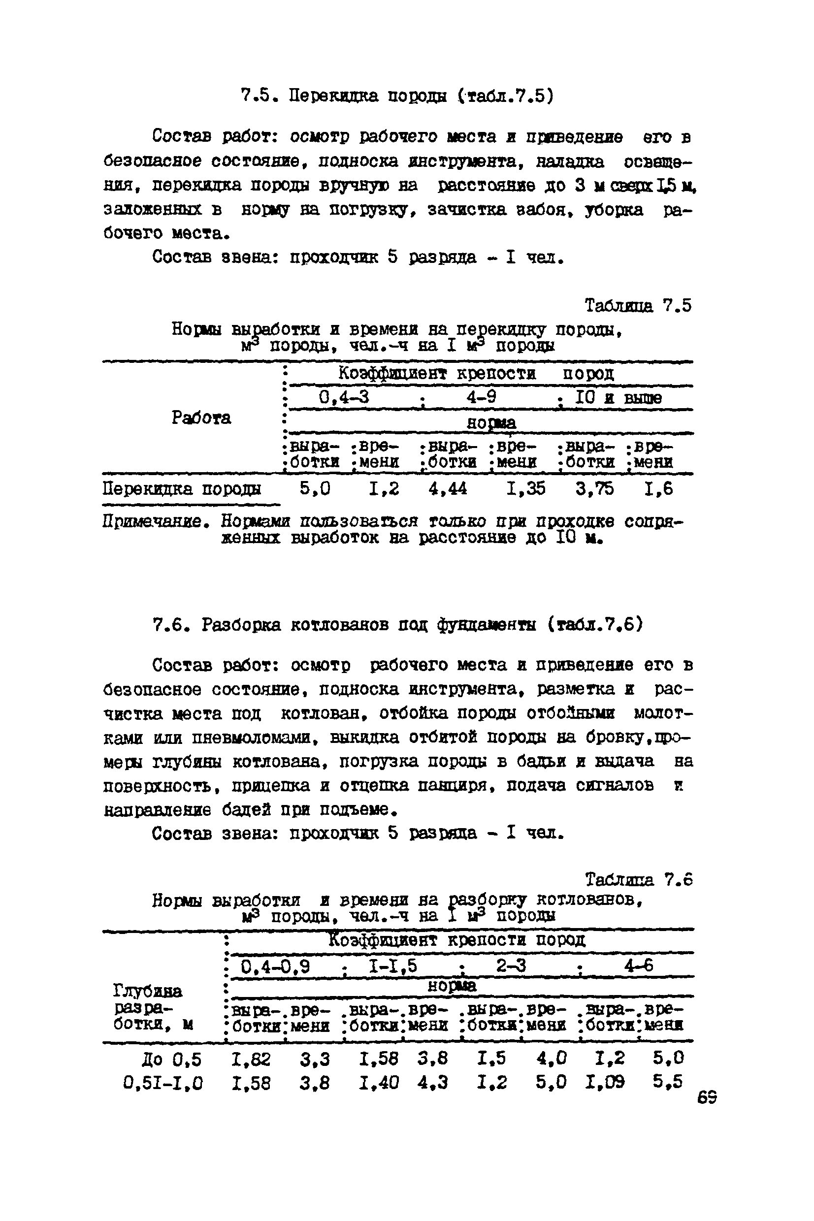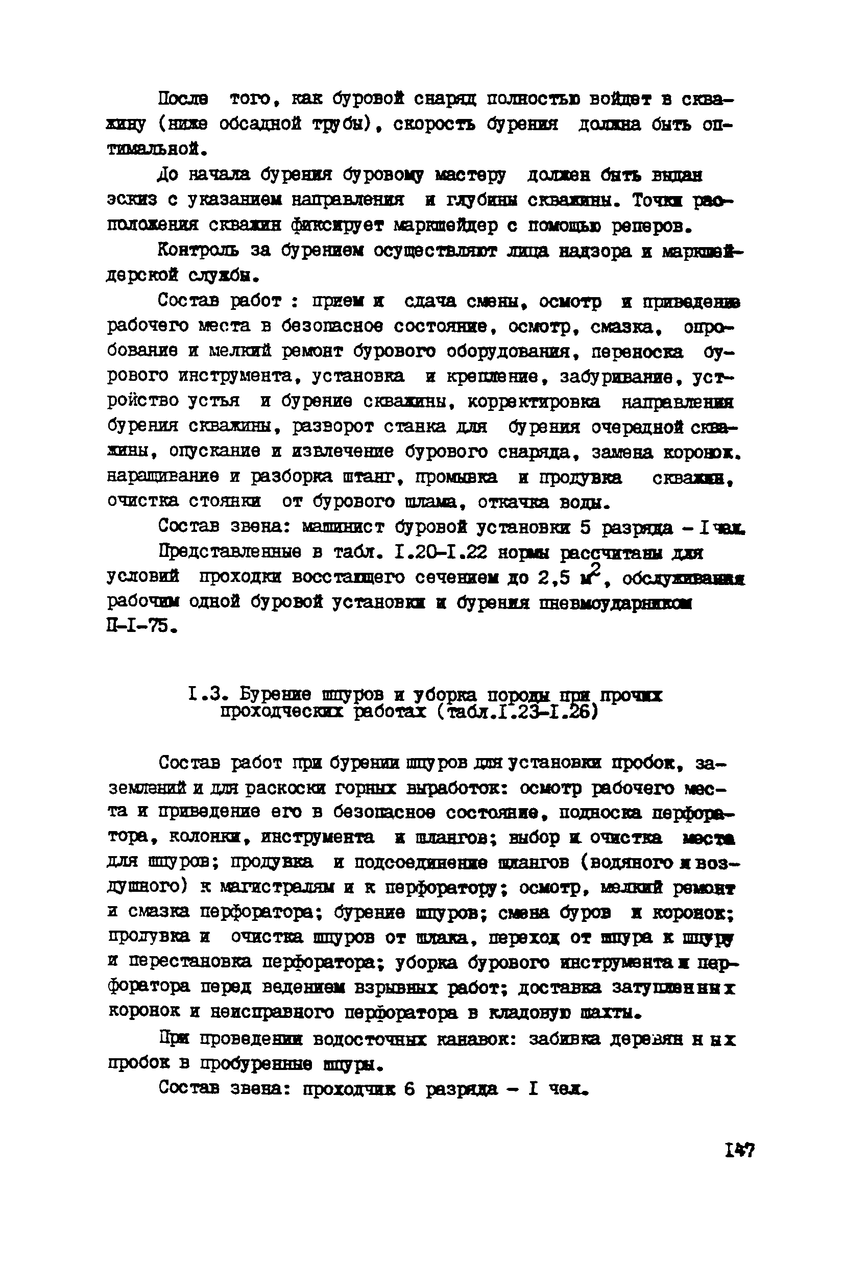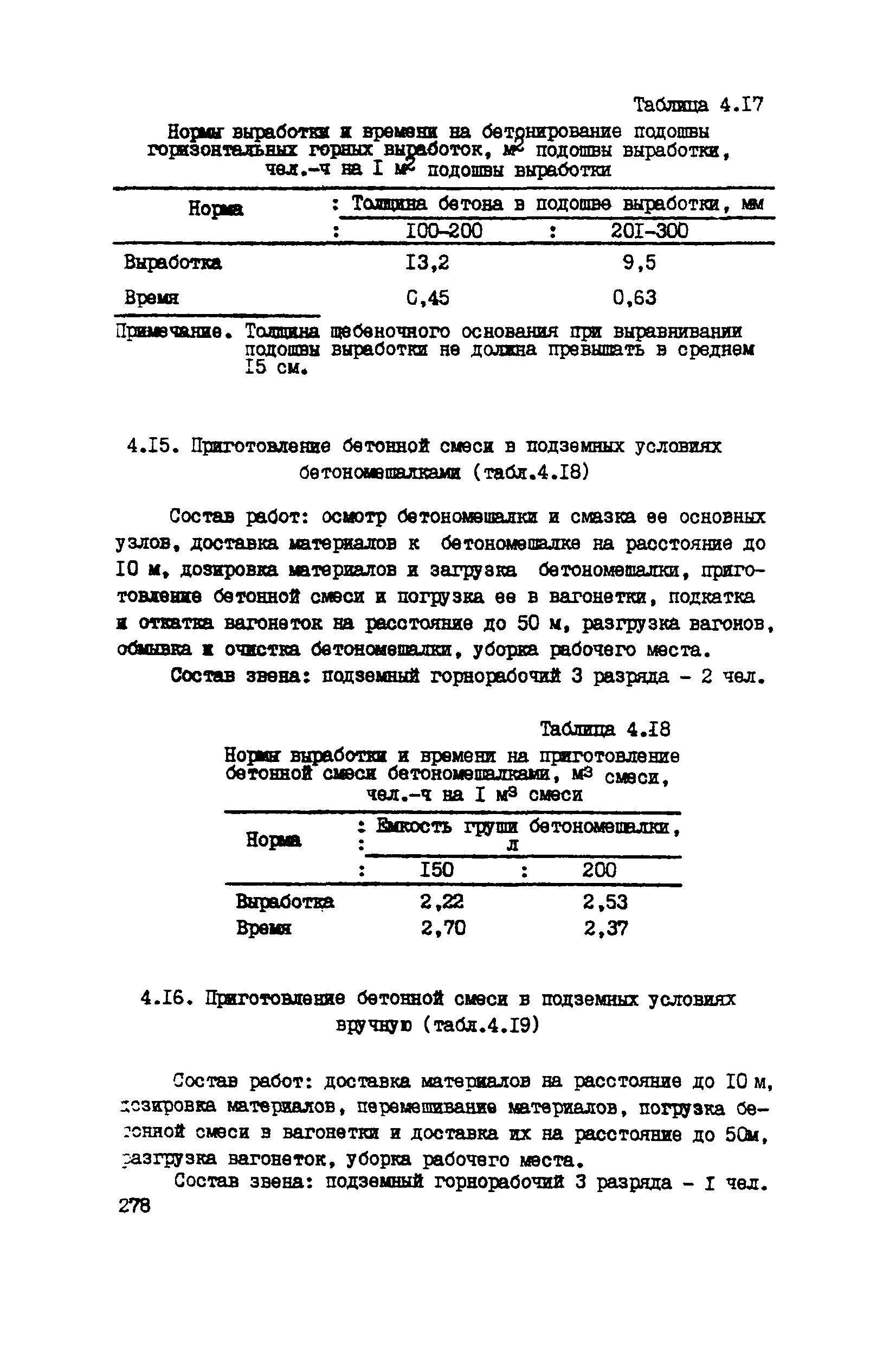 | Оглавление: | Общая часть Раздел 1. Проходка, крепление и армирование вертикальных стволов шахт; проведение сопряжений стволов с околоствольными дворами Глава 1. Проходка вертикальных стволов шахт 1.1 Проходка вертикальных стволов обычном способом 1.2 Проходка вертикальных стволов по замороженным породам 1.3 Проходка вертикальных стволов по породам, предварительно закрепленным химическим способом Глава 2. Крепление вертикальных стволов шахт бетоном 2.1 Временное крепление стволов металлическими кольцами 2.2 Крепление стволов круглого сечения бетоном и железобетоном 2.3 Крепление вертикальных стволов тюбингами 2.4 Крепление вертикальных стволов анкерной крепью 2.5 Установка и снятие деревянной опалубки заводного тюбингового кольца в конце заходки 2.6 Снятие первого тюбингового кольца 2.7 Сбивка кромки бетона на контакте заходки 2.8 Установка опорного венца из чугунных тюбингов 2.9 Укладка холодного бетона за опалубку при спуске его по трубам 2.10 Крепление стволов торкрет—бетоном Глава 3. Гидроизоляционные работы 3.1 Гидроизоляция тюбинговой крепи 3.2 Расчеканка свинцовых прокладок в тюбинговых швах и чеканка тюбинговых швов свинцовым шнуром 3.3 Очистка чугунной тюбинговой крепи после проходки и крепления ствола 3.4 Пикотаж горизонтального шва между двумя звеньями тюбинговой крепи ствола 3.5 Гидроизоляция чугунной тюбинговой крепи тампонажным раствором при поступлении его по трубам самотеком с поверхности 3.6 Первичное нагнетание за крепь шахтного ствола 3.7 Контрольное в нагнетание за крепь шахтного ствола 3.8 Контрольное подтягивание и замена болтов в тюбинговой отделке шахтного ствола 3.9 Установка и замена пробок в отверстиях тюбингов 3.10 Изоляция стыков тюбинговой крепи шахтного ствола 3.11 Штукатурка бетонной поверхности под изоляцию и по изоляции 3.12 Оклеечная изоляция стенок шахтного ствола 3.13 Устройство пикотажных манжет при крепления вертикальных стволов шахт железобетонными тюбингами 3.14 Бурение шпуров в бетоне Глава 4. Армирование стволов 4.1 Долбление лунок под расстрелы 4.2 Установка и заделка металлических расстрелов в готовые лунки 4.3 Сболчивание стальных расстрелов 4.4 Установка проводников 4.5 Оборудование лестничных отделений в стволах шахт 4.6 Устройство и разборка настилов по расстрелам 4.7 Установка рудничных станков на сопряжение с околоствольным двором 4.8 Монтаж компенсационных балок из спец профиля в стволе 4.9 Монтаж и демонтаж постоянных трубопроводов Глава 5. Вспомогательные работы при проходке и креплении стволов шахт 5.1 Устройство, разборка и переноска рабочего полка 5.2 Устройство деревянного временного переносного полка в стволе 5.3 Монтаж одноэтажных и двухэтажных подвесных металлических полков в стволах натяжных рам и предохранительных полков Глава 6. Устройство в стволах круглого сечения бетонного опорного венца (башмака) Глава 7. Проведение сопряжений вертикальных стволов с околоствольными дворами Раздел II. Проходка и крепление наклонных стволов Глава 1. Проходка наклонных стволов Глава 2. Крепление наклонных стволов Глава 3. Гидроизоляционные работы Глава 4. Вспомогательные работы при проходке и креплении вертикальных и наклонных стволов с применением специальных способов Раздел III. Проходка и крепление горизонтальных, наклонных и восстающих горных выработок Глава 1. Буровые работы Глава 2. Д