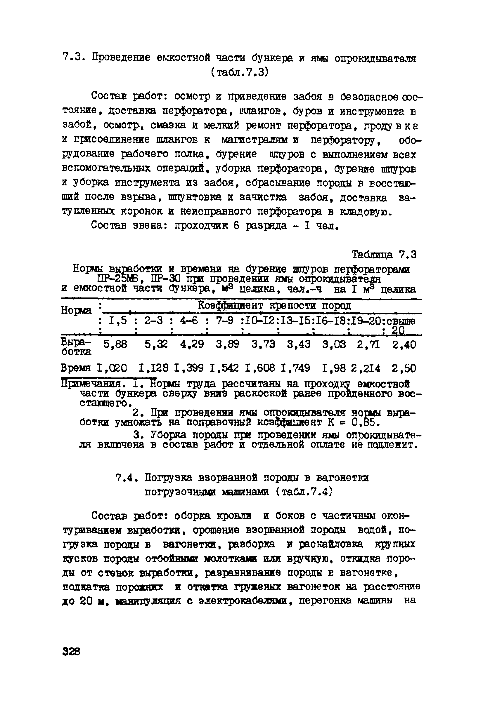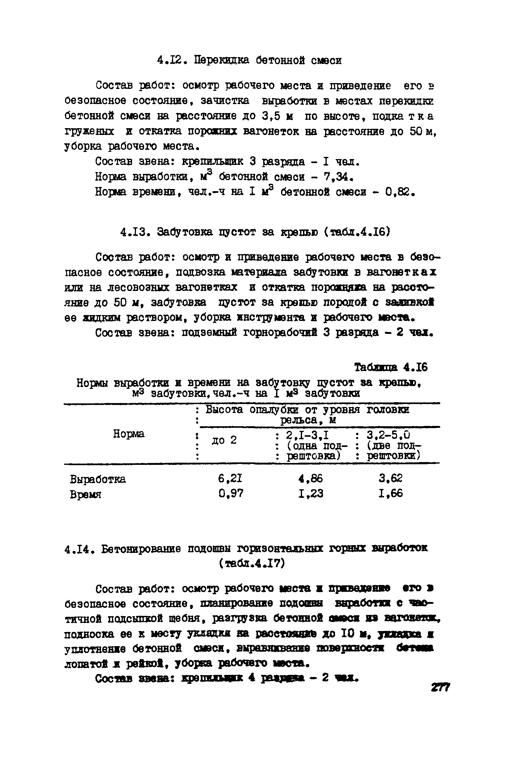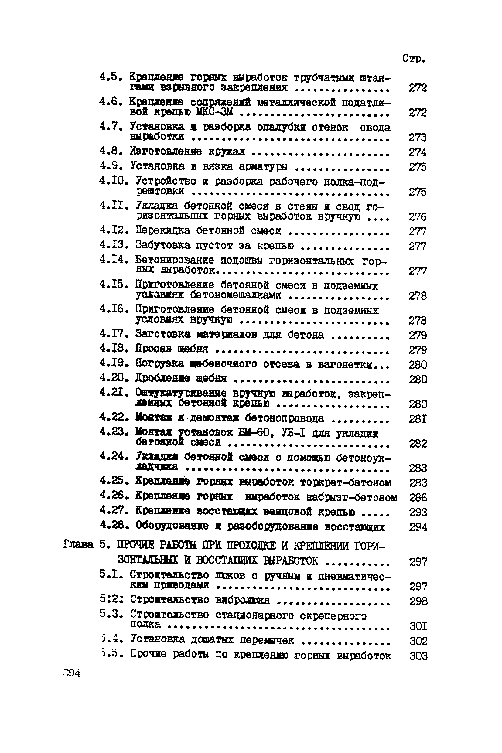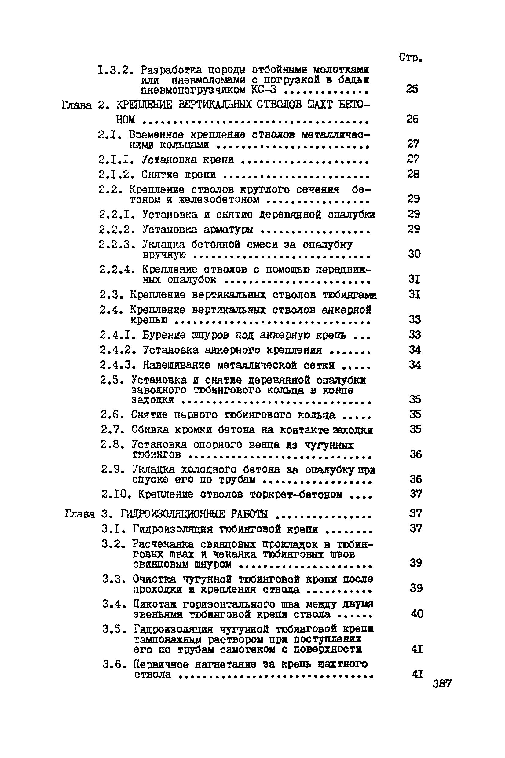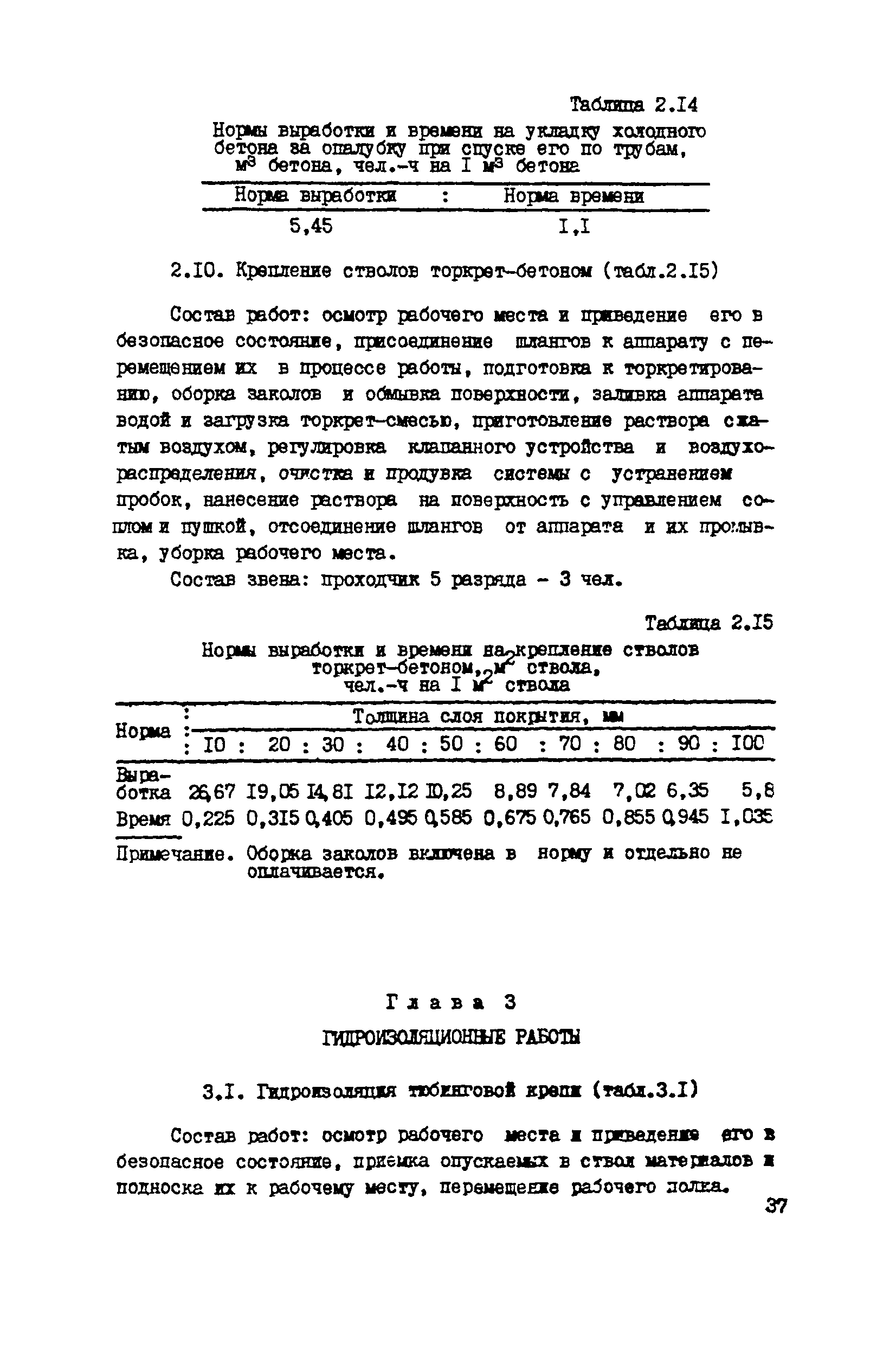 | Оглавление: | Общая часть Раздел 1. Проходка, крепление и армирование вертикальных стволов шахт; проведение сопряжений стволов с околоствольными дворами Глава 1. Проходка вертикальных стволов шахт 1.1 Проходка вертикальных стволов обычном способом 1.2 Проходка вертикальных стволов по замороженным породам 1.3 Проходка вертикальных стволов по породам, предварительно закрепленным химическим способом Глава 2. Крепление вертикальных стволов шахт бетоном 2.1 Временное крепление стволов металлическими кольцами 2.2 Крепление стволов круглого сечения бетоном и железобетоном 2.3 Крепление вертикальных стволов тюбингами 2.4 Крепление вертикальных стволов анкерной крепью 2.5 Установка и снятие деревянной опалубки заводного тюбингового кольца в конце заходки 2.6 Снятие первого тюбингового кольца 2.7 Сбивка кромки бетона на контакте заходки 2.8 Установка опорного венца из чугунных тюбингов 2.9 Укладка холодного бетона за опалубку при спуске его по трубам 2.10 Крепление стволов торкрет—бетоном Глава 3. Гидроизоляционные работы 3.1 Гидроизоляция тюбинговой крепи 3.2 Расчеканка свинцовых прокладок в тюбинговых швах и чеканка тюбинговых швов свинцовым шнуром 3.3 Очистка чугунной тюбинговой крепи после проходки и крепления ствола 3.4 Пикотаж горизонтального шва между двумя звеньями тюбинговой крепи ствола 3.5 Гидроизоляция чугунной тюбинговой крепи тампонажным раствором при поступлении его по трубам самотеком с поверхности 3.6 Первичное нагнетание за крепь шахтного ствола 3.7 Контрольное в нагнетание за крепь шахтного ствола 3.8 Контрольное подтягивание и замена болтов в тюбинговой отделке шахтного ствола 3.9 Установка и замена пробок в отверстиях тюбингов 3.10 Изоляция стыков тюбинговой крепи шахтного ствола 3.11 Штукатурка бетонной поверхности под изоляцию и по изоляции 3.12 Оклеечная изоляция стенок шахтного ствола 3.13 Устройство пикотажных манжет при крепления вертикальных стволов шахт железобетонными тюбингами 3.14 Бурение шпуров в бетоне Глава 4. Армирование стволов 4.1 Долбление лунок под расстрелы 4.2 Установка и заделка металлических расстрелов в готовые лунки 4.3 Сболчивание стальных расстрелов 4.4 Установка проводников 4.5 Оборудование лестничных отделений в стволах шахт 4.6 Устройство и разборка настилов по расстрелам 4.7 Установка рудничных станков на сопряжение с околоствольным двором 4.8 Монтаж компенсационных балок из спец профиля в стволе 4.9 Монтаж и демонтаж постоянных трубопроводов Глава 5. Вспомогательные работы при проходке и креплении стволов шахт 5.1 Устройство, разборка и переноска рабочего полка 5.2 Устройство деревянного временного переносного полка в стволе 5.3 Монтаж одноэтажных и двухэтажных подвесных металлических полков в стволах натяжных рам и предохранительных полков Глава 6. Устройство в стволах круглого сечения бетонного опорного венца (башмака) Глава 7. Проведение сопряжений вертикальных стволов с околоствольными дворами Раздел II. Проходка и крепление наклонных стволов Глава 1. Проходка наклонных стволов Глава 2. Крепление наклонных стволов Глава 3. Гидроизоляционные работы Глава 4. Вспомогательные работы при проходке и креплении вертикальных и наклонных стволов с применением специальных способов Раздел III. Проходка и крепление горизонтальных, наклонных и восстающих горных выработок Глава 1. Буровые работы Глава 2. Д