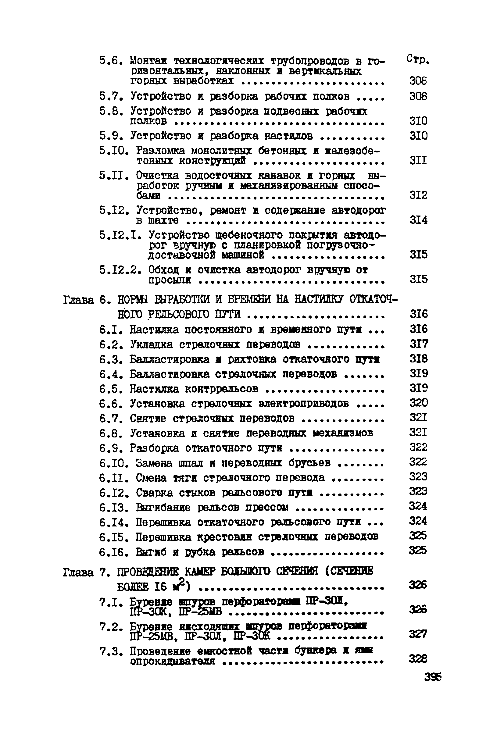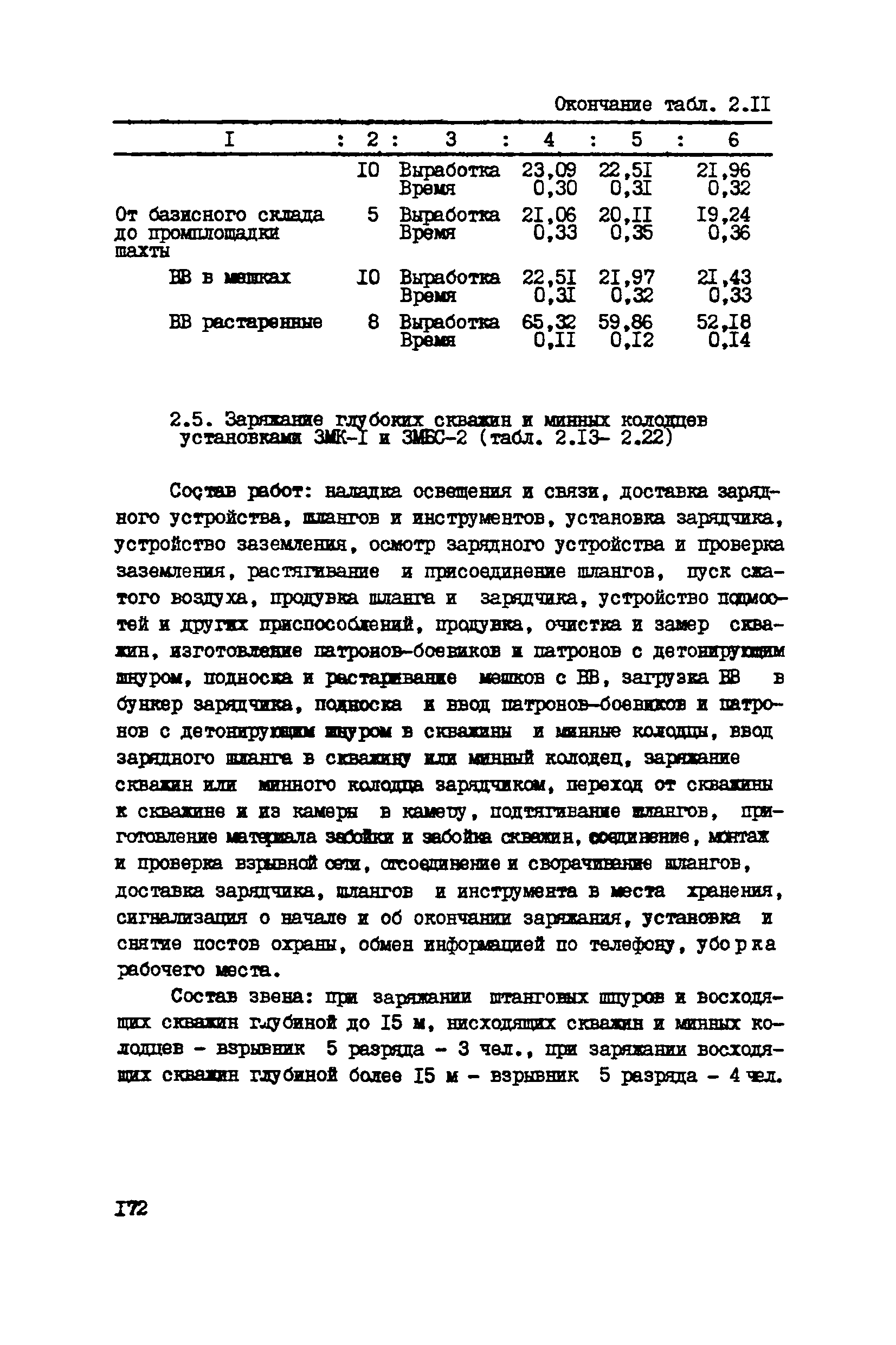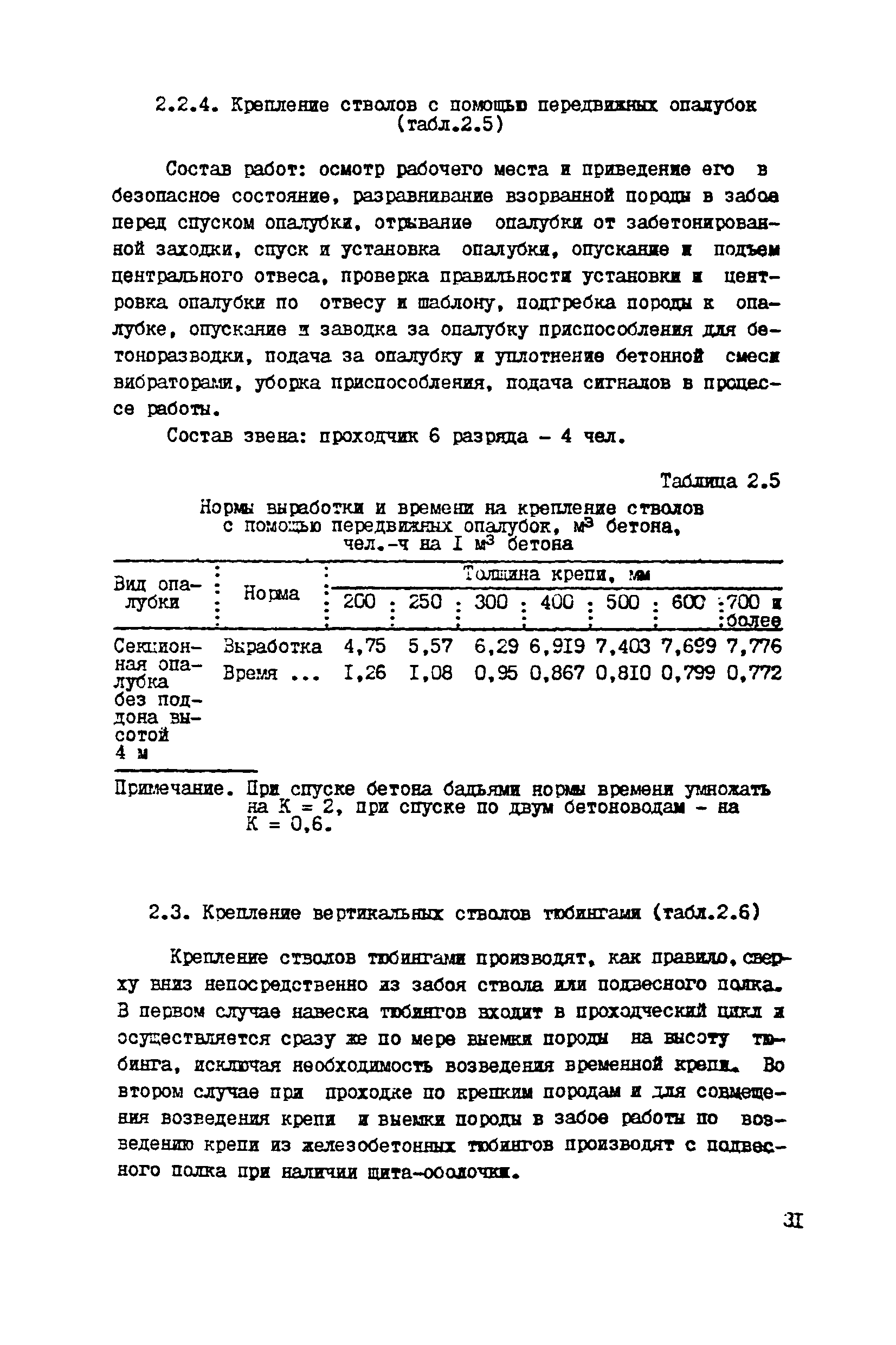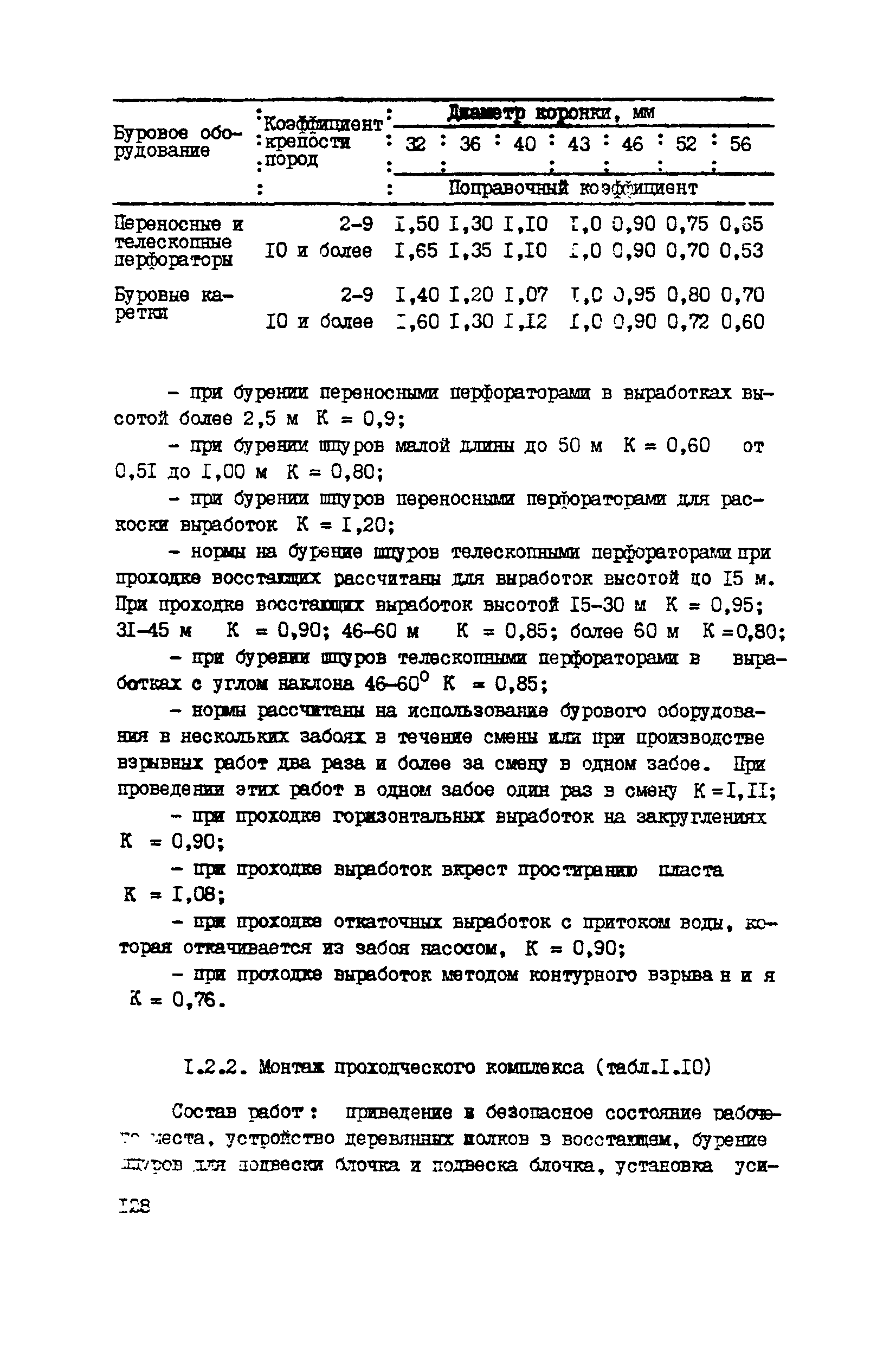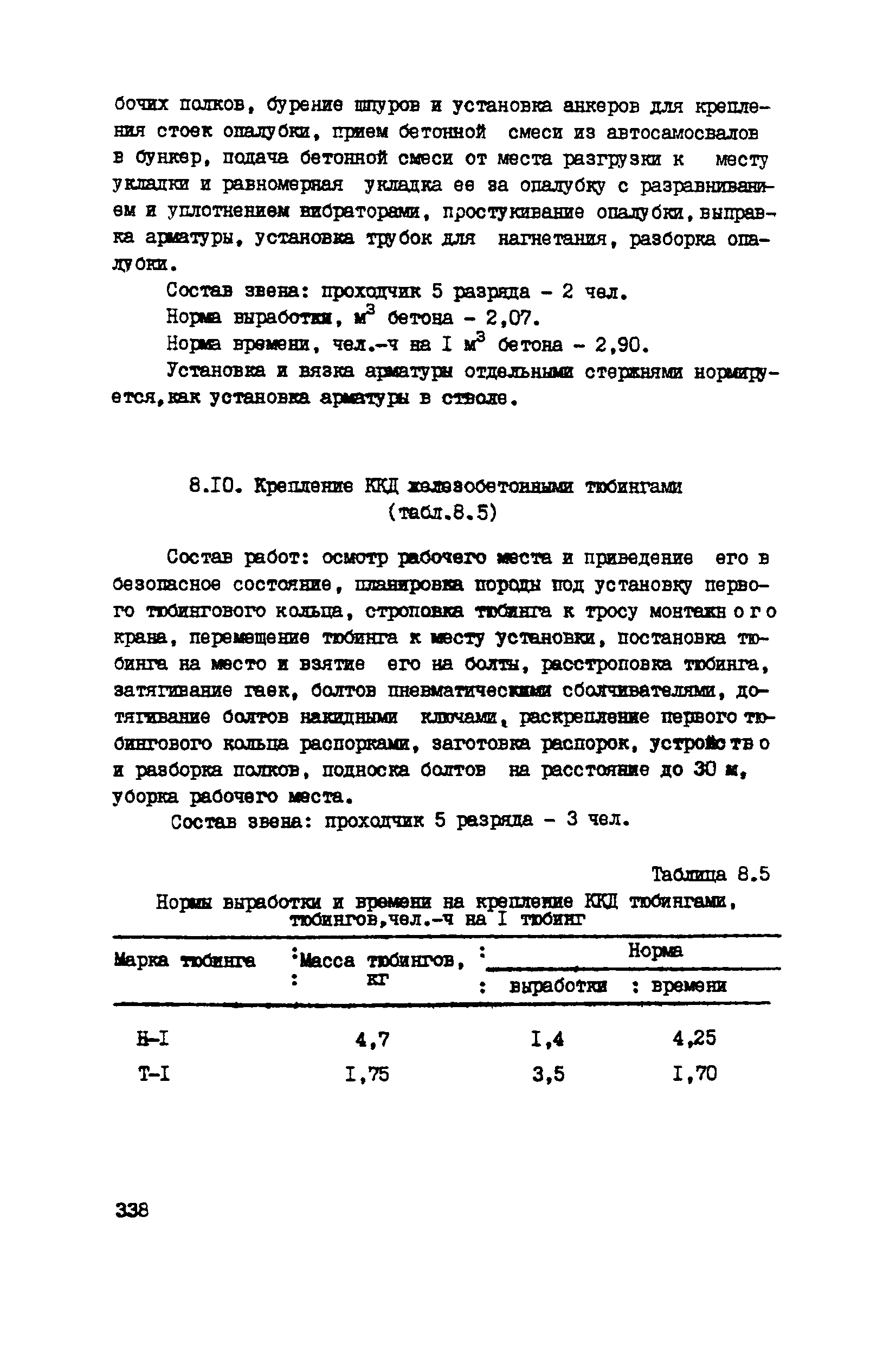 | Оглавление: | Общая часть Раздел 1. Проходка, крепление и армирование вертикальных стволов шахт; проведение сопряжений стволов с околоствольными дворами Глава 1. Проходка вертикальных стволов шахт 1.1 Проходка вертикальных стволов обычном способом 1.2 Проходка вертикальных стволов по замороженным породам 1.3 Проходка вертикальных стволов по породам, предварительно закрепленным химическим способом Глава 2. Крепление вертикальных стволов шахт бетоном 2.1 Временное крепление стволов металлическими кольцами 2.2 Крепление стволов круглого сечения бетоном и железобетоном 2.3 Крепление вертикальных стволов тюбингами 2.4 Крепление вертикальных стволов анкерной крепью 2.5 Установка и снятие деревянной опалубки заводного тюбингового кольца в конце заходки 2.6 Снятие первого тюбингового кольца 2.7 Сбивка кромки бетона на контакте заходки 2.8 Установка опорного венца из чугунных тюбингов 2.9 Укладка холодного бетона за опалубку при спуске его по трубам 2.10 Крепление стволов торкрет—бетоном Глава 3. Гидроизоляционные работы 3.1 Гидроизоляция тюбинговой крепи 3.2 Расчеканка свинцовых прокладок в тюбинговых швах и чеканка тюбинговых швов свинцовым шнуром 3.3 Очистка чугунной тюбинговой крепи после проходки и крепления ствола 3.4 Пикотаж горизонтального шва между двумя звеньями тюбинговой крепи ствола 3.5 Гидроизоляция чугунной тюбинговой крепи тампонажным раствором при поступлении его по трубам самотеком с поверхности 3.6 Первичное нагнетание за крепь шахтного ствола 3.7 Контрольное в нагнетание за крепь шахтного ствола 3.8 Контрольное подтягивание и замена болтов в тюбинговой отделке шахтного ствола 3.9 Установка и замена пробок в отверстиях тюбингов 3.10 Изоляция стыков тюбинговой крепи шахтного ствола 3.11 Штукатурка бетонной поверхности под изоляцию и по изоляции 3.12 Оклеечная изоляция стенок шахтного ствола 3.13 Устройство пикотажных манжет при крепления вертикальных стволов шахт железобетонными тюбингами 3.14 Бурение шпуров в бетоне Глава 4. Армирование стволов 4.1 Долбление лунок под расстрелы 4.2 Установка и заделка металлических расстрелов в готовые лунки 4.3 Сболчивание стальных расстрелов 4.4 Установка проводников 4.5 Оборудование лестничных отделений в стволах шахт 4.6 Устройство и разборка настилов по расстрелам 4.7 Установка рудничных станков на сопряжение с околоствольным двором 4.8 Монтаж компенсационных балок из спец профиля в стволе 4.9 Монтаж и демонтаж постоянных трубопроводов Глава 5. Вспомогательные работы при проходке и креплении стволов шахт 5.1 Устройство, разборка и переноска рабочего полка 5.2 Устройство деревянного временного переносного полка в стволе 5.3 Монтаж одноэтажных и двухэтажных подвесных металлических полков в стволах натяжных рам и предохранительных полков Глава 6. Устройство в стволах круглого сечения бетонного опорного венца (башмака) Глава 7. Проведение сопряжений вертикальных стволов с околоствольными дворами Раздел II. Проходка и крепление наклонных стволов Глава 1. Проходка наклонных стволов Глава 2. Крепление наклонных стволов Глава 3. Гидроизоляционные работы Глава 4. Вспомогательные работы при проходке и креплении вертикальных и наклонных стволов с применением специальных способов Раздел III. Проходка и крепление горизонтальных, наклонных и восстающих горных выработок Глава 1. Буровые работы Глава 2. Д