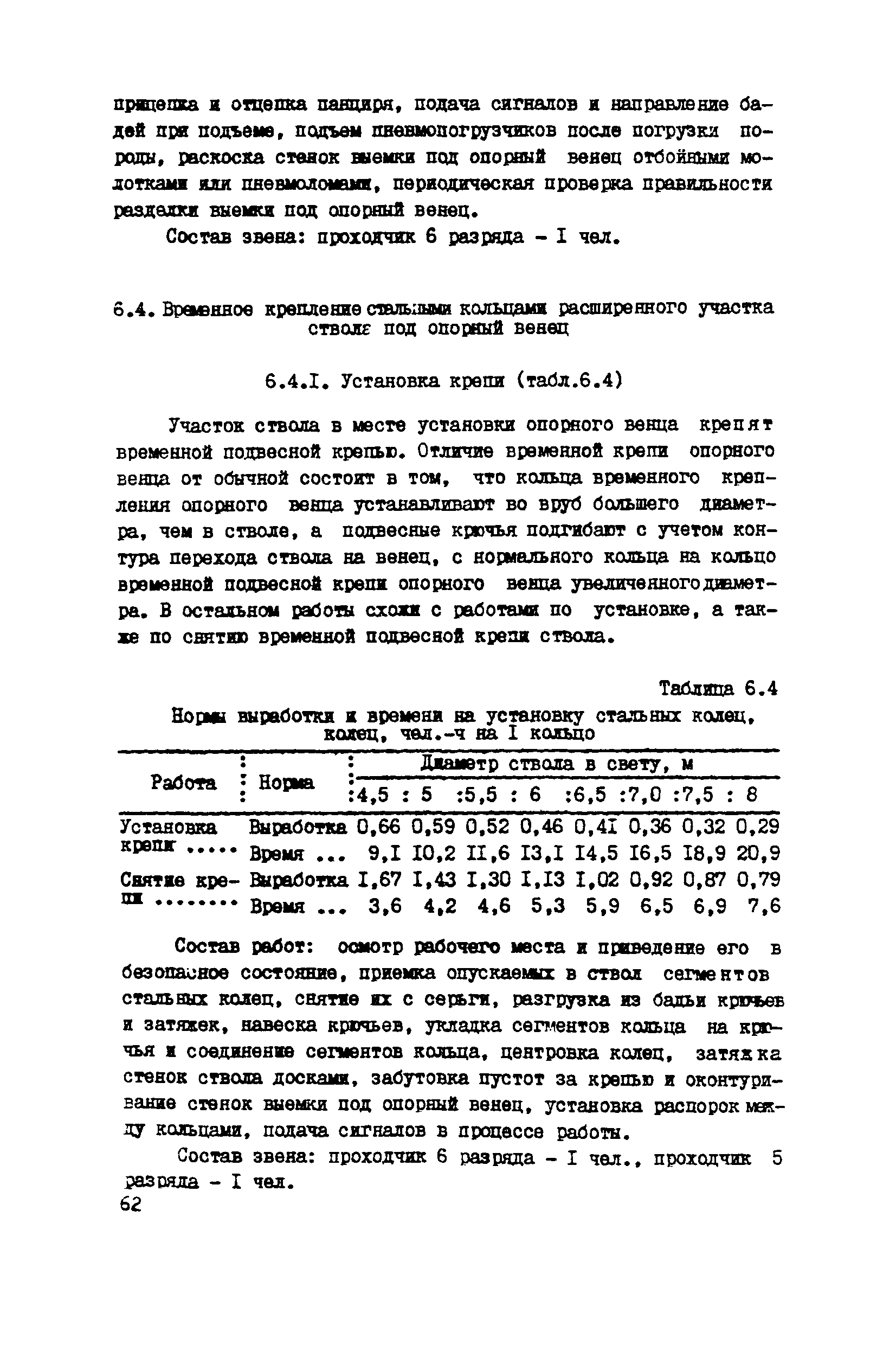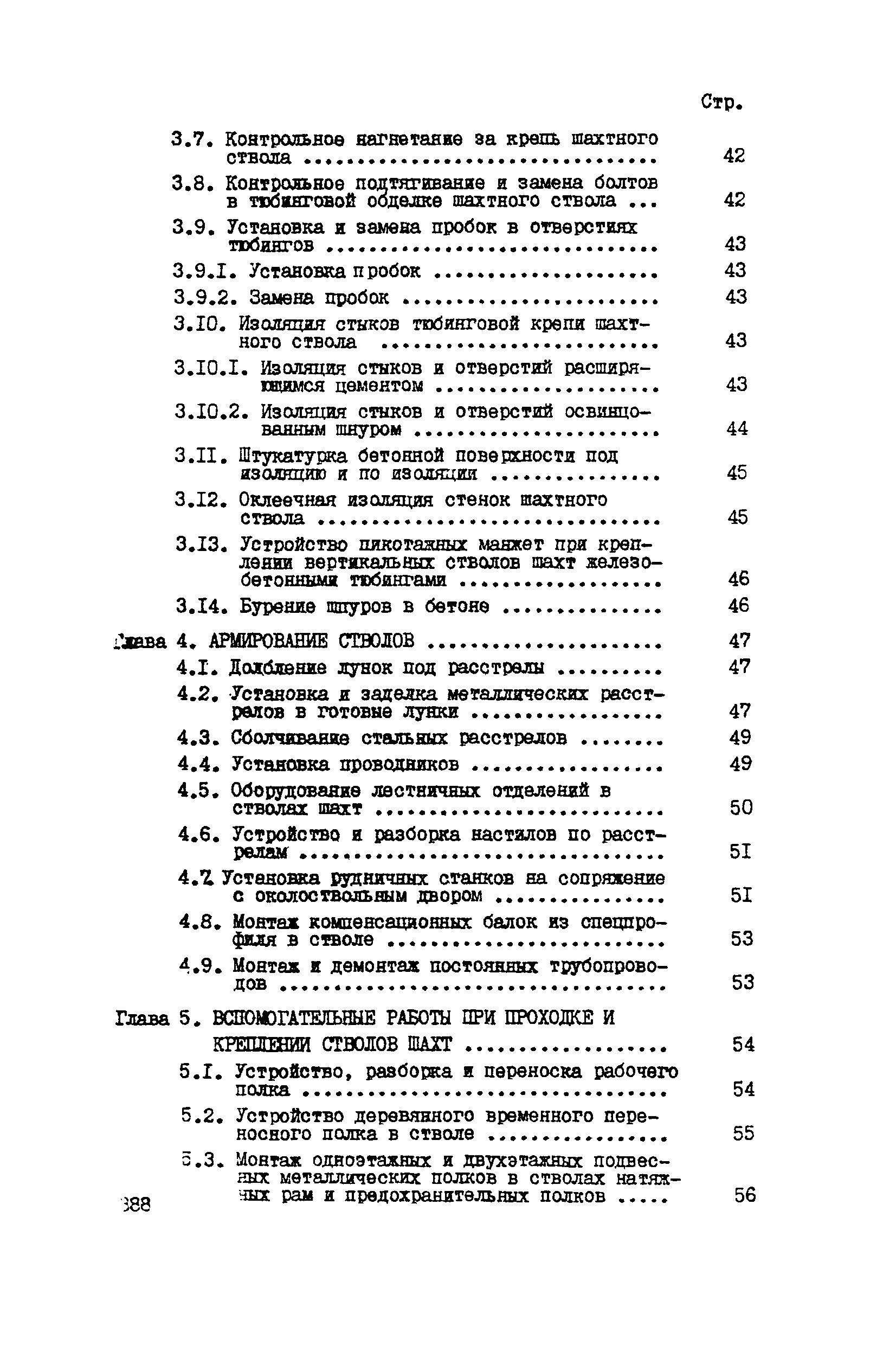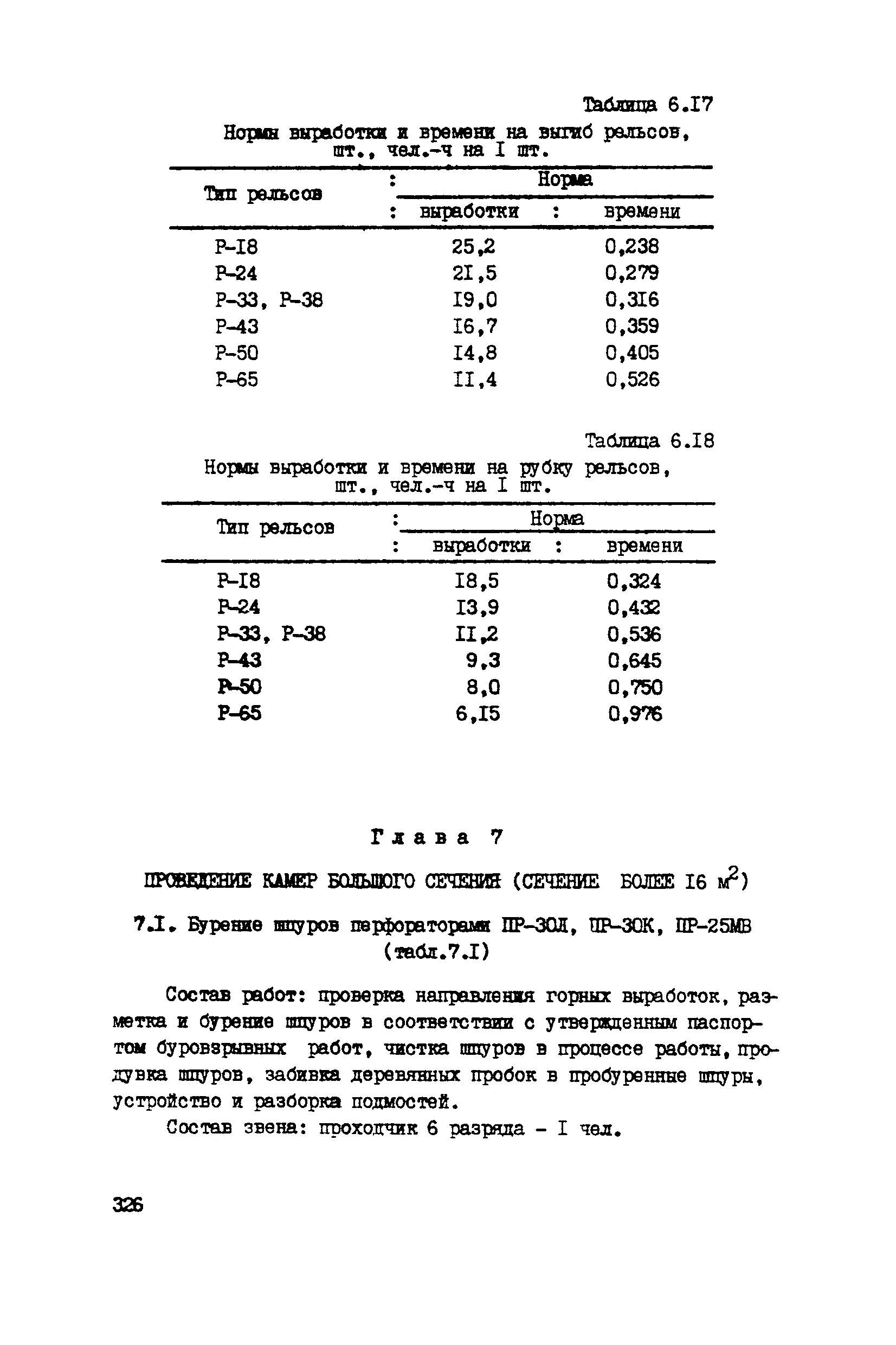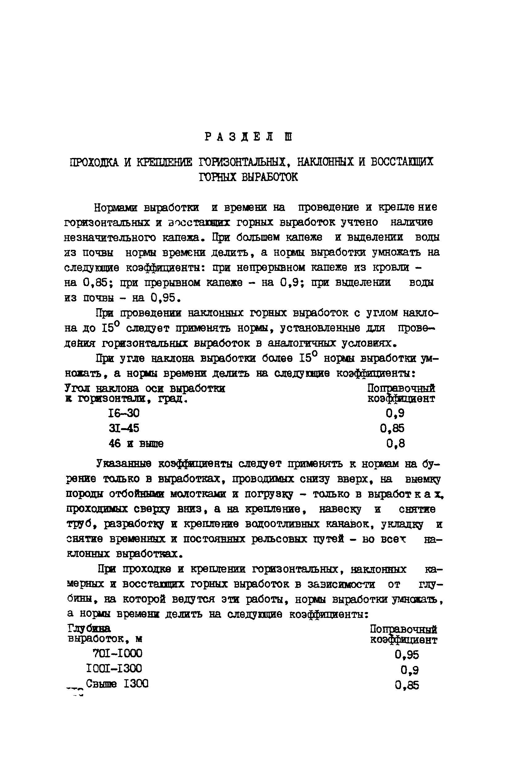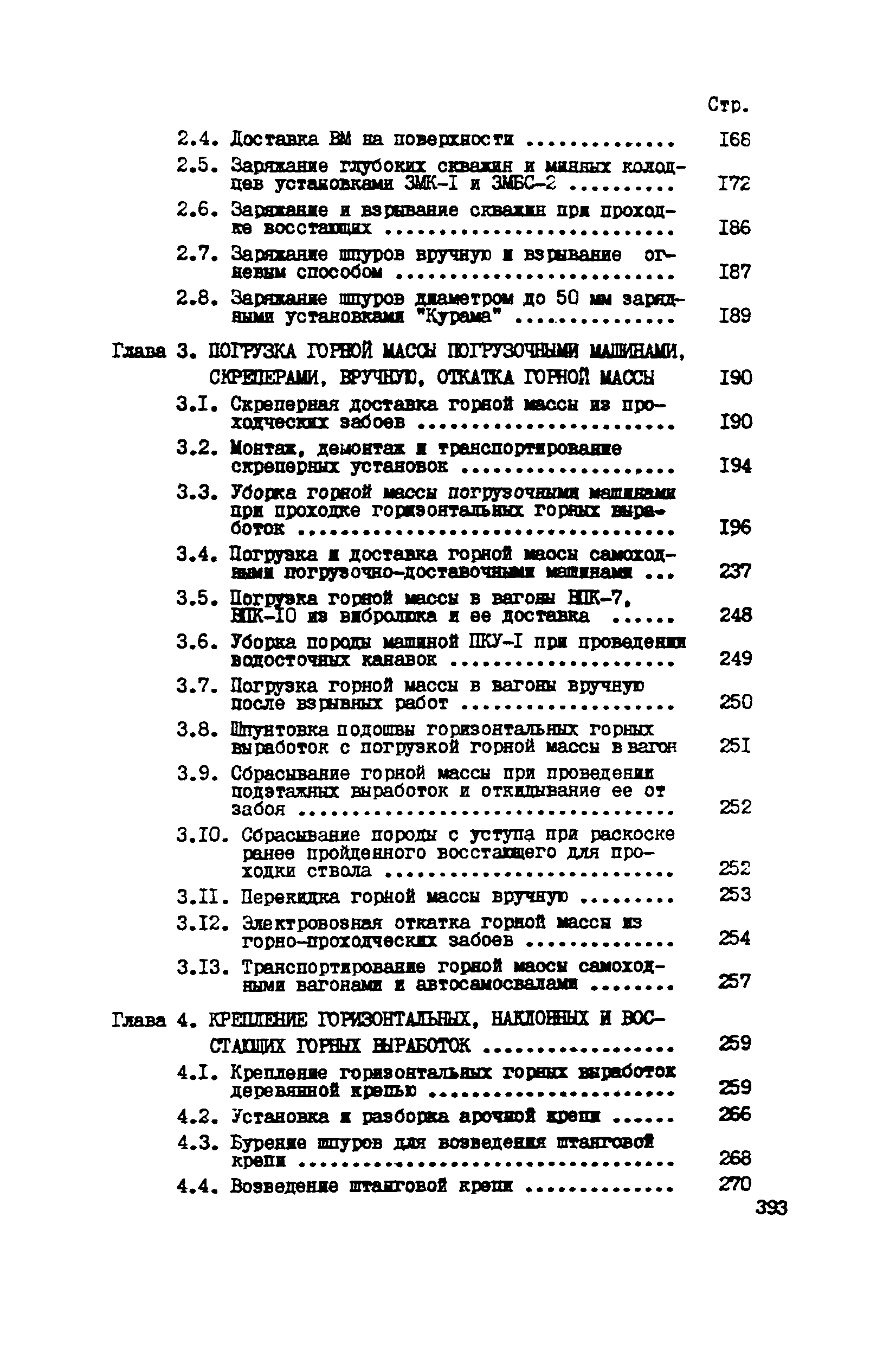 | Оглавление: | Общая часть Раздел 1. Проходка, крепление и армирование вертикальных стволов шахт; проведение сопряжений стволов с околоствольными дворами Глава 1. Проходка вертикальных стволов шахт 1.1 Проходка вертикальных стволов обычном способом 1.2 Проходка вертикальных стволов по замороженным породам 1.3 Проходка вертикальных стволов по породам, предварительно закрепленным химическим способом Глава 2. Крепление вертикальных стволов шахт бетоном 2.1 Временное крепление стволов металлическими кольцами 2.2 Крепление стволов круглого сечения бетоном и железобетоном 2.3 Крепление вертикальных стволов тюбингами 2.4 Крепление вертикальных стволов анкерной крепью 2.5 Установка и снятие деревянной опалубки заводного тюбингового кольца в конце заходки 2.6 Снятие первого тюбингового кольца 2.7 Сбивка кромки бетона на контакте заходки 2.8 Установка опорного венца из чугунных тюбингов 2.9 Укладка холодного бетона за опалубку при спуске его по трубам 2.10 Крепление стволов торкрет—бетоном Глава 3. Гидроизоляционные работы 3.1 Гидроизоляция тюбинговой крепи 3.2 Расчеканка свинцовых прокладок в тюбинговых швах и чеканка тюбинговых швов свинцовым шнуром 3.3 Очистка чугунной тюбинговой крепи после проходки и крепления ствола 3.4 Пикотаж горизонтального шва между двумя звеньями тюбинговой крепи ствола 3.5 Гидроизоляция чугунной тюбинговой крепи тампонажным раствором при поступлении его по трубам самотеком с поверхности 3.6 Первичное нагнетание за крепь шахтного ствола 3.7 Контрольное в нагнетание за крепь шахтного ствола 3.8 Контрольное подтягивание и замена болтов в тюбинговой отделке шахтного ствола 3.9 Установка и замена пробок в отверстиях тюбингов 3.10 Изоляция стыков тюбинговой крепи шахтного ствола 3.11 Штукатурка бетонной поверхности под изоляцию и по изоляции 3.12 Оклеечная изоляция стенок шахтного ствола 3.13 Устройство пикотажных манжет при крепления вертикальных стволов шахт железобетонными тюбингами 3.14 Бурение шпуров в бетоне Глава 4. Армирование стволов 4.1 Долбление лунок под расстрелы 4.2 Установка и заделка металлических расстрелов в готовые лунки 4.3 Сболчивание стальных расстрелов 4.4 Установка проводников 4.5 Оборудование лестничных отделений в стволах шахт 4.6 Устройство и разборка настилов по расстрелам 4.7 Установка рудничных станков на сопряжение с околоствольным двором 4.8 Монтаж компенсационных балок из спец профиля в стволе 4.9 Монтаж и демонтаж постоянных трубопроводов Глава 5. Вспомогательные работы при проходке и креплении стволов шахт 5.1 Устройство, разборка и переноска рабочего полка 5.2 Устройство деревянного временного переносного полка в стволе 5.3 Монтаж одноэтажных и двухэтажных подвесных металлических полков в стволах натяжных рам и предохранительных полков Глава 6. Устройство в стволах круглого сечения бетонного опорного венца (башмака) Глава 7. Проведение сопряжений вертикальных стволов с околоствольными дворами Раздел II. Проходка и крепление наклонных стволов Глава 1. Проходка наклонных стволов Глава 2. Крепление наклонных стволов Глава 3. Гидроизоляционные работы Глава 4. Вспомогательные работы при проходке и креплении вертикальных и наклонных стволов с применением специальных способов Раздел III. Проходка и крепление горизонтальных, наклонных и восстающих горных выработок Глава 1. Буровые работы Глава 2. Д