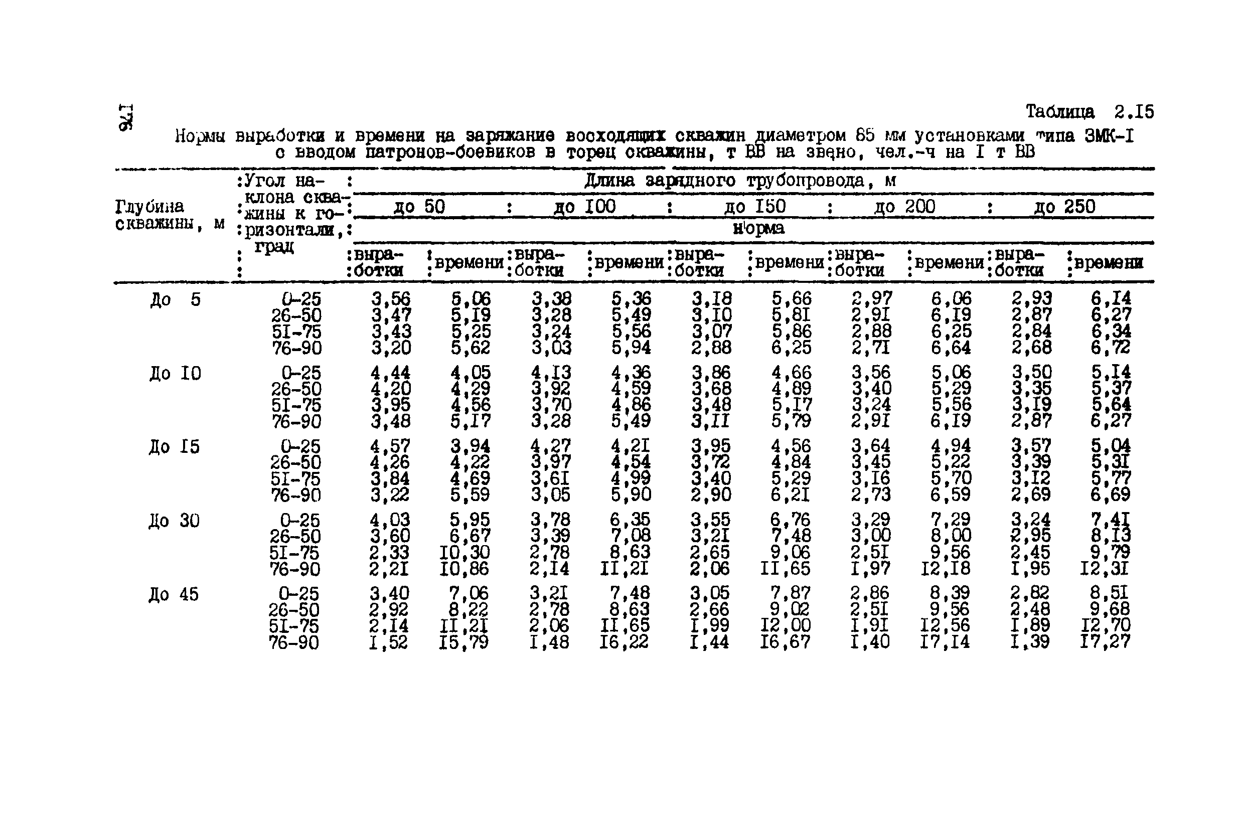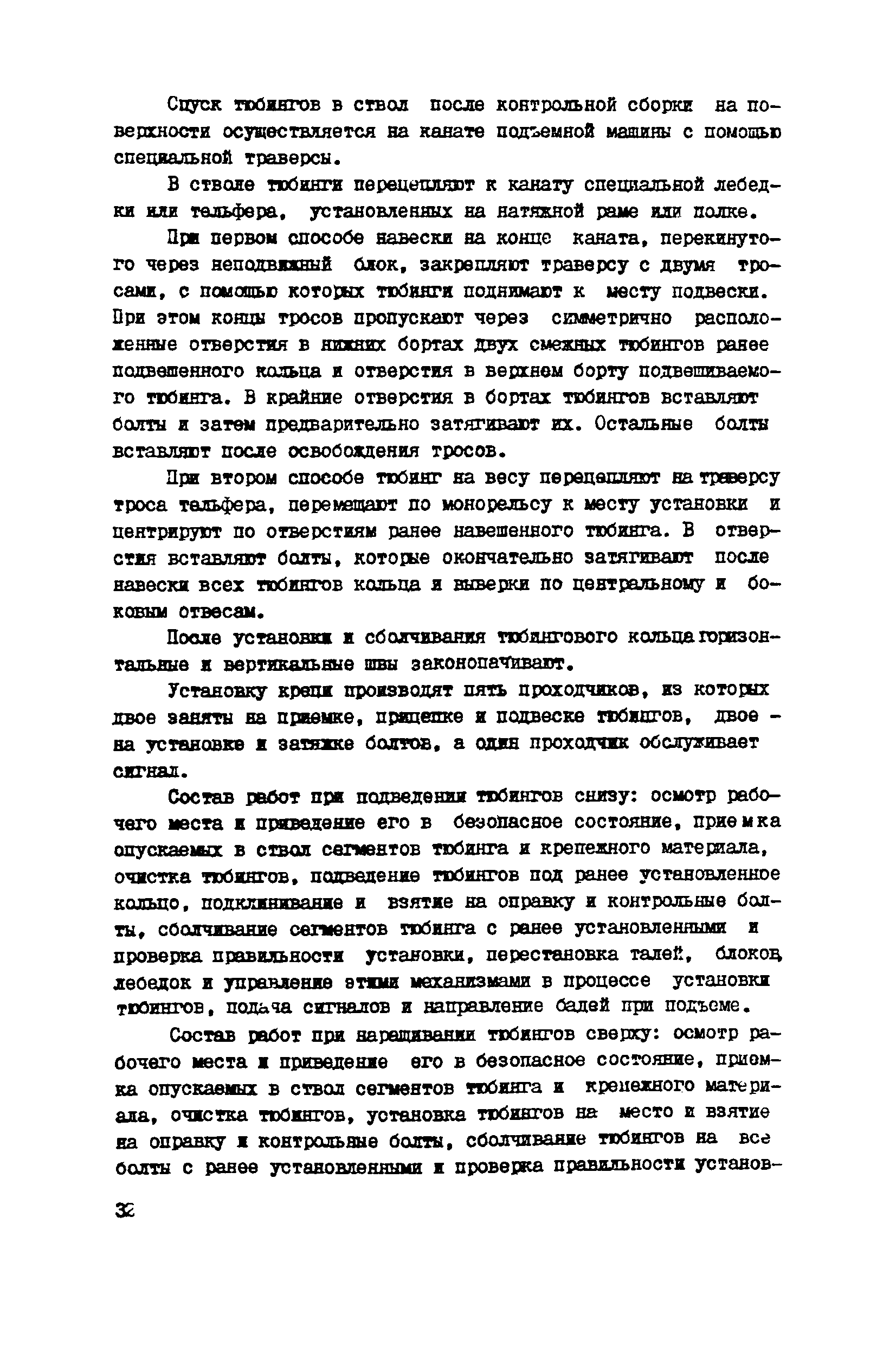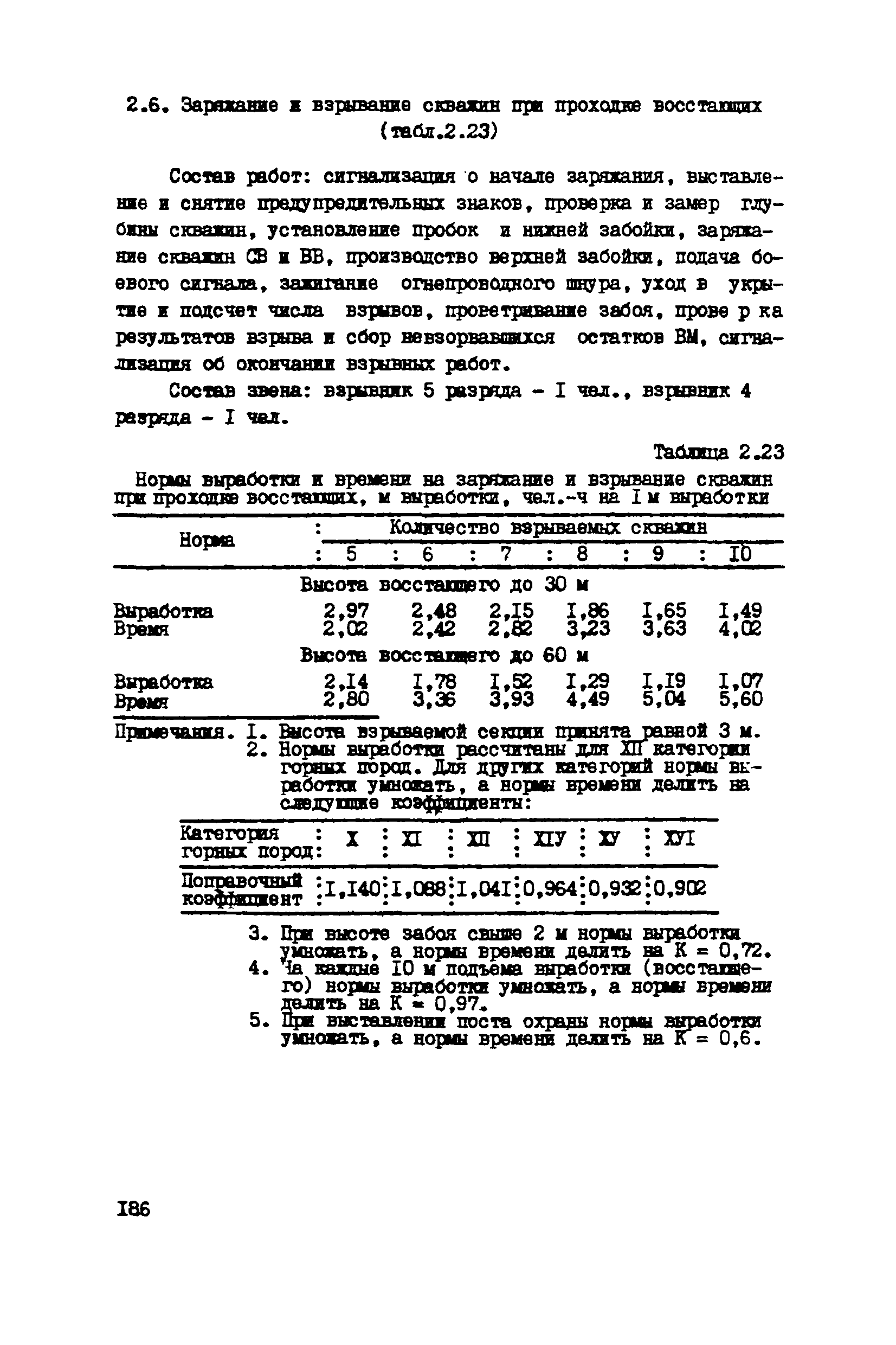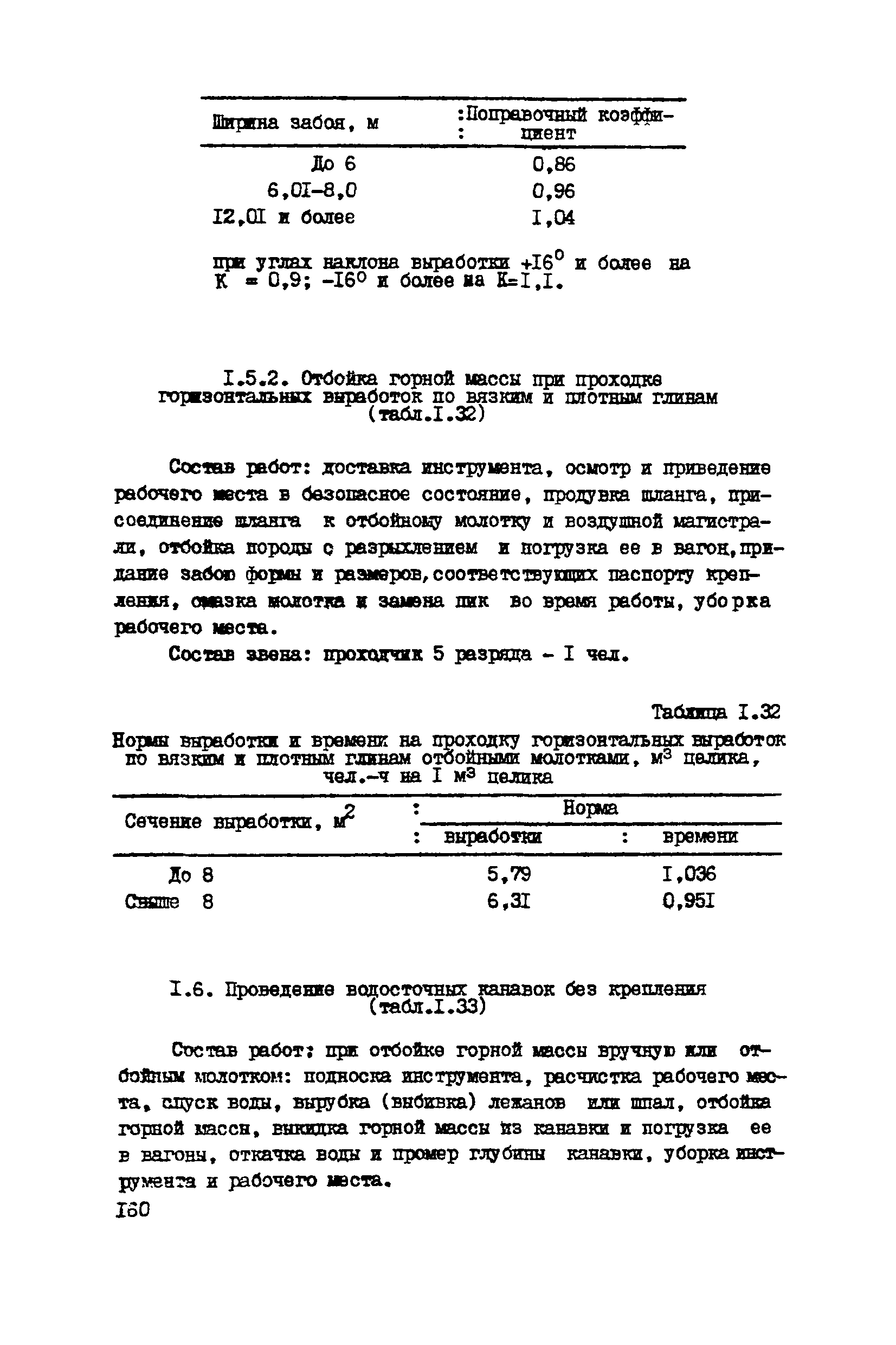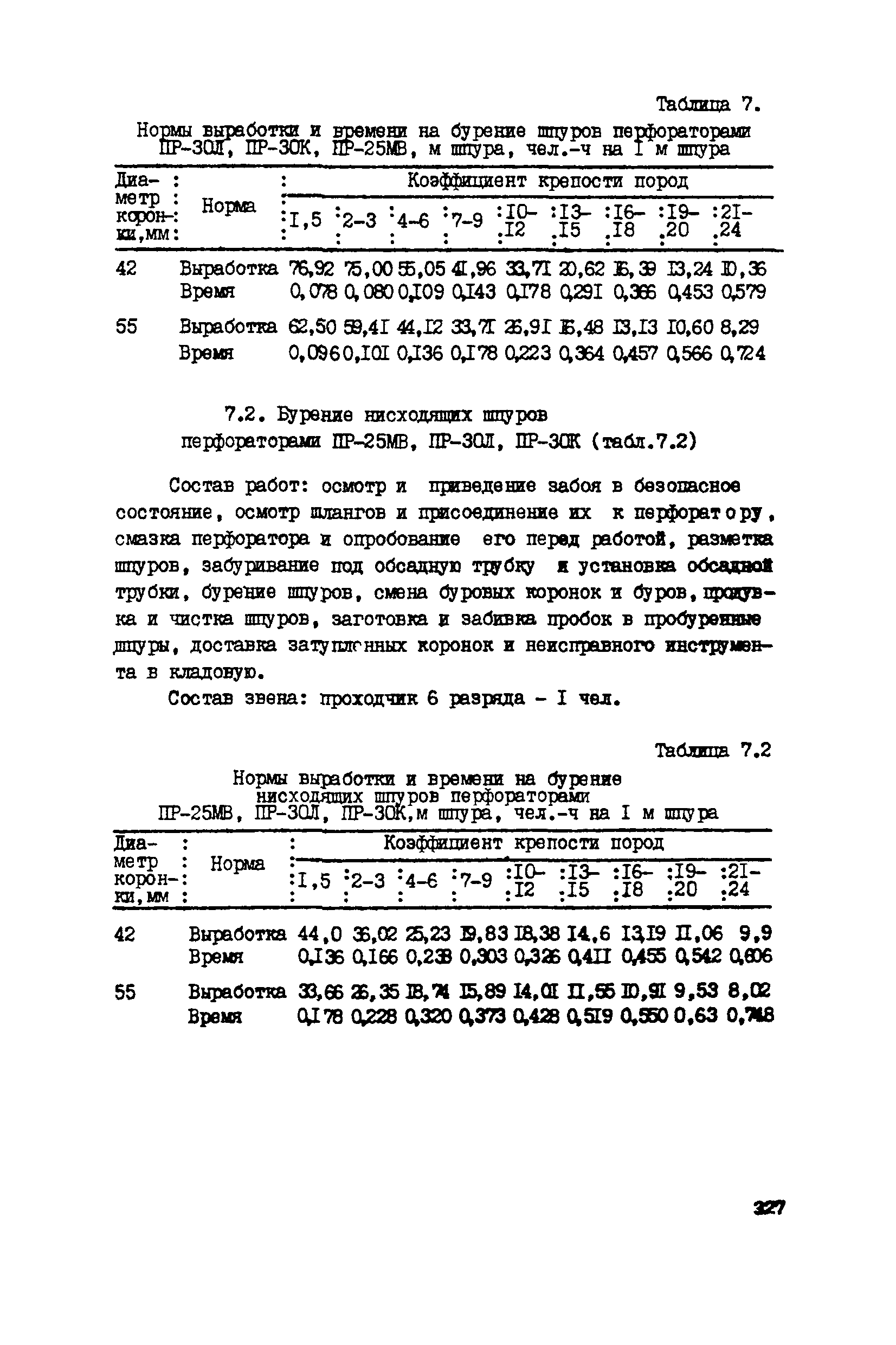 | Оглавление: | Общая часть Раздел 1. Проходка, крепление и армирование вертикальных стволов шахт; проведение сопряжений стволов с околоствольными дворами Глава 1. Проходка вертикальных стволов шахт 1.1 Проходка вертикальных стволов обычном способом 1.2 Проходка вертикальных стволов по замороженным породам 1.3 Проходка вертикальных стволов по породам, предварительно закрепленным химическим способом Глава 2. Крепление вертикальных стволов шахт бетоном 2.1 Временное крепление стволов металлическими кольцами 2.2 Крепление стволов круглого сечения бетоном и железобетоном 2.3 Крепление вертикальных стволов тюбингами 2.4 Крепление вертикальных стволов анкерной крепью 2.5 Установка и снятие деревянной опалубки заводного тюбингового кольца в конце заходки 2.6 Снятие первого тюбингового кольца 2.7 Сбивка кромки бетона на контакте заходки 2.8 Установка опорного венца из чугунных тюбингов 2.9 Укладка холодного бетона за опалубку при спуске его по трубам 2.10 Крепление стволов торкрет—бетоном Глава 3. Гидроизоляционные работы 3.1 Гидроизоляция тюбинговой крепи 3.2 Расчеканка свинцовых прокладок в тюбинговых швах и чеканка тюбинговых швов свинцовым шнуром 3.3 Очистка чугунной тюбинговой крепи после проходки и крепления ствола 3.4 Пикотаж горизонтального шва между двумя звеньями тюбинговой крепи ствола 3.5 Гидроизоляция чугунной тюбинговой крепи тампонажным раствором при поступлении его по трубам самотеком с поверхности 3.6 Первичное нагнетание за крепь шахтного ствола 3.7 Контрольное в нагнетание за крепь шахтного ствола 3.8 Контрольное подтягивание и замена болтов в тюбинговой отделке шахтного ствола 3.9 Установка и замена пробок в отверстиях тюбингов 3.10 Изоляция стыков тюбинговой крепи шахтного ствола 3.11 Штукатурка бетонной поверхности под изоляцию и по изоляции 3.12 Оклеечная изоляция стенок шахтного ствола 3.13 Устройство пикотажных манжет при крепления вертикальных стволов шахт железобетонными тюбингами 3.14 Бурение шпуров в бетоне Глава 4. Армирование стволов 4.1 Долбление лунок под расстрелы 4.2 Установка и заделка металлических расстрелов в готовые лунки 4.3 Сболчивание стальных расстрелов 4.4 Установка проводников 4.5 Оборудование лестничных отделений в стволах шахт 4.6 Устройство и разборка настилов по расстрелам 4.7 Установка рудничных станков на сопряжение с околоствольным двором 4.8 Монтаж компенсационных балок из спец профиля в стволе 4.9 Монтаж и демонтаж постоянных трубопроводов Глава 5. Вспомогательные работы при проходке и креплении стволов шахт 5.1 Устройство, разборка и переноска рабочего полка 5.2 Устройство деревянного временного переносного полка в стволе 5.3 Монтаж одноэтажных и двухэтажных подвесных металлических полков в стволах натяжных рам и предохранительных полков Глава 6. Устройство в стволах круглого сечения бетонного опорного венца (башмака) Глава 7. Проведение сопряжений вертикальных стволов с околоствольными дворами Раздел II. Проходка и крепление наклонных стволов Глава 1. Проходка наклонных стволов Глава 2. Крепление наклонных стволов Глава 3. Гидроизоляционные работы Глава 4. Вспомогательные работы при проходке и креплении вертикальных и наклонных стволов с применением специальных способов Раздел III. Проходка и крепление горизонтальных, наклонных и восстающих горных выработок Глава 1. Буровые работы Глава 2. Д