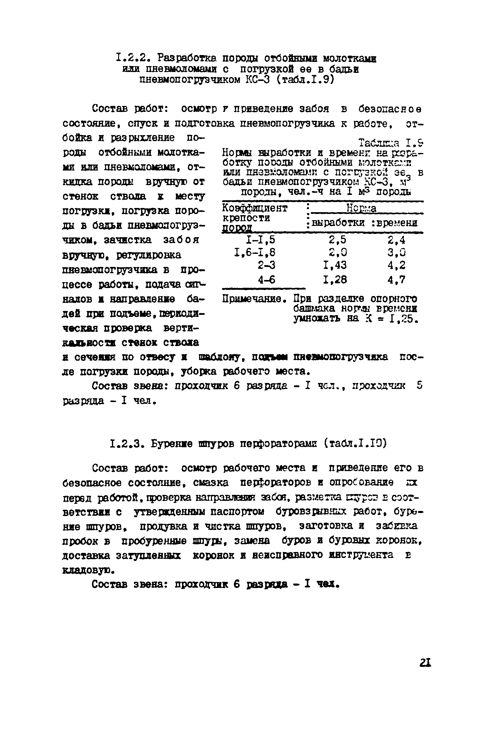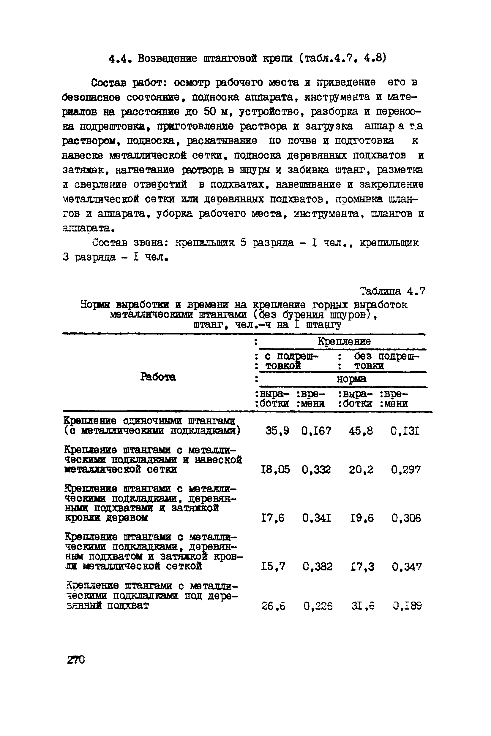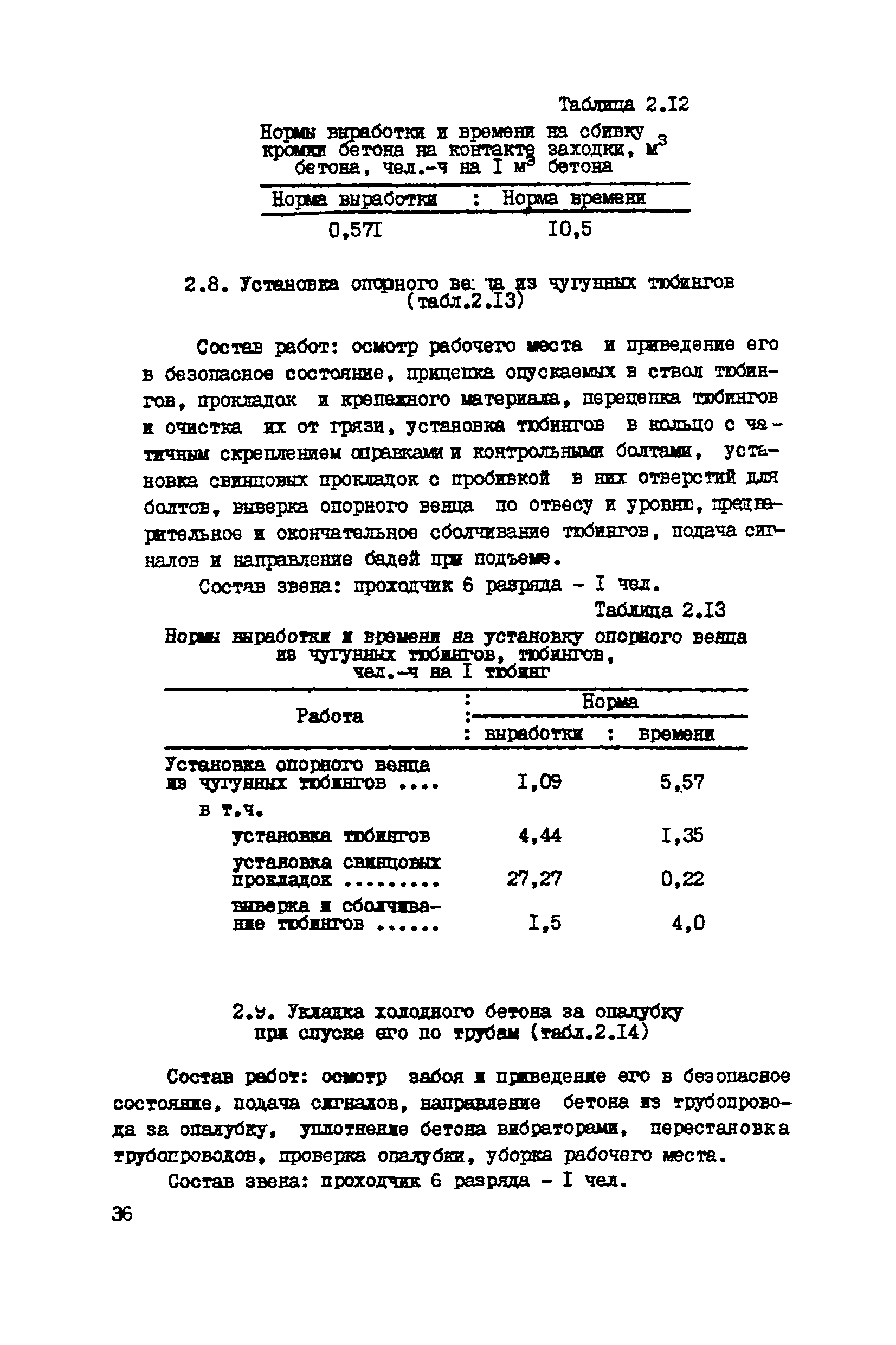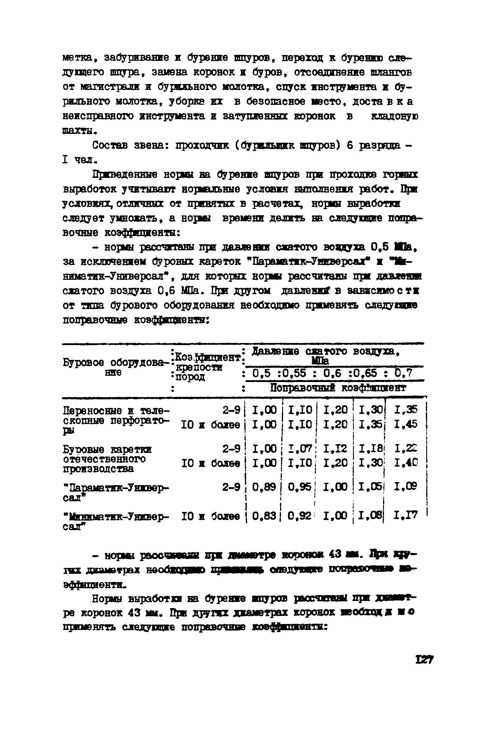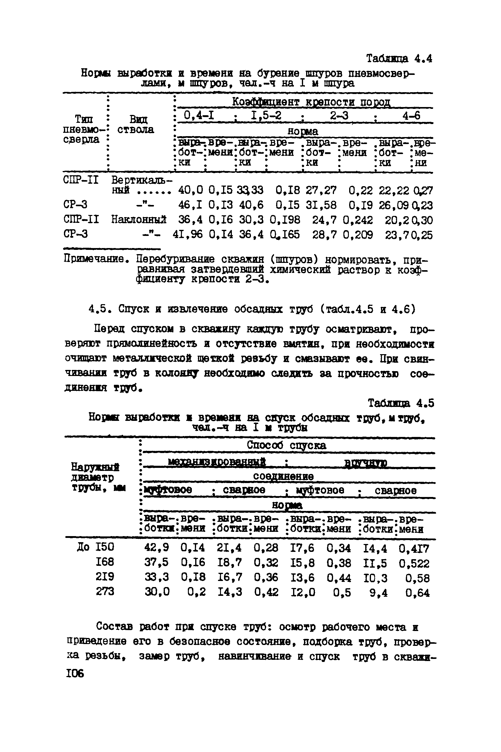 | Оглавление: | Общая часть Раздел 1. Проходка, крепление и армирование вертикальных стволов шахт; проведение сопряжений стволов с околоствольными дворами Глава 1. Проходка вертикальных стволов шахт 1.1 Проходка вертикальных стволов обычном способом 1.2 Проходка вертикальных стволов по замороженным породам 1.3 Проходка вертикальных стволов по породам, предварительно закрепленным химическим способом Глава 2. Крепление вертикальных стволов шахт бетоном 2.1 Временное крепление стволов металлическими кольцами 2.2 Крепление стволов круглого сечения бетоном и железобетоном 2.3 Крепление вертикальных стволов тюбингами 2.4 Крепление вертикальных стволов анкерной крепью 2.5 Установка и снятие деревянной опалубки заводного тюбингового кольца в конце заходки 2.6 Снятие первого тюбингового кольца 2.7 Сбивка кромки бетона на контакте заходки 2.8 Установка опорного венца из чугунных тюбингов 2.9 Укладка холодного бетона за опалубку при спуске его по трубам 2.10 Крепление стволов торкрет—бетоном Глава 3. Гидроизоляционные работы 3.1 Гидроизоляция тюбинговой крепи 3.2 Расчеканка свинцовых прокладок в тюбинговых швах и чеканка тюбинговых швов свинцовым шнуром 3.3 Очистка чугунной тюбинговой крепи после проходки и крепления ствола 3.4 Пикотаж горизонтального шва между двумя звеньями тюбинговой крепи ствола 3.5 Гидроизоляция чугунной тюбинговой крепи тампонажным раствором при поступлении его по трубам самотеком с поверхности 3.6 Первичное нагнетание за крепь шахтного ствола 3.7 Контрольное в нагнетание за крепь шахтного ствола 3.8 Контрольное подтягивание и замена болтов в тюбинговой отделке шахтного ствола 3.9 Установка и замена пробок в отверстиях тюбингов 3.10 Изоляция стыков тюбинговой крепи шахтного ствола 3.11 Штукатурка бетонной поверхности под изоляцию и по изоляции 3.12 Оклеечная изоляция стенок шахтного ствола 3.13 Устройство пикотажных манжет при крепления вертикальных стволов шахт железобетонными тюбингами 3.14 Бурение шпуров в бетоне Глава 4. Армирование стволов 4.1 Долбление лунок под расстрелы 4.2 Установка и заделка металлических расстрелов в готовые лунки 4.3 Сболчивание стальных расстрелов 4.4 Установка проводников 4.5 Оборудование лестничных отделений в стволах шахт 4.6 Устройство и разборка настилов по расстрелам 4.7 Установка рудничных станков на сопряжение с околоствольным двором 4.8 Монтаж компенсационных балок из спец профиля в стволе 4.9 Монтаж и демонтаж постоянных трубопроводов Глава 5. Вспомогательные работы при проходке и креплении стволов шахт 5.1 Устройство, разборка и переноска рабочего полка 5.2 Устройство деревянного временного переносного полка в стволе 5.3 Монтаж одноэтажных и двухэтажных подвесных металлических полков в стволах натяжных рам и предохранительных полков Глава 6. Устройство в стволах круглого сечения бетонного опорного венца (башмака) Глава 7. Проведение сопряжений вертикальных стволов с околоствольными дворами Раздел II. Проходка и крепление наклонных стволов Глава 1. Проходка наклонных стволов Глава 2. Крепление наклонных стволов Глава 3. Гидроизоляционные работы Глава 4. Вспомогательные работы при проходке и креплении вертикальных и наклонных стволов с применением специальных способов Раздел III. Проходка и крепление горизонтальных, наклонных и восстающих горных выработок Глава 1. Буровые работы Глава 2. Д