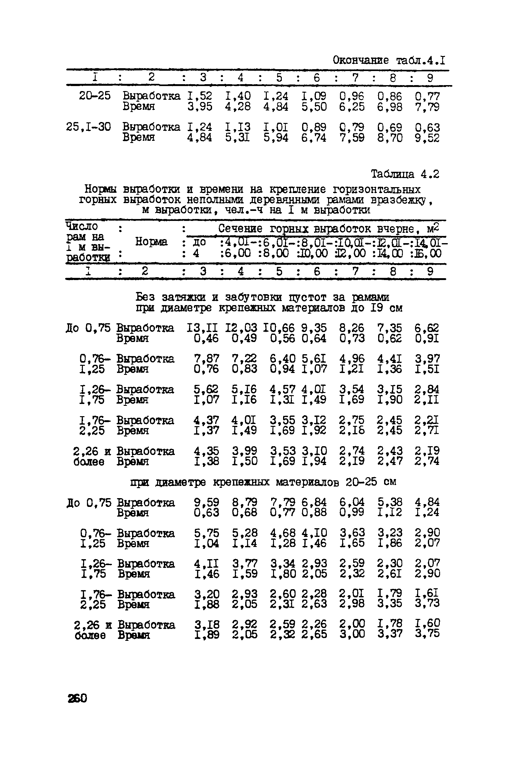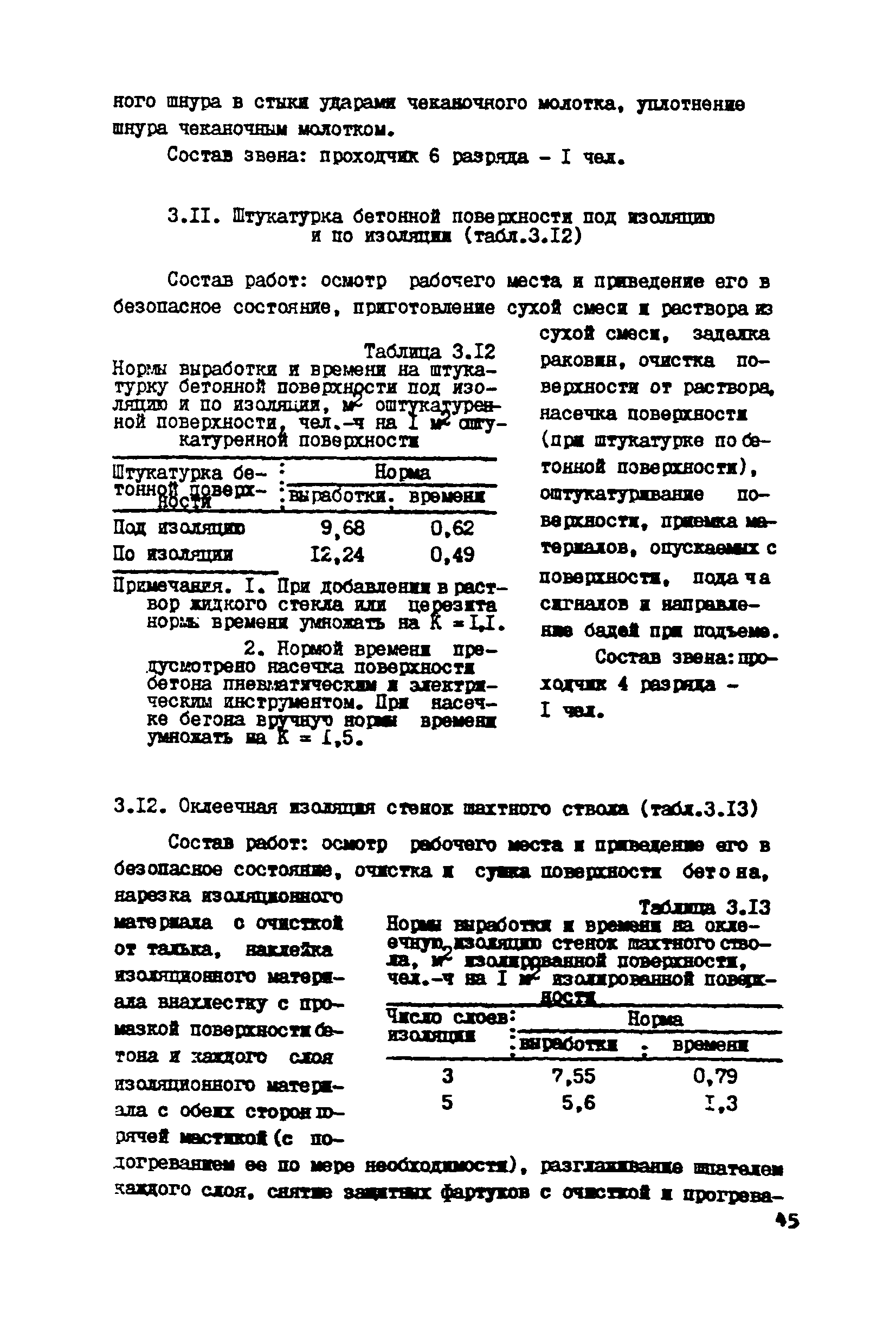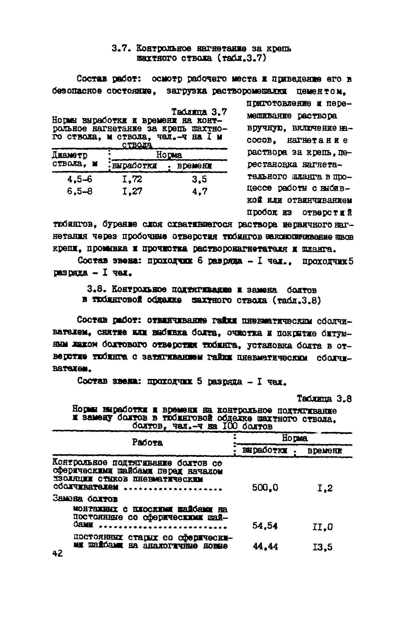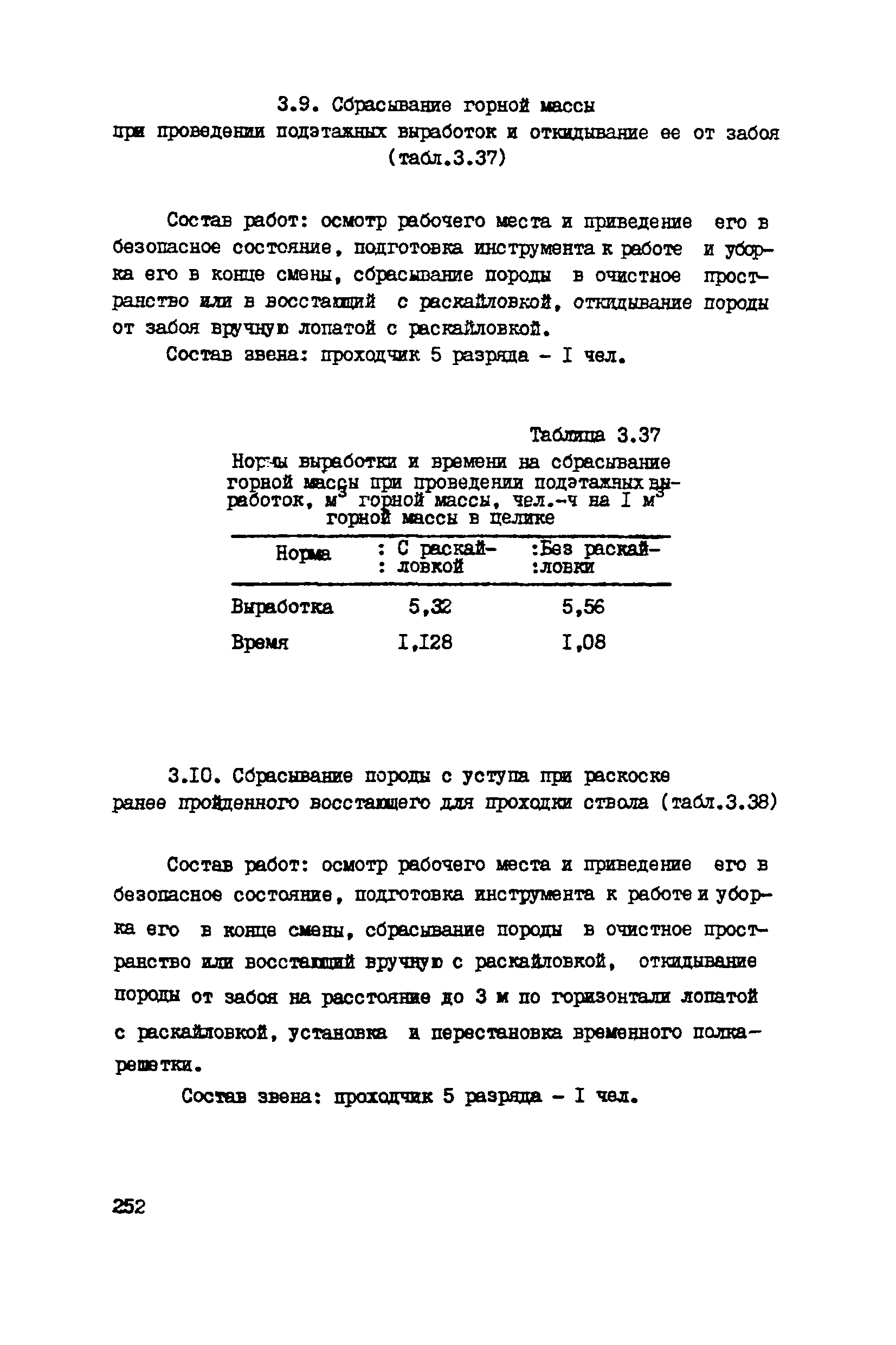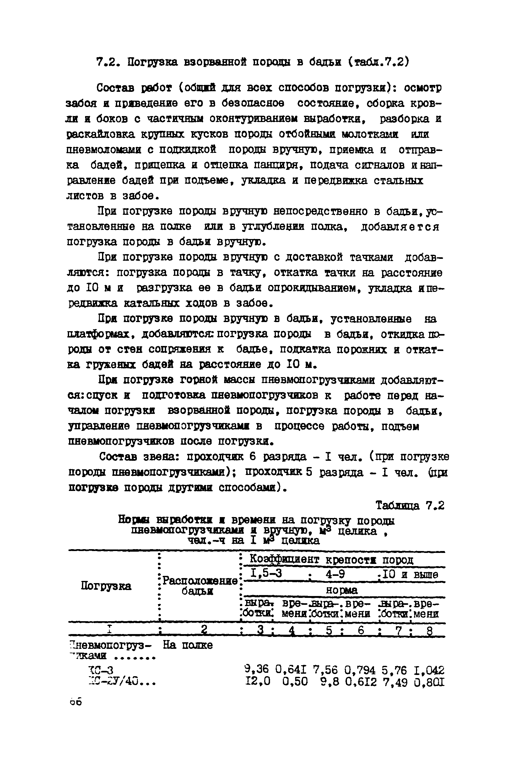 | Оглавление: | Общая часть Раздел 1. Проходка, крепление и армирование вертикальных стволов шахт; проведение сопряжений стволов с околоствольными дворами Глава 1. Проходка вертикальных стволов шахт 1.1 Проходка вертикальных стволов обычном способом 1.2 Проходка вертикальных стволов по замороженным породам 1.3 Проходка вертикальных стволов по породам, предварительно закрепленным химическим способом Глава 2. Крепление вертикальных стволов шахт бетоном 2.1 Временное крепление стволов металлическими кольцами 2.2 Крепление стволов круглого сечения бетоном и железобетоном 2.3 Крепление вертикальных стволов тюбингами 2.4 Крепление вертикальных стволов анкерной крепью 2.5 Установка и снятие деревянной опалубки заводного тюбингового кольца в конце заходки 2.6 Снятие первого тюбингового кольца 2.7 Сбивка кромки бетона на контакте заходки 2.8 Установка опорного венца из чугунных тюбингов 2.9 Укладка холодного бетона за опалубку при спуске его по трубам 2.10 Крепление стволов торкрет—бетоном Глава 3. Гидроизоляционные работы 3.1 Гидроизоляция тюбинговой крепи 3.2 Расчеканка свинцовых прокладок в тюбинговых швах и чеканка тюбинговых швов свинцовым шнуром 3.3 Очистка чугунной тюбинговой крепи после проходки и крепления ствола 3.4 Пикотаж горизонтального шва между двумя звеньями тюбинговой крепи ствола 3.5 Гидроизоляция чугунной тюбинговой крепи тампонажным раствором при поступлении его по трубам самотеком с поверхности 3.6 Первичное нагнетание за крепь шахтного ствола 3.7 Контрольное в нагнетание за крепь шахтного ствола 3.8 Контрольное подтягивание и замена болтов в тюбинговой отделке шахтного ствола 3.9 Установка и замена пробок в отверстиях тюбингов 3.10 Изоляция стыков тюбинговой крепи шахтного ствола 3.11 Штукатурка бетонной поверхности под изоляцию и по изоляции 3.12 Оклеечная изоляция стенок шахтного ствола 3.13 Устройство пикотажных манжет при крепления вертикальных стволов шахт железобетонными тюбингами 3.14 Бурение шпуров в бетоне Глава 4. Армирование стволов 4.1 Долбление лунок под расстрелы 4.2 Установка и заделка металлических расстрелов в готовые лунки 4.3 Сболчивание стальных расстрелов 4.4 Установка проводников 4.5 Оборудование лестничных отделений в стволах шахт 4.6 Устройство и разборка настилов по расстрелам 4.7 Установка рудничных станков на сопряжение с околоствольным двором 4.8 Монтаж компенсационных балок из спец профиля в стволе 4.9 Монтаж и демонтаж постоянных трубопроводов Глава 5. Вспомогательные работы при проходке и креплении стволов шахт 5.1 Устройство, разборка и переноска рабочего полка 5.2 Устройство деревянного временного переносного полка в стволе 5.3 Монтаж одноэтажных и двухэтажных подвесных металлических полков в стволах натяжных рам и предохранительных полков Глава 6. Устройство в стволах круглого сечения бетонного опорного венца (башмака) Глава 7. Проведение сопряжений вертикальных стволов с околоствольными дворами Раздел II. Проходка и крепление наклонных стволов Глава 1. Проходка наклонных стволов Глава 2. Крепление наклонных стволов Глава 3. Гидроизоляционные работы Глава 4. Вспомогательные работы при проходке и креплении вертикальных и наклонных стволов с применением специальных способов Раздел III. Проходка и крепление горизонтальных, наклонных и восстающих горных выработок Глава 1. Буровые работы Глава 2. Д