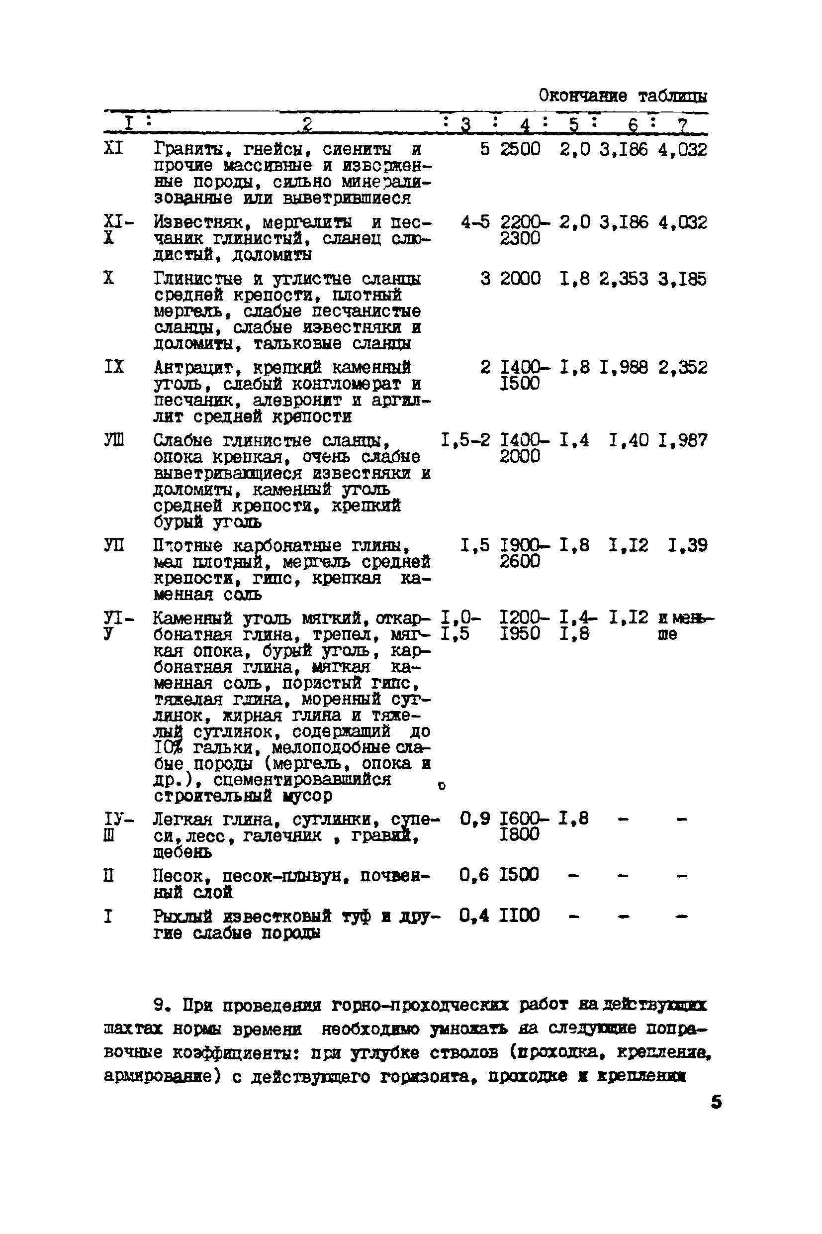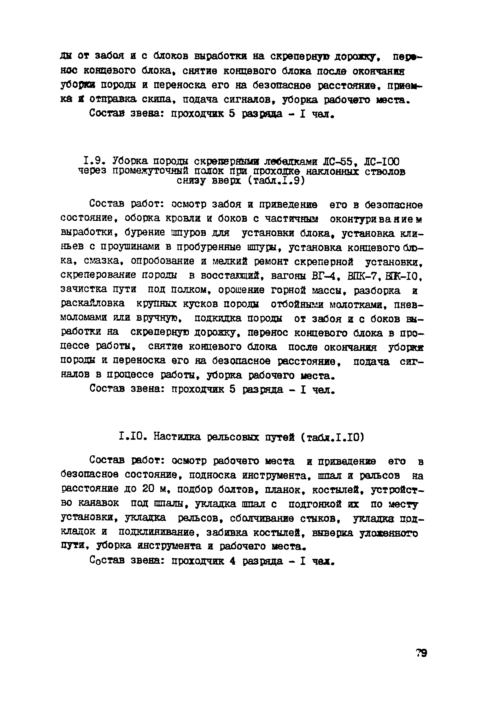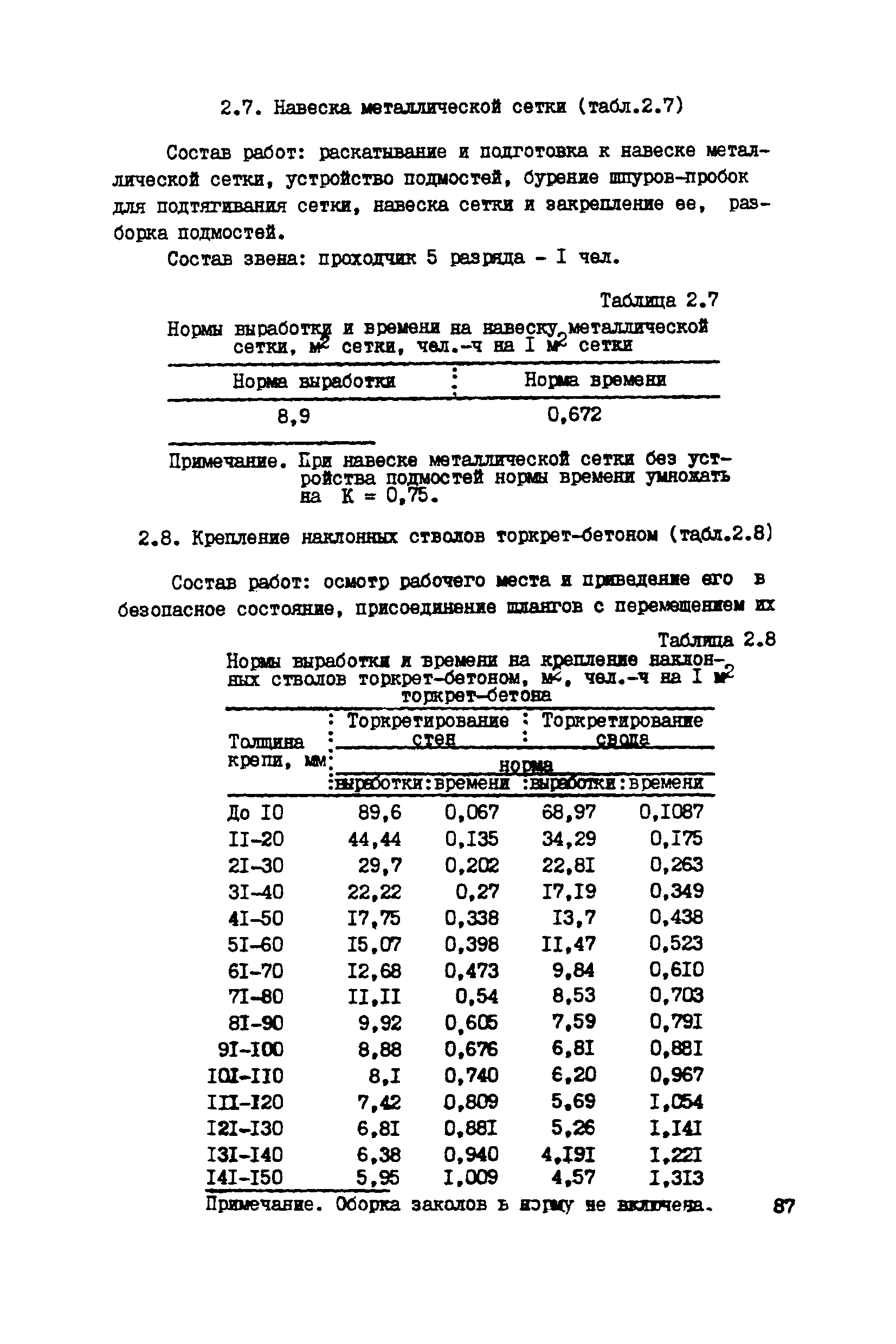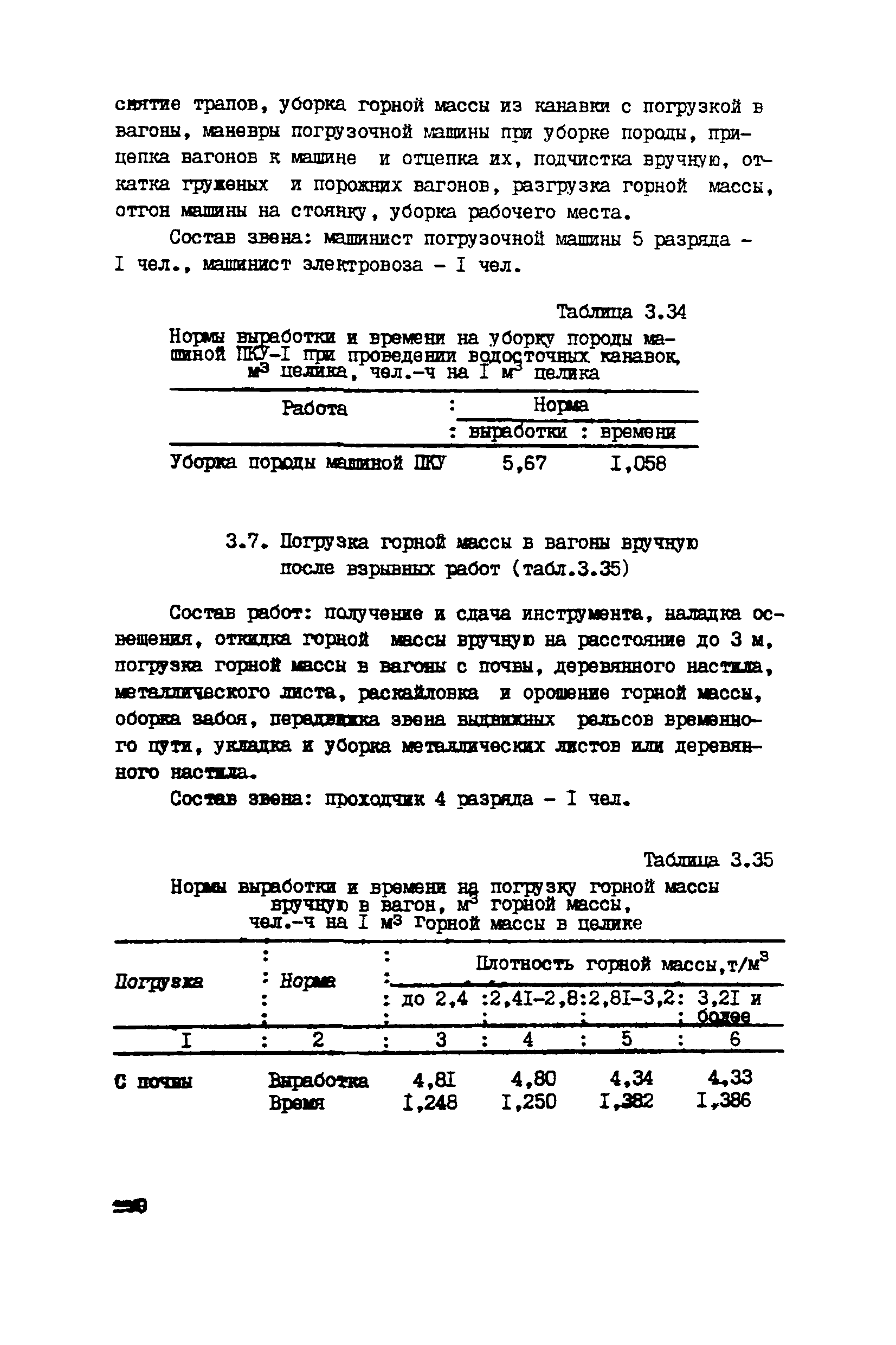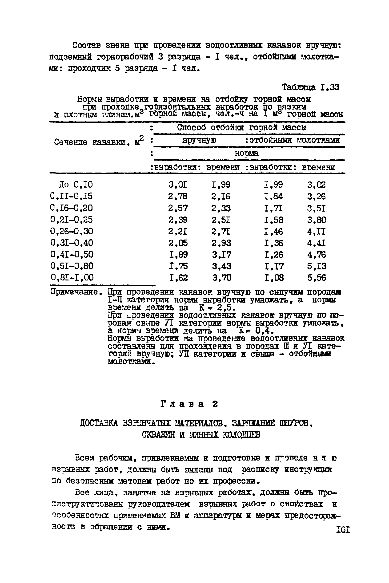 | Оглавление: | Общая часть Раздел 1. Проходка, крепление и армирование вертикальных стволов шахт; проведение сопряжений стволов с околоствольными дворами Глава 1. Проходка вертикальных стволов шахт 1.1 Проходка вертикальных стволов обычном способом 1.2 Проходка вертикальных стволов по замороженным породам 1.3 Проходка вертикальных стволов по породам, предварительно закрепленным химическим способом Глава 2. Крепление вертикальных стволов шахт бетоном 2.1 Временное крепление стволов металлическими кольцами 2.2 Крепление стволов круглого сечения бетоном и железобетоном 2.3 Крепление вертикальных стволов тюбингами 2.4 Крепление вертикальных стволов анкерной крепью 2.5 Установка и снятие деревянной опалубки заводного тюбингового кольца в конце заходки 2.6 Снятие первого тюбингового кольца 2.7 Сбивка кромки бетона на контакте заходки 2.8 Установка опорного венца из чугунных тюбингов 2.9 Укладка холодного бетона за опалубку при спуске его по трубам 2.10 Крепление стволов торкрет—бетоном Глава 3. Гидроизоляционные работы 3.1 Гидроизоляция тюбинговой крепи 3.2 Расчеканка свинцовых прокладок в тюбинговых швах и чеканка тюбинговых швов свинцовым шнуром 3.3 Очистка чугунной тюбинговой крепи после проходки и крепления ствола 3.4 Пикотаж горизонтального шва между двумя звеньями тюбинговой крепи ствола 3.5 Гидроизоляция чугунной тюбинговой крепи тампонажным раствором при поступлении его по трубам самотеком с поверхности 3.6 Первичное нагнетание за крепь шахтного ствола 3.7 Контрольное в нагнетание за крепь шахтного ствола 3.8 Контрольное подтягивание и замена болтов в тюбинговой отделке шахтного ствола 3.9 Установка и замена пробок в отверстиях тюбингов 3.10 Изоляция стыков тюбинговой крепи шахтного ствола 3.11 Штукатурка бетонной поверхности под изоляцию и по изоляции 3.12 Оклеечная изоляция стенок шахтного ствола 3.13 Устройство пикотажных манжет при крепления вертикальных стволов шахт железобетонными тюбингами 3.14 Бурение шпуров в бетоне Глава 4. Армирование стволов 4.1 Долбление лунок под расстрелы 4.2 Установка и заделка металлических расстрелов в готовые лунки 4.3 Сболчивание стальных расстрелов 4.4 Установка проводников 4.5 Оборудование лестничных отделений в стволах шахт 4.6 Устройство и разборка настилов по расстрелам 4.7 Установка рудничных станков на сопряжение с околоствольным двором 4.8 Монтаж компенсационных балок из спец профиля в стволе 4.9 Монтаж и демонтаж постоянных трубопроводов Глава 5. Вспомогательные работы при проходке и креплении стволов шахт 5.1 Устройство, разборка и переноска рабочего полка 5.2 Устройство деревянного временного переносного полка в стволе 5.3 Монтаж одноэтажных и двухэтажных подвесных металлических полков в стволах натяжных рам и предохранительных полков Глава 6. Устройство в стволах круглого сечения бетонного опорного венца (башмака) Глава 7. Проведение сопряжений вертикальных стволов с околоствольными дворами Раздел II. Проходка и крепление наклонных стволов Глава 1. Проходка наклонных стволов Глава 2. Крепление наклонных стволов Глава 3. Гидроизоляционные работы Глава 4. Вспомогательные работы при проходке и креплении вертикальных и наклонных стволов с применением специальных способов Раздел III. Проходка и крепление горизонтальных, наклонных и восстающих горных выработок Глава 1. Буровые работы Глава 2. Д
