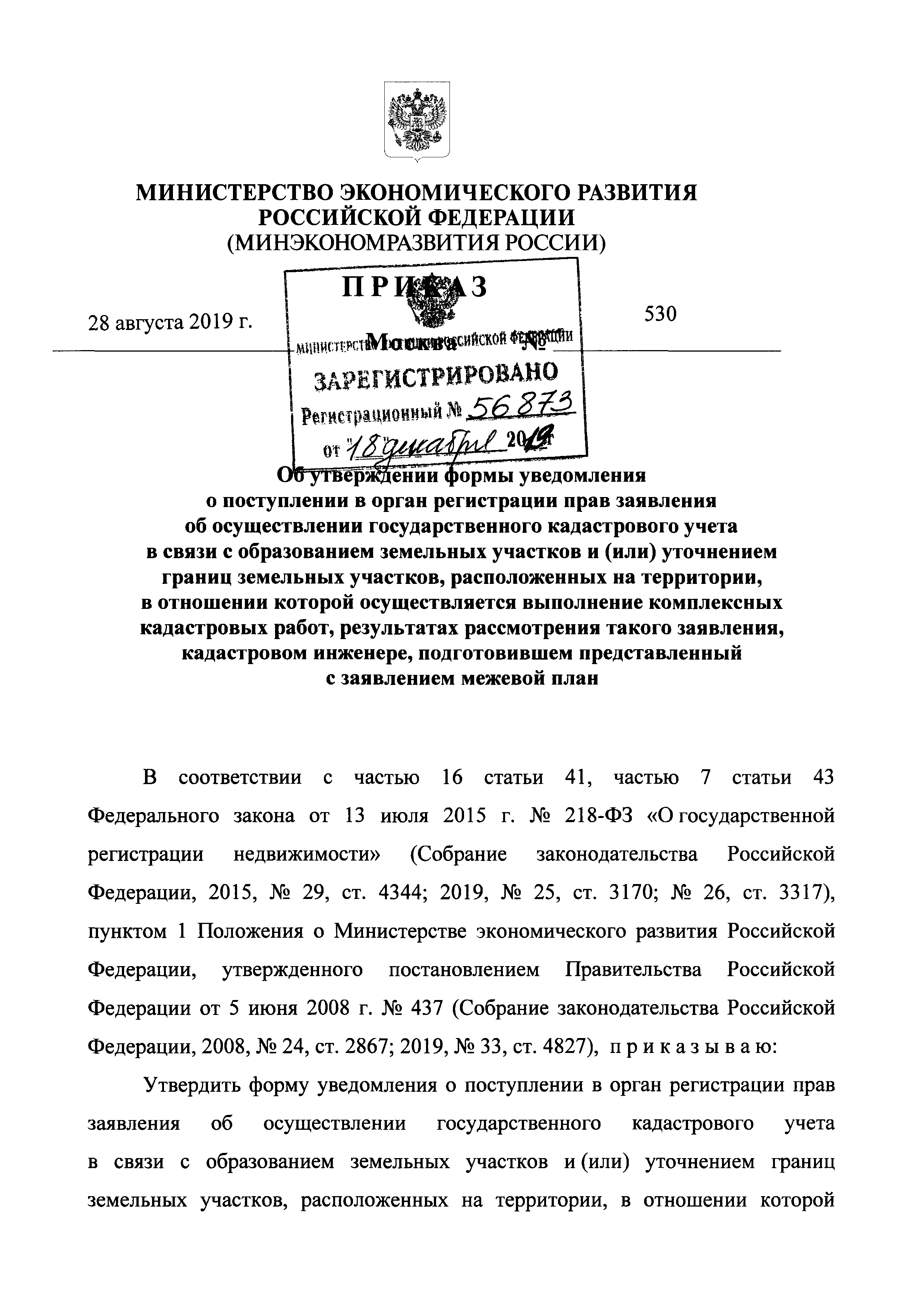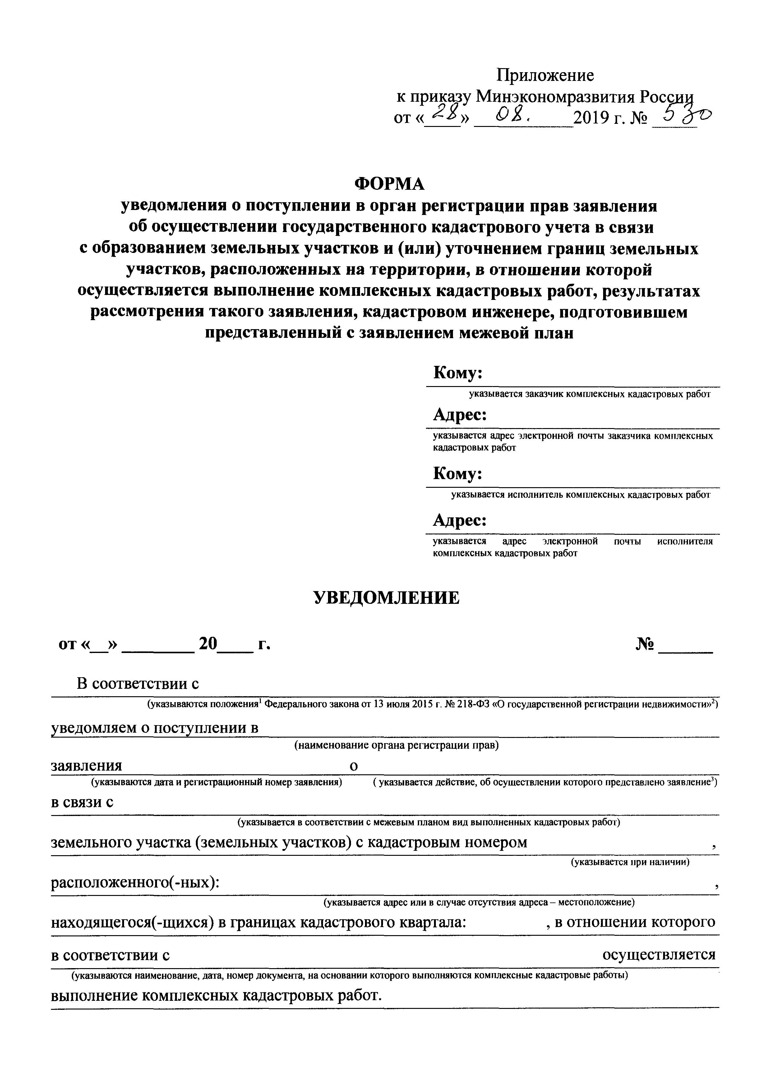 Форма уведомления о поступлении в орган регистрации прав заявления об осуществлении государственного кадастрового учета в связи с образованием земельных участков и (или) уточнением границ земельных участков, расположенных на территории, в отношении которой осуществляется выполнение комплексных кадастровых работ, результатах рассмотрения такого заявления, кадастровом инженере, подготовившем представленный с заявлением межевой план| Статус: | действует | | Название рус.: | Форма уведомления о поступлении в орган регистрации прав заявления об осуществлении государственного кадастрового учета в связи с образованием земельных участков и (или) уточнением границ земельных участков, расположенных на территории, в отношении которой осуществляется выполнение комплексных кадастровых работ, результатах рассмотрения такого заявления, кадастровом инженере, подготовившем представленный с заявлением межевой план | | Дата добавления в базу: | 01.02.2020 | | Дата актуализации: | 01.01.2021 | | Дата введения: | 30.12.2019 | | Утверждён: | 28.08.2019 Министерство экономического развития РФ (530)