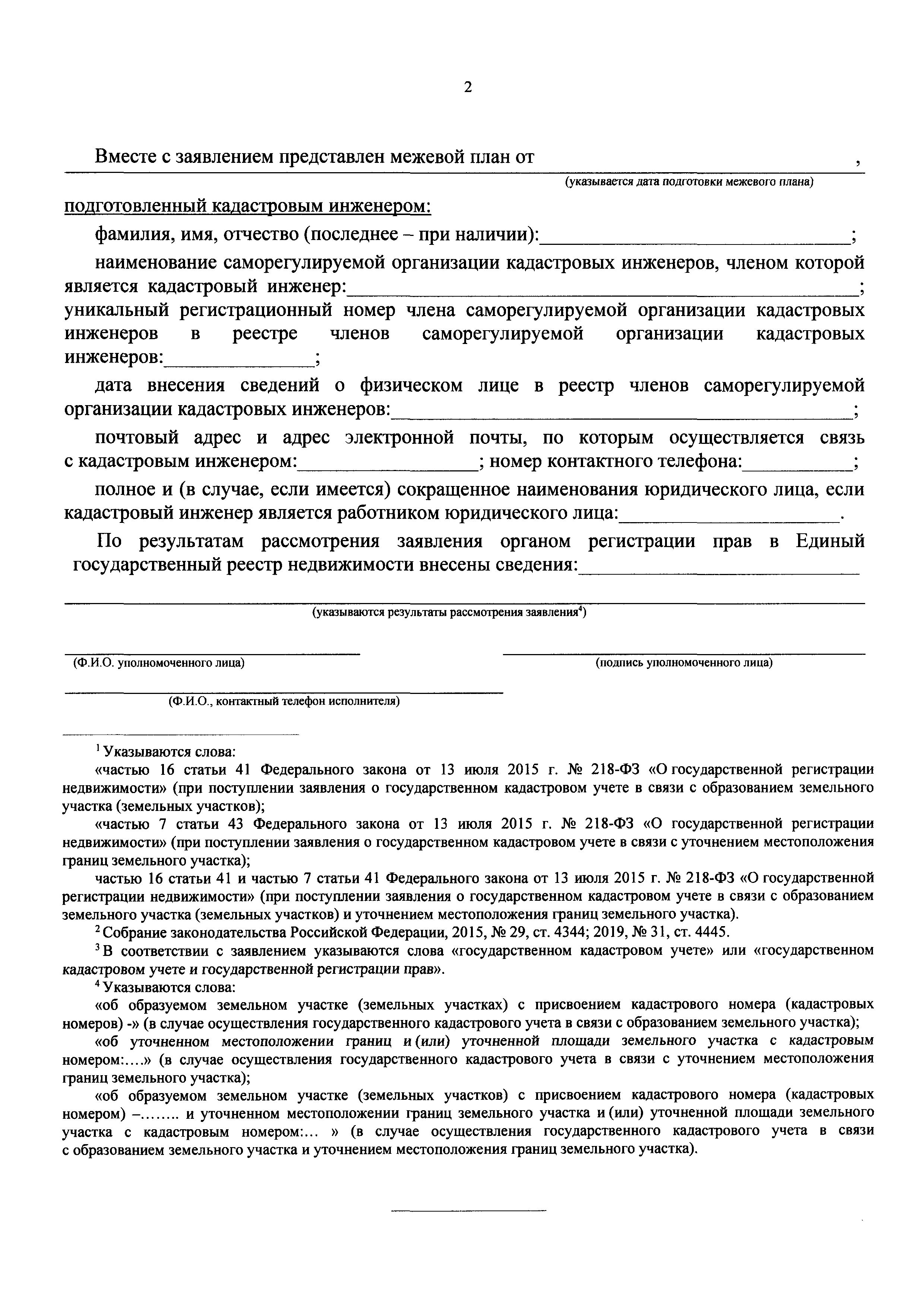 Скачать Форма уведомления о поступлении в орган регистрации прав заявления об осуществлении государственного кадастрового учета в связи с образованием земельных участков и (или) уточнением границ земельных участков, расположенных на территории, в отношении которой осуществляется выполнение комплексных кадастровых работ, результатах рассмотрения такого заявления, кадастровом инженере, подготовившем представленный с заявлением межевой планДата актуализации: 01.01.2021