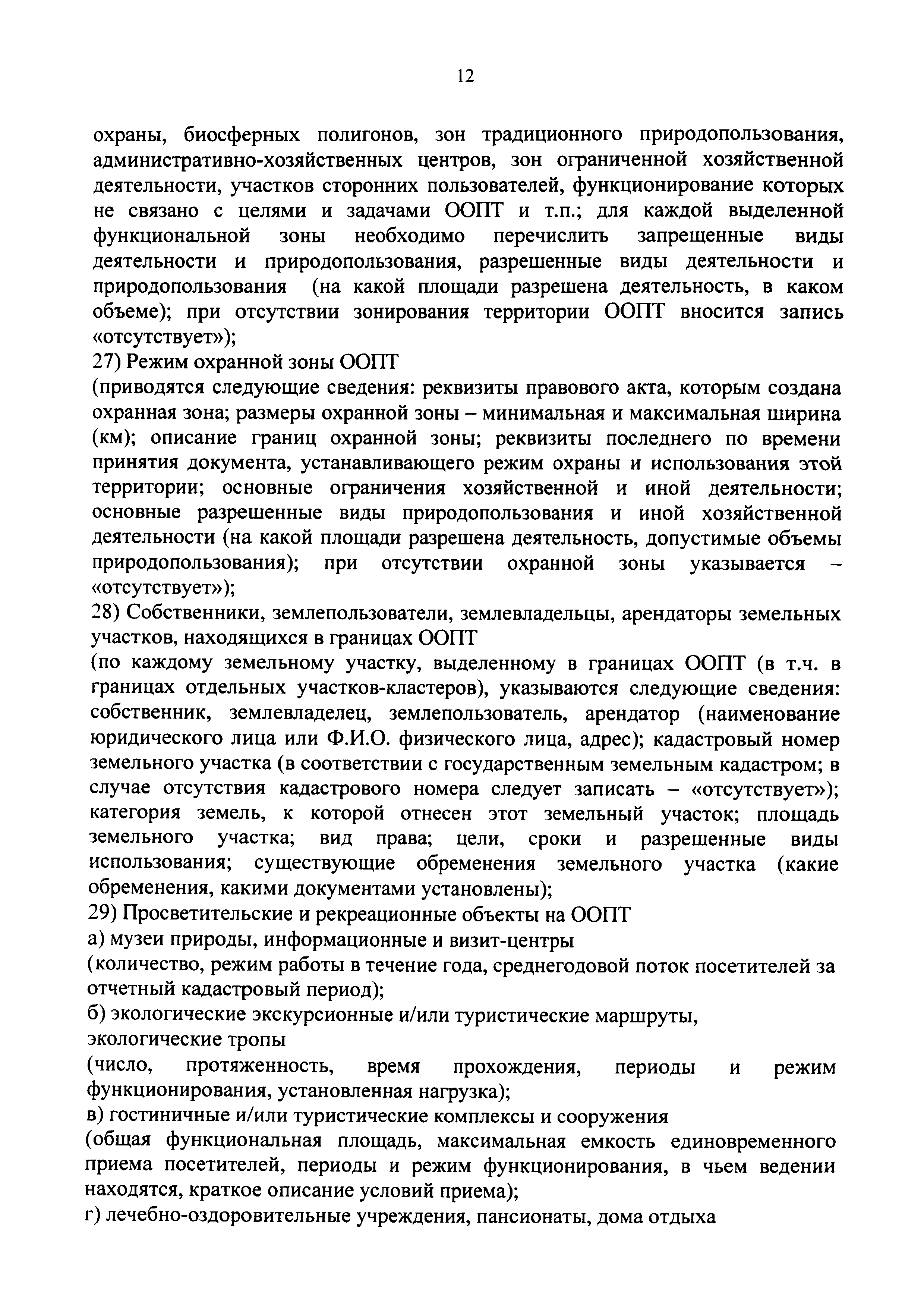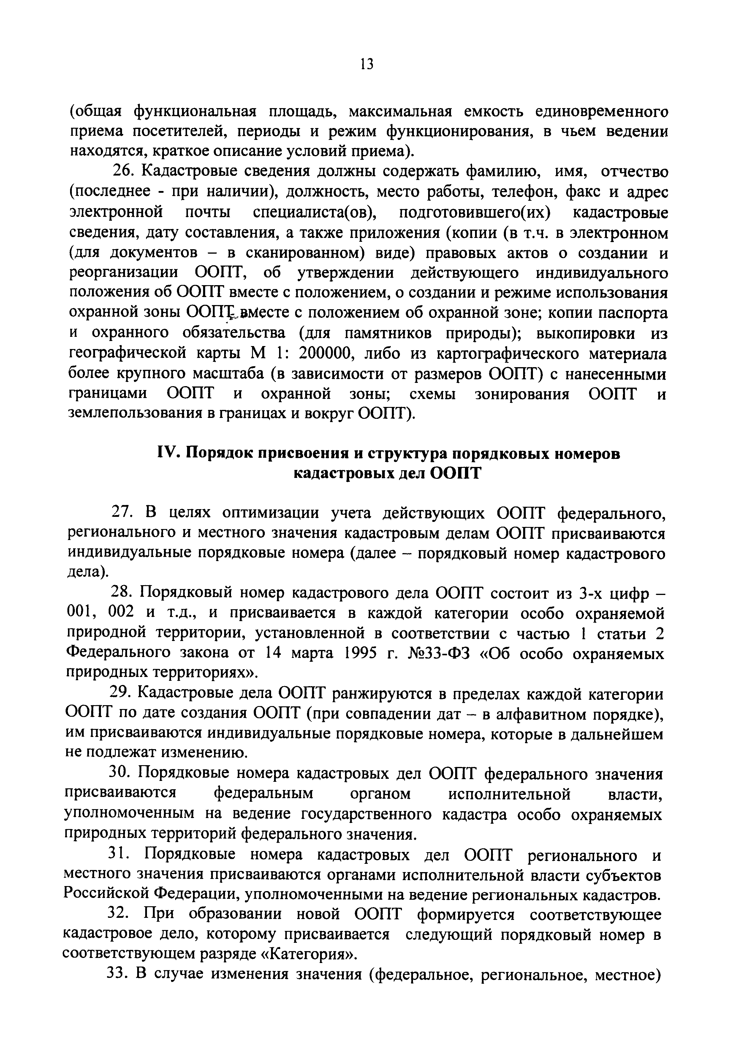 | Оглавление: | I. Общие положения II. Требования к структуре государственного кадастра особо охраняемых природных территорий III. Требования к представляемым сведениям, необходимым для целей ведения государственного кадастра особо охраняемых природных территорий IV. Порядок присвоения и структура порядковых номеров кадастровых дел ООПТ V. Ведение государственного кадастра ООПТ |