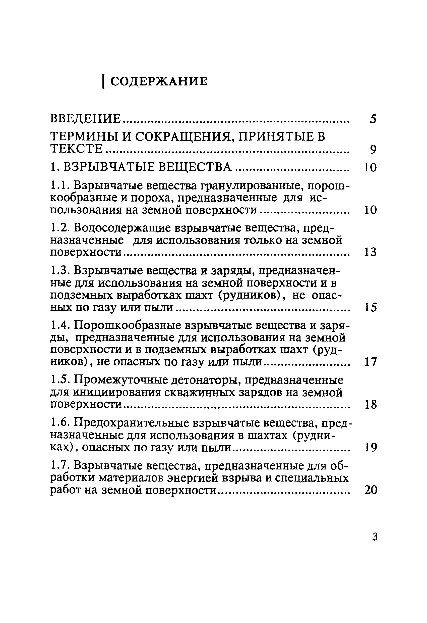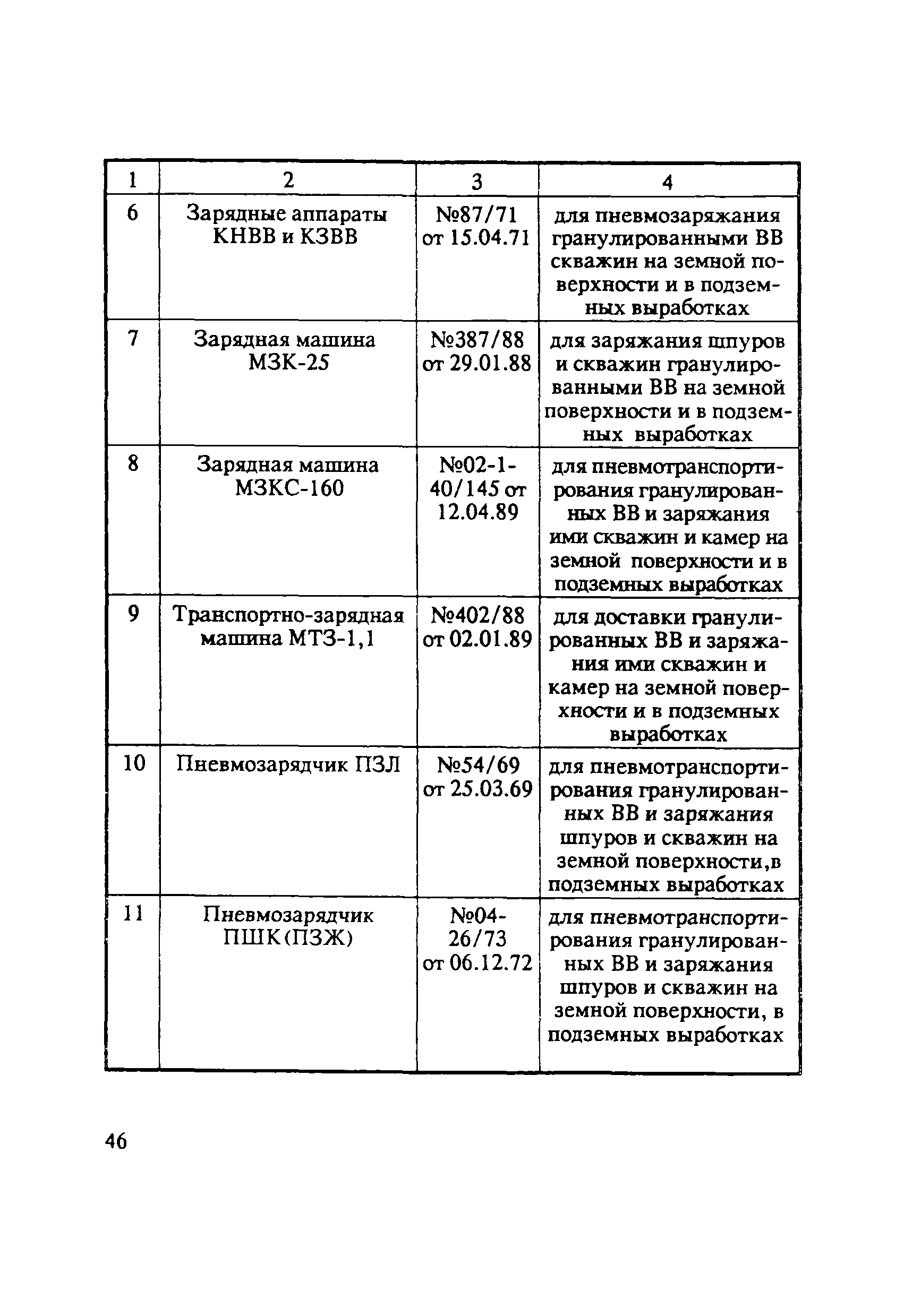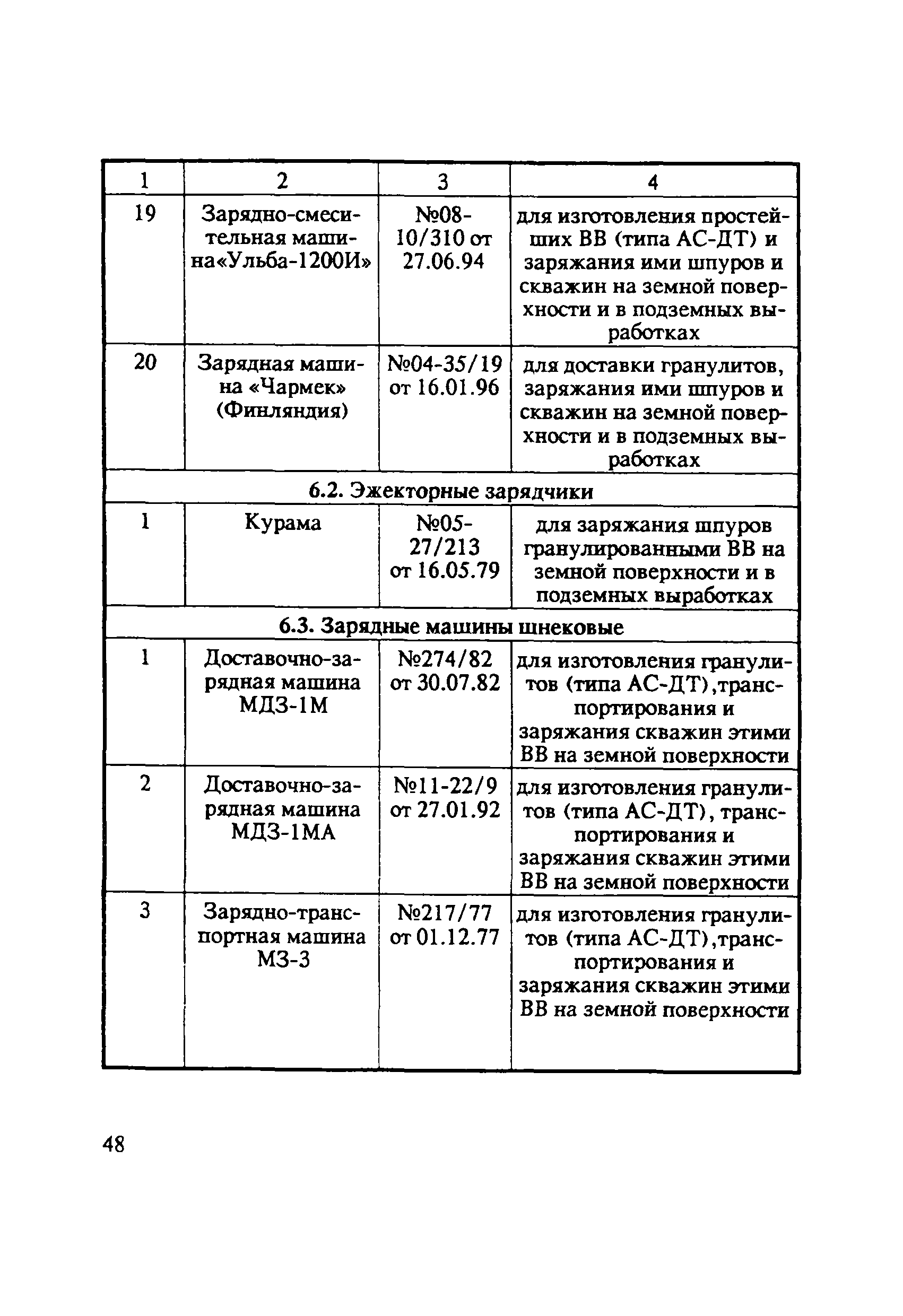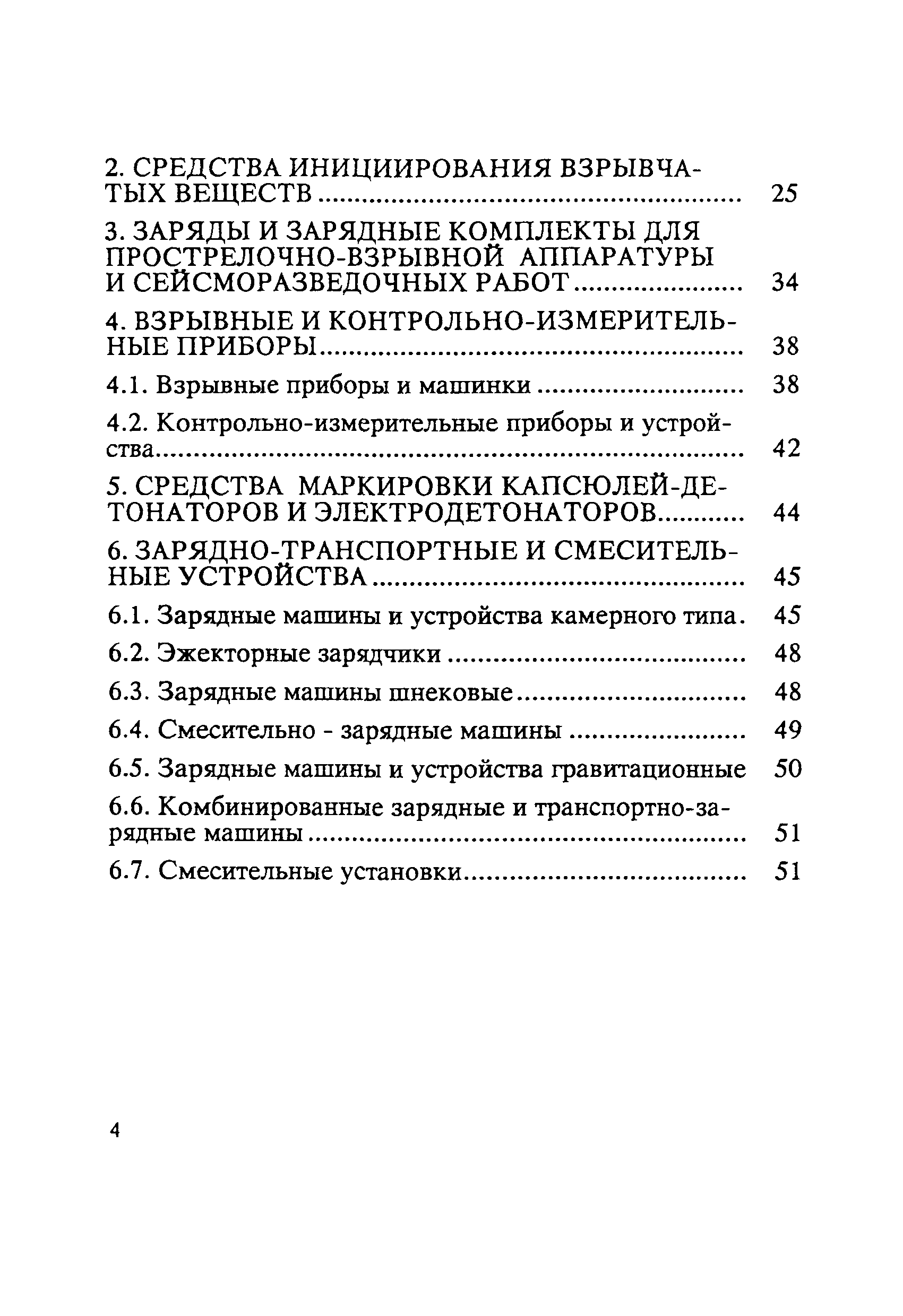 | Оглавление: | Введение Термины и сокращения, принятые в тексте 1. Взрывчатые вещества 1.1. Взрывчатые вещества гранулированные, порошкообразные и пороха, предназначенные для использования на земной поверхности 1.2. Водосодержащие взрывчатые вещества, предназначенные для использования только на земной поверхности 1.3. Взрывчатые вещества и заряды, предназначенные для использования на земной поверхности и в подземных выработках шахт (рудников), не опасных по газу или пыли 1.4. Порошкообразные взрывчатые вещества и заряды, предназначенные для использования на земной поверхности и в подземных выработках шахт (рудников), не опасных по газу или пыли 1.5. Промежуточные детонаторы, предназначенные для инициирования скважинных зарядов на земной поверхности 1.6. Предохранительные взрывчатые вещества, предназначенные для использования в шахтах (рудниках), опасных по газу или пыли 1.7. Взрывчатые вещества, предназначенные для обработки материалов энергией взрыва и специальных работ на земной поверхности 2. Средства инициирования взрывчатых веществ 3. Заряды и зарядные комплекты для прострелочно-взрывной аппаратуры и сейсморазведочных работ 4. Взрывные и контрольно-измерительные приборы 4.1. Взрывные приборы и машинки 4.2. Контрольно-измерительные приборы и устройства 5. Средства маркировки капсюлей-детонаторов и электродетонаторов 6. Зарядно-транспортные и смесительные устройства 6.1. Зарядные машины и устройства камерного типа 6.2. Эжекторные зарядчики 6.3. Зарядные машины шнековые 6.4. Смесительно-зарядные машины 6.5. Зарядные машины и устройства гравитационные 6.6. Комбинированные зарядные и транспортно-зарядные машины 6.7. Смесительные установки |