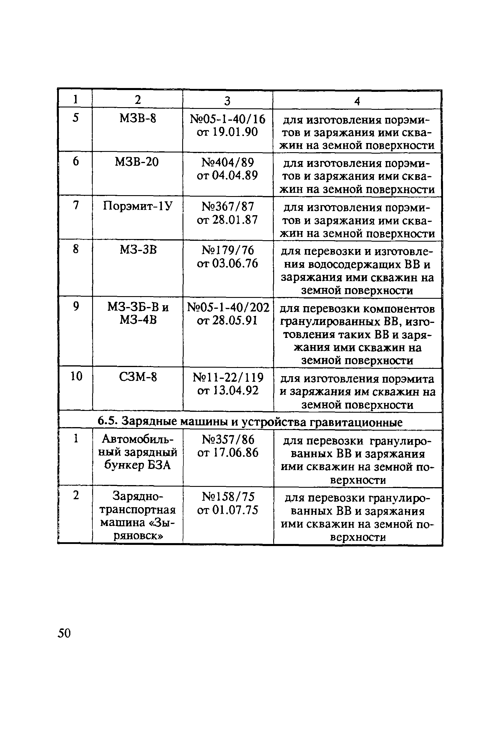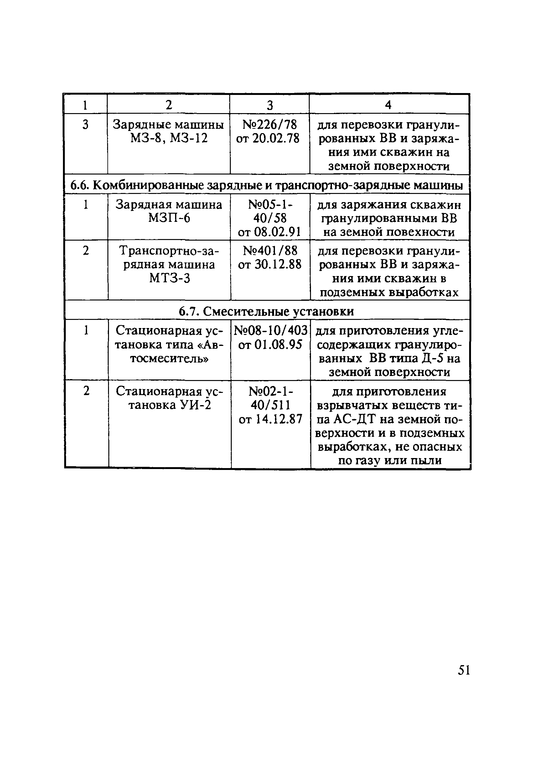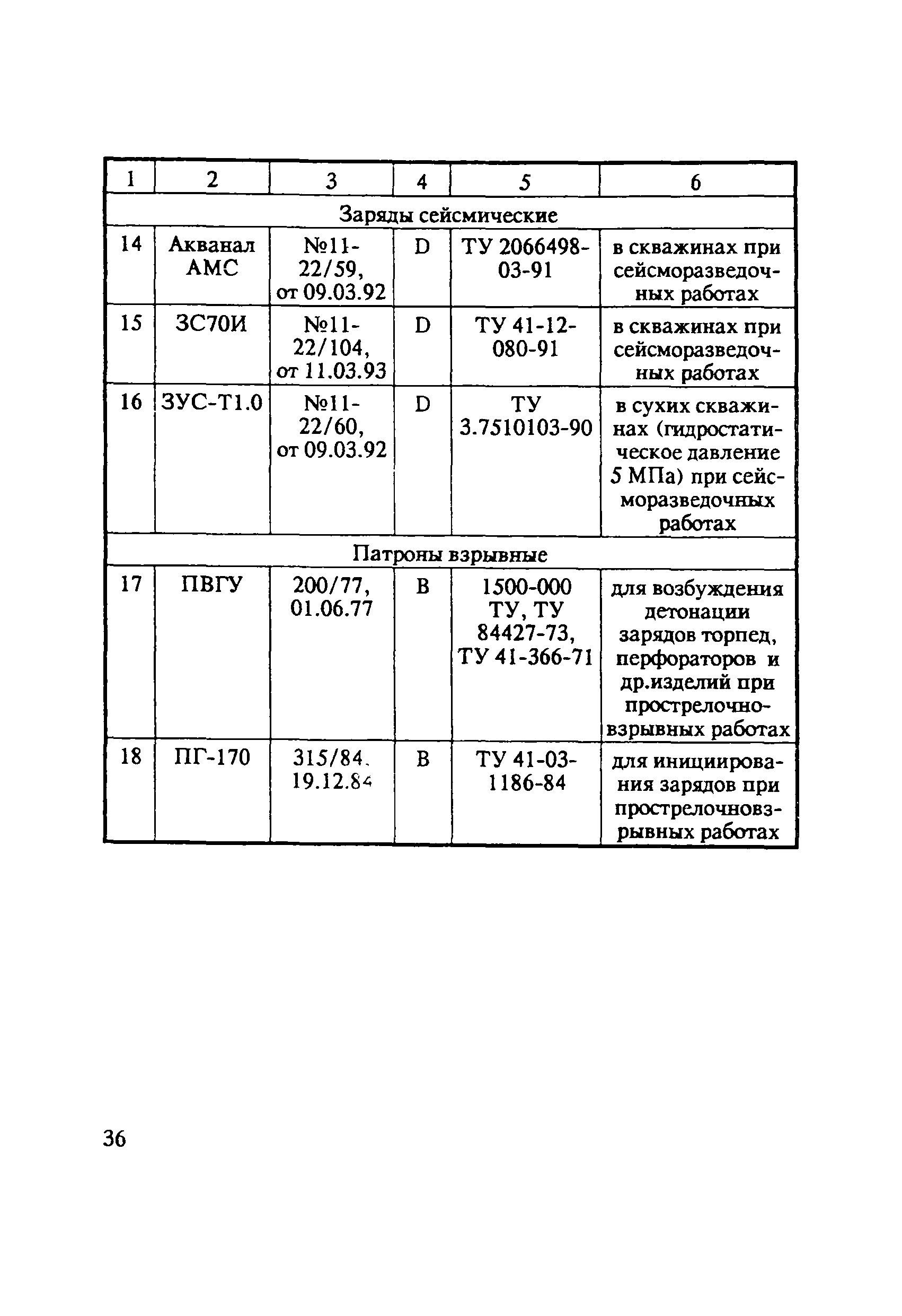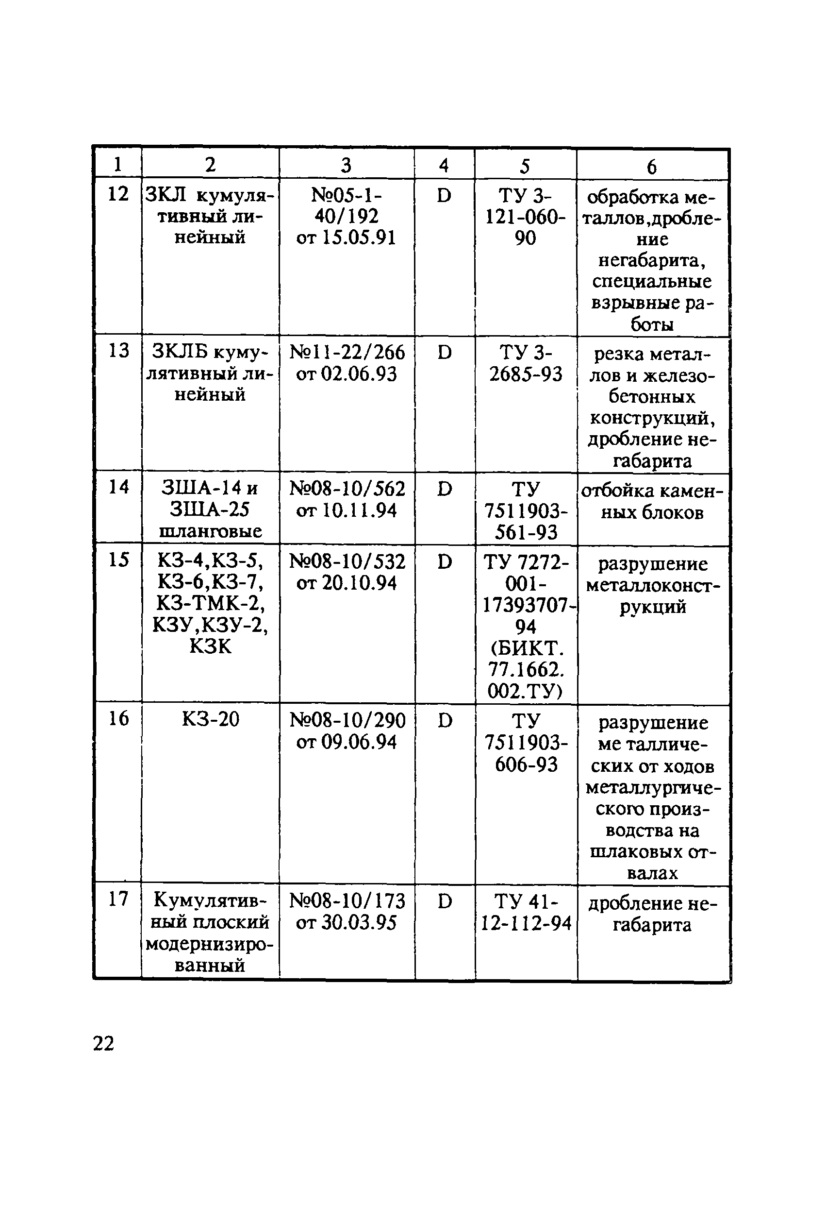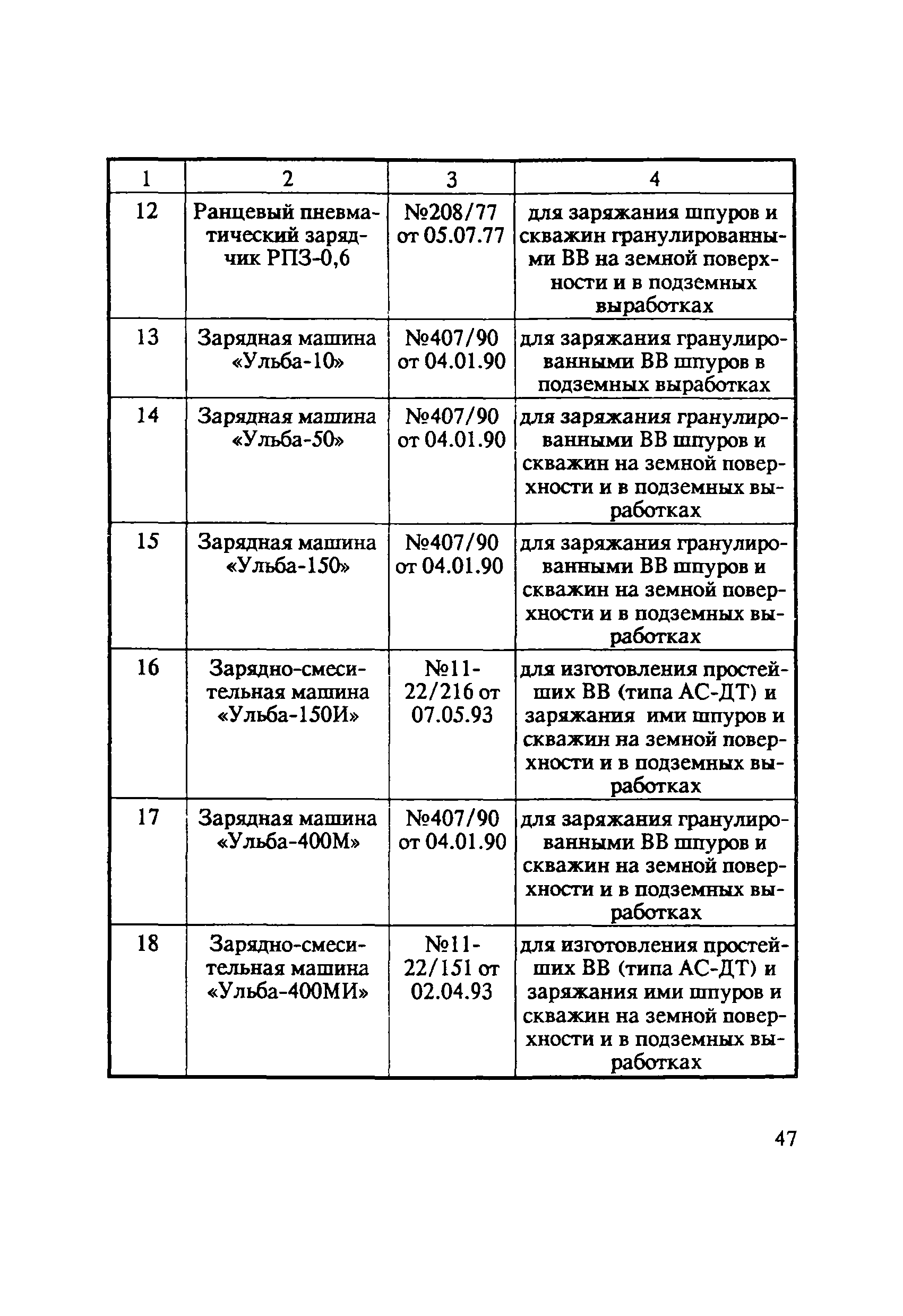 | Оглавление: | Введение Термины и сокращения, принятые в тексте 1. Взрывчатые вещества 1.1. Взрывчатые вещества гранулированные, порошкообразные и пороха, предназначенные для использования на земной поверхности 1.2. Водосодержащие взрывчатые вещества, предназначенные для использования только на земной поверхности 1.3. Взрывчатые вещества и заряды, предназначенные для использования на земной поверхности и в подземных выработках шахт (рудников), не опасных по газу или пыли 1.4. Порошкообразные взрывчатые вещества и заряды, предназначенные для использования на земной поверхности и в подземных выработках шахт (рудников), не опасных по газу или пыли 1.5. Промежуточные детонаторы, предназначенные для инициирования скважинных зарядов на земной поверхности 1.6. Предохранительные взрывчатые вещества, предназначенные для использования в шахтах (рудниках), опасных по газу или пыли 1.7. Взрывчатые вещества, предназначенные для обработки материалов энергией взрыва и специальных работ на земной поверхности 2. Средства инициирования взрывчатых веществ 3. Заряды и зарядные комплекты для прострелочно-взрывной аппаратуры и сейсморазведочных работ 4. Взрывные и контрольно-измерительные приборы 4.1. Взрывные приборы и машинки 4.2. Контрольно-измерительные приборы и устройства 5. Средства маркировки капсюлей-детонаторов и электродетонаторов 6. Зарядно-транспортные и смесительные устройства 6.1. Зарядные машины и устройства камерного типа 6.2. Эжекторные зарядчики 6.3. Зарядные машины шнековые 6.4. Смесительно-зарядные машины 6.5. Зарядные машины и устройства гравитационные 6.6. Комбинированные зарядные и транспортно-зарядные машины 6.7. Смесительные установки |