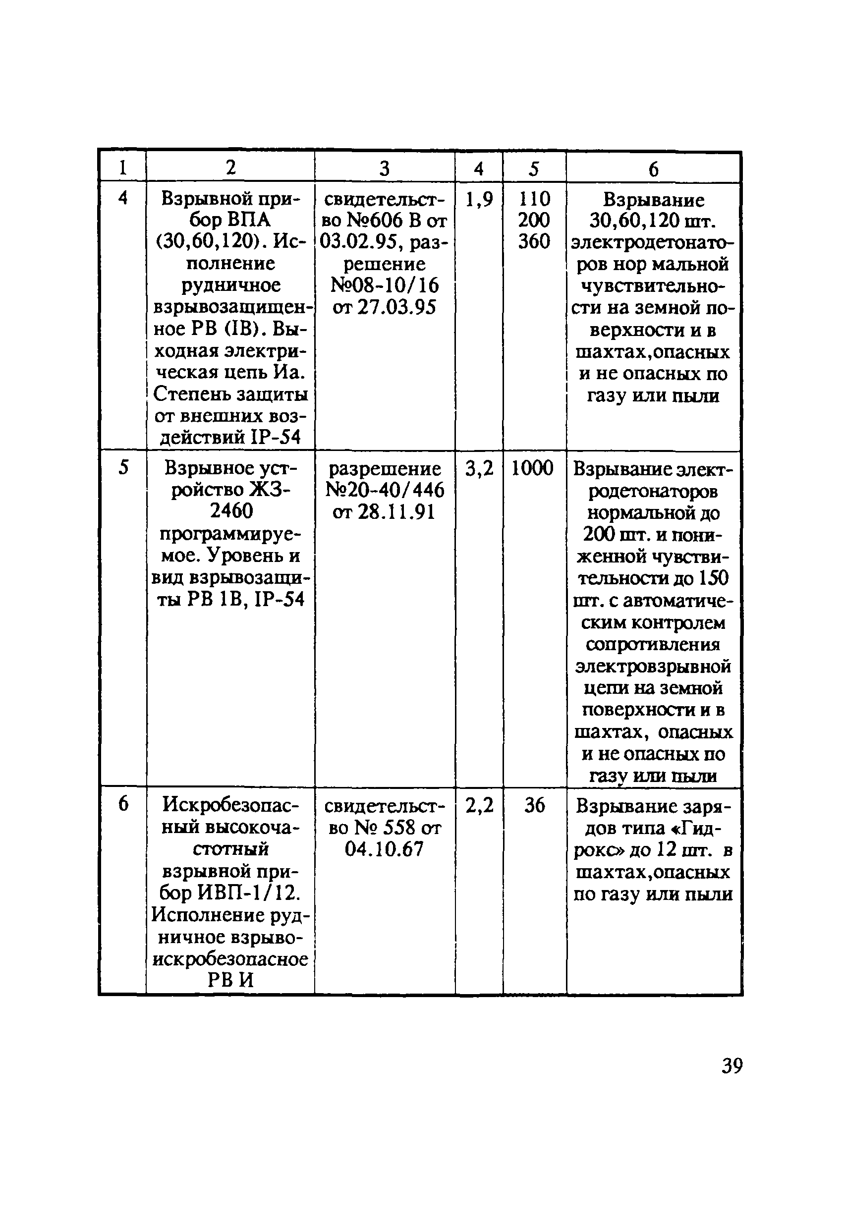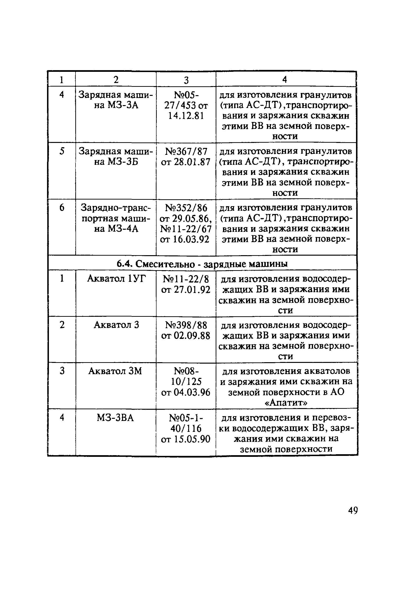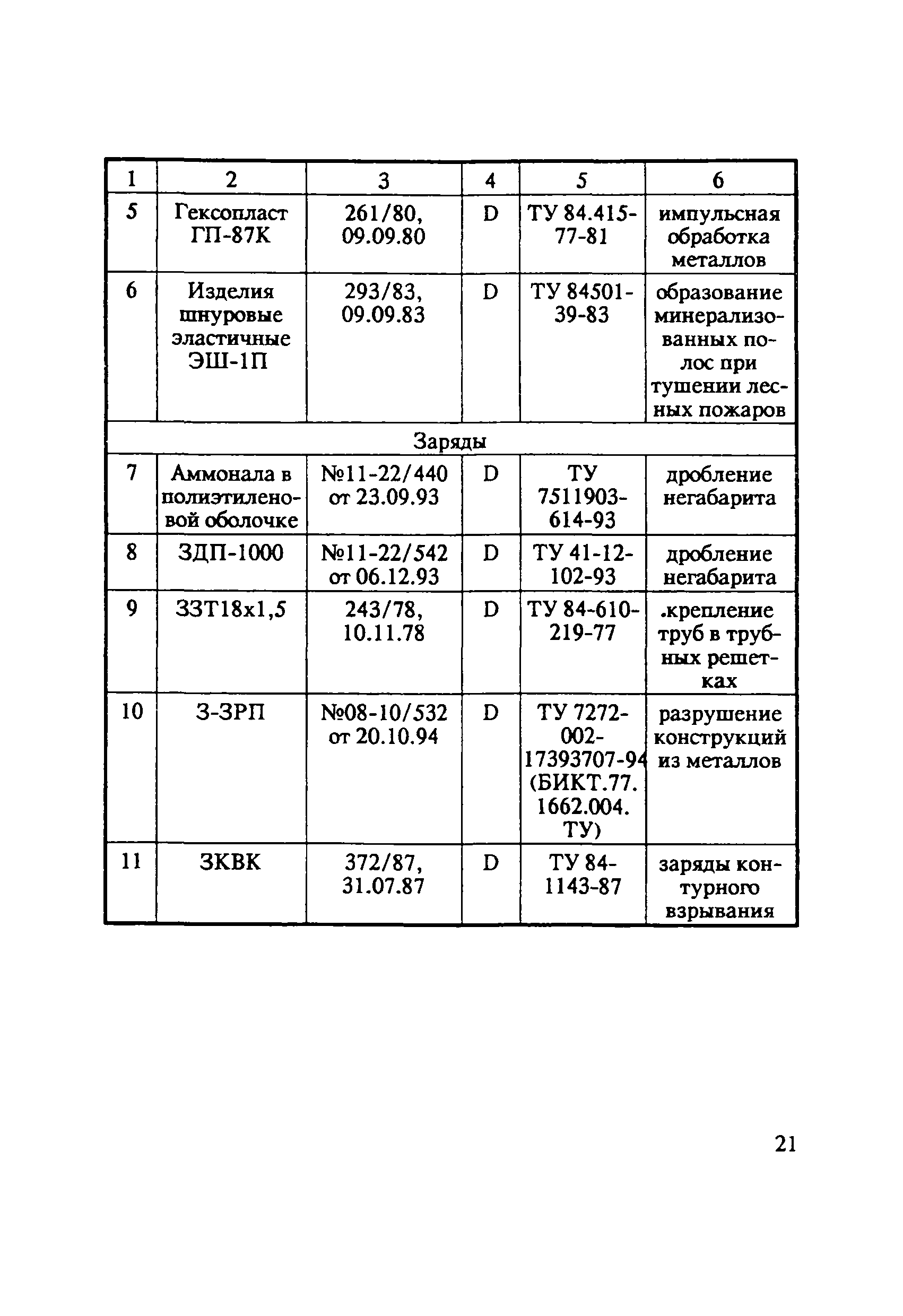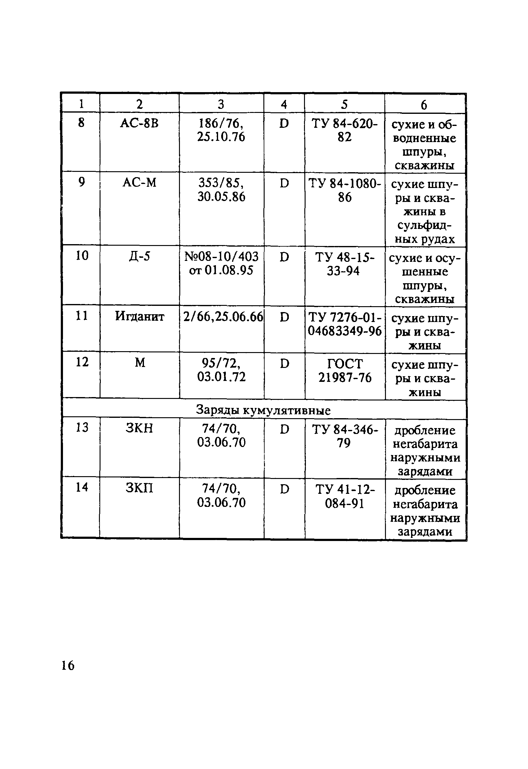 | Оглавление: | Введение Термины и сокращения, принятые в тексте 1. Взрывчатые вещества 1.1. Взрывчатые вещества гранулированные, порошкообразные и пороха, предназначенные для использования на земной поверхности 1.2. Водосодержащие взрывчатые вещества, предназначенные для использования только на земной поверхности 1.3. Взрывчатые вещества и заряды, предназначенные для использования на земной поверхности и в подземных выработках шахт (рудников), не опасных по газу или пыли 1.4. Порошкообразные взрывчатые вещества и заряды, предназначенные для использования на земной поверхности и в подземных выработках шахт (рудников), не опасных по газу или пыли 1.5. Промежуточные детонаторы, предназначенные для инициирования скважинных зарядов на земной поверхности 1.6. Предохранительные взрывчатые вещества, предназначенные для использования в шахтах (рудниках), опасных по газу или пыли 1.7. Взрывчатые вещества, предназначенные для обработки материалов энергией взрыва и специальных работ на земной поверхности 2. Средства инициирования взрывчатых веществ 3. Заряды и зарядные комплекты для прострелочно-взрывной аппаратуры и сейсморазведочных работ 4. Взрывные и контрольно-измерительные приборы 4.1. Взрывные приборы и машинки 4.2. Контрольно-измерительные приборы и устройства 5. Средства маркировки капсюлей-детонаторов и электродетонаторов 6. Зарядно-транспортные и смесительные устройства 6.1. Зарядные машины и устройства камерного типа 6.2. Эжекторные зарядчики 6.3. Зарядные машины шнековые 6.4. Смесительно-зарядные машины 6.5. Зарядные машины и устройства гравитационные 6.6. Комбинированные зарядные и транспортно-зарядные машины 6.7. Смесительные установки |