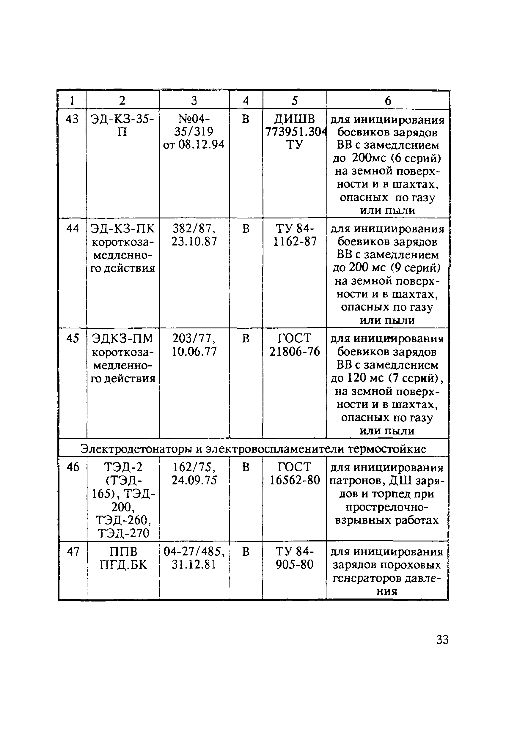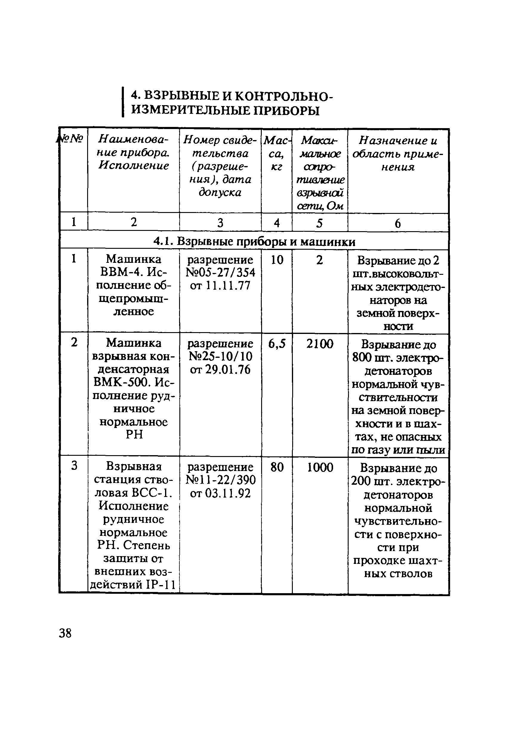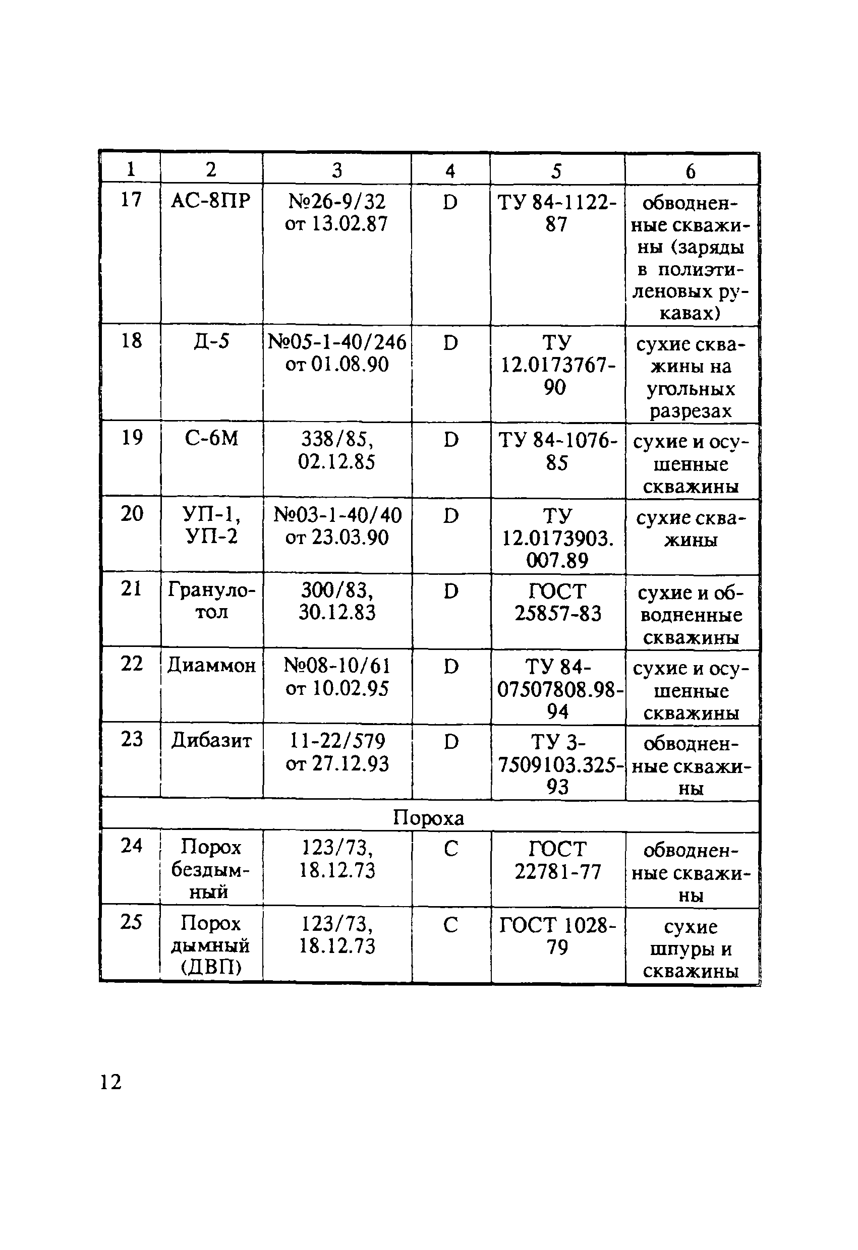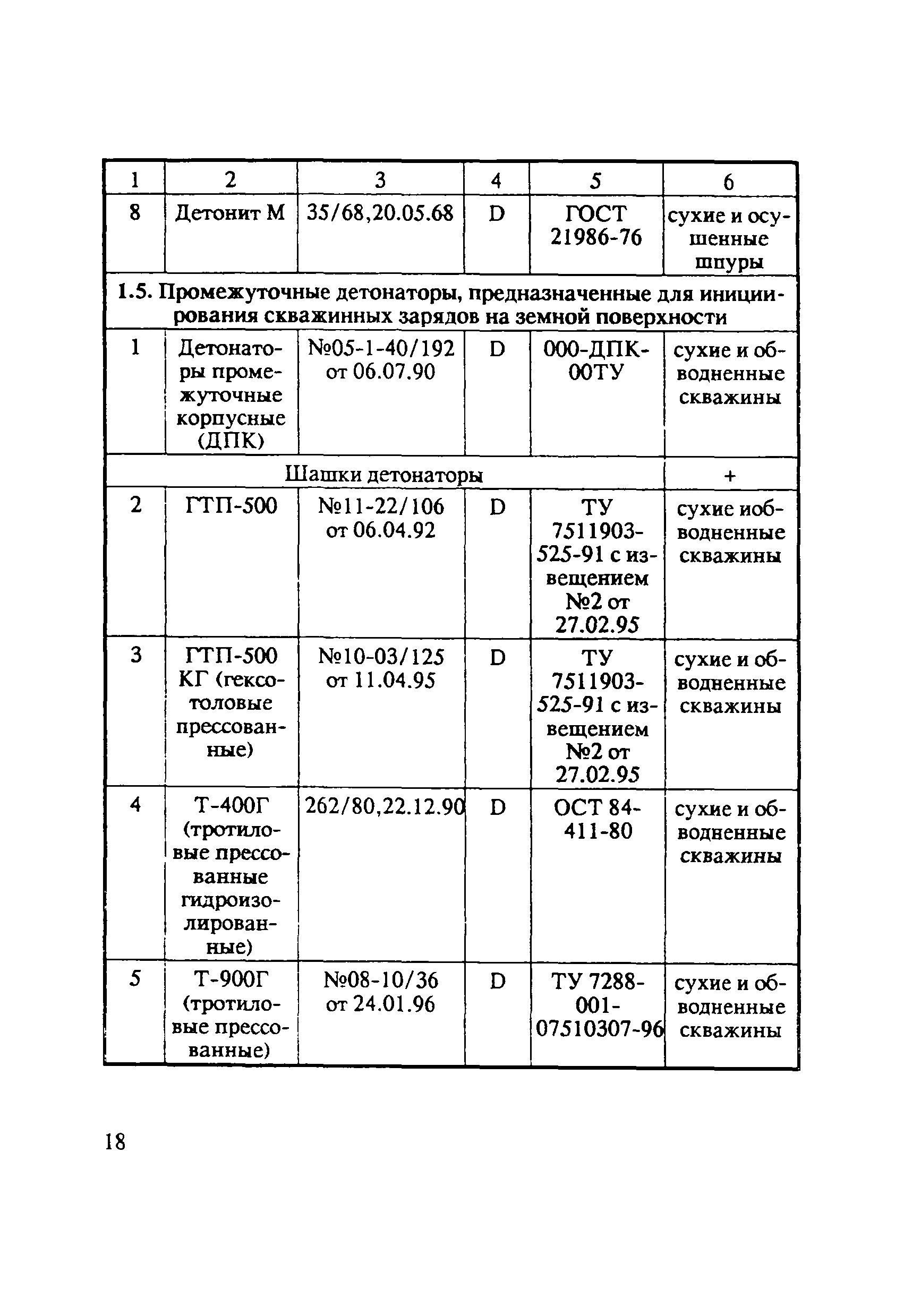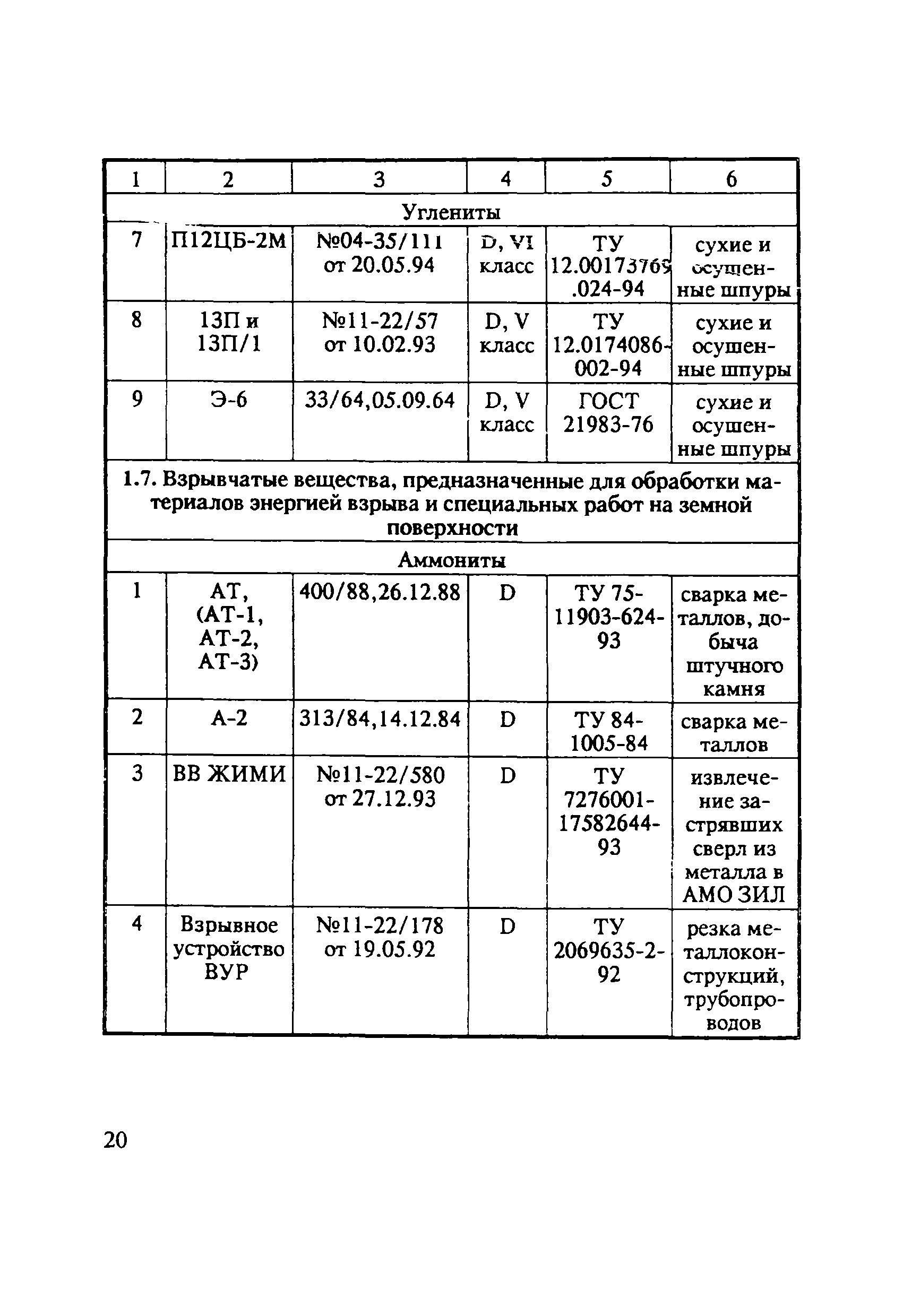 | Оглавление: | Введение Термины и сокращения, принятые в тексте 1. Взрывчатые вещества 1.1. Взрывчатые вещества гранулированные, порошкообразные и пороха, предназначенные для использования на земной поверхности 1.2. Водосодержащие взрывчатые вещества, предназначенные для использования только на земной поверхности 1.3. Взрывчатые вещества и заряды, предназначенные для использования на земной поверхности и в подземных выработках шахт (рудников), не опасных по газу или пыли 1.4. Порошкообразные взрывчатые вещества и заряды, предназначенные для использования на земной поверхности и в подземных выработках шахт (рудников), не опасных по газу или пыли 1.5. Промежуточные детонаторы, предназначенные для инициирования скважинных зарядов на земной поверхности 1.6. Предохранительные взрывчатые вещества, предназначенные для использования в шахтах (рудниках), опасных по газу или пыли 1.7. Взрывчатые вещества, предназначенные для обработки материалов энергией взрыва и специальных работ на земной поверхности 2. Средства инициирования взрывчатых веществ 3. Заряды и зарядные комплекты для прострелочно-взрывной аппаратуры и сейсморазведочных работ 4. Взрывные и контрольно-измерительные приборы 4.1. Взрывные приборы и машинки 4.2. Контрольно-измерительные приборы и устройства 5. Средства маркировки капсюлей-детонаторов и электродетонаторов 6. Зарядно-транспортные и смесительные устройства 6.1. Зарядные машины и устройства камерного типа 6.2. Эжекторные зарядчики 6.3. Зарядные машины шнековые 6.4. Смесительно-зарядные машины 6.5. Зарядные машины и устройства гравитационные 6.6. Комбинированные зарядные и транспортно-зарядные машины 6.7. Смесительные установки |