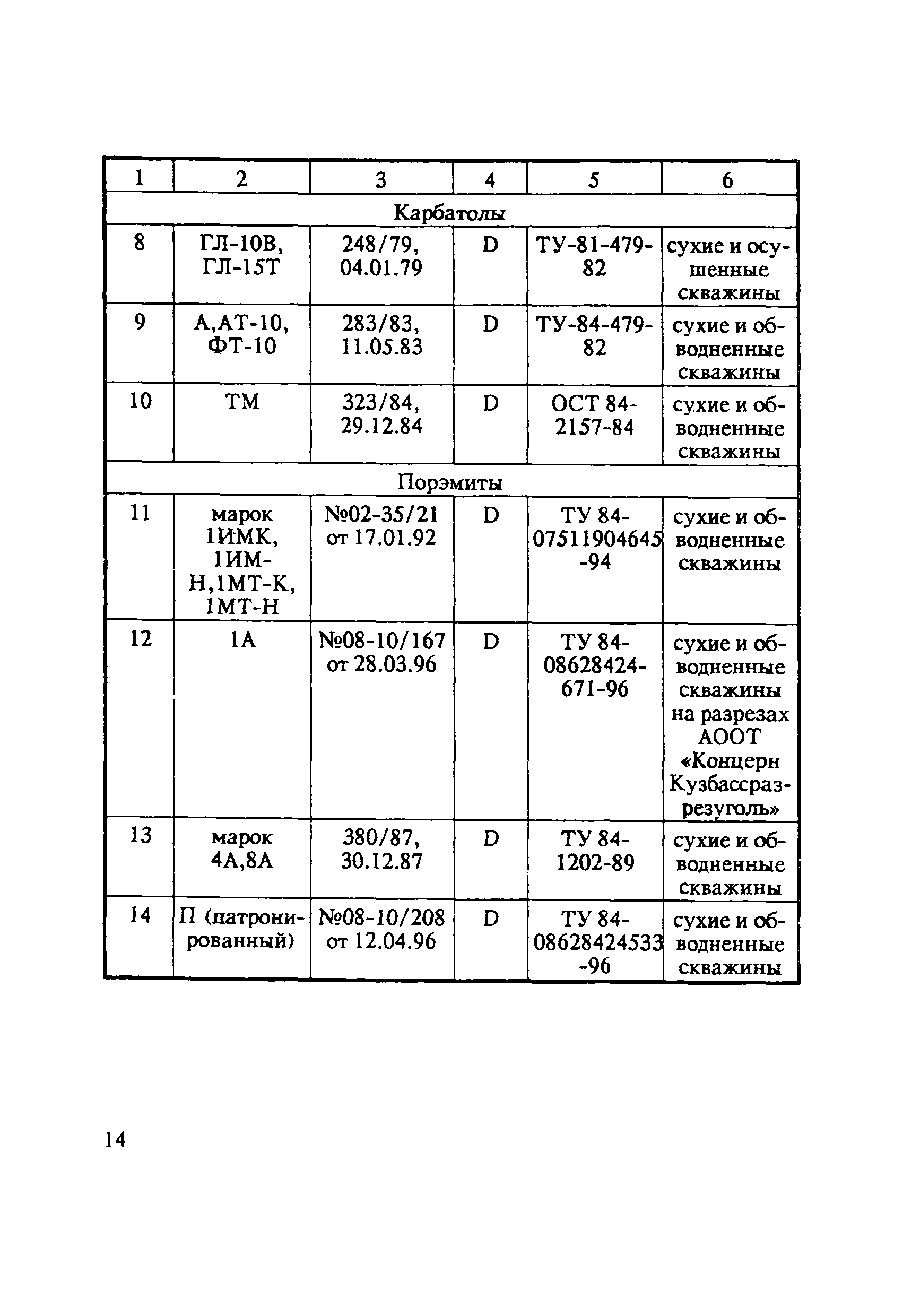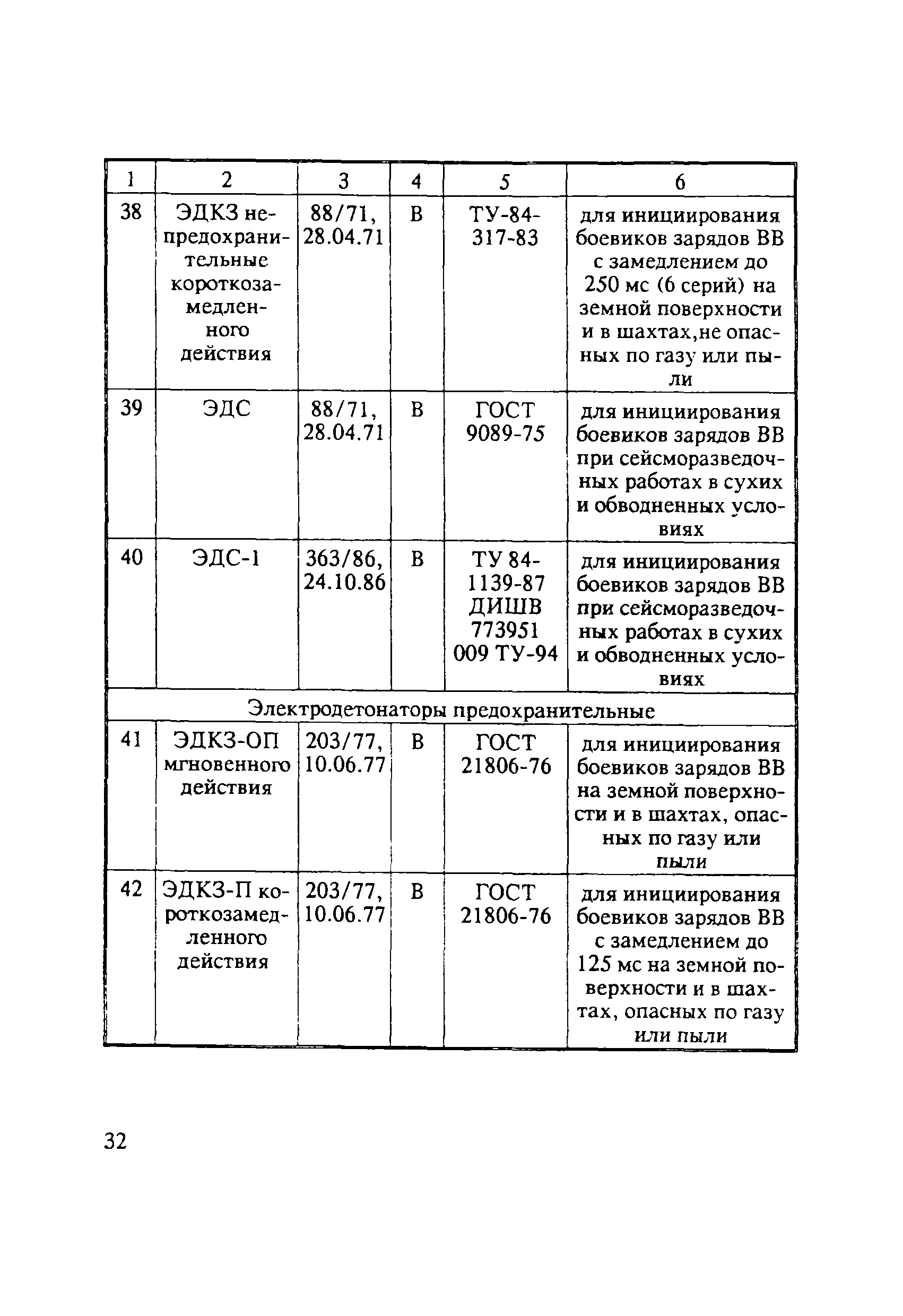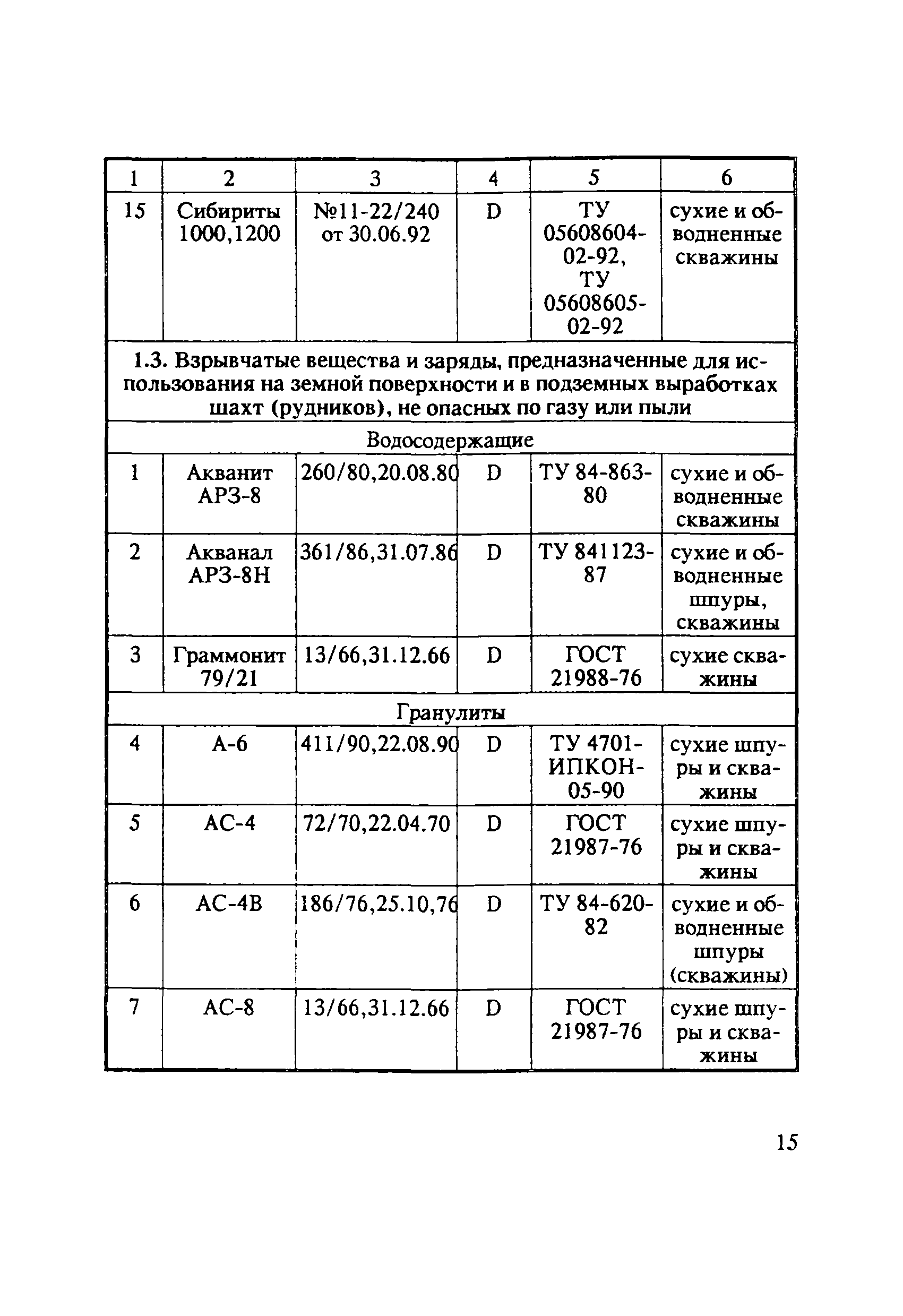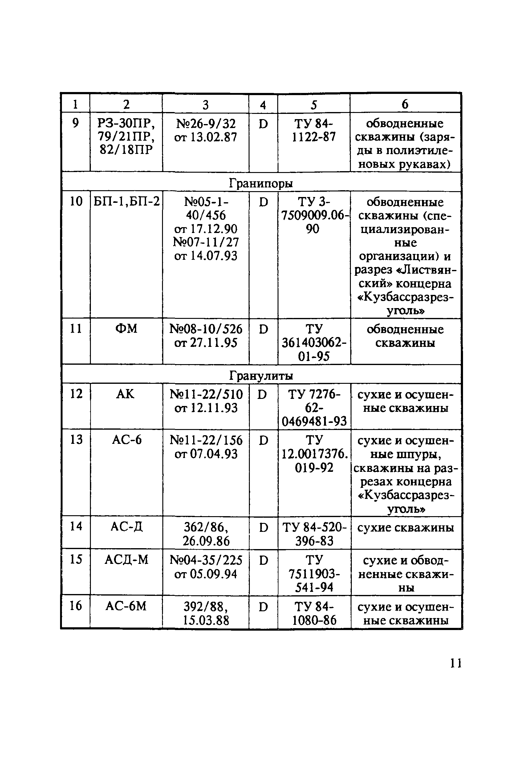 | Оглавление: | Введение Термины и сокращения, принятые в тексте 1. Взрывчатые вещества 1.1. Взрывчатые вещества гранулированные, порошкообразные и пороха, предназначенные для использования на земной поверхности 1.2. Водосодержащие взрывчатые вещества, предназначенные для использования только на земной поверхности 1.3. Взрывчатые вещества и заряды, предназначенные для использования на земной поверхности и в подземных выработках шахт (рудников), не опасных по газу или пыли 1.4. Порошкообразные взрывчатые вещества и заряды, предназначенные для использования на земной поверхности и в подземных выработках шахт (рудников), не опасных по газу или пыли 1.5. Промежуточные детонаторы, предназначенные для инициирования скважинных зарядов на земной поверхности 1.6. Предохранительные взрывчатые вещества, предназначенные для использования в шахтах (рудниках), опасных по газу или пыли 1.7. Взрывчатые вещества, предназначенные для обработки материалов энергией взрыва и специальных работ на земной поверхности 2. Средства инициирования взрывчатых веществ 3. Заряды и зарядные комплекты для прострелочно-взрывной аппаратуры и сейсморазведочных работ 4. Взрывные и контрольно-измерительные приборы 4.1. Взрывные приборы и машинки 4.2. Контрольно-измерительные приборы и устройства 5. Средства маркировки капсюлей-детонаторов и электродетонаторов 6. Зарядно-транспортные и смесительные устройства 6.1. Зарядные машины и устройства камерного типа 6.2. Эжекторные зарядчики 6.3. Зарядные машины шнековые 6.4. Смесительно-зарядные машины 6.5. Зарядные машины и устройства гравитационные 6.6. Комбинированные зарядные и транспортно-зарядные машины 6.7. Смесительные установки |