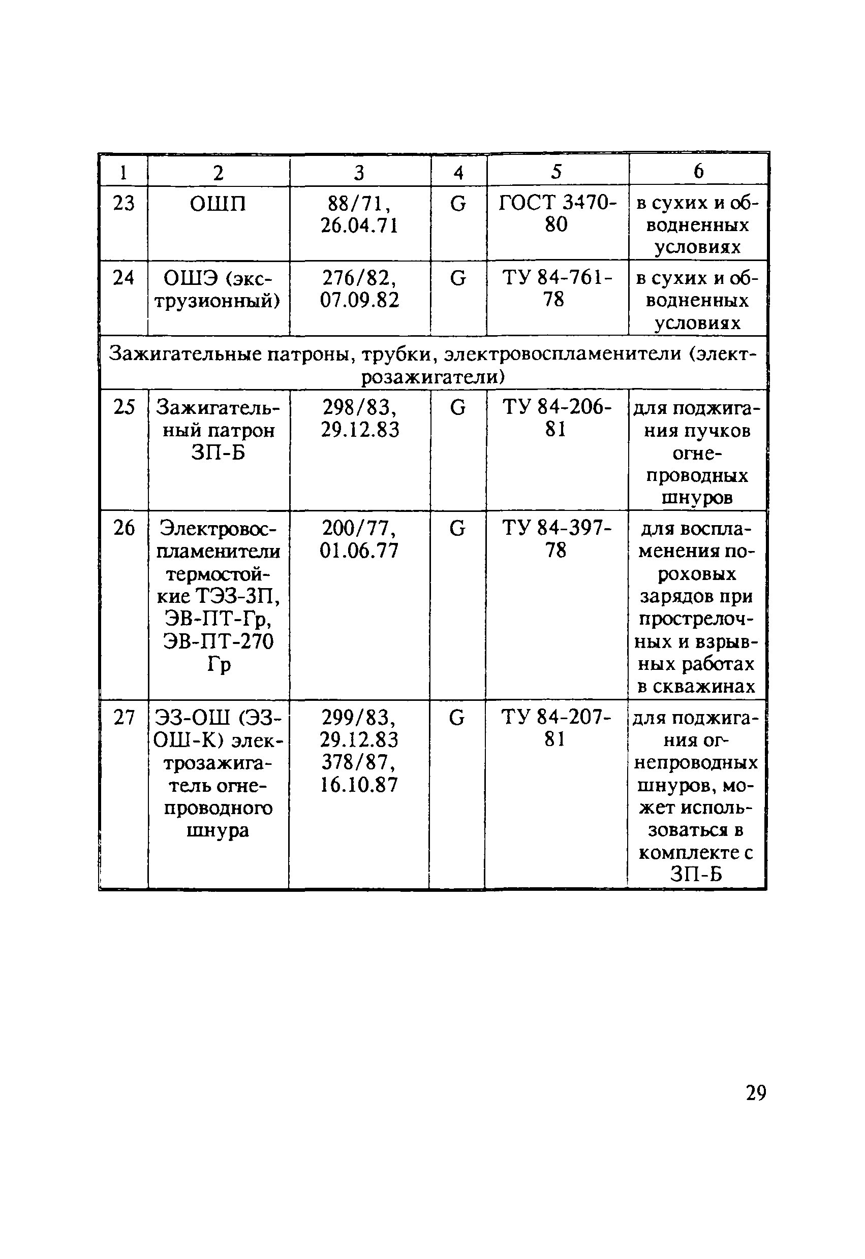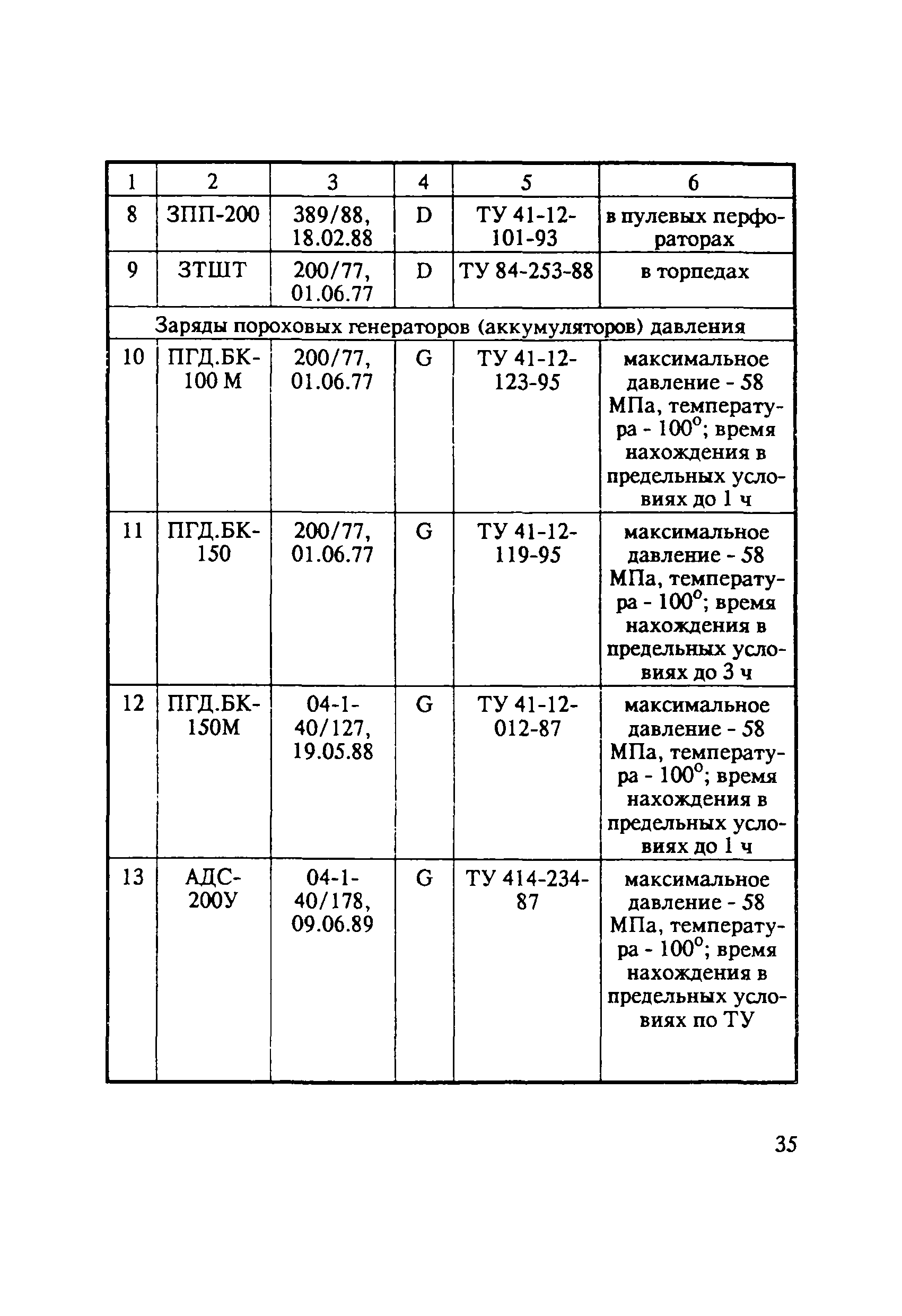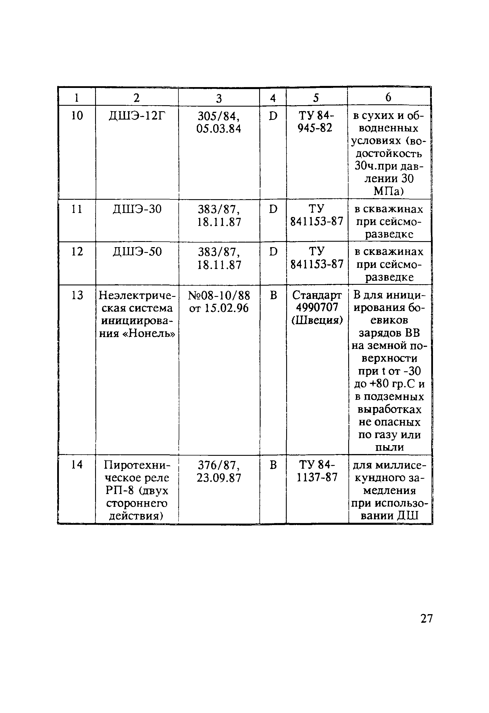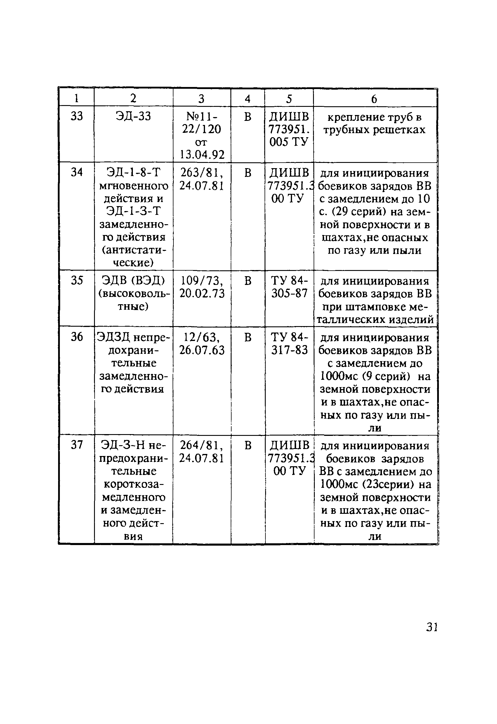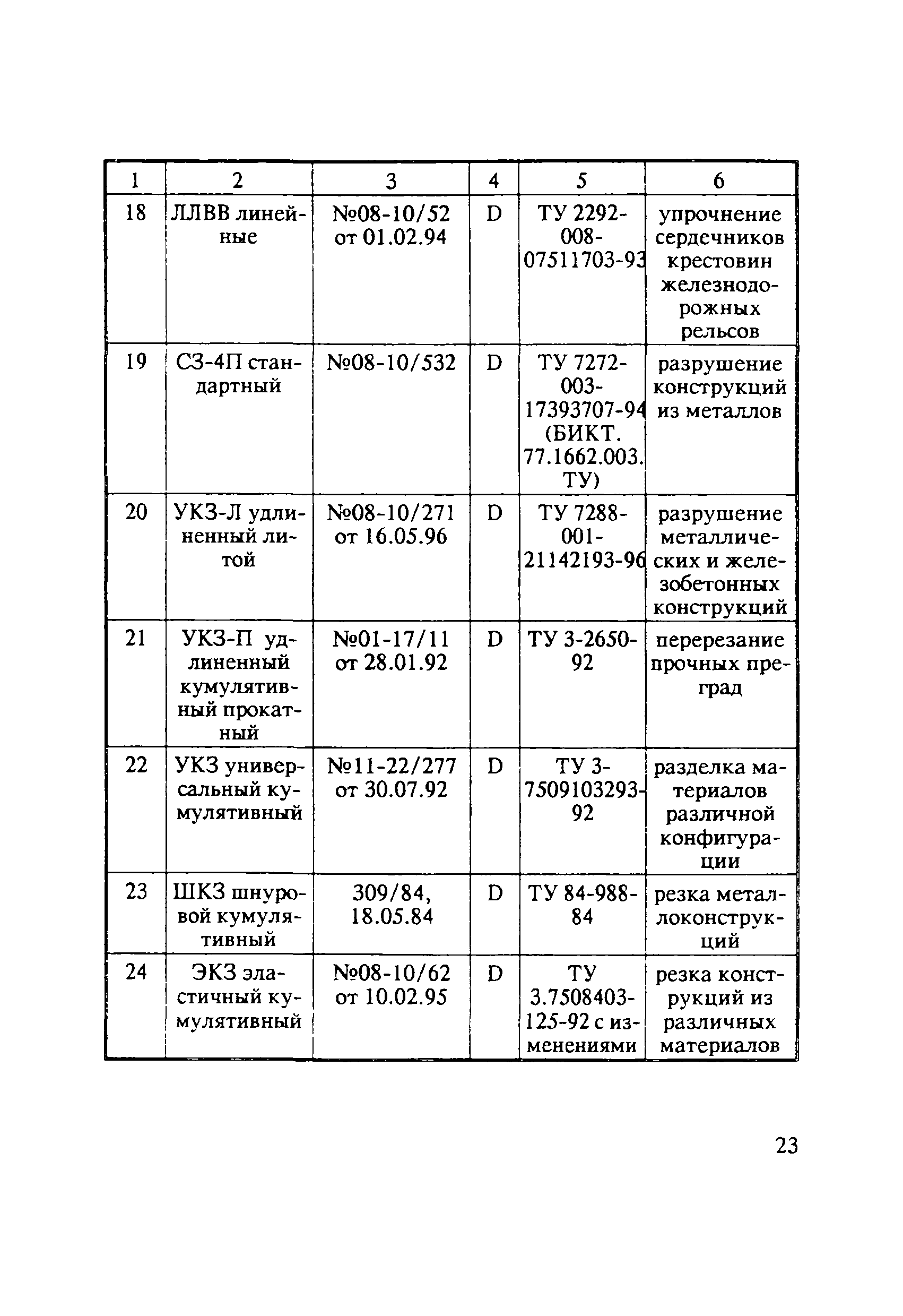 | Оглавление: | Введение Термины и сокращения, принятые в тексте 1. Взрывчатые вещества 1.1. Взрывчатые вещества гранулированные, порошкообразные и пороха, предназначенные для использования на земной поверхности 1.2. Водосодержащие взрывчатые вещества, предназначенные для использования только на земной поверхности 1.3. Взрывчатые вещества и заряды, предназначенные для использования на земной поверхности и в подземных выработках шахт (рудников), не опасных по газу или пыли 1.4. Порошкообразные взрывчатые вещества и заряды, предназначенные для использования на земной поверхности и в подземных выработках шахт (рудников), не опасных по газу или пыли 1.5. Промежуточные детонаторы, предназначенные для инициирования скважинных зарядов на земной поверхности 1.6. Предохранительные взрывчатые вещества, предназначенные для использования в шахтах (рудниках), опасных по газу или пыли 1.7. Взрывчатые вещества, предназначенные для обработки материалов энергией взрыва и специальных работ на земной поверхности 2. Средства инициирования взрывчатых веществ 3. Заряды и зарядные комплекты для прострелочно-взрывной аппаратуры и сейсморазведочных работ 4. Взрывные и контрольно-измерительные приборы 4.1. Взрывные приборы и машинки 4.2. Контрольно-измерительные приборы и устройства 5. Средства маркировки капсюлей-детонаторов и электродетонаторов 6. Зарядно-транспортные и смесительные устройства 6.1. Зарядные машины и устройства камерного типа 6.2. Эжекторные зарядчики 6.3. Зарядные машины шнековые 6.4. Смесительно-зарядные машины 6.5. Зарядные машины и устройства гравитационные 6.6. Комбинированные зарядные и транспортно-зарядные машины 6.7. Смесительные установки |