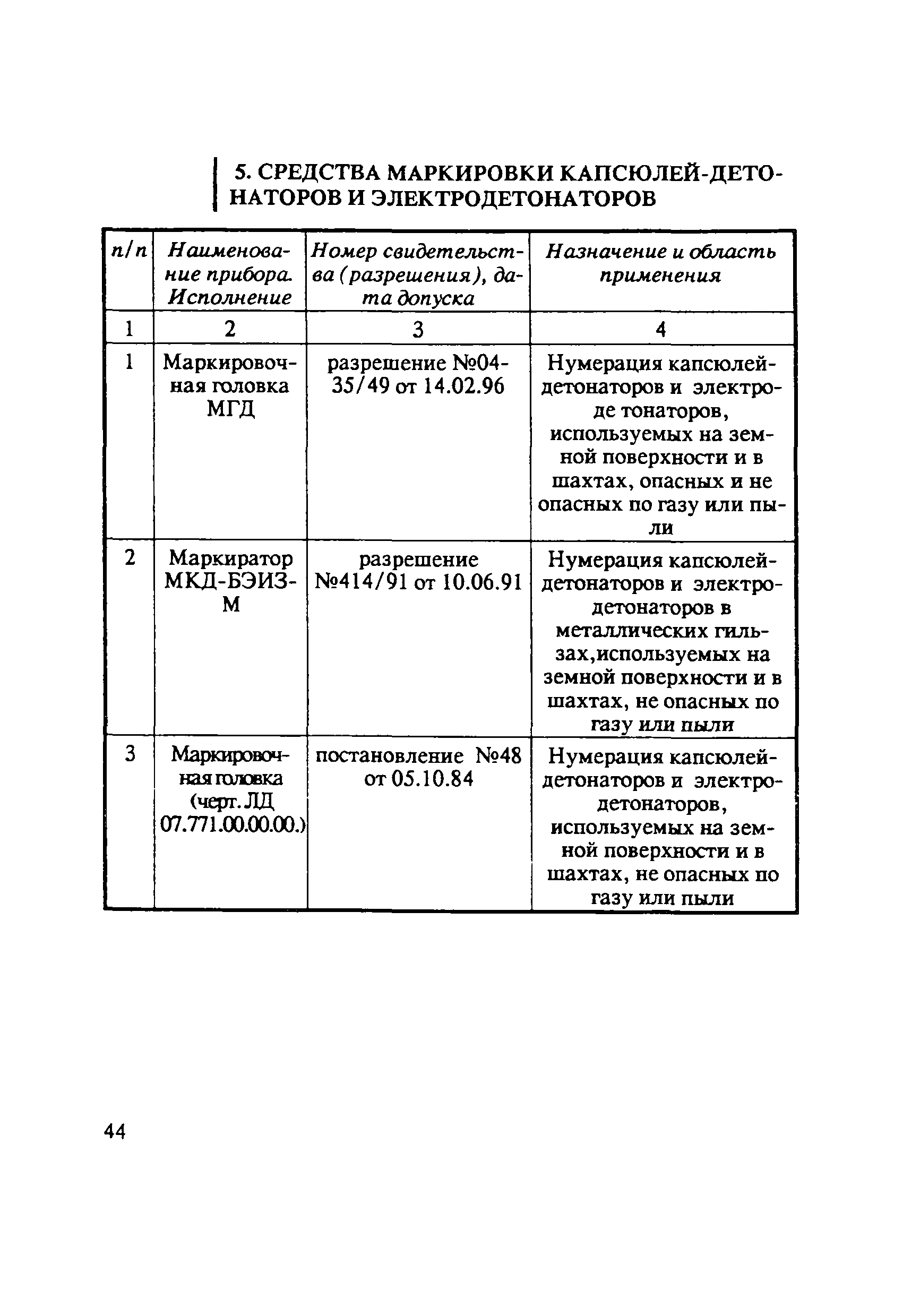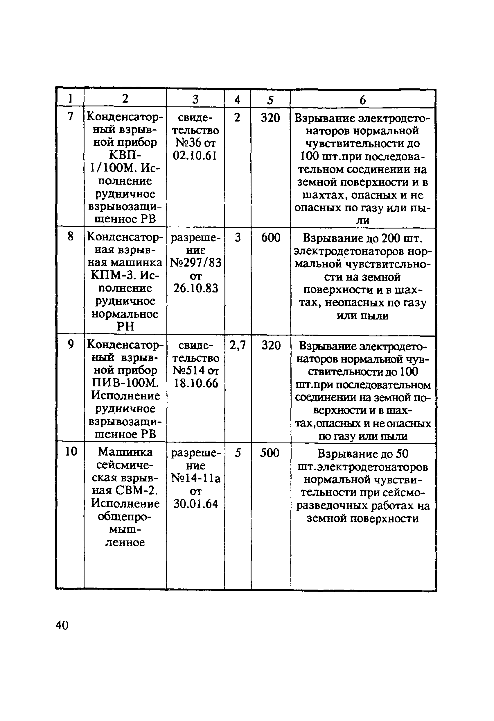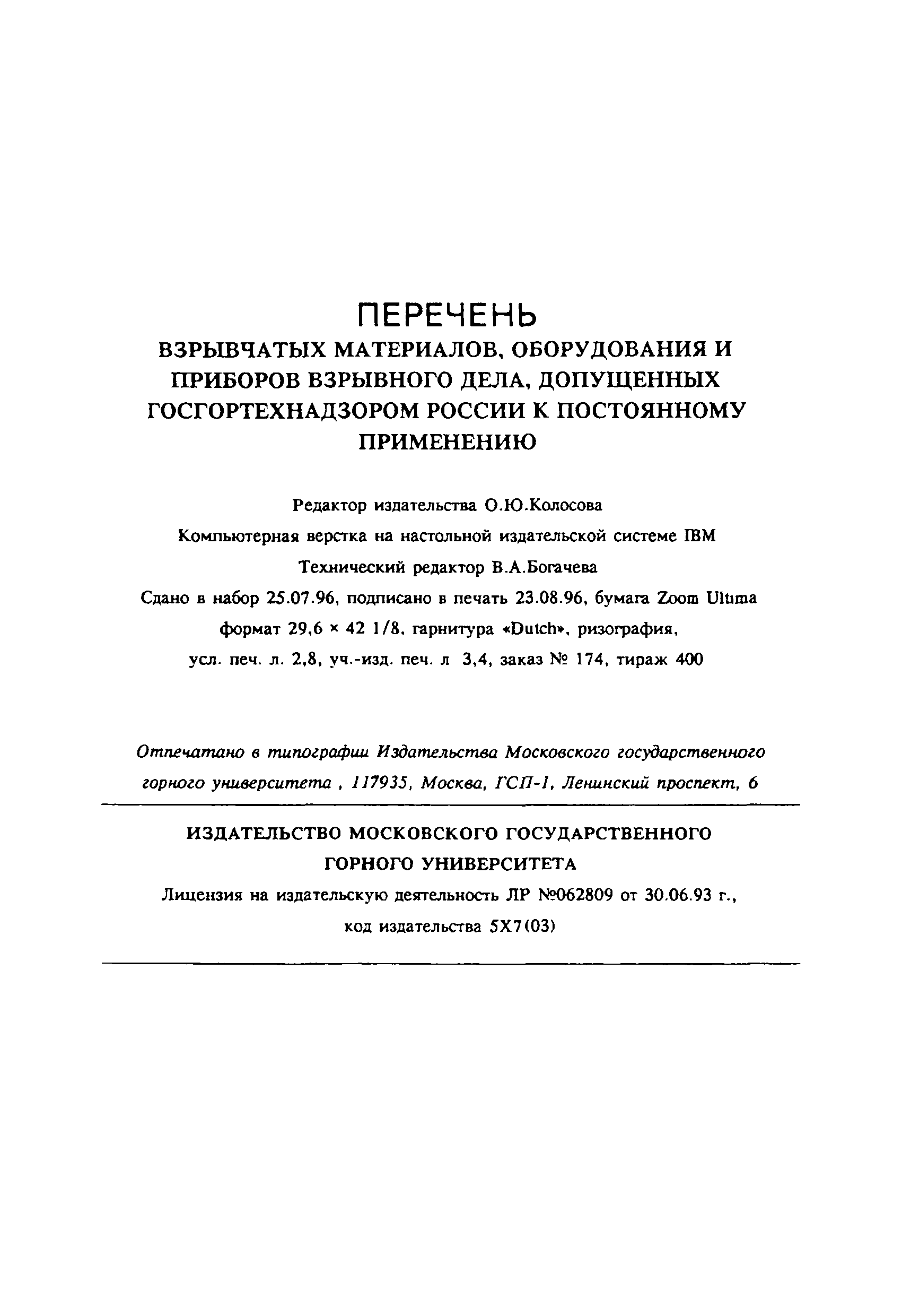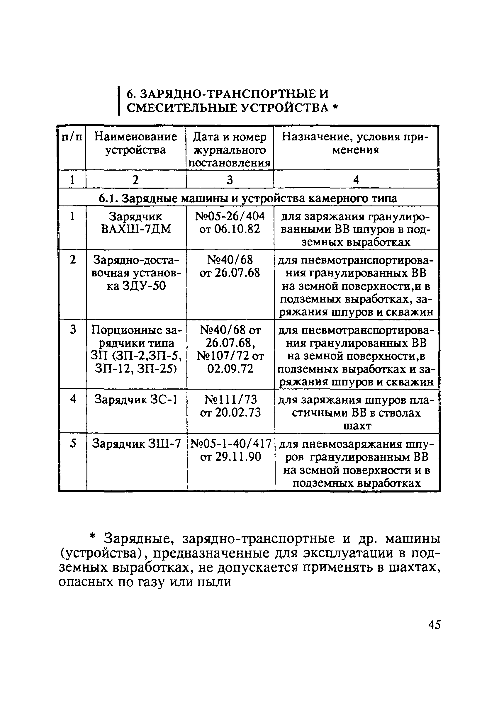 | Область применения: | Отдельными разделами в Перечень включены взрывные и контрольно-измерительные приборы, а также зарядно-транспортное и смесительное передвижное оборудование. Из средств, используемых для пневмозаряжания, приведены надежные и получившие широкое распространение, наиболее безопасные, зарядчики камерного типа. Представлен ряд смесительно-зарядных машин и устройств, предназначенных для изготовления эмульсионных ВВ и заряжания скважин на земной поверхности. В Перечне не указаны допущенные Госгортехнадзором России к постоянному применению отдельные ВМ, виды оборудования, имеющие ограниченное применение. В него также не вошли зарядные машины барабанного типа (ЗМБС), использование которых решением Госгортехнадзора России от 05.05.94 запрещено в связи с повышенной опасностью. В Перечень включены материалы и изделия, допущенные к применению Госгортехнадзором России по состоянию на 01.07.96. |