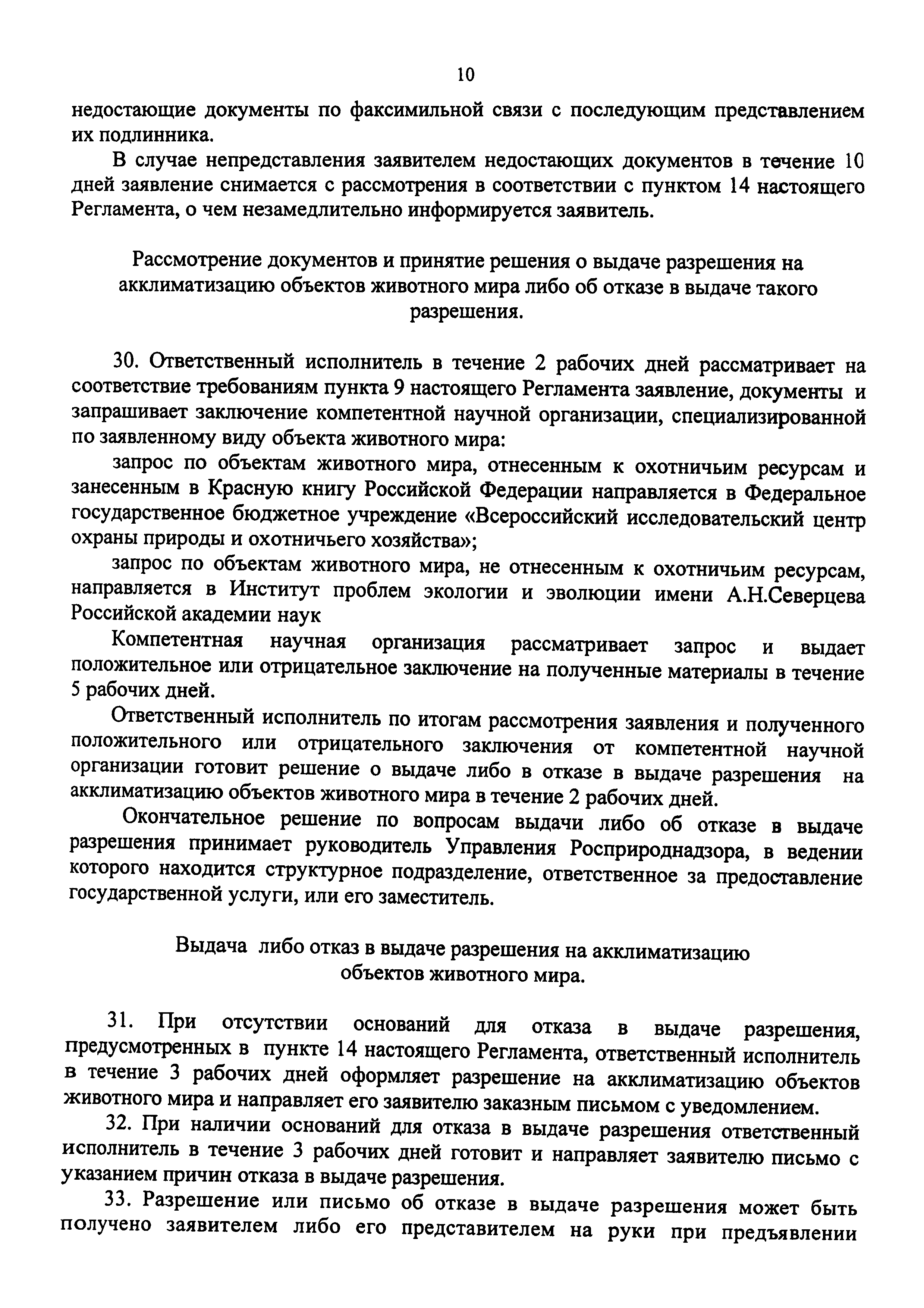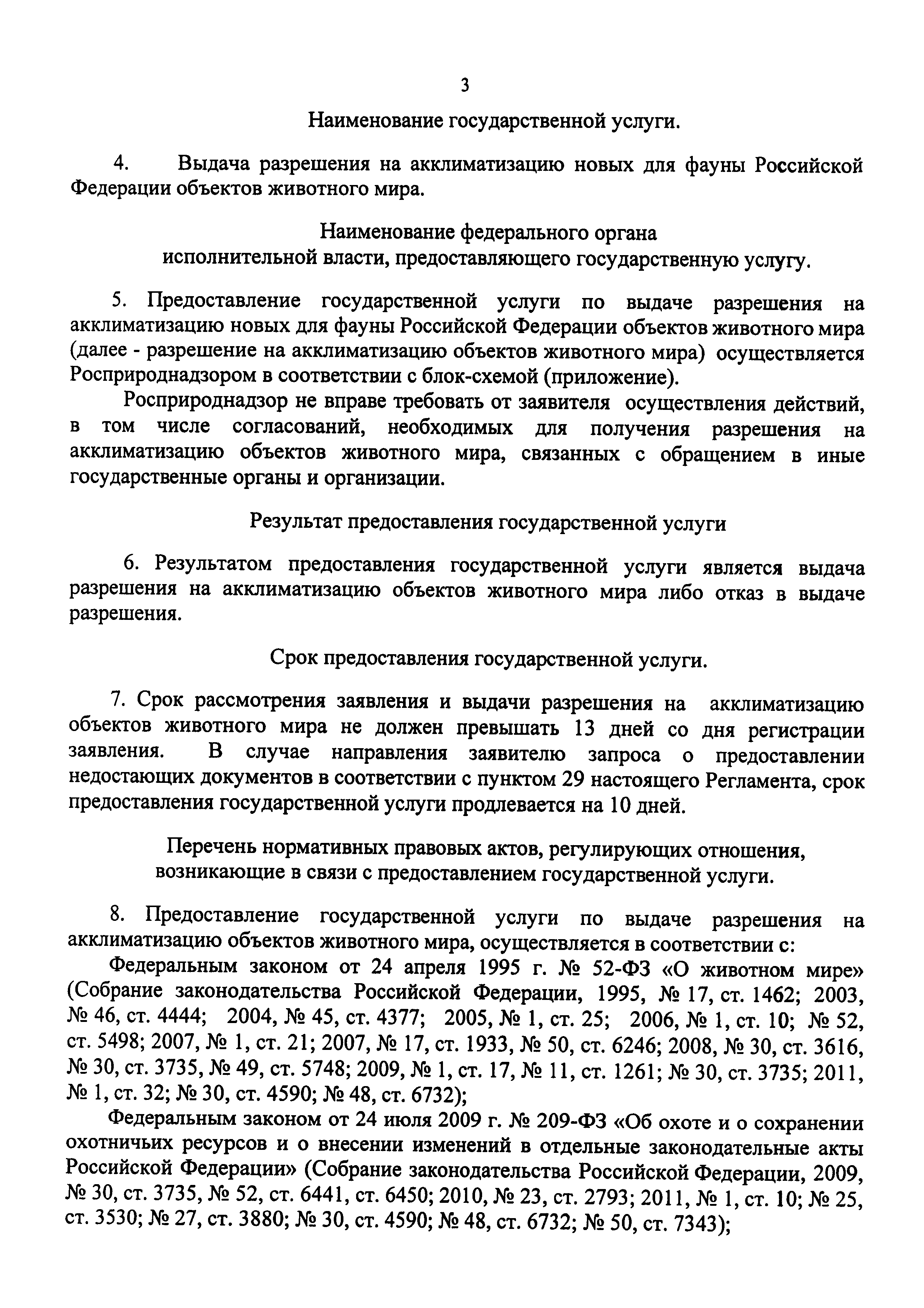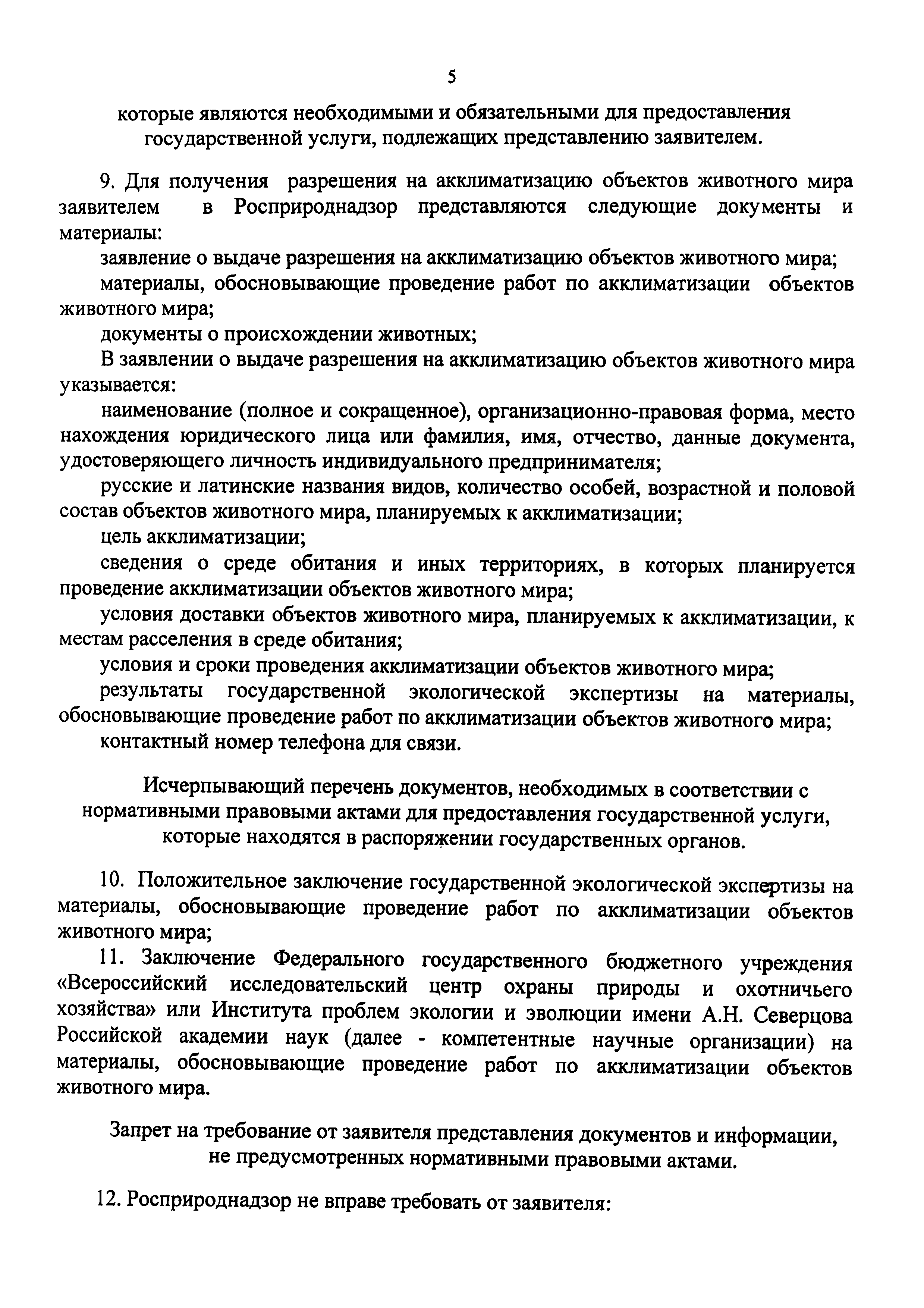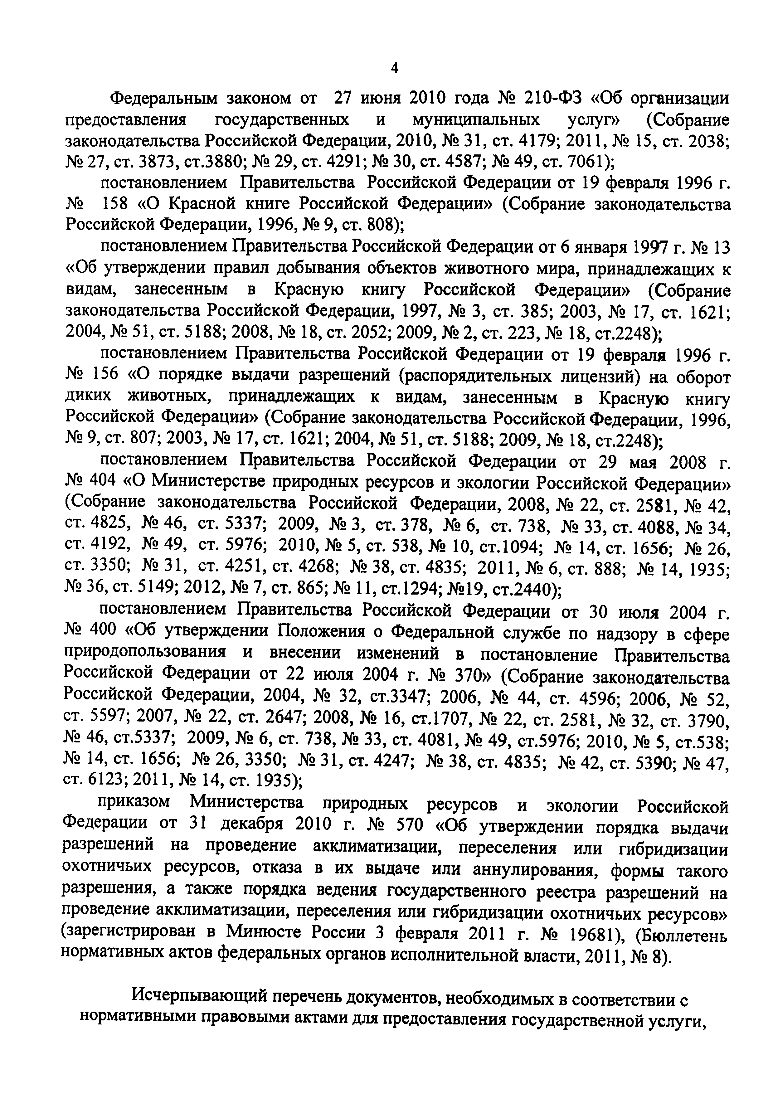 | | Нормативные ссылки: |   Постановление 404 «О Министерстве природных ресурсов и экологии Российской Федерации»  Федеральный закон 59-ФЗ «О порядке рассмотрения обращений граждан Российской Федерации» Постановление 158 «О Красной книге Российской Федерации» Постановление 373 «О разработке и утверждении административных регламентов осуществления государственного контроля (надзора) и административных регламентов предоставления государственных услуг»  Федеральный закон 52-ФЗ «О животном мире»  Федеральный закон 210-ФЗ «Об организации предоставления государственных и муниципальных услуг»  «Положение о Федеральной службе по надзору в сфере природопользования» «Правила подачи и рассмотрения жалоб на решения и действия (бездействие) федеральных органов исполнительной власти и их должностных лиц, федеральных государственных служащих, должностных лиц государственных внебюджетных фондов Российской Федерации, государственных корпораций, наделенных в соответствии с федеральными законами полномочиями по предоставлению государственных услуг в установленной сфере деятельности, и их должностных лиц, организаций, предусмотренных частью 1.1 статьи 16 Федерального закона "Об организации предоставления государственных и муниципальных услуг", и их работников, а также многофункциональных центров предоставления государственных и муниципальных услуг и их работников» Приказ 570 «Об утверждении порядка выдачи разрешений на проведение акклиматизации, переселения или гибридизации охотничьих ресурсов, отказа в их выдаче или их аннулирования, формы такого разрешения, а также порядка ведения государственного реестра разрешений на проведение акклиматизации, переселения или гибридизации охотничьих ресурсов»