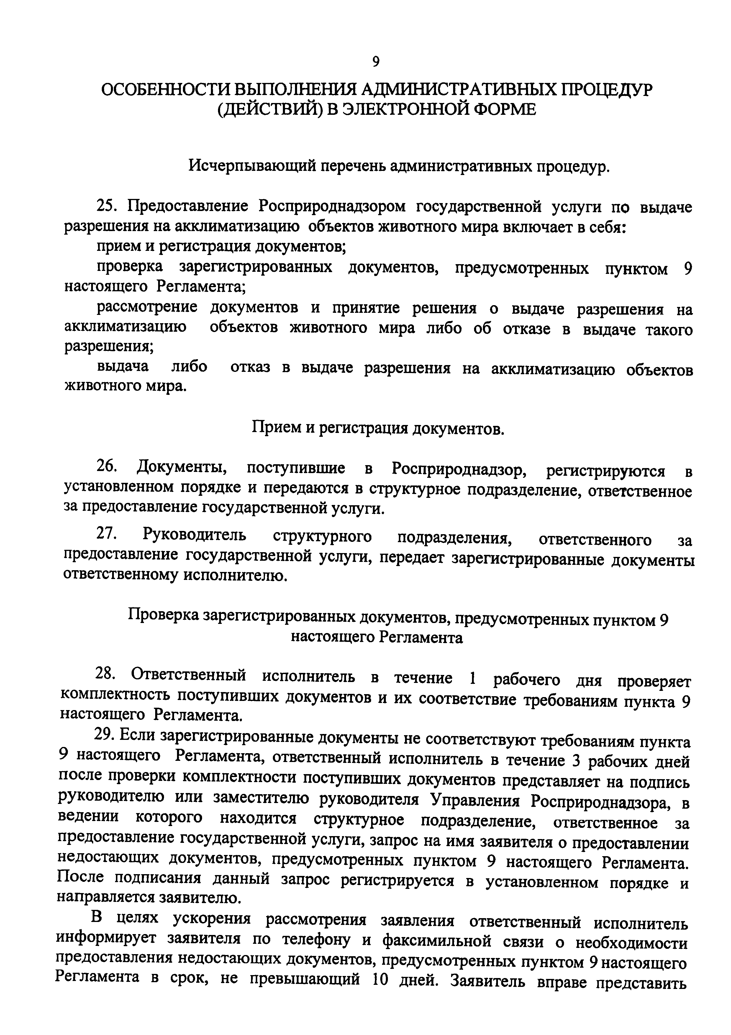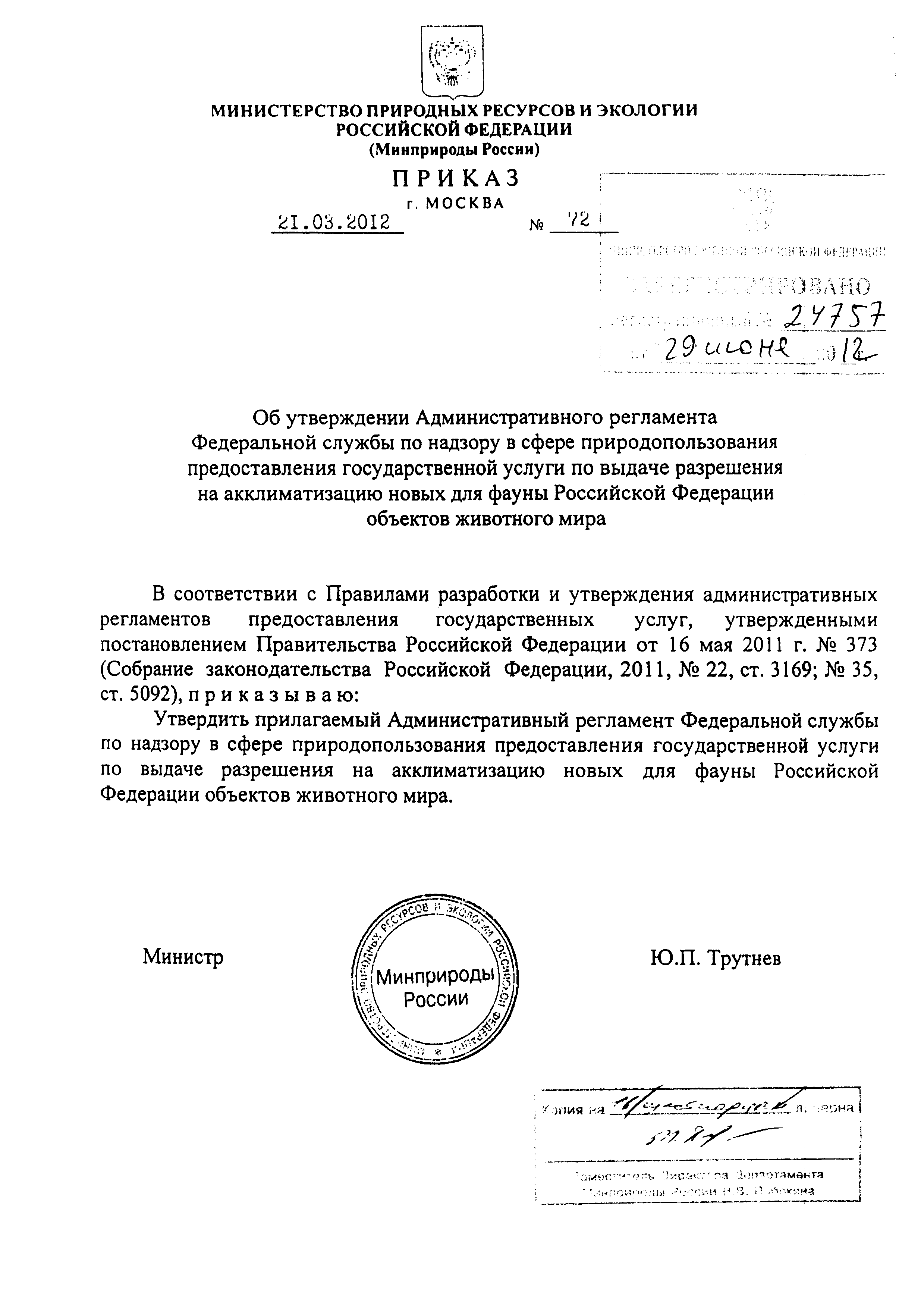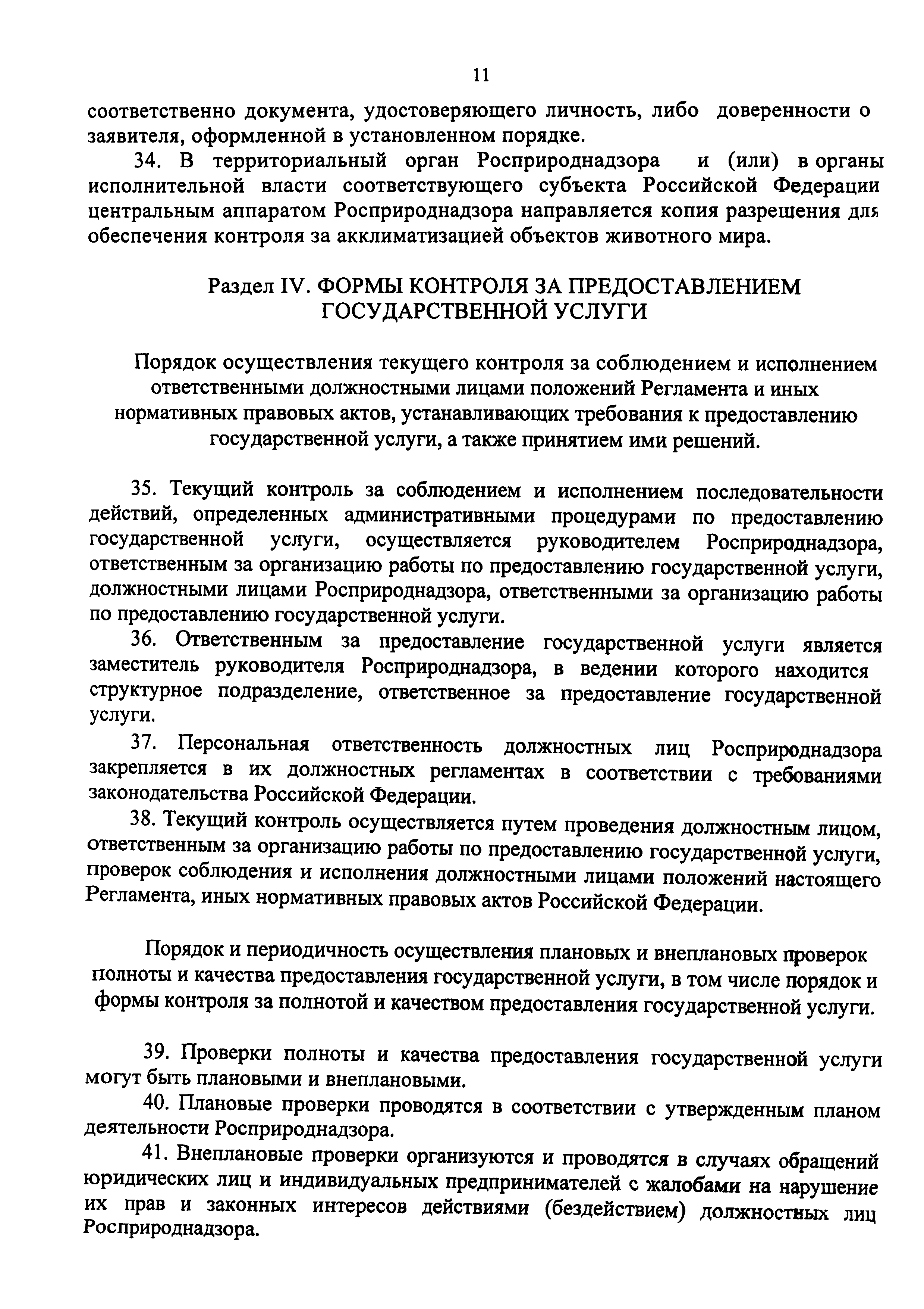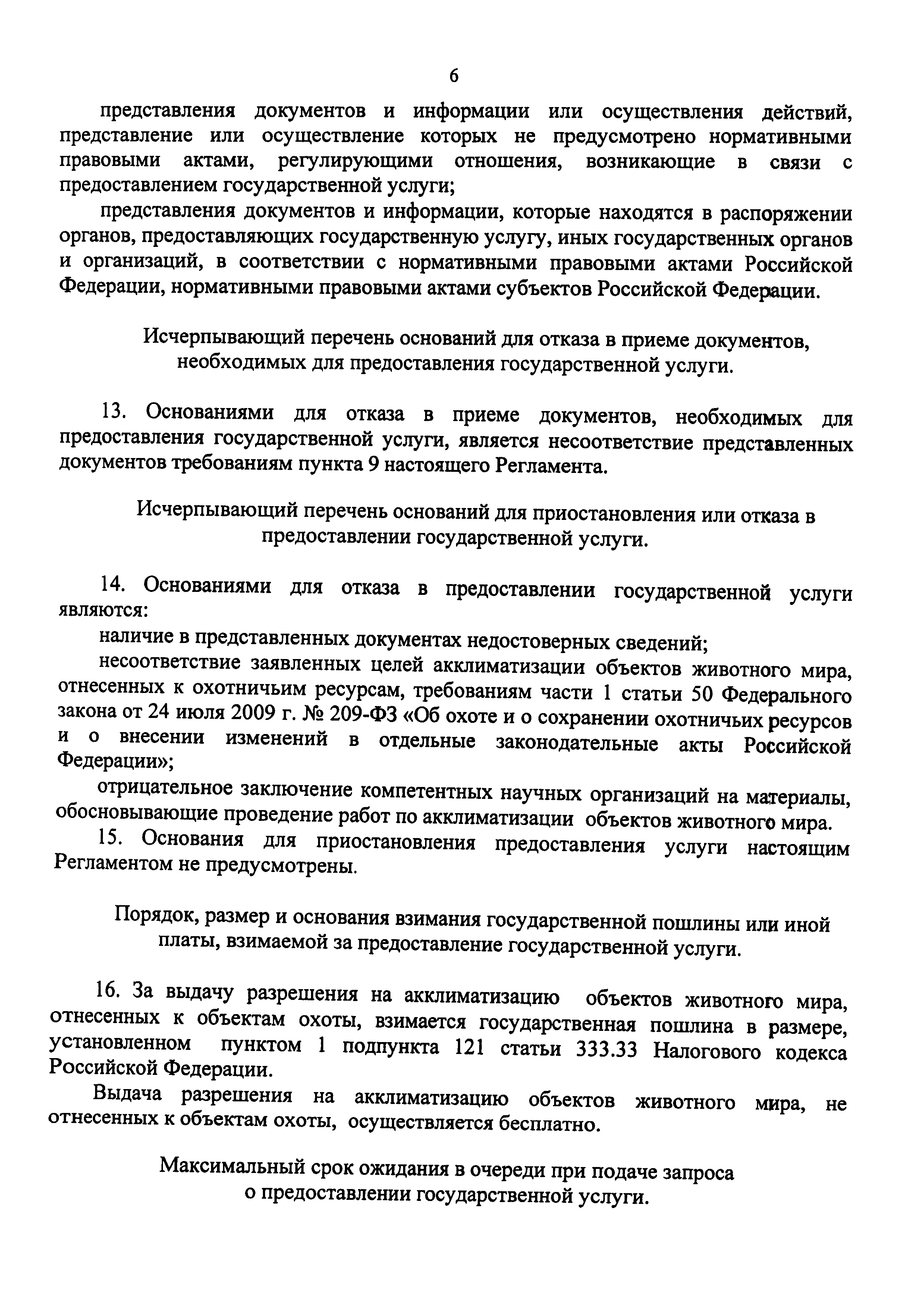 | | Нормативные ссылки: |   Постановление 404 «О Министерстве природных ресурсов и экологии Российской Федерации»  Федеральный закон 59-ФЗ «О порядке рассмотрения обращений граждан Российской Федерации» Постановление 158 «О Красной книге Российской Федерации» Постановление 373 «О разработке и утверждении административных регламентов осуществления государственного контроля (надзора) и административных регламентов предоставления государственных услуг»  Федеральный закон 52-ФЗ «О животном мире»  Федеральный закон 210-ФЗ «Об организации предоставления государственных и муниципальных услуг»  «Положение о Федеральной службе по надзору в сфере природопользования» «Правила подачи и рассмотрения жалоб на решения и действия (бездействие) федеральных органов исполнительной власти и их должностных лиц, федеральных государственных служащих, должностных лиц государственных внебюджетных фондов Российской Федерации, государственных корпораций, наделенных в соответствии с федеральными законами полномочиями по предоставлению государственных услуг в установленной сфере деятельности, и их должностных лиц, организаций, предусмотренных частью 1.1 статьи 16 Федерального закона "Об организации предоставления государственных и муниципальных услуг", и их работников, а также многофункциональных центров предоставления государственных и муниципальных услуг и их работников» Приказ 570 «Об утверждении порядка выдачи разрешений на проведение акклиматизации, переселения или гибридизации охотничьих ресурсов, отказа в их выдаче или их аннулирования, формы такого разрешения, а также порядка ведения государственного реестра разрешений на проведение акклиматизации, переселения или гибридизации охотничьих ресурсов»