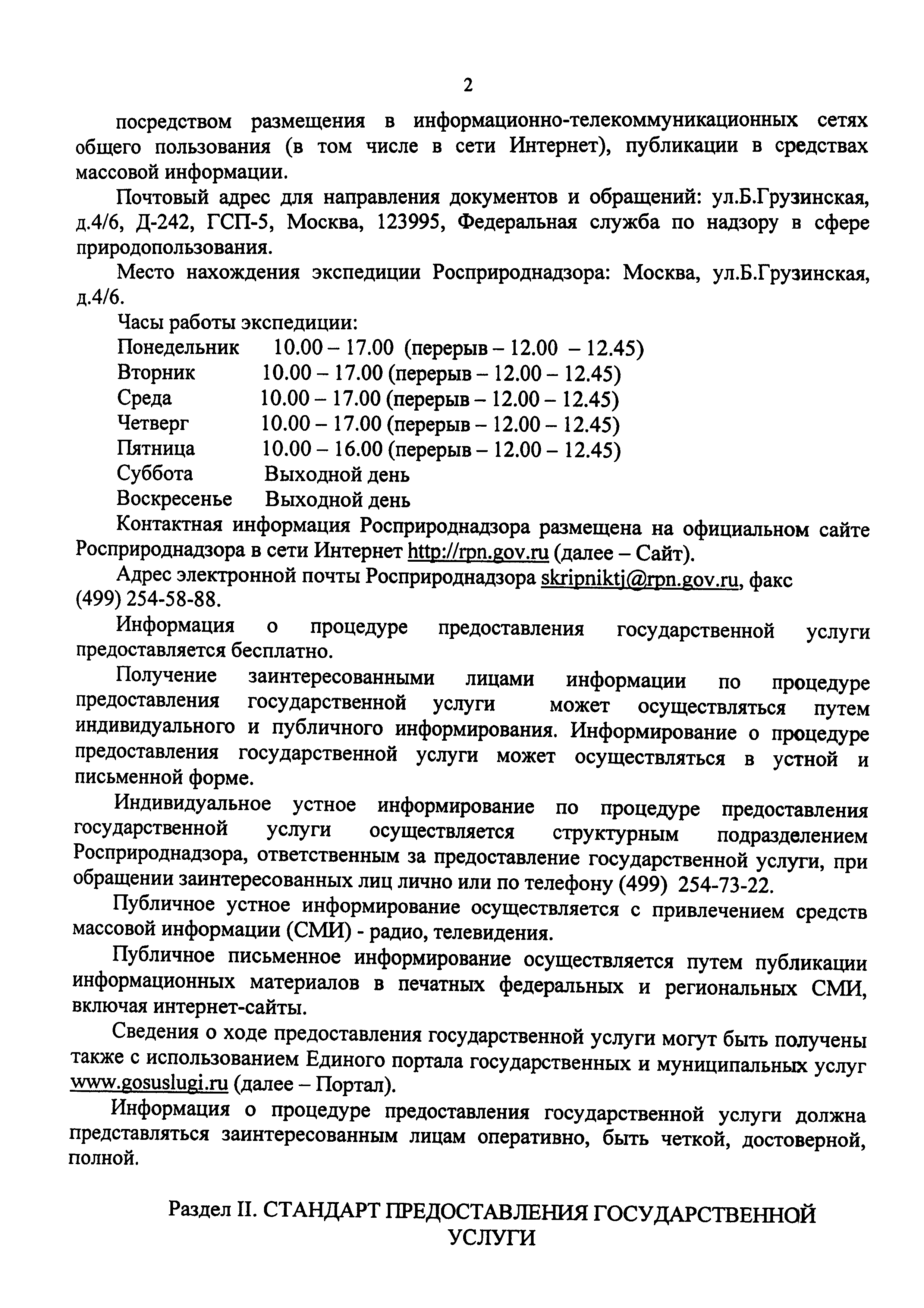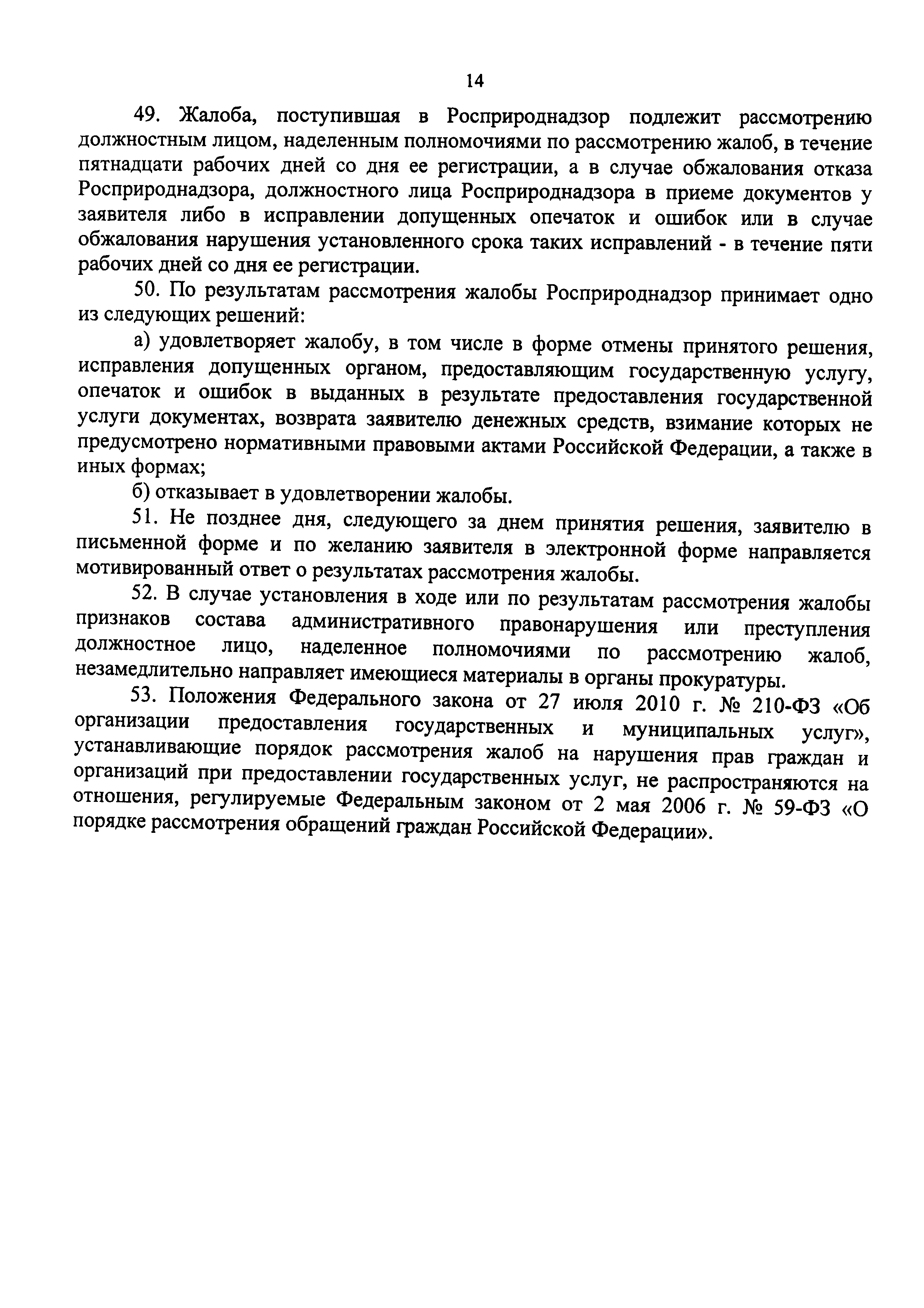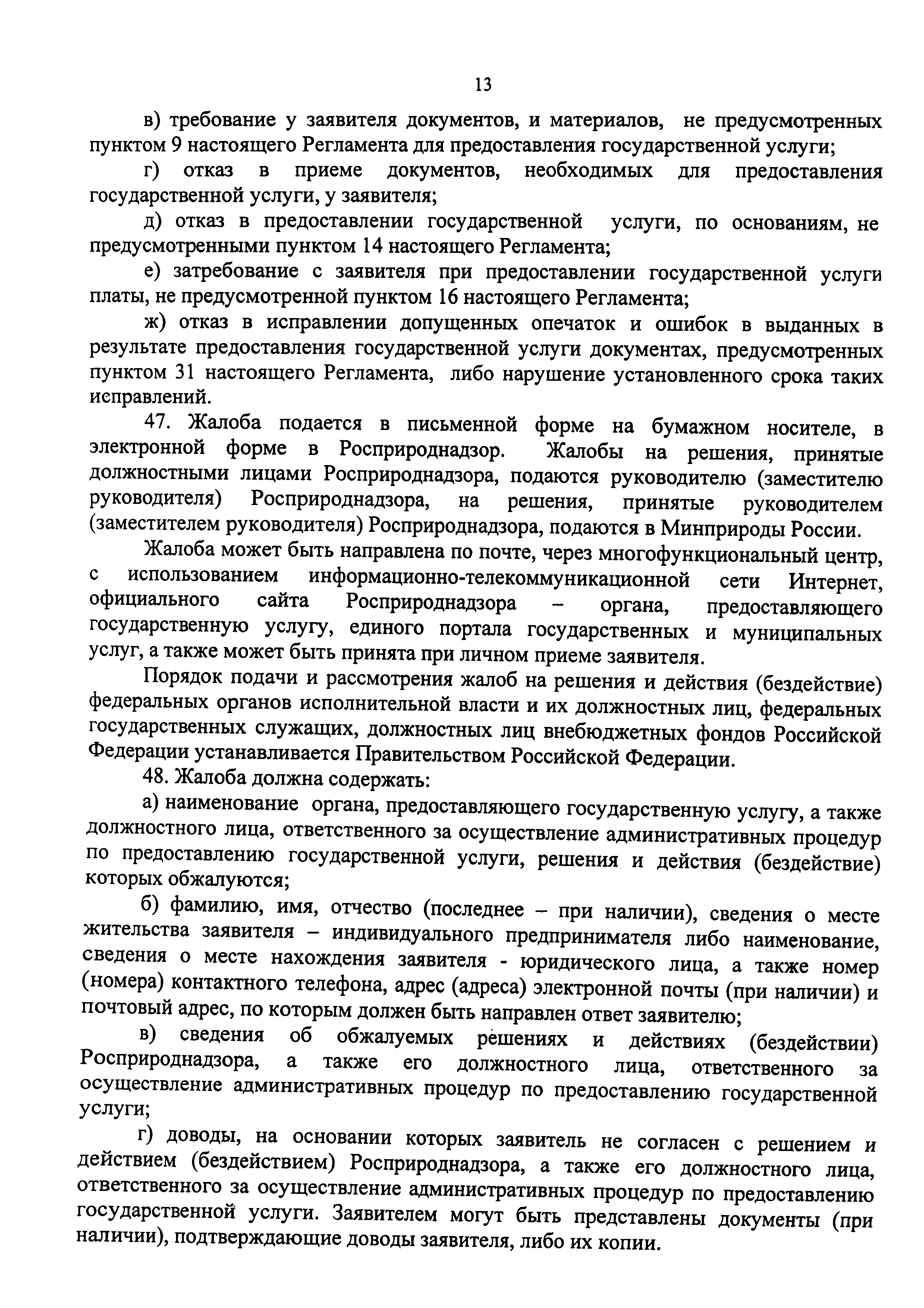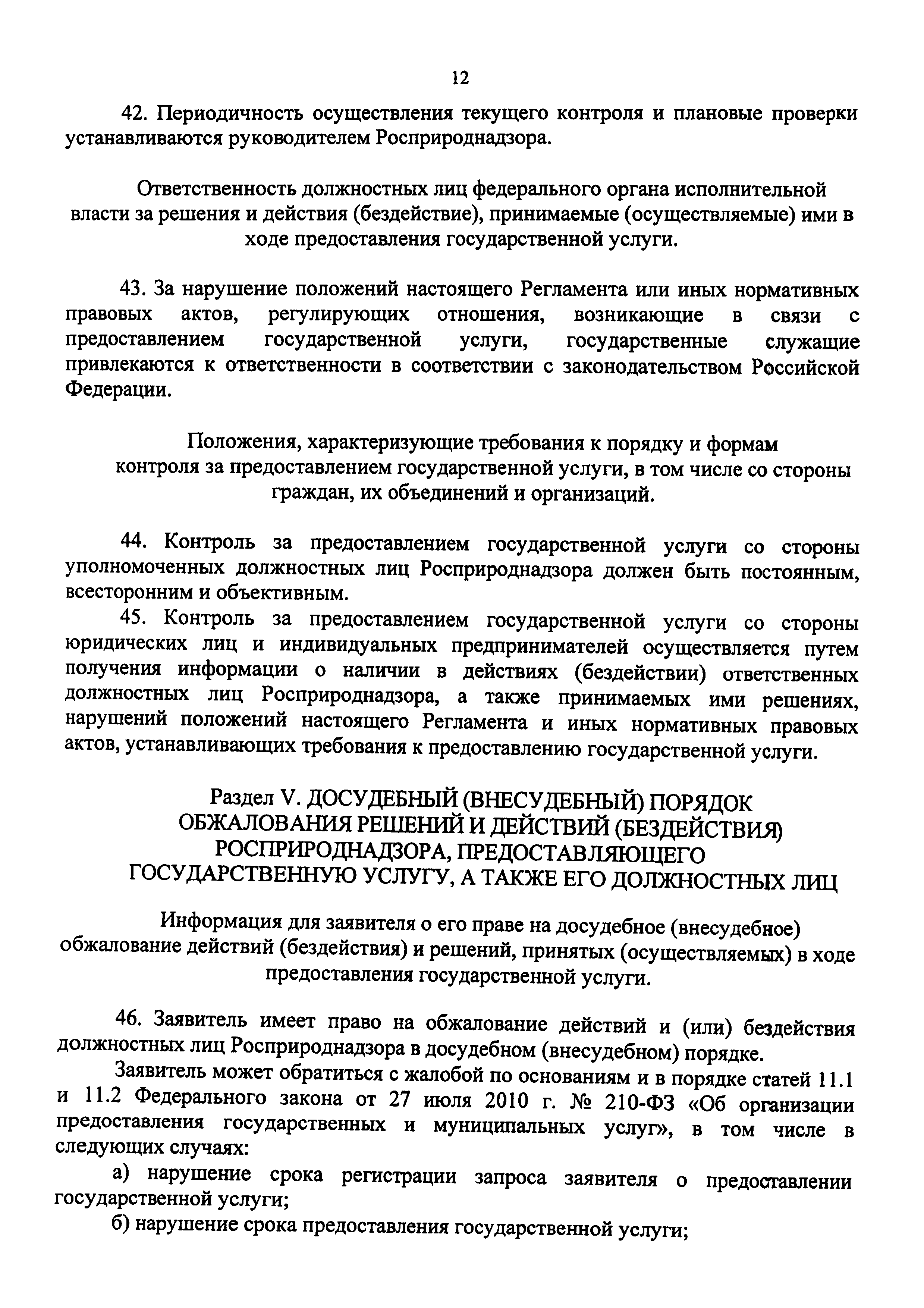| | Нормативные ссылки: |   Постановление 404 «О Министерстве природных ресурсов и экологии Российской Федерации»  Федеральный закон 59-ФЗ «О порядке рассмотрения обращений граждан Российской Федерации» Постановление 158 «О Красной книге Российской Федерации» Постановление 373 «О разработке и утверждении административных регламентов осуществления государственного контроля (надзора) и административных регламентов предоставления государственных услуг»  Федеральный закон 52-ФЗ «О животном мире»  Федеральный закон 210-ФЗ «Об организации предоставления государственных и муниципальных услуг»  «Положение о Федеральной службе по надзору в сфере природопользования» «Правила подачи и рассмотрения жалоб на решения и действия (бездействие) федеральных органов исполнительной власти и их должностных лиц, федеральных государственных служащих, должностных лиц государственных внебюджетных фондов Российской Федерации, государственных корпораций, наделенных в соответствии с федеральными законами полномочиями по предоставлению государственных услуг в установленной сфере деятельности, и их должностных лиц, организаций, предусмотренных частью 1.1 статьи 16 Федерального закона "Об организации предоставления государственных и муниципальных услуг", и их работников, а также многофункциональных центров предоставления государственных и муниципальных услуг и их работников» Приказ 570 «Об утверждении порядка выдачи разрешений на проведение акклиматизации, переселения или гибридизации охотничьих ресурсов, отказа в их выдаче или их аннулирования, формы такого разрешения, а также порядка ведения государственного реестра разрешений на проведение акклиматизации, переселения или гибридизации охотничьих ресурсов»