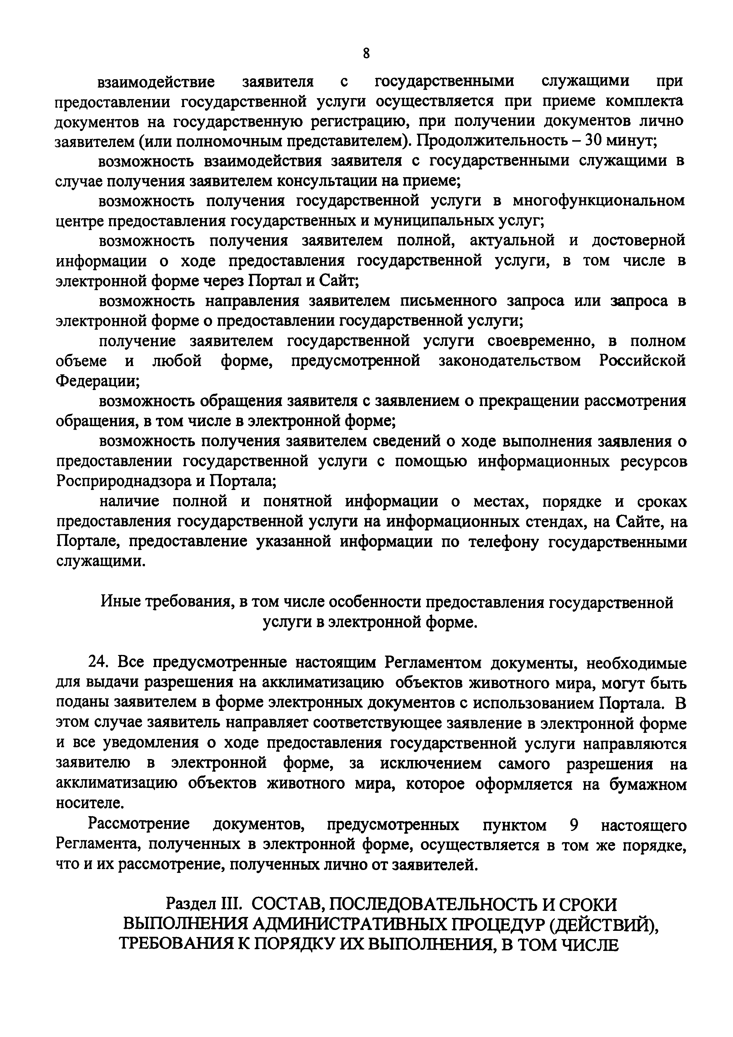 Административный регламент Федеральной службы по надзору в сфере природопользования предоставления государственной услуги по выдаче разрешения на акклиматизацию новых для фауны Российской Федерации объектов животного мира| Статус: | действует | | Название рус.: | Административный регламент Федеральной службы по надзору в сфере природопользования предоставления государственной услуги по выдаче разрешения на акклиматизацию новых для фауны Российской Федерации объектов животного мира | | Дата добавления в базу: | 01.02.2020 | | Дата актуализации: | 01.01.2021 | | Дата введения: | 07.12.2012 | | Оглавление: | Раздел I. Общие положения Раздел II. Стандарт предоставления государственной услуги Раздел III. Состав, последовательность и сроки выполнения административных процедур (действий), требования к порядку их выполнения, в том числе особенности выполнения административных процедур (действий) в электронной форме Раздел IV. Формы контроля за предоставлением государственной услуги Раздел V. Досудебный (внесудебный) порядок обжалования решений и действий (бездействия) Росприроднадзора, предоставляющего государственную услугу, а также его должностных лиц Приложение. Блок схема порядка предоставления государственной услуги по выдаче разрешения на акклиматизацию новых для фауны Российской Федерации объектов животного мира | | Утверждён: | 21.03.2012 Министерство природных ресурсов и экологии Российской Федерации (72)