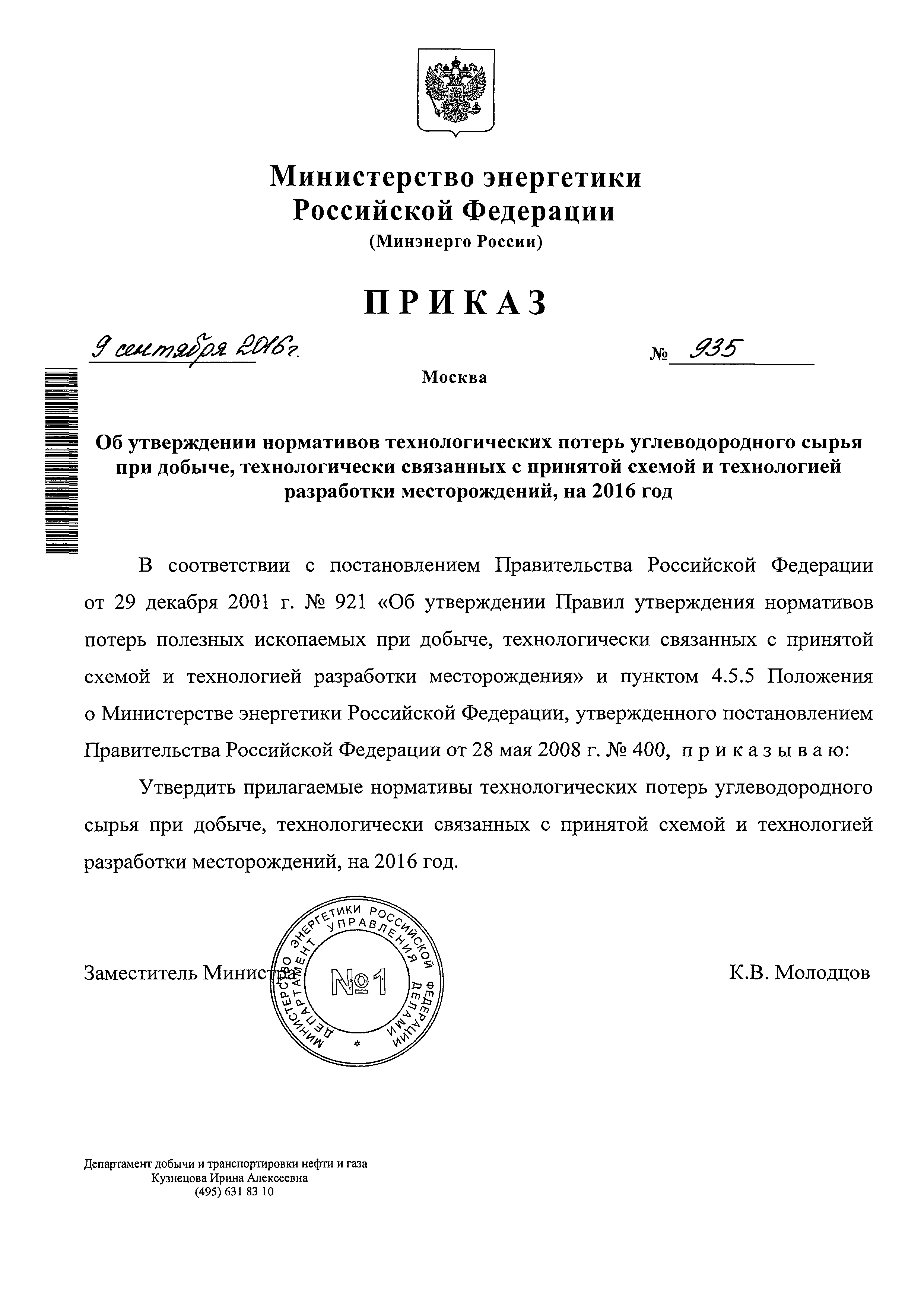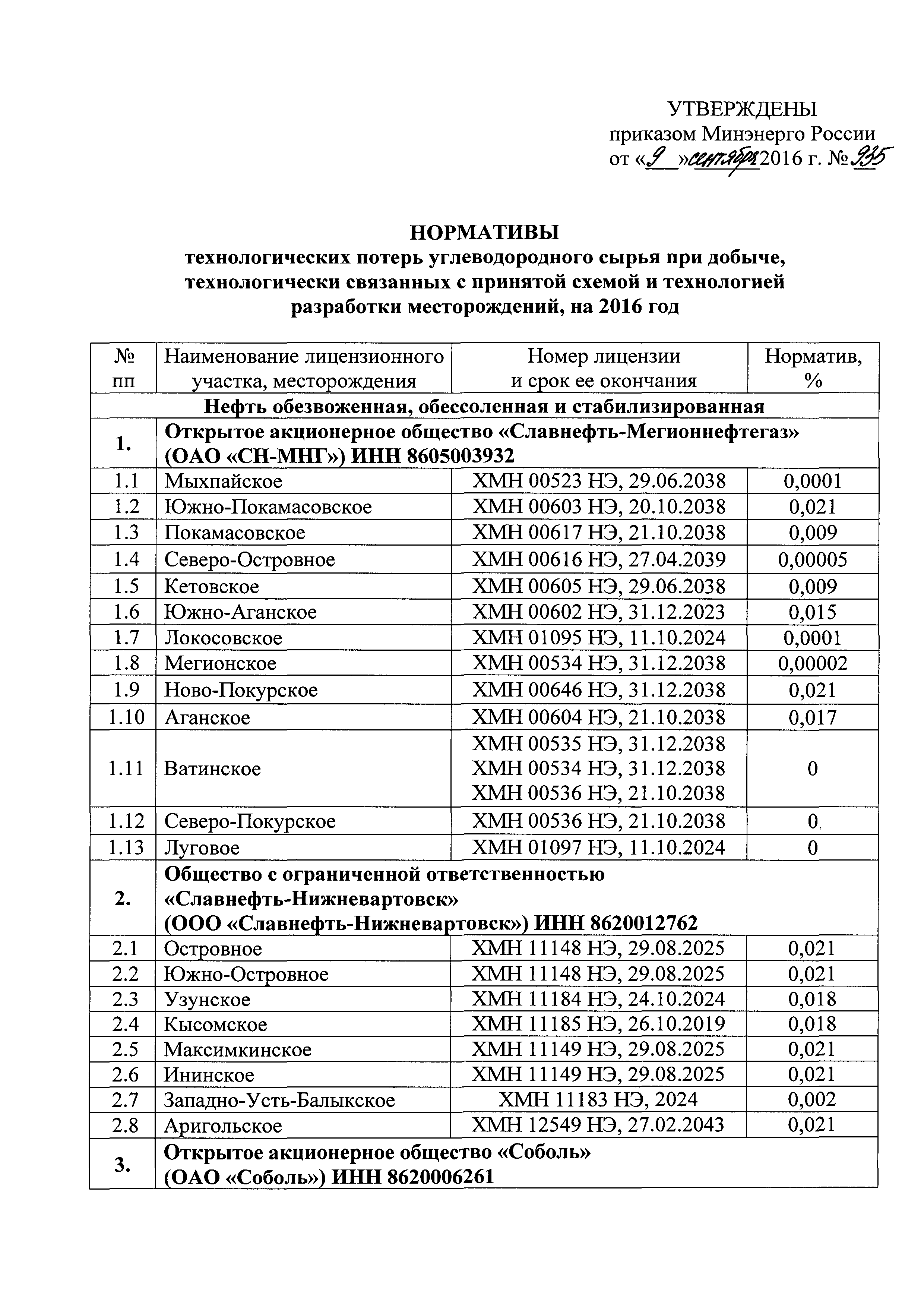 Нормативы технологических потерь углеводородного сырья при добыче, технологически связанных с принятой схемой и технологией разработки месторождений, на 2016 год| Статус: | справочные материалы, мп, тпр | | Название рус.: | Нормативы технологических потерь углеводородного сырья при добыче, технологически связанных с принятой схемой и технологией разработки месторождений, на 2016 год | | Дата добавления в базу: | 01.02.2020 | | Дата актуализации: | 01.01.2021 | | Оглавление: | Нефть обезвоженная, обессоленная и стабилизированная Попутный нефтяной газ Газ природный горючий Газовый конденсат | | Утверждён: | 09.09.2016 Минэнерго России (Russian Federation Minenergo 935)