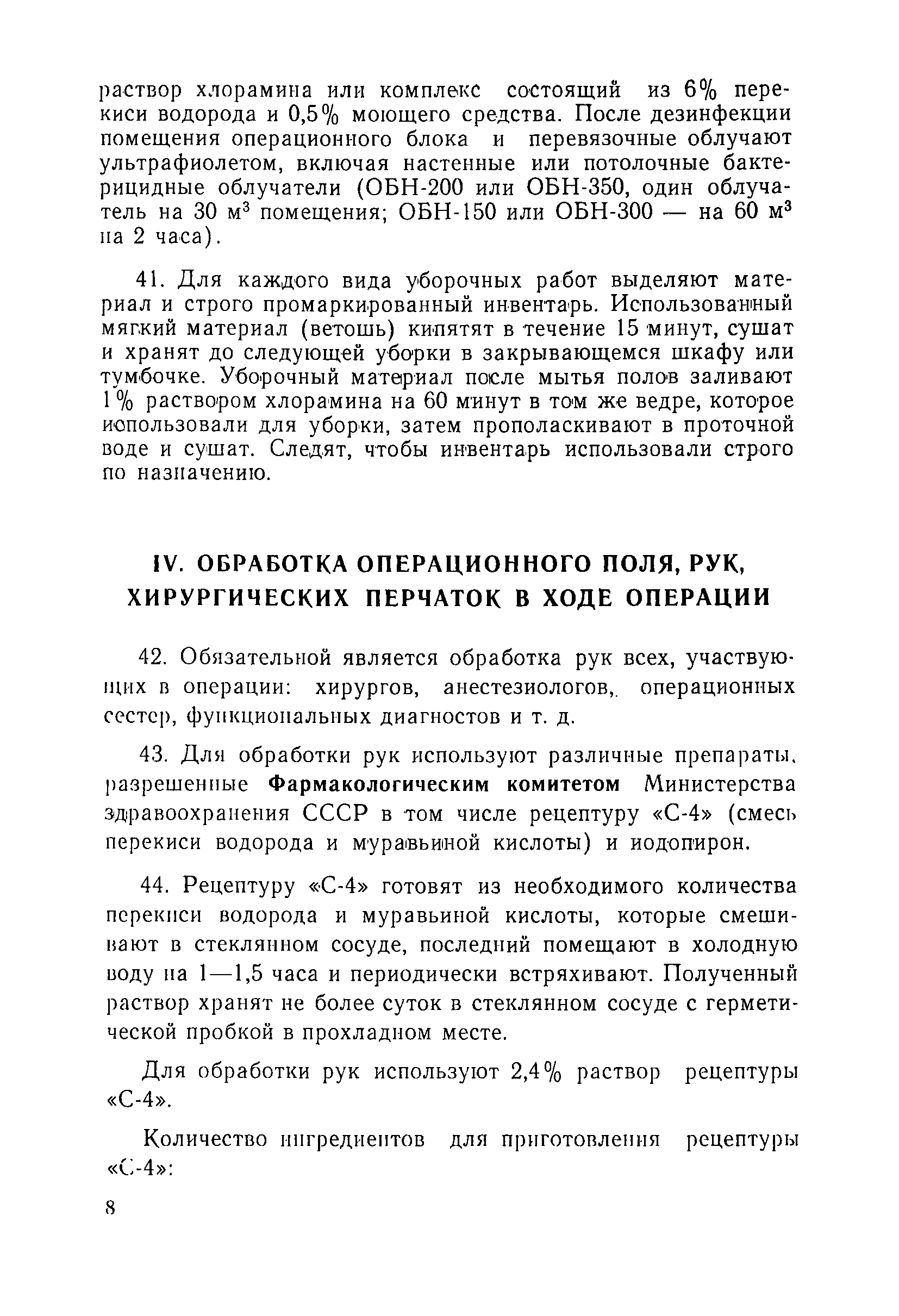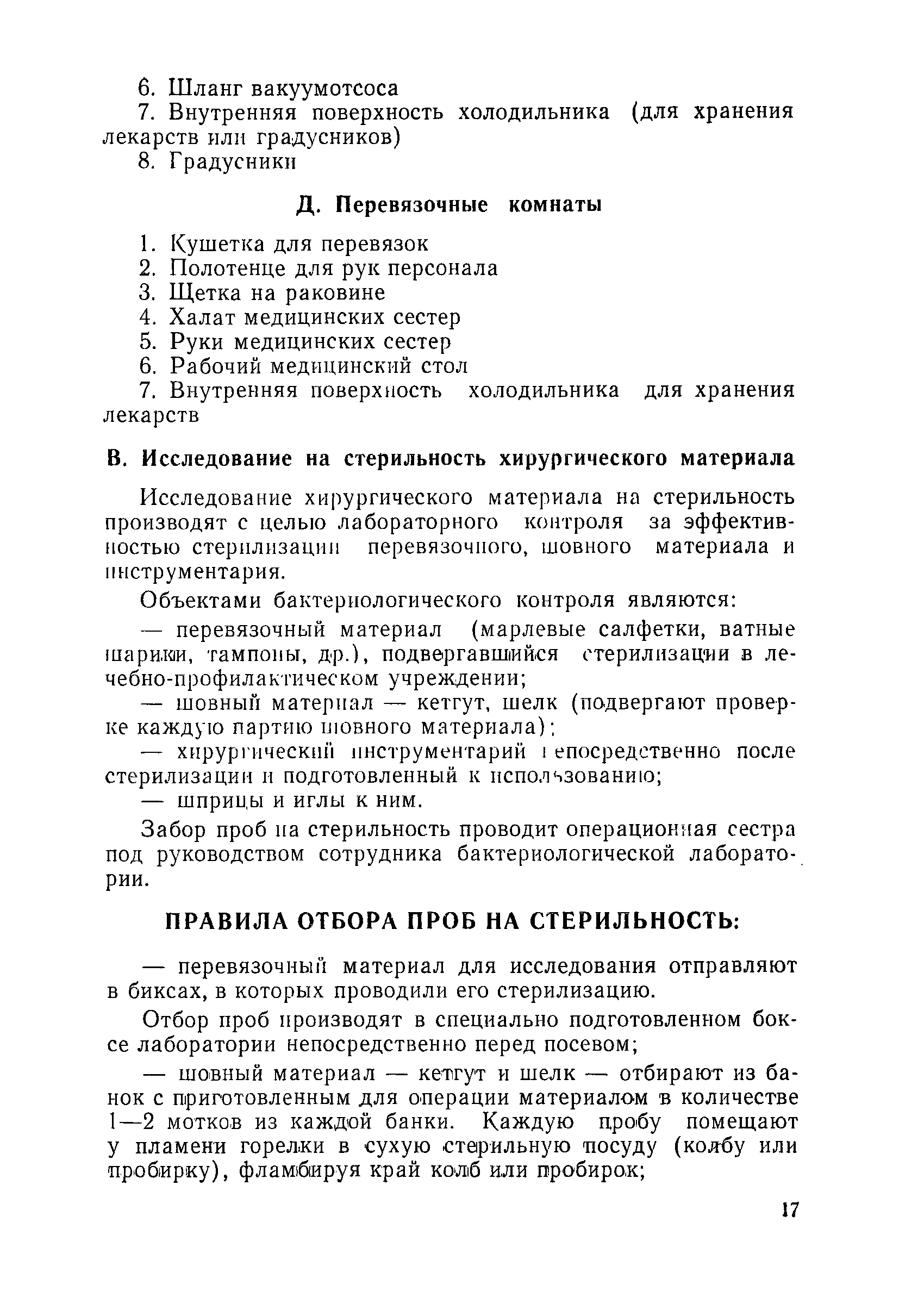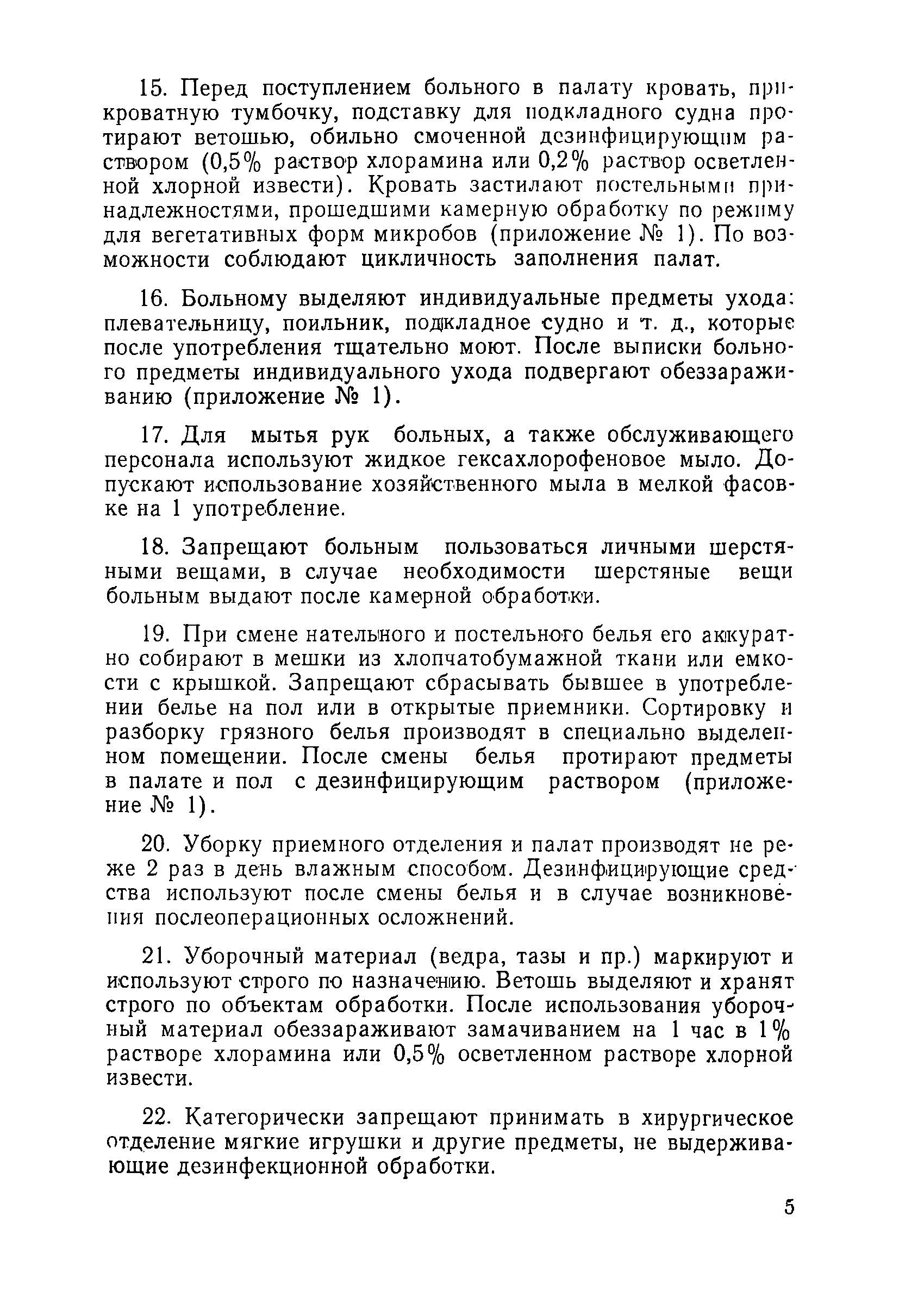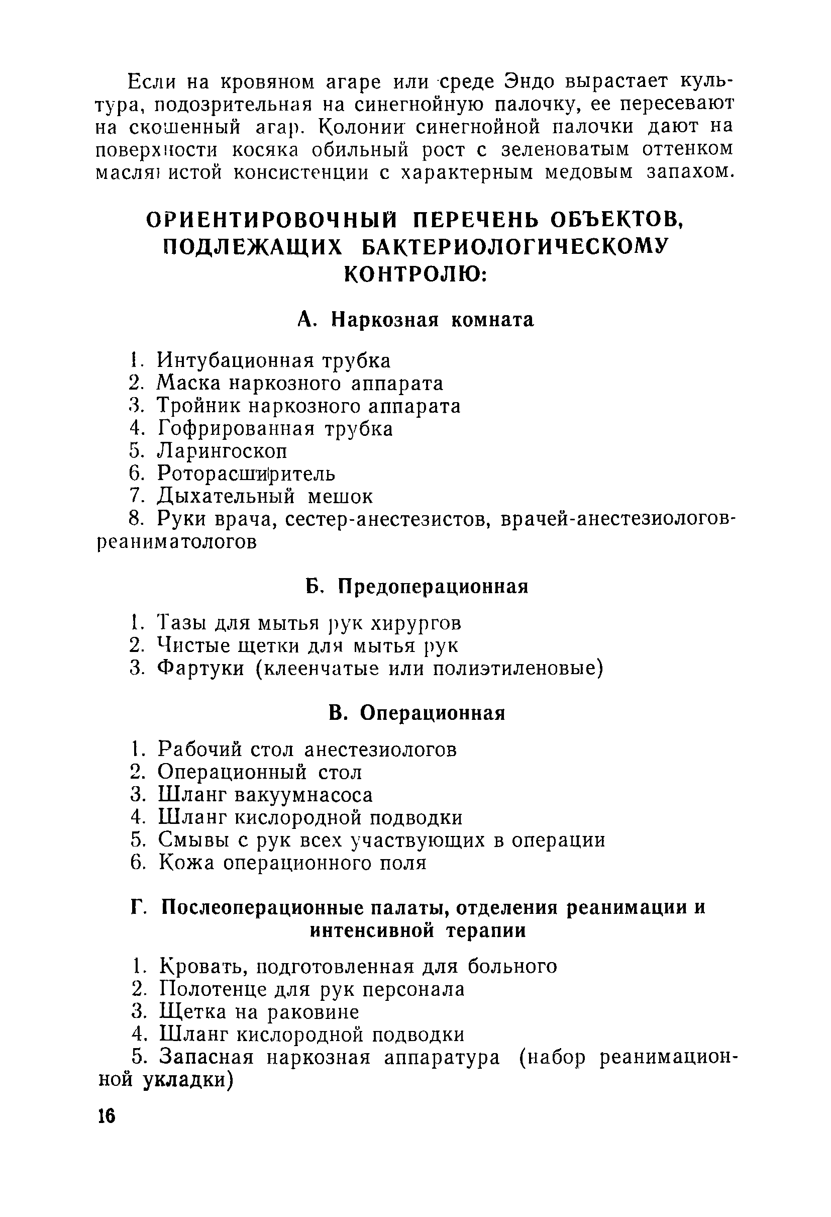 Временные методические рекомендации по организации и проведению комплекса санитарно-гигиенических мероприятий в отделениях, больницах, клиниках и институтах хирургического профиля| Статус: | справочные материалы, мп, тпр | | Название рус.: | Временные методические рекомендации по организации и проведению комплекса санитарно-гигиенических мероприятий в отделениях, больницах, клиниках и институтах хирургического профиля | | Дата добавления в базу: | 01.02.2020 | | Дата актуализации: | 01.01.2021 | | Оглавление: | I. Общие положения II. Санитарно-гигиенический режим в приемном отделении и палатах III. Санитарно-гигиенический режим в операционном блоке, перевязочных и послеоперационных палатах, отделениях реанимации и палатах интенсивной терапии IV. Обработка операционного поля, рук, хирургических перчаток в ходе операции V. Подготовка хирургических инструментов к операции VI. Стерилизация хирургических инструментов, резиновых перчаток, перевязочного материала, хирургического белья VII. Бактериологический контроль комплекса санитарно-гигиенических мероприятий в хирургических отделениях А. Исследования микробной обсемененности воздушной среды Б. Исследования микробной обсемененности объектов внешней среды Ориентировочный перечень объектов, подлежащих бактериологическому контролю А. Наркозная комната Б. Предоперационная В. Операционная Г. Послеоперационные палаты, отделения реанимации и интенсивной терапии Д. Перевязочные комнаты В. Исследование на стерильность хирургического материала Правила отбора проб на стерильность Учет результатов Г. Бактериологический контроль эффективности обработки кожи операционного поля и рук хирургов Учет результатов Приложение 1. Режимы стерилизации и дезинфекции отдельных объектов Приложение 2. Методика санации носителей патогенного стафилококка Приложение 3. Аппараты для снижения микробной обсемененности воздуха в помещениях малого объема Приложение 4. Некоторые методы диагностики патогенных стафилококков | | Разработан: | Всесоюзный научно-исследовательский институт дезинфекции и стерилизации Министерства здравоохранения СССР Городская санитарно-эпидемиологическая станция г. Москвы