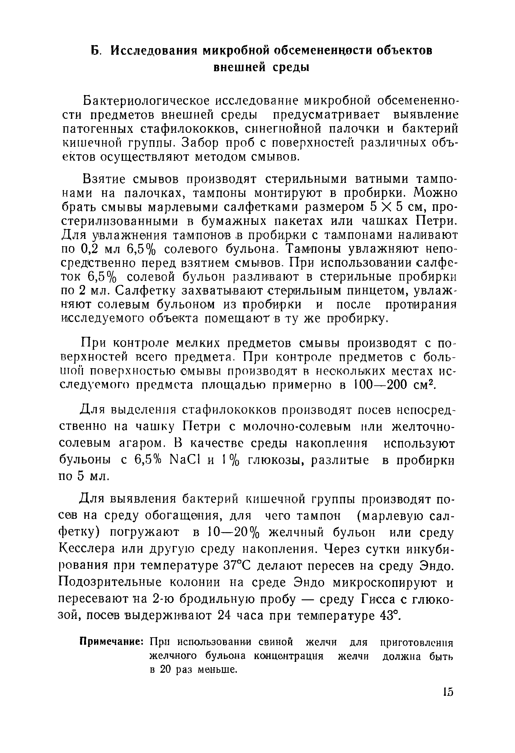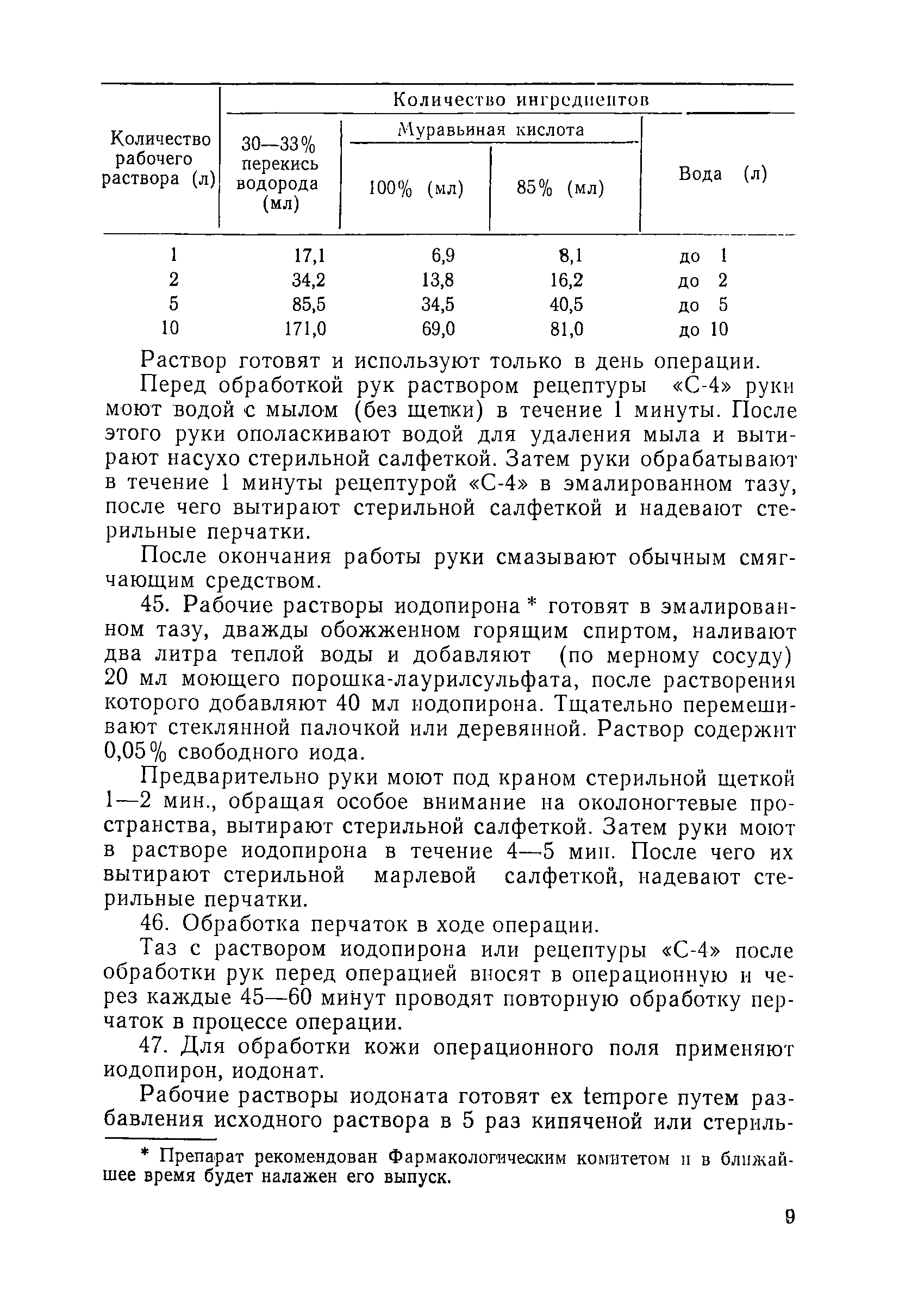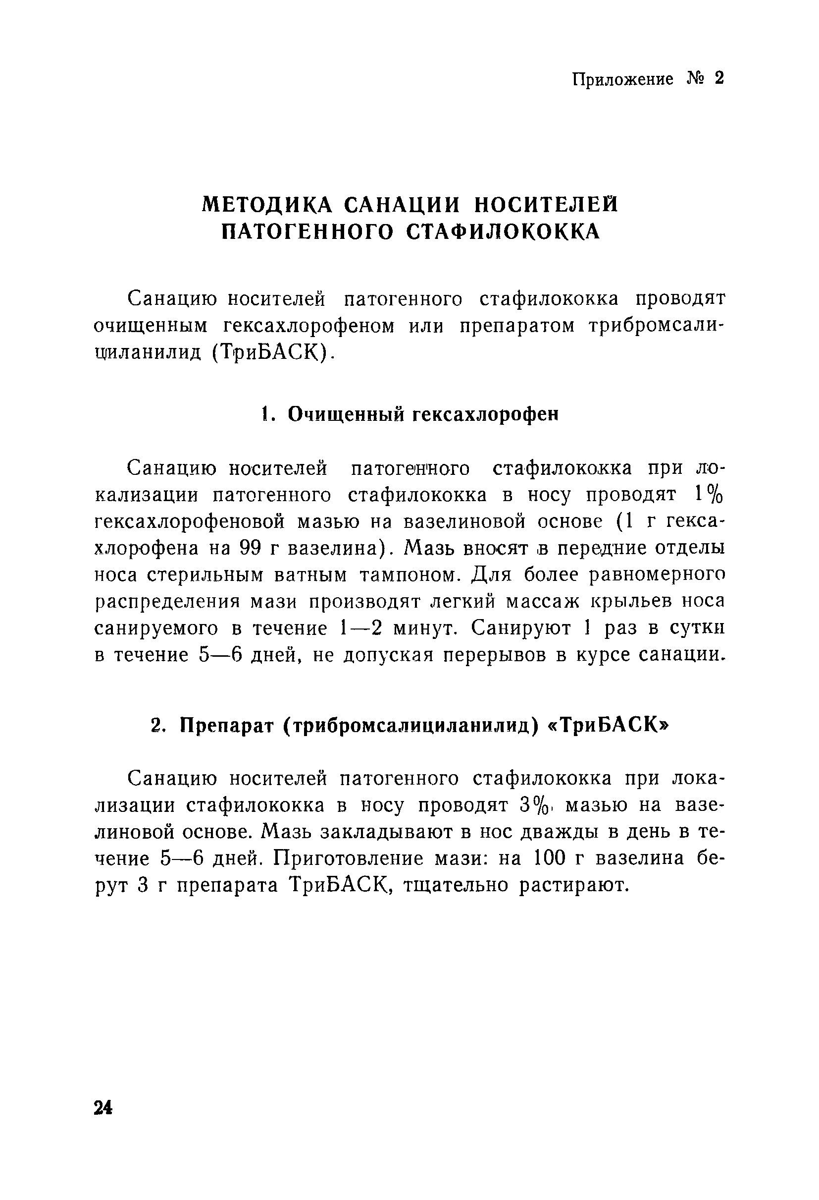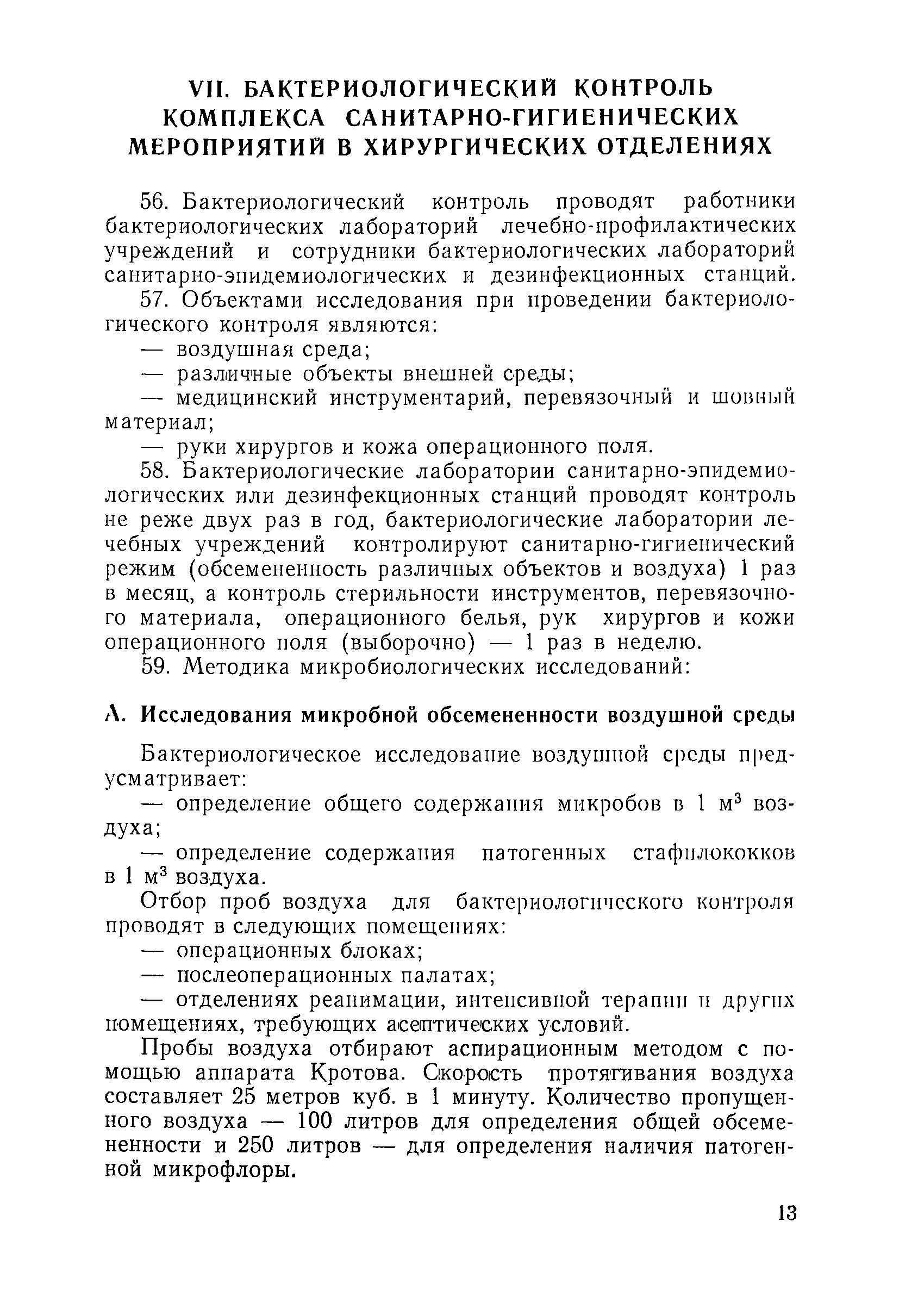Временные методические рекомендации по организации и проведению комплекса санитарно-гигиенических мероприятий в отделениях, больницах, клиниках и институтах хирургического профиля| Статус: | справочные материалы, мп, тпр | | Название рус.: | Временные методические рекомендации по организации и проведению комплекса санитарно-гигиенических мероприятий в отделениях, больницах, клиниках и институтах хирургического профиля | | Дата добавления в базу: | 01.02.2020 | | Дата актуализации: | 01.01.2021 | | Оглавление: | I. Общие положения II. Санитарно-гигиенический режим в приемном отделении и палатах III. Санитарно-гигиенический режим в операционном блоке, перевязочных и послеоперационных палатах, отделениях реанимации и палатах интенсивной терапии IV. Обработка операционного поля, рук, хирургических перчаток в ходе операции V. Подготовка хирургических инструментов к операции VI. Стерилизация хирургических инструментов, резиновых перчаток, перевязочного материала, хирургического белья VII. Бактериологический контроль комплекса санитарно-гигиенических мероприятий в хирургических отделениях А. Исследования микробной обсемененности воздушной среды Б. Исследования микробной обсемененности объектов внешней среды Ориентировочный перечень объектов, подлежащих бактериологическому контролю А. Наркозная комната Б. Предоперационная В. Операционная Г. Послеоперационные палаты, отделения реанимации и интенсивной терапии Д. Перевязочные комнаты В. Исследование на стерильность хирургического материала Правила отбора проб на стерильность Учет результатов Г. Бактериологический контроль эффективности обработки кожи операционного поля и рук хирургов Учет результатов Приложение 1. Режимы стерилизации и дезинфекции отдельных объектов Приложение 2. Методика санации носителей патогенного стафилококка Приложение 3. Аппараты для снижения микробной обсемененности воздуха в помещениях малого объема Приложение 4. Некоторые методы диагностики патогенных стафилококков | | Разработан: | Всесоюзный научно-исследовательский институт дезинфекции и стерилизации Министерства здравоохранения СССР Городская санитарно-эпидемиологическая станция г. Москвы