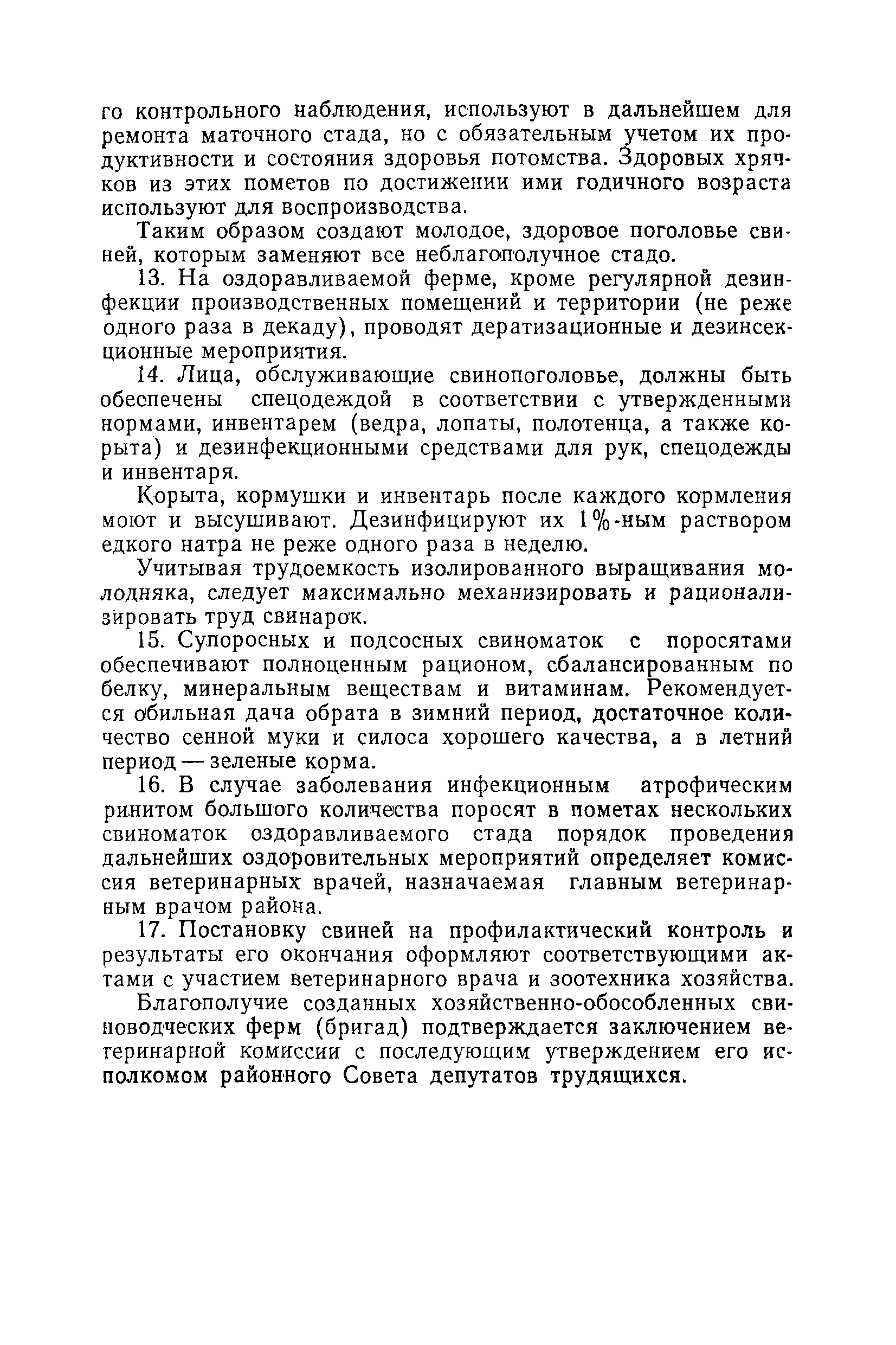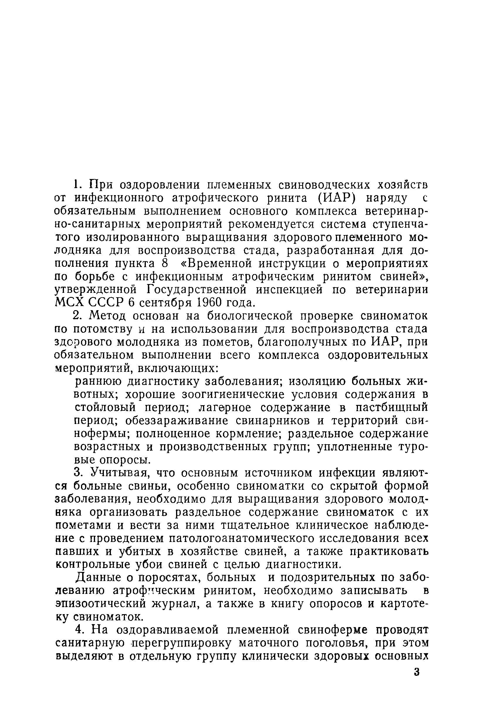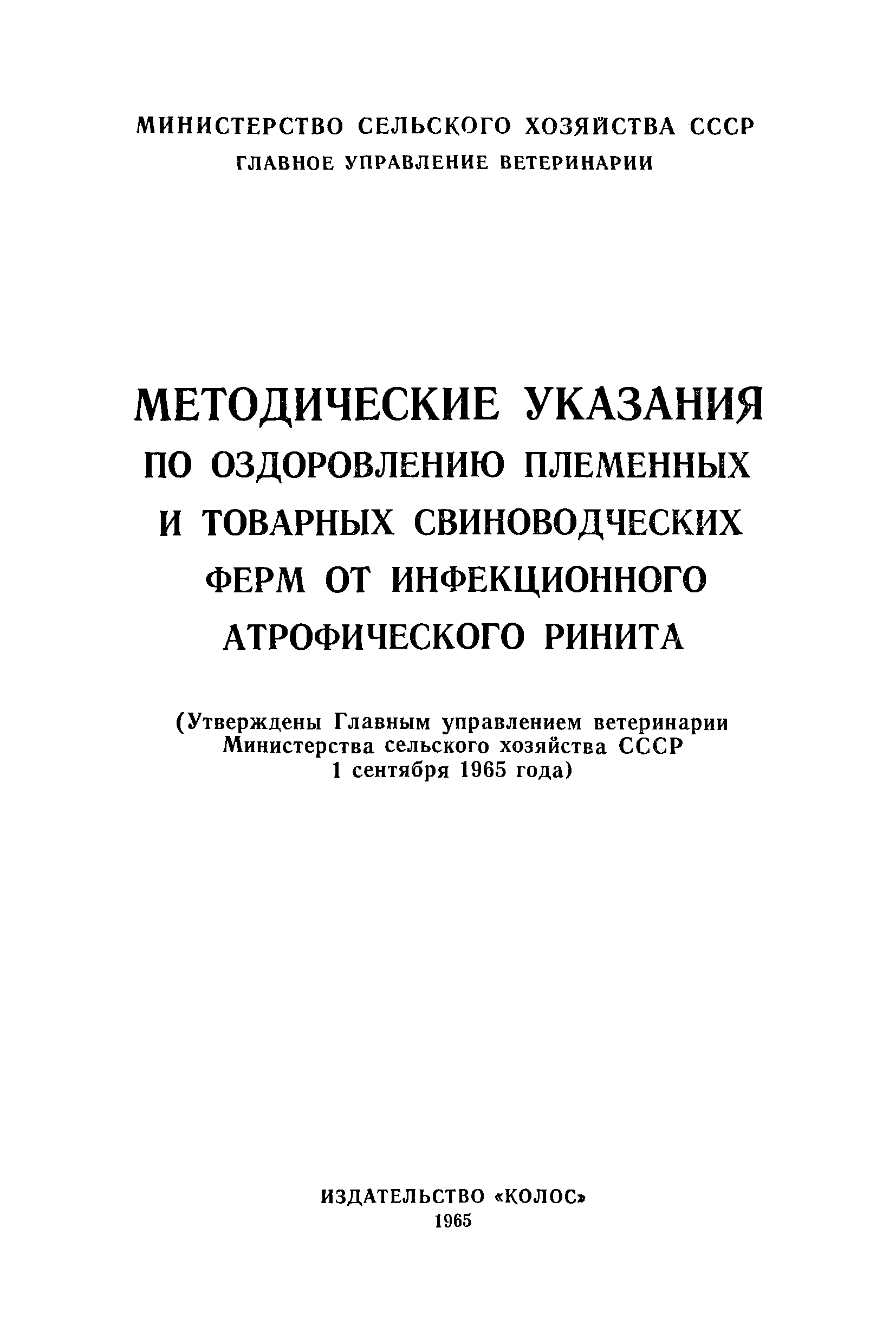 Методические указания по оздоровлению племенных и товарных свиноводческих ферм от инфекционного атрофического ринита| Статус: | отменен в рф | | Название рус.: | Методические указания по оздоровлению племенных и товарных свиноводческих ферм от инфекционного атрофического ринита | | Дата добавления в базу: | 01.02.2020 | | Дата актуализации: | 01.01.2021 | | Дата введения: | 30.04.2020 | | Утверждён: | 01.09.1965 Главное управление ветеринарии Министерства сельского хозяйства СССР