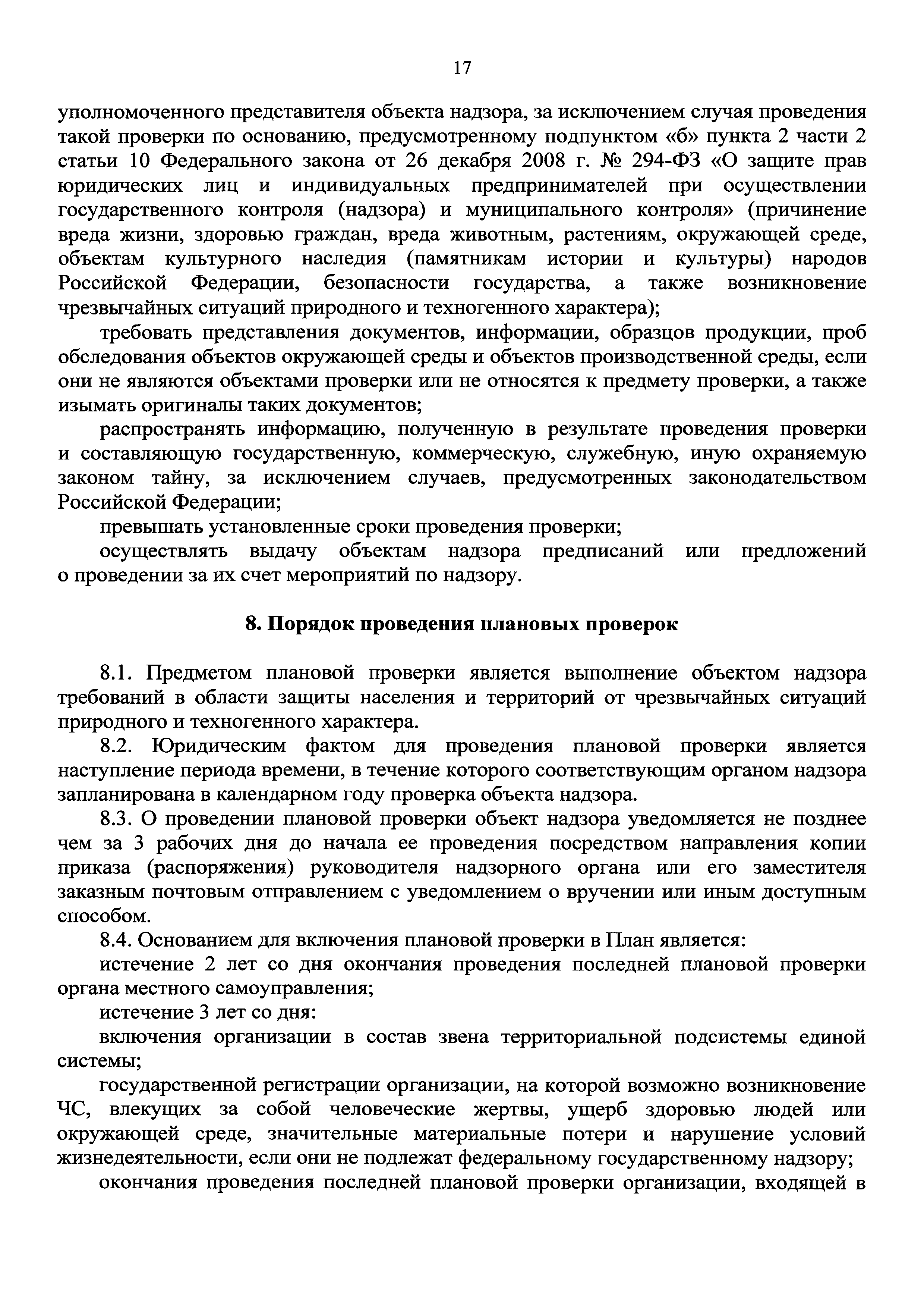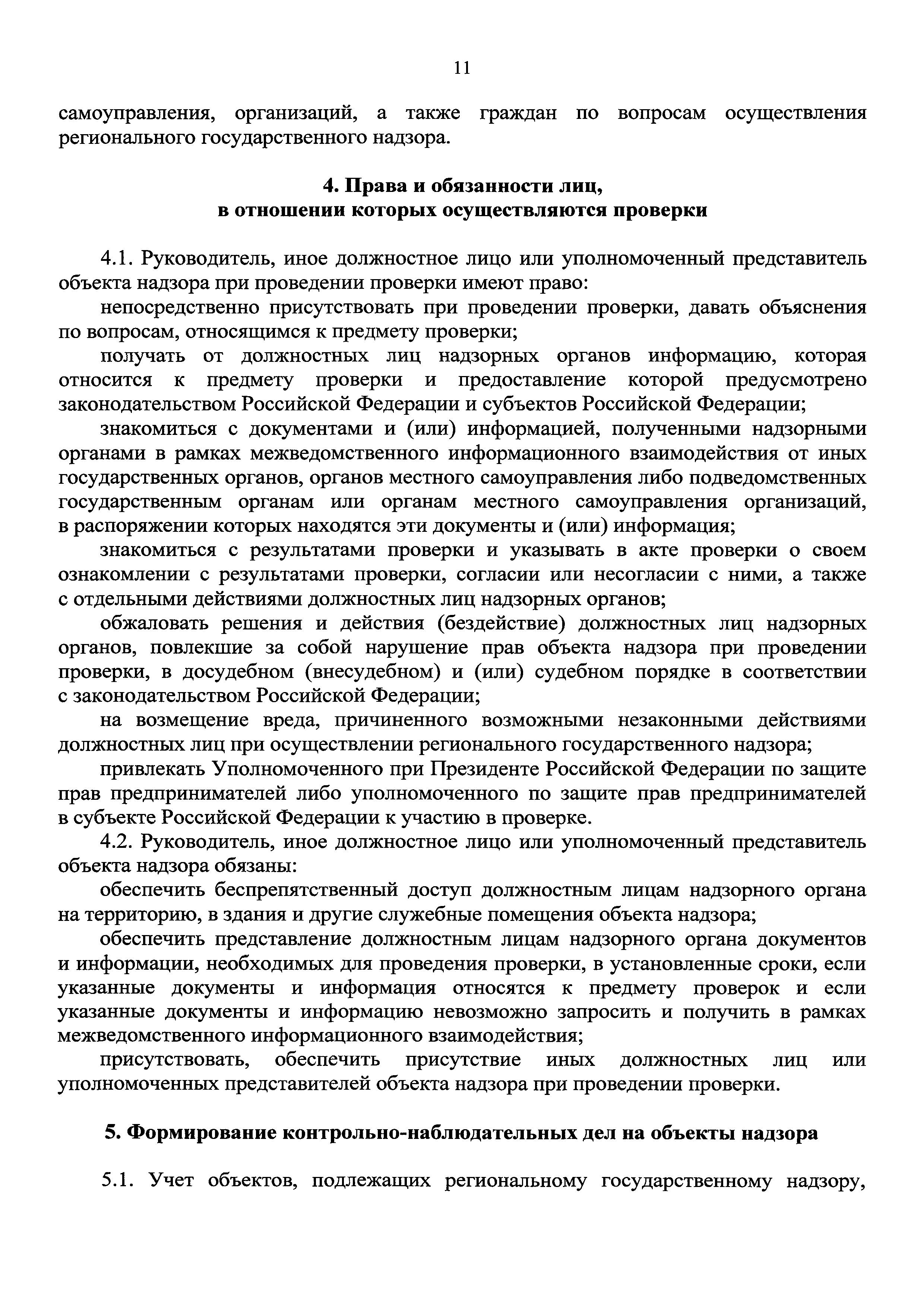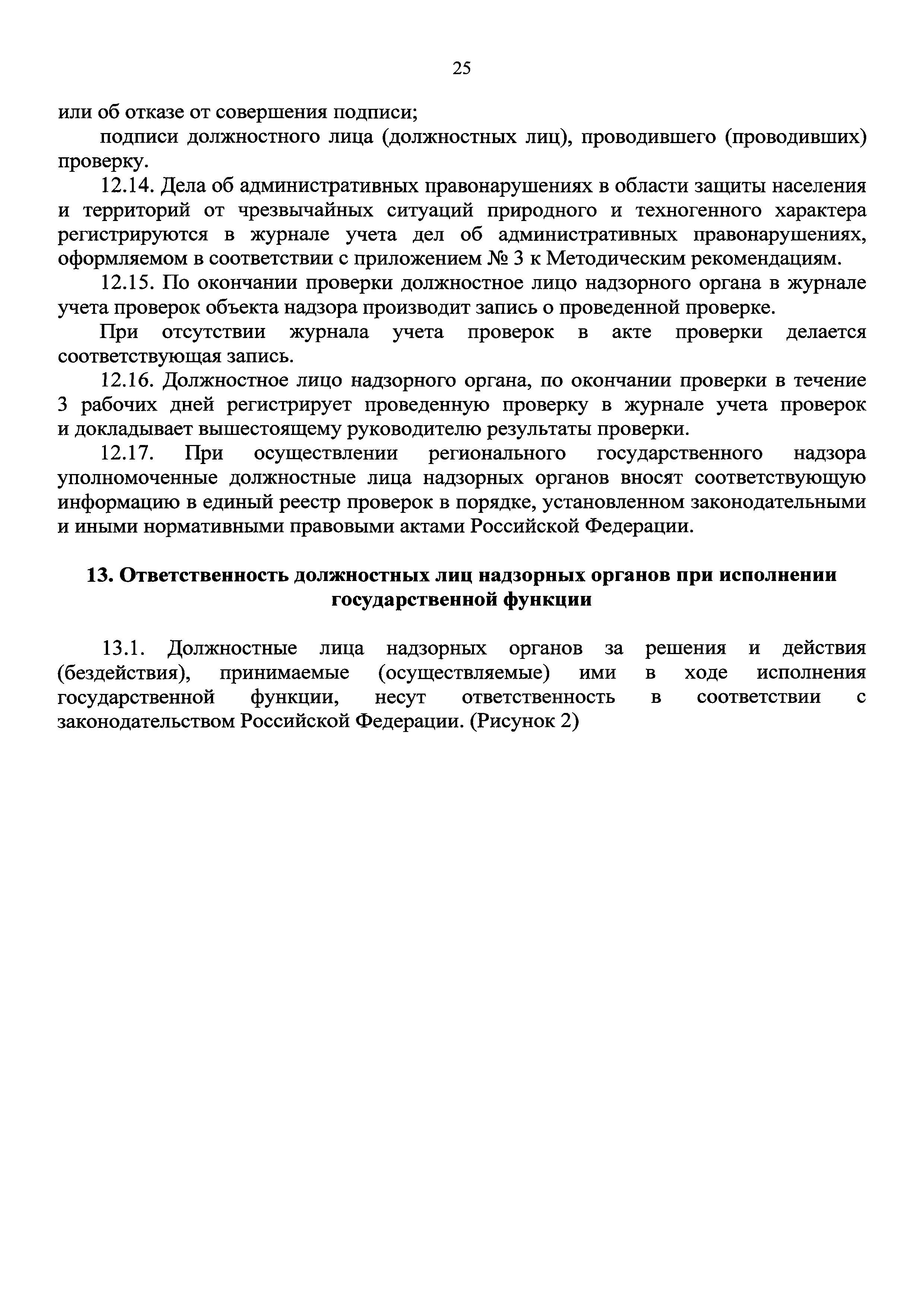 | Оглавление: | 1. Введение 2. Общие положения 3. Права и обязанности должностных лиц органов регионального государственного надзора 4. Права и обязанности лиц, в отношении которых осуществляются проверки 5. Формирование контрольно-наблюдательных дел на объекты надзора 6. Сроки проведения проверок 7. Общие требования к планированию и проведению проверок 8. Порядок проведения плановых проверок 9. Порядок проведения внеплановых проверок 10. Порядок проведения документарных проверок 11. Порядок проведения выездных проверок 12. Оформление результатов проверок 13. Ответственность должностных лиц надзорных органов при исполнении государственной функции Приложение № 1. Журнал учета объектов надзора Приложение № 2. Журнал учета проверок Приложение № 3. Журнал учета дел об административных правонарушениях Приложение № 4. План проведения плановых проверок объектов надзора на 20__ год Приложение № 5. Акт проверки органом государственного контроля (надзора), органом муниципального контроля юридического лица, индивидуального предпринимателя Приложение № 6. Распоряжение (приказ) |