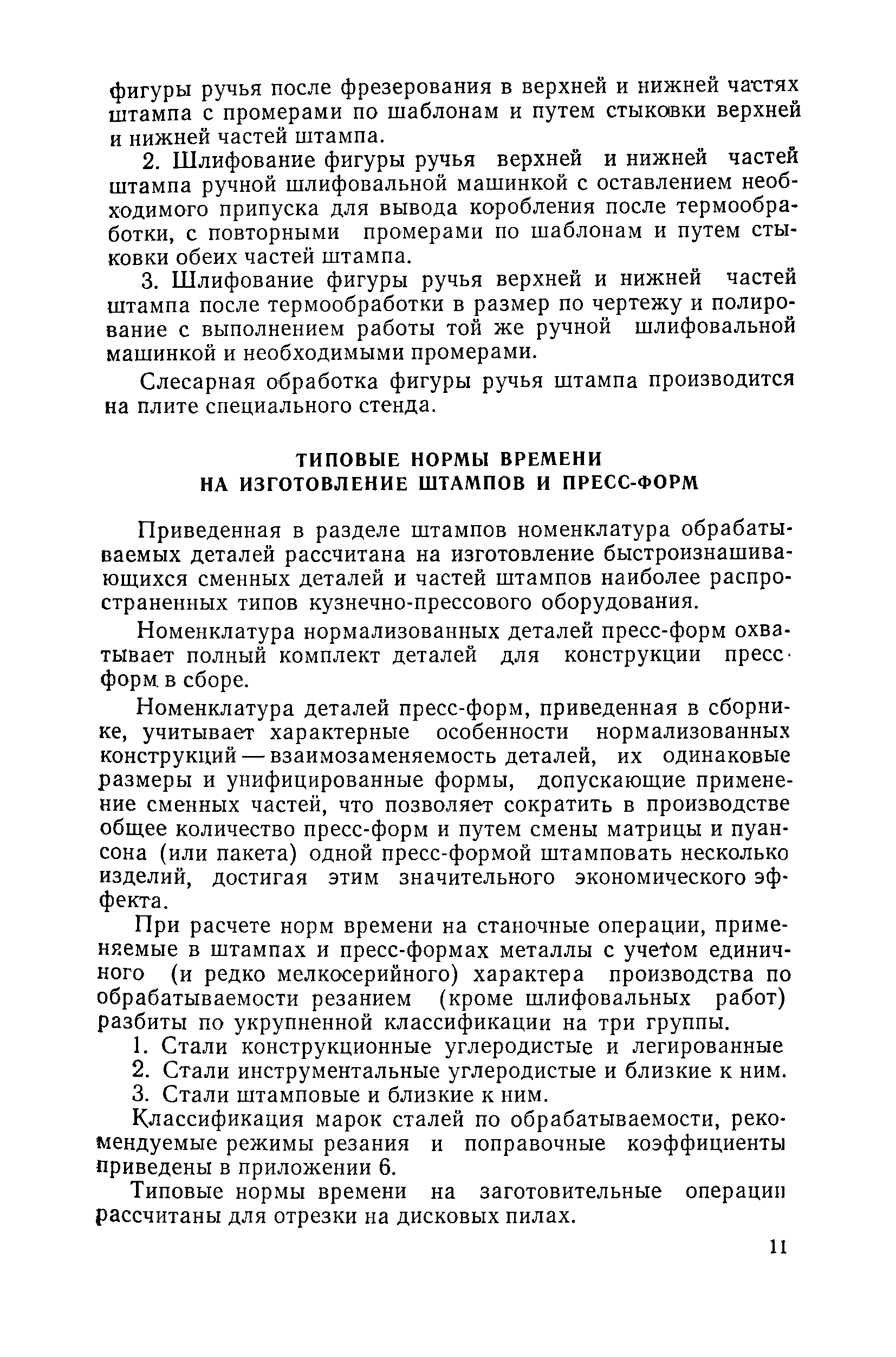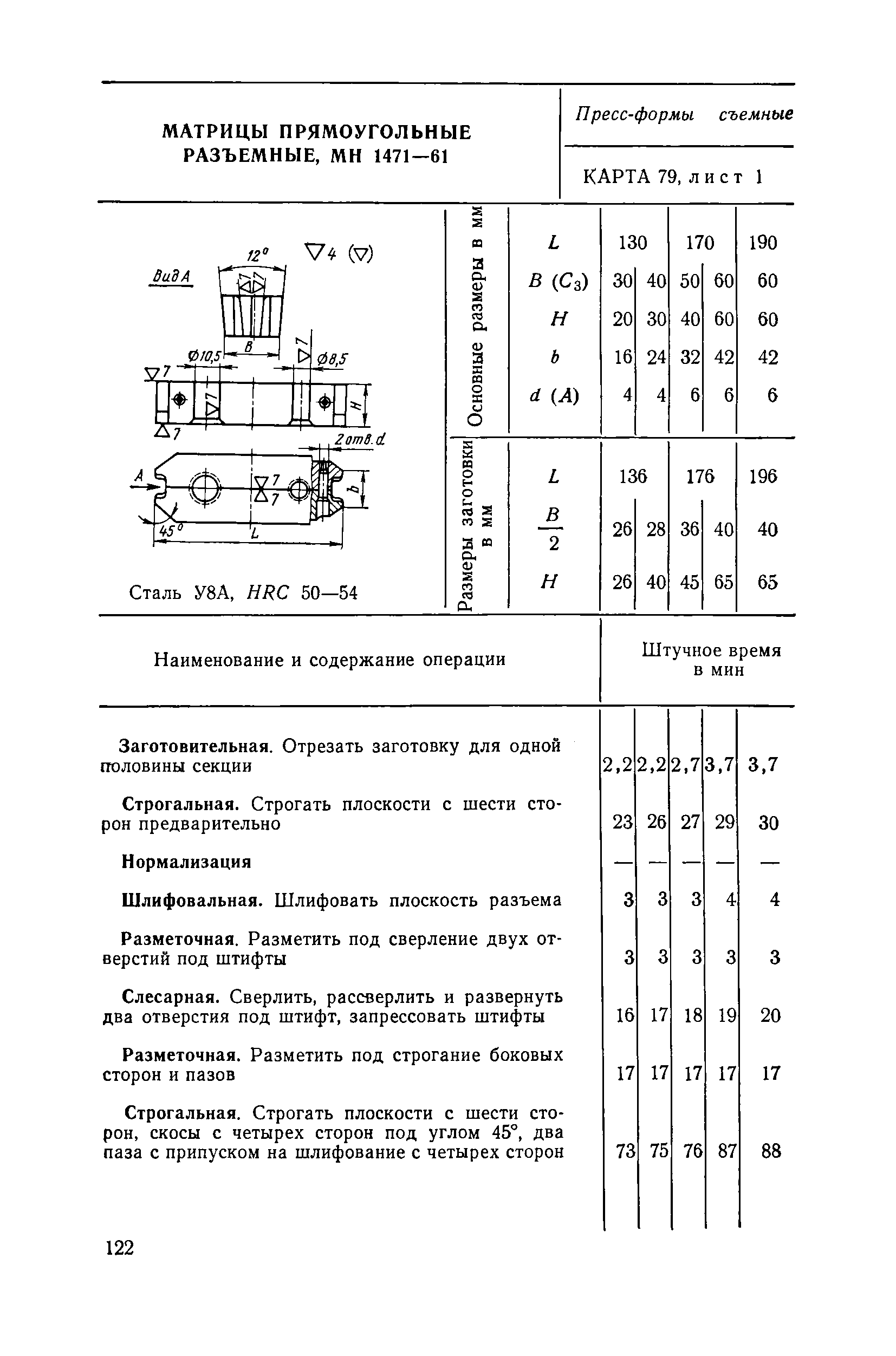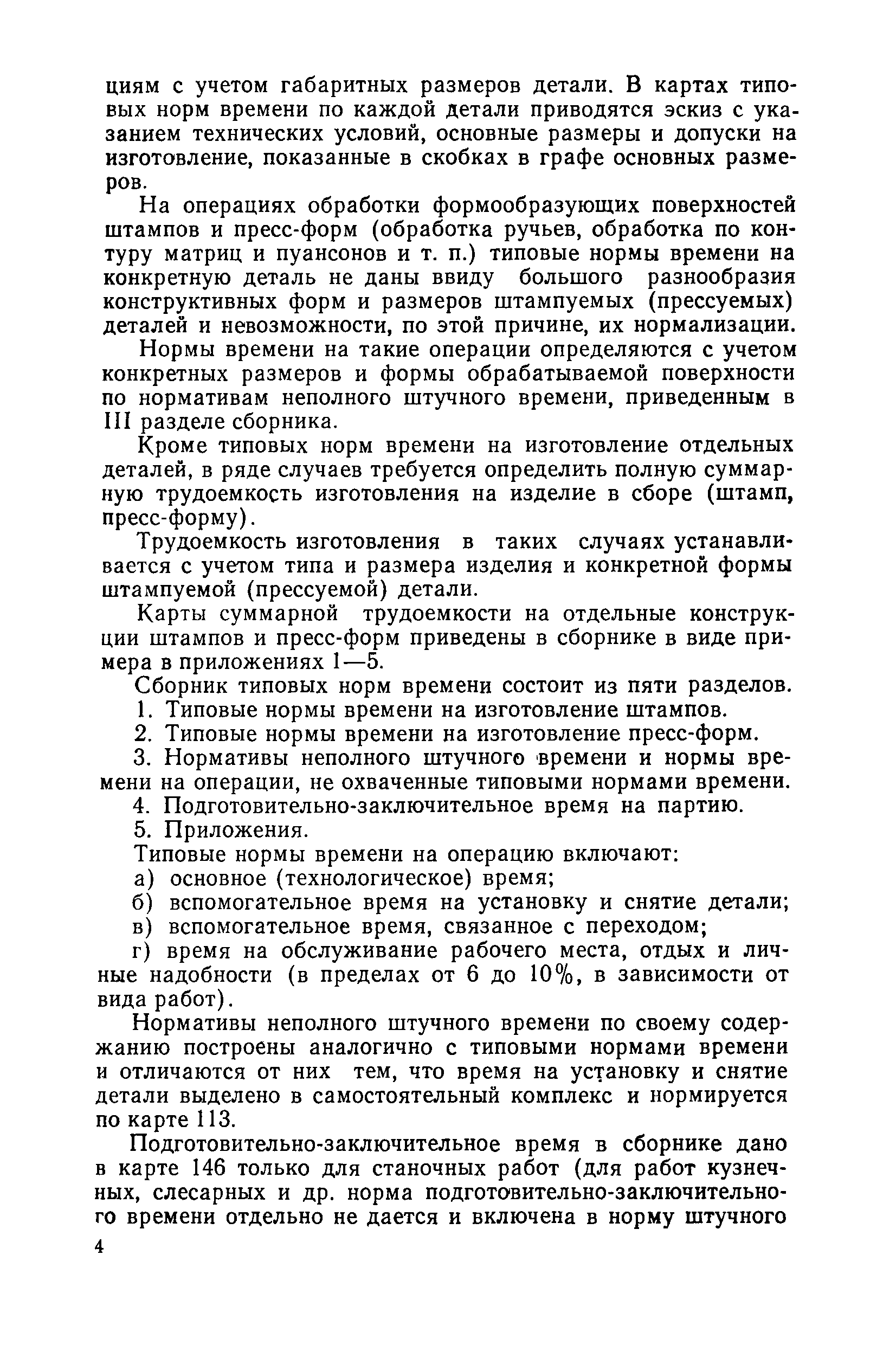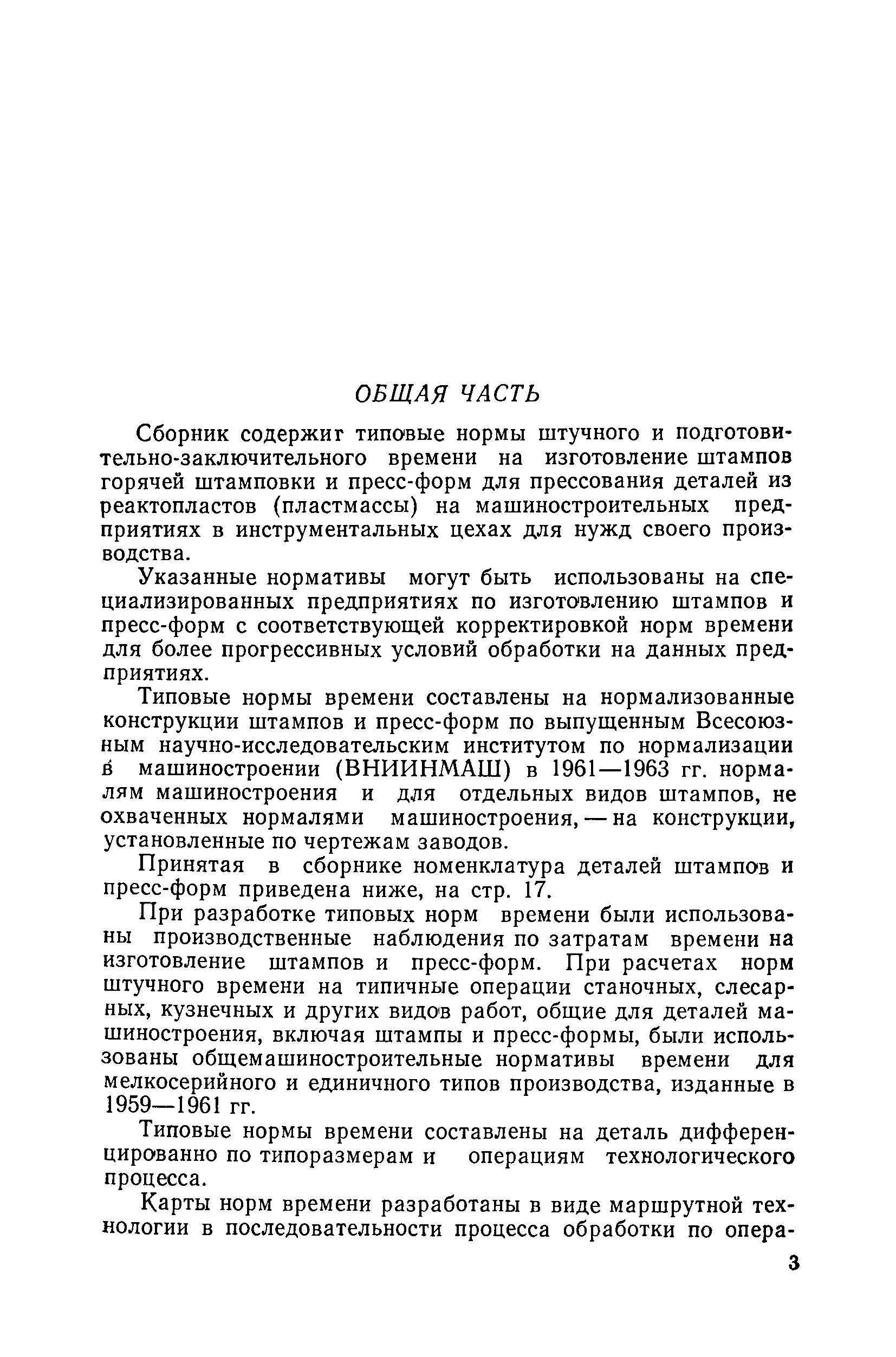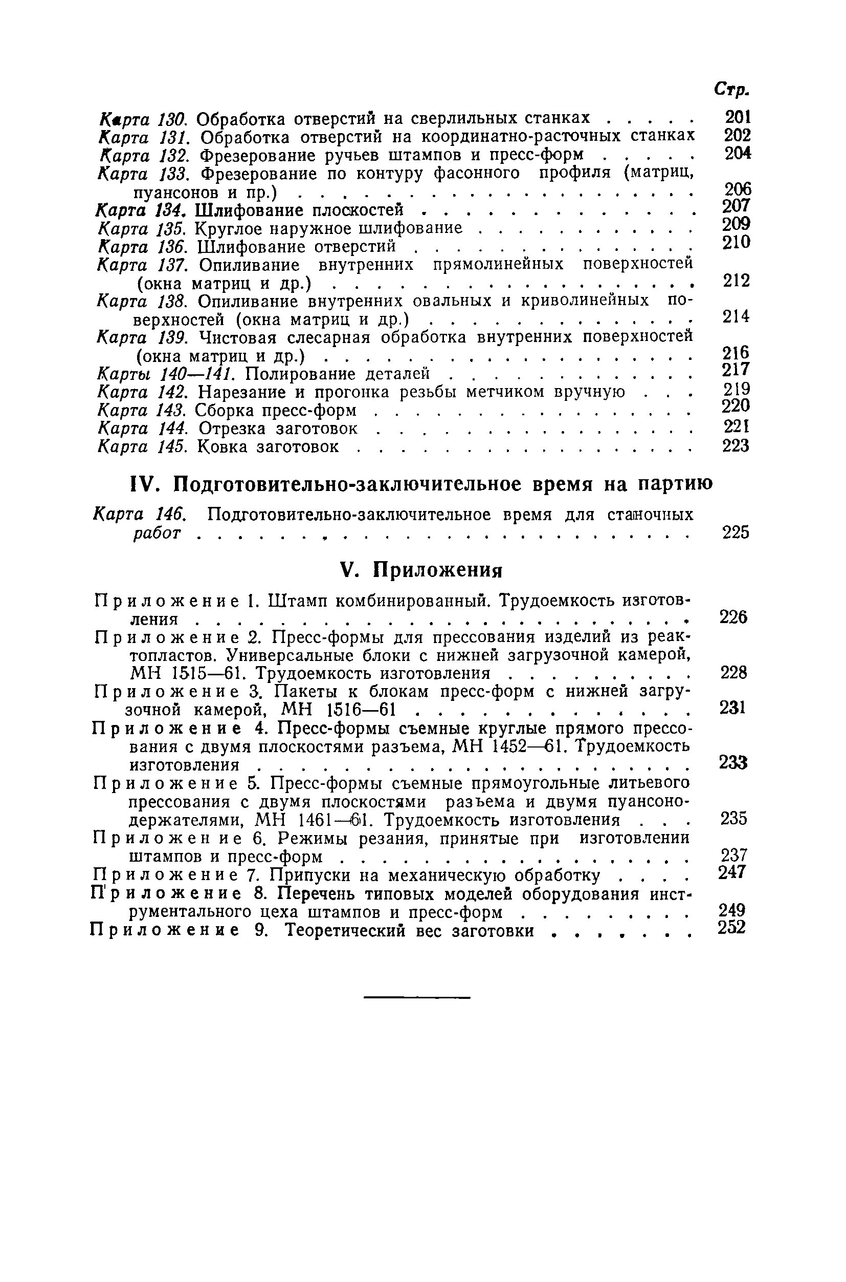 | Оглавление: | I. Типовые нормы времени на изготовление штампов II. Типовые нормы времени на изготовление пресс-форм Универсальные блоки пресс-форм с нижней загрузочной камерой Пакеты к блокам пресс-форм с нижней загрузочной камерой Пресс-формы съемные III. Нормативы неполного штучного времени и нормы времени на операции, не охваченные типовыми нормами времени IV. Подготовительно-заключительное время на партию Приложение 1. Штамп комбинированный, Трудоемкость изготовления Приложение 2. Пресс-формы для прессования изделий из реактопластов. Универсальные блоки с нижней загрузочной камерой, МН 1515-61. Трудоемкость изготовления Приложение 3. Пакеты к блокам пресс-форм с нижней загрузочной камерой, МН 1516-61 Приложение 4. Пресс-формы съемные круглые прямого прессования с двумя плоскостями разъема, МН 1452-61. Трудоемкость изготовления Приложение 5. Пресс-формы съемные прямоугольные литьевого прессования с двумя плоскостями разъема и двумя пуансонодержателями, МН 1461-61. Трудоемкость изготовления Приложение 6. Режимы резания, принятые при изготовлении штампов и пресс-форм Приложение 7. Припуски на механическую обработку Приложение 8. Перечень типовых моделей оборудования инструментального цеха штампов и пресс-форм Приложение 9. Теоретический вес заготовк |