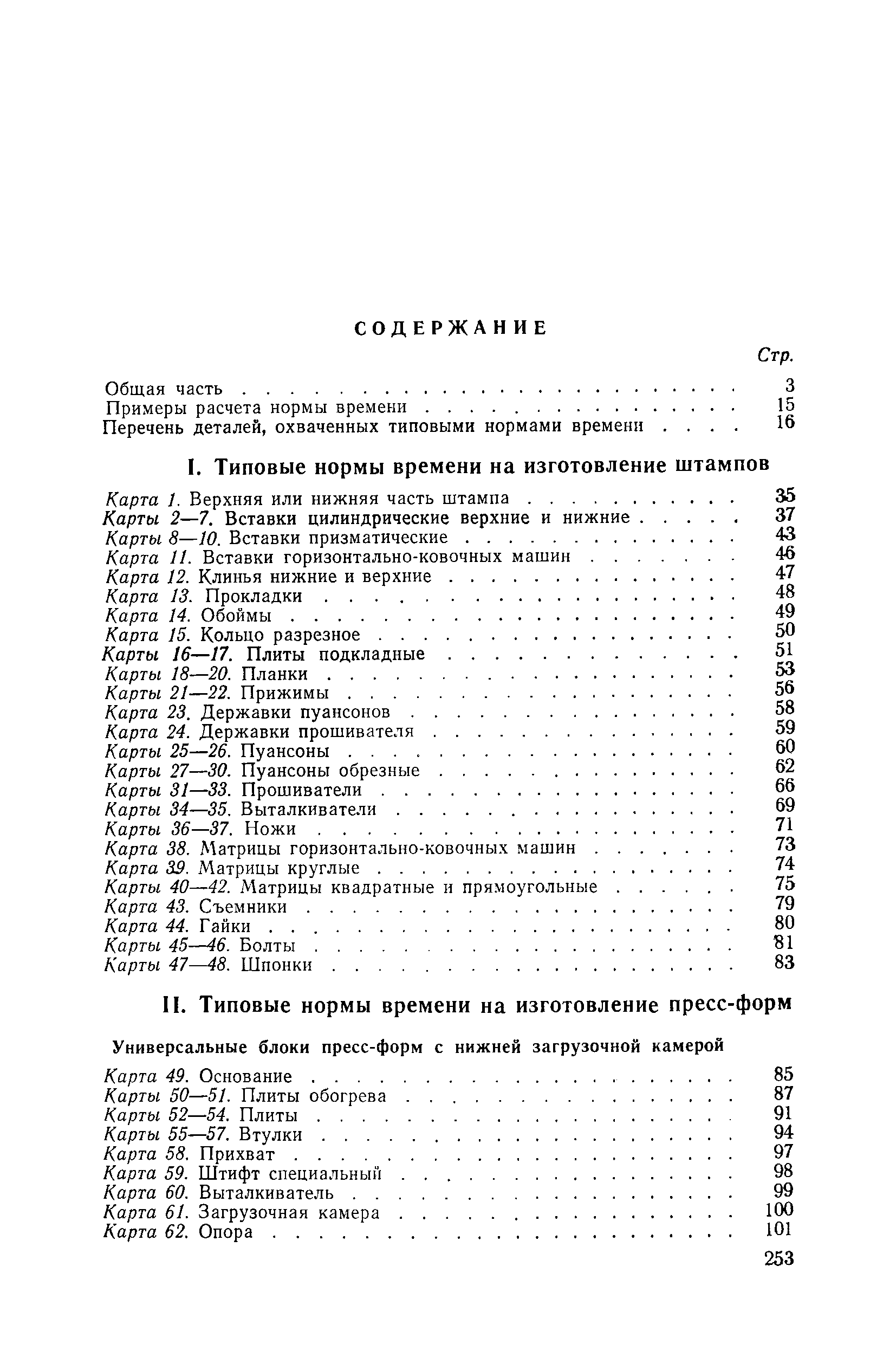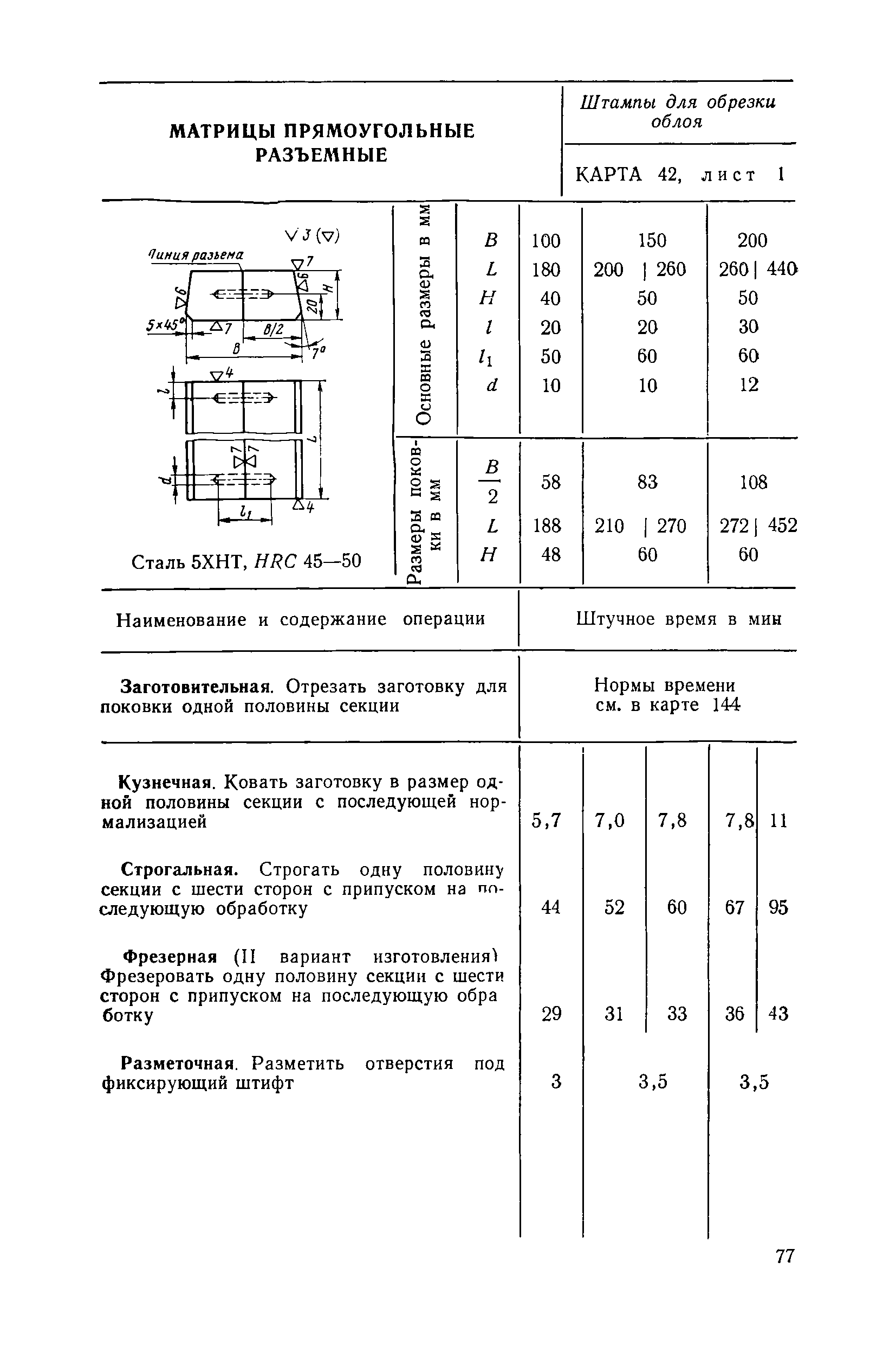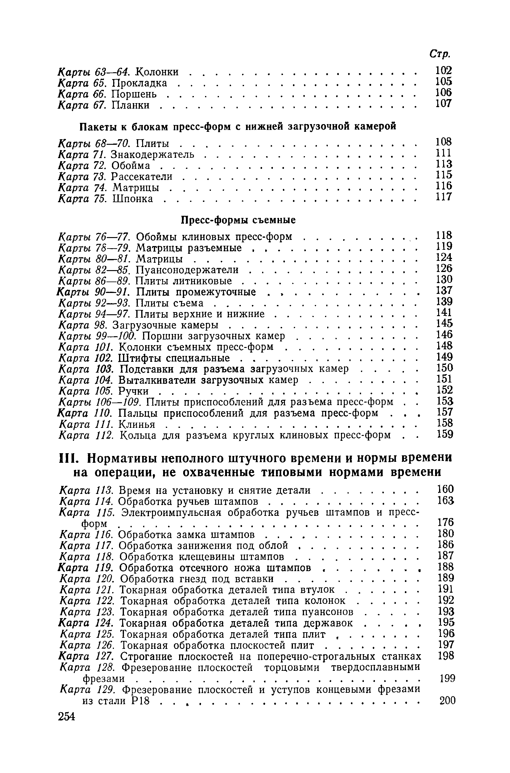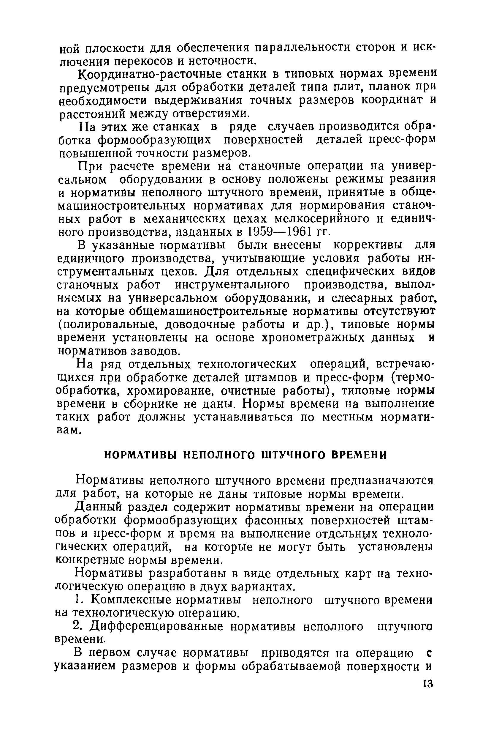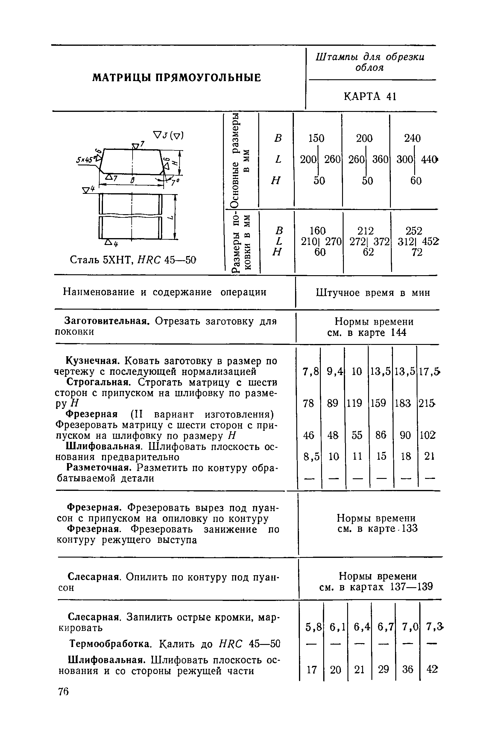 | Оглавление: | I. Типовые нормы времени на изготовление штампов II. Типовые нормы времени на изготовление пресс-форм Универсальные блоки пресс-форм с нижней загрузочной камерой Пакеты к блокам пресс-форм с нижней загрузочной камерой Пресс-формы съемные III. Нормативы неполного штучного времени и нормы времени на операции, не охваченные типовыми нормами времени IV. Подготовительно-заключительное время на партию Приложение 1. Штамп комбинированный, Трудоемкость изготовления Приложение 2. Пресс-формы для прессования изделий из реактопластов. Универсальные блоки с нижней загрузочной камерой, МН 1515-61. Трудоемкость изготовления Приложение 3. Пакеты к блокам пресс-форм с нижней загрузочной камерой, МН 1516-61 Приложение 4. Пресс-формы съемные круглые прямого прессования с двумя плоскостями разъема, МН 1452-61. Трудоемкость изготовления Приложение 5. Пресс-формы съемные прямоугольные литьевого прессования с двумя плоскостями разъема и двумя пуансонодержателями, МН 1461-61. Трудоемкость изготовления Приложение 6. Режимы резания, принятые при изготовлении штампов и пресс-форм Приложение 7. Припуски на механическую обработку Приложение 8. Перечень типовых моделей оборудования инструментального цеха штампов и пресс-форм Приложение 9. Теоретический вес заготовк |