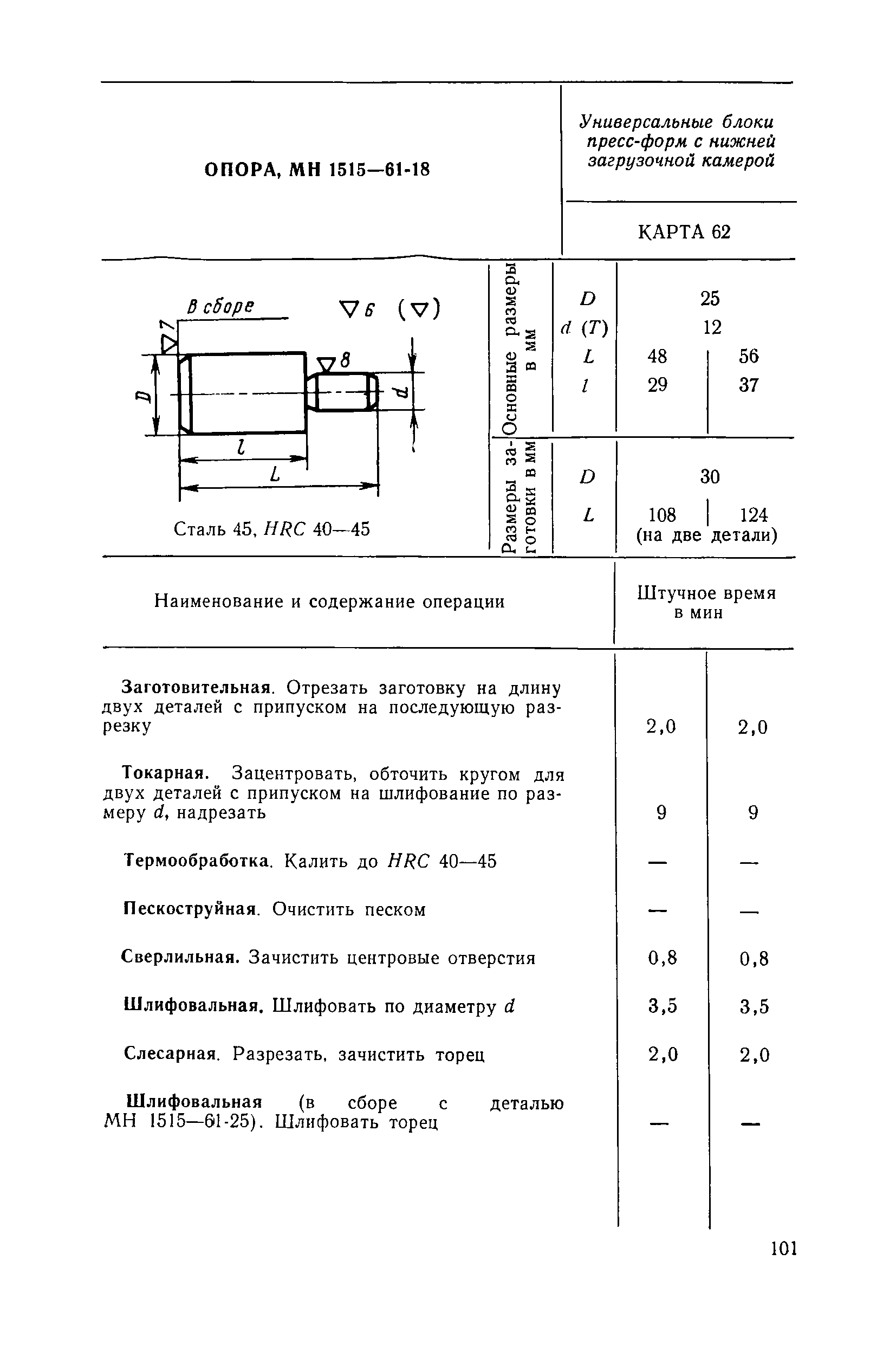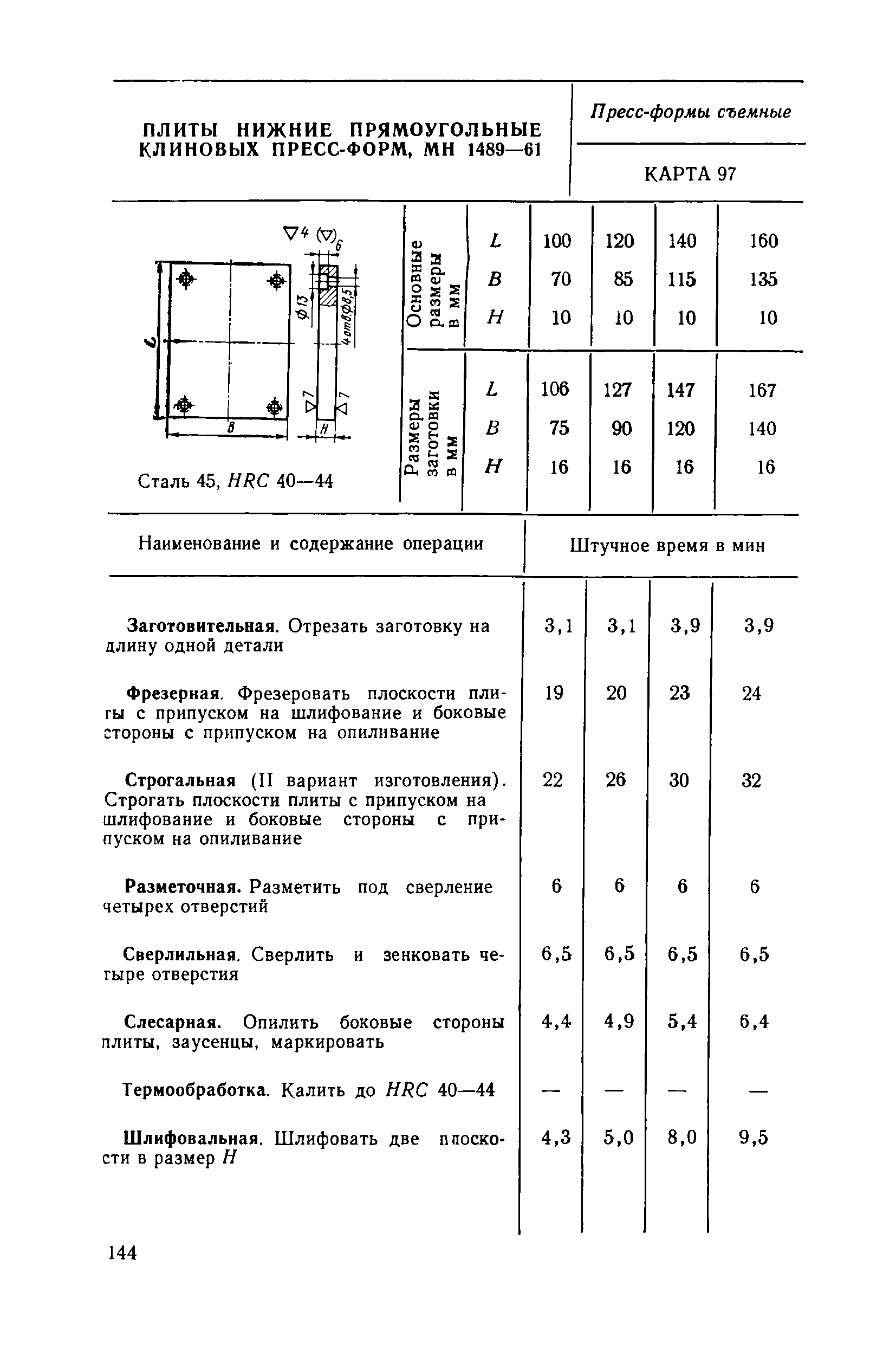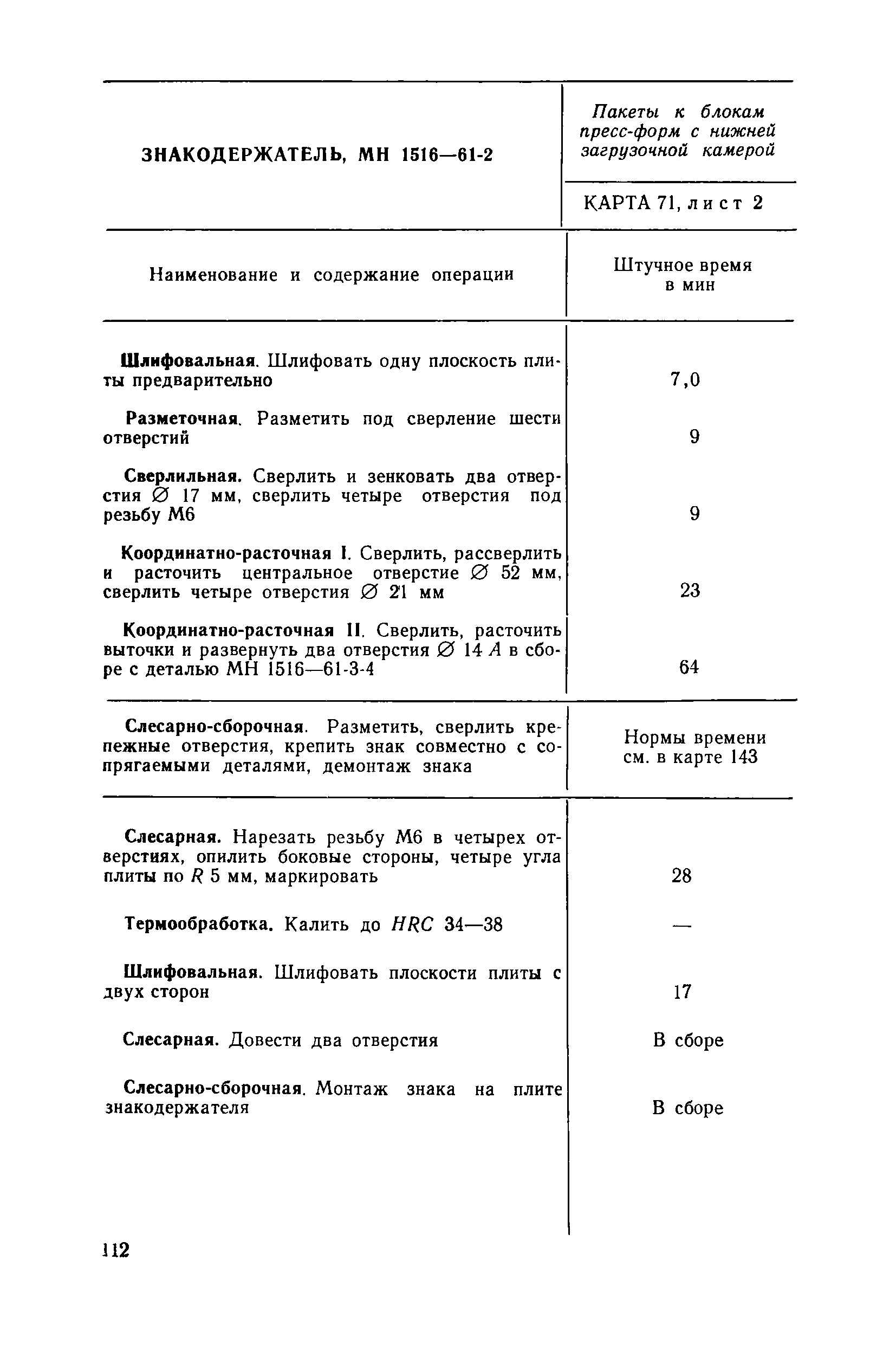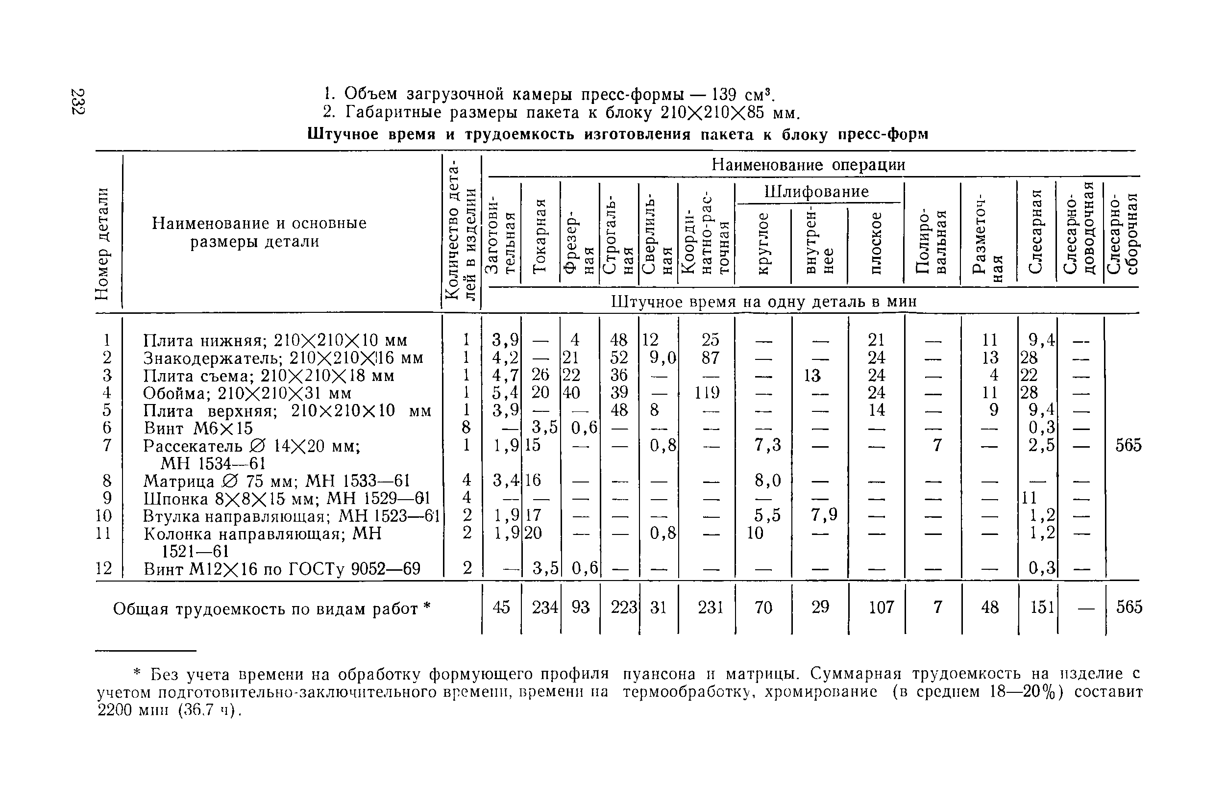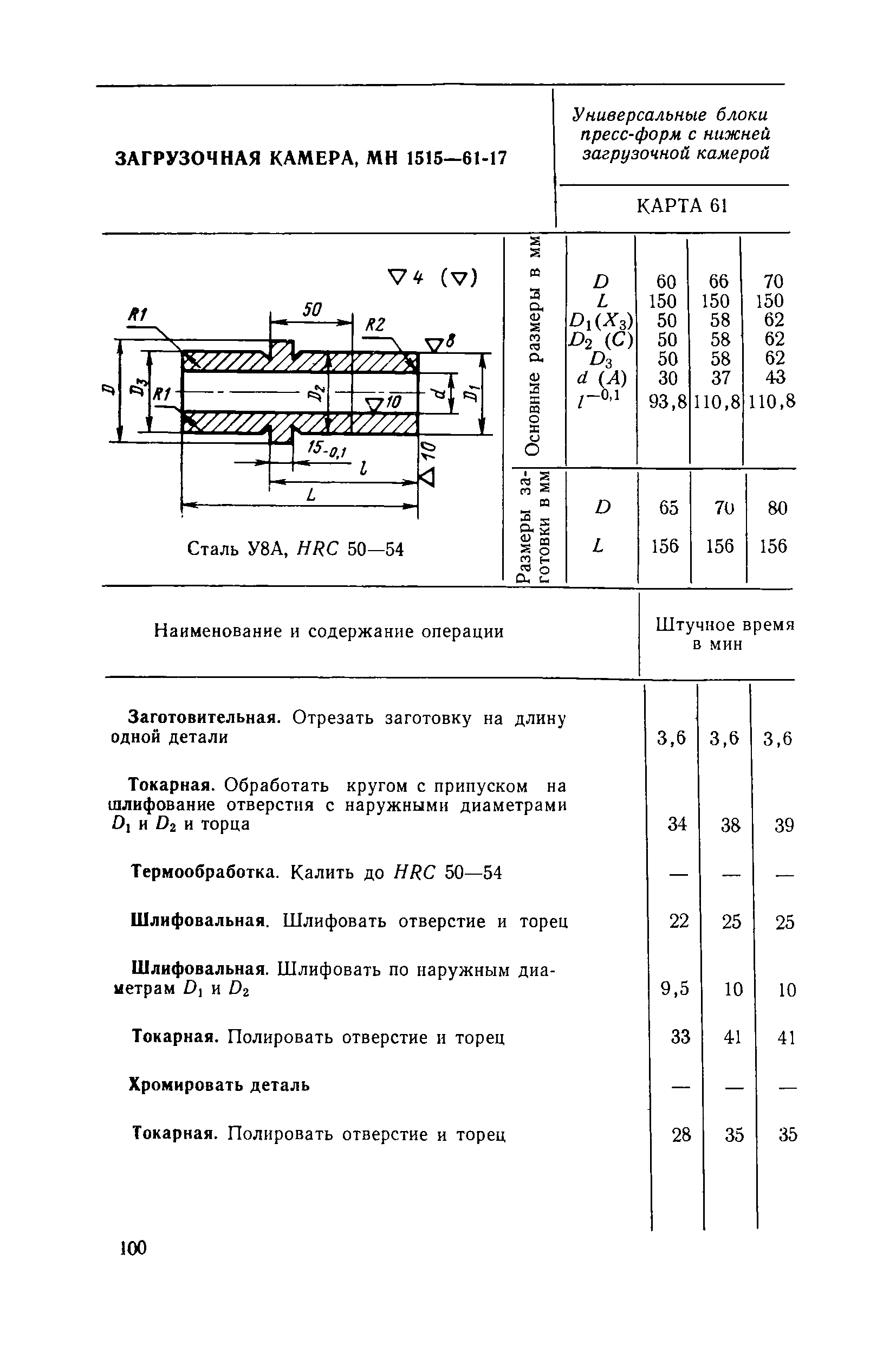 | Оглавление: | I. Типовые нормы времени на изготовление штампов II. Типовые нормы времени на изготовление пресс-форм Универсальные блоки пресс-форм с нижней загрузочной камерой Пакеты к блокам пресс-форм с нижней загрузочной камерой Пресс-формы съемные III. Нормативы неполного штучного времени и нормы времени на операции, не охваченные типовыми нормами времени IV. Подготовительно-заключительное время на партию Приложение 1. Штамп комбинированный, Трудоемкость изготовления Приложение 2. Пресс-формы для прессования изделий из реактопластов. Универсальные блоки с нижней загрузочной камерой, МН 1515-61. Трудоемкость изготовления Приложение 3. Пакеты к блокам пресс-форм с нижней загрузочной камерой, МН 1516-61 Приложение 4. Пресс-формы съемные круглые прямого прессования с двумя плоскостями разъема, МН 1452-61. Трудоемкость изготовления Приложение 5. Пресс-формы съемные прямоугольные литьевого прессования с двумя плоскостями разъема и двумя пуансонодержателями, МН 1461-61. Трудоемкость изготовления Приложение 6. Режимы резания, принятые при изготовлении штампов и пресс-форм Приложение 7. Припуски на механическую обработку Приложение 8. Перечень типовых моделей оборудования инструментального цеха штампов и пресс-форм Приложение 9. Теоретический вес заготовк |