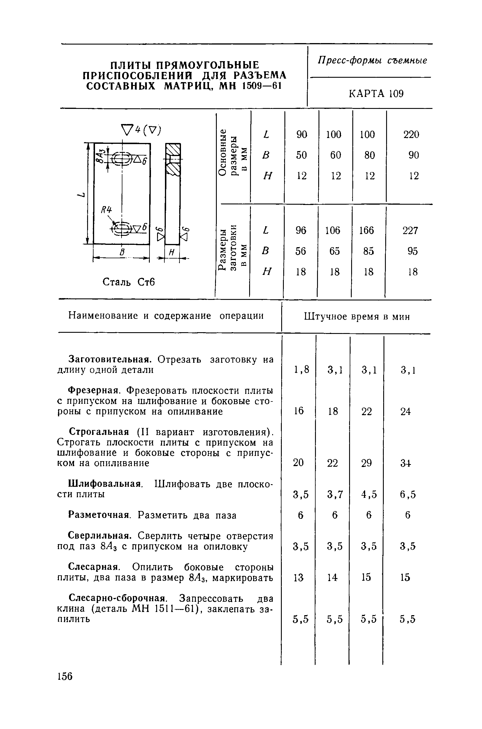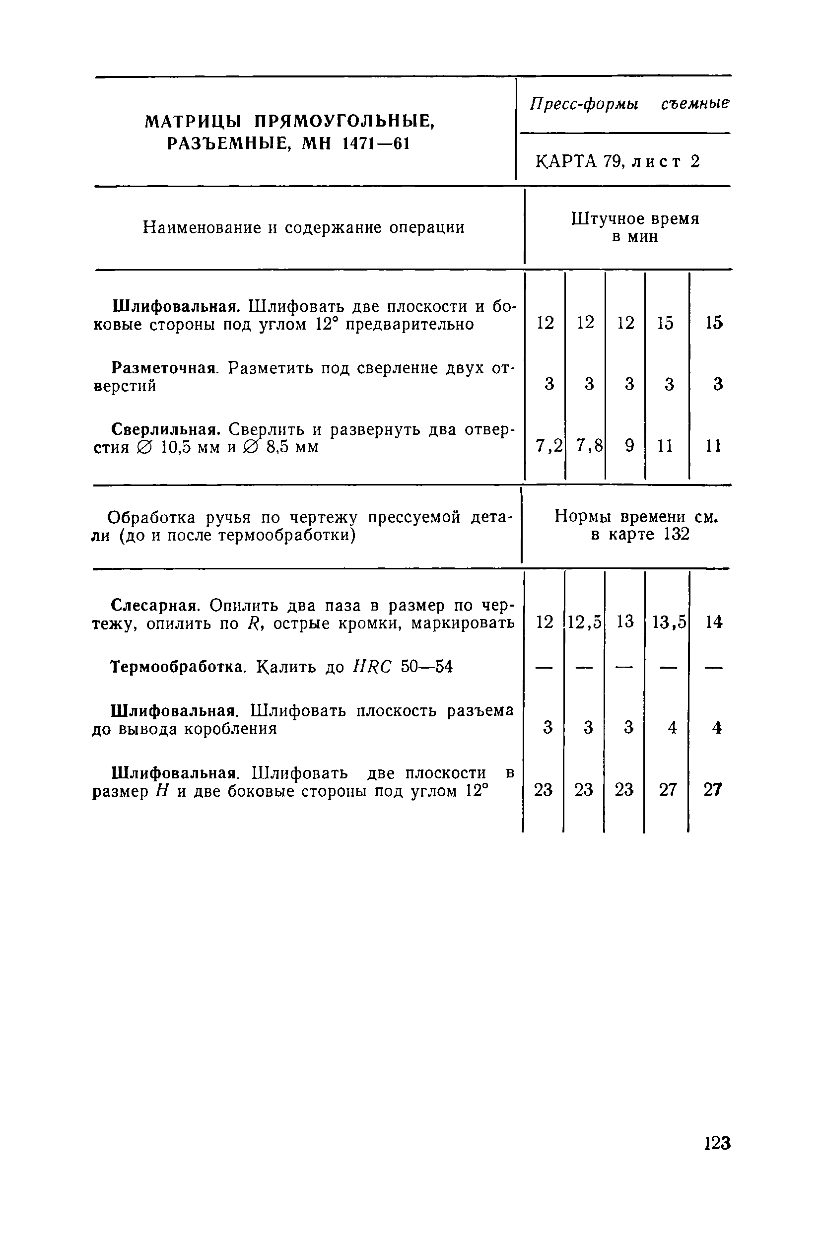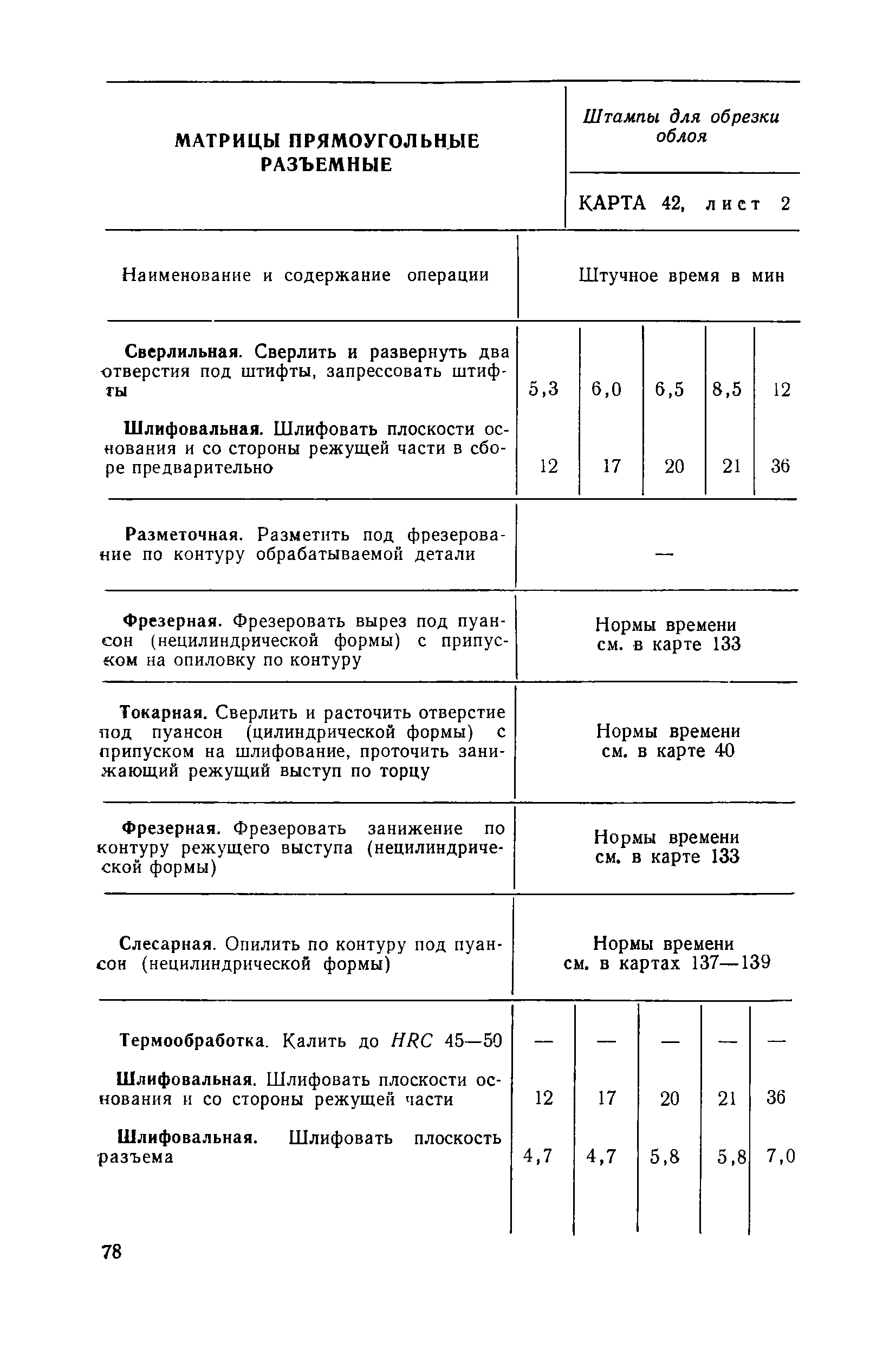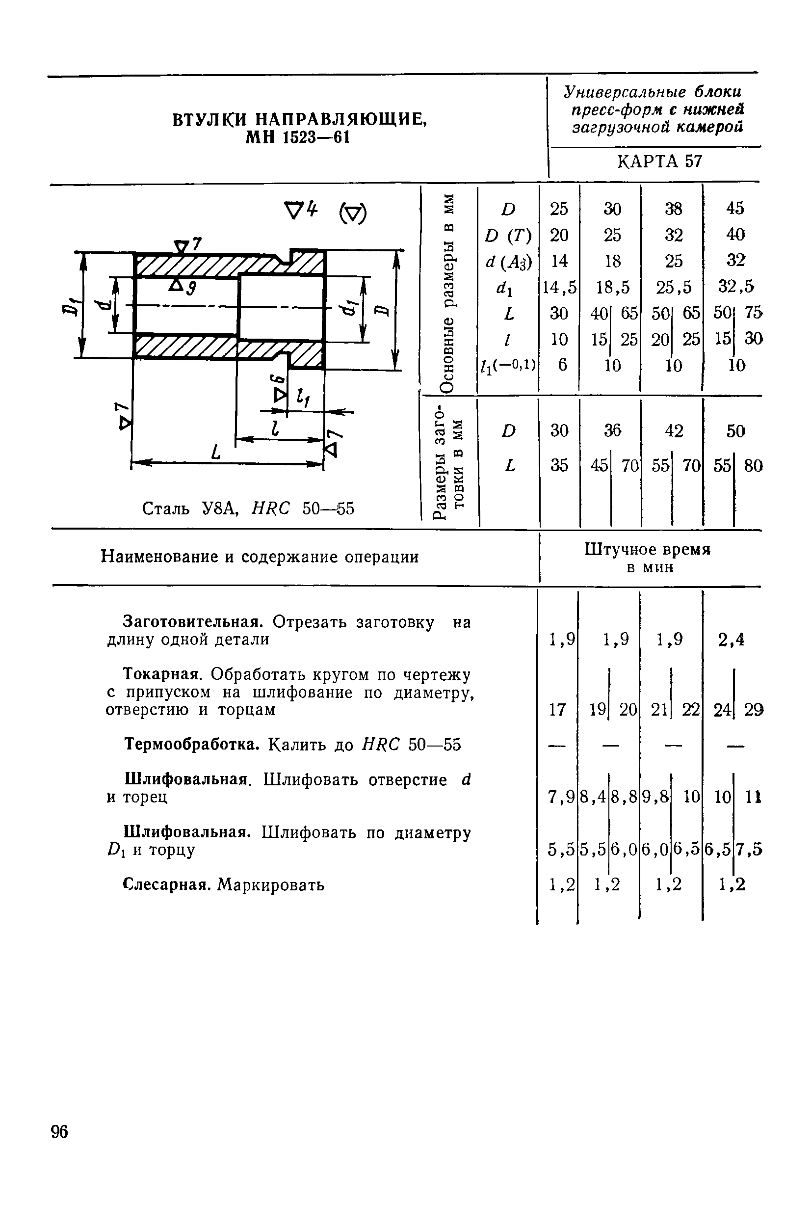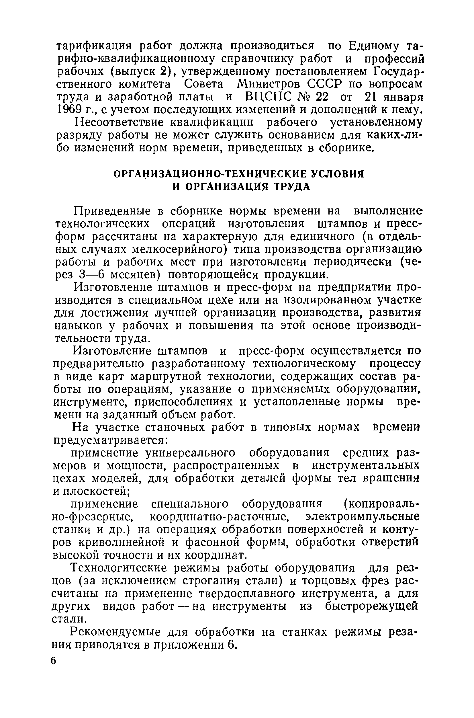 | Оглавление: | I. Типовые нормы времени на изготовление штампов II. Типовые нормы времени на изготовление пресс-форм Универсальные блоки пресс-форм с нижней загрузочной камерой Пакеты к блокам пресс-форм с нижней загрузочной камерой Пресс-формы съемные III. Нормативы неполного штучного времени и нормы времени на операции, не охваченные типовыми нормами времени IV. Подготовительно-заключительное время на партию Приложение 1. Штамп комбинированный, Трудоемкость изготовления Приложение 2. Пресс-формы для прессования изделий из реактопластов. Универсальные блоки с нижней загрузочной камерой, МН 1515-61. Трудоемкость изготовления Приложение 3. Пакеты к блокам пресс-форм с нижней загрузочной камерой, МН 1516-61 Приложение 4. Пресс-формы съемные круглые прямого прессования с двумя плоскостями разъема, МН 1452-61. Трудоемкость изготовления Приложение 5. Пресс-формы съемные прямоугольные литьевого прессования с двумя плоскостями разъема и двумя пуансонодержателями, МН 1461-61. Трудоемкость изготовления Приложение 6. Режимы резания, принятые при изготовлении штампов и пресс-форм Приложение 7. Припуски на механическую обработку Приложение 8. Перечень типовых моделей оборудования инструментального цеха штампов и пресс-форм Приложение 9. Теоретический вес заготовк |