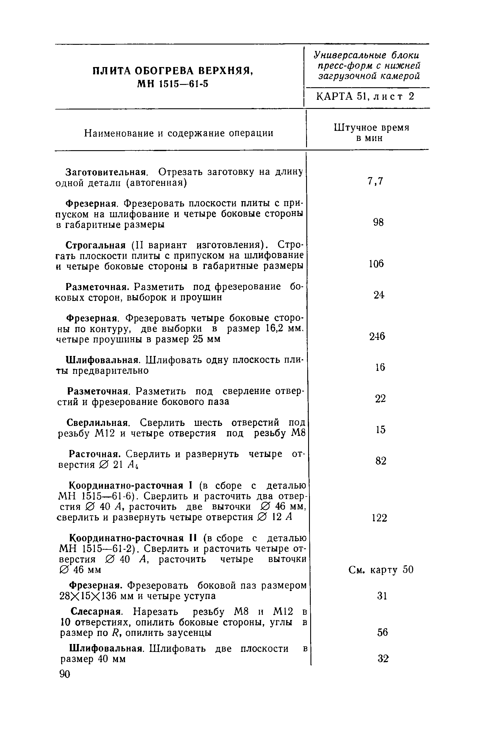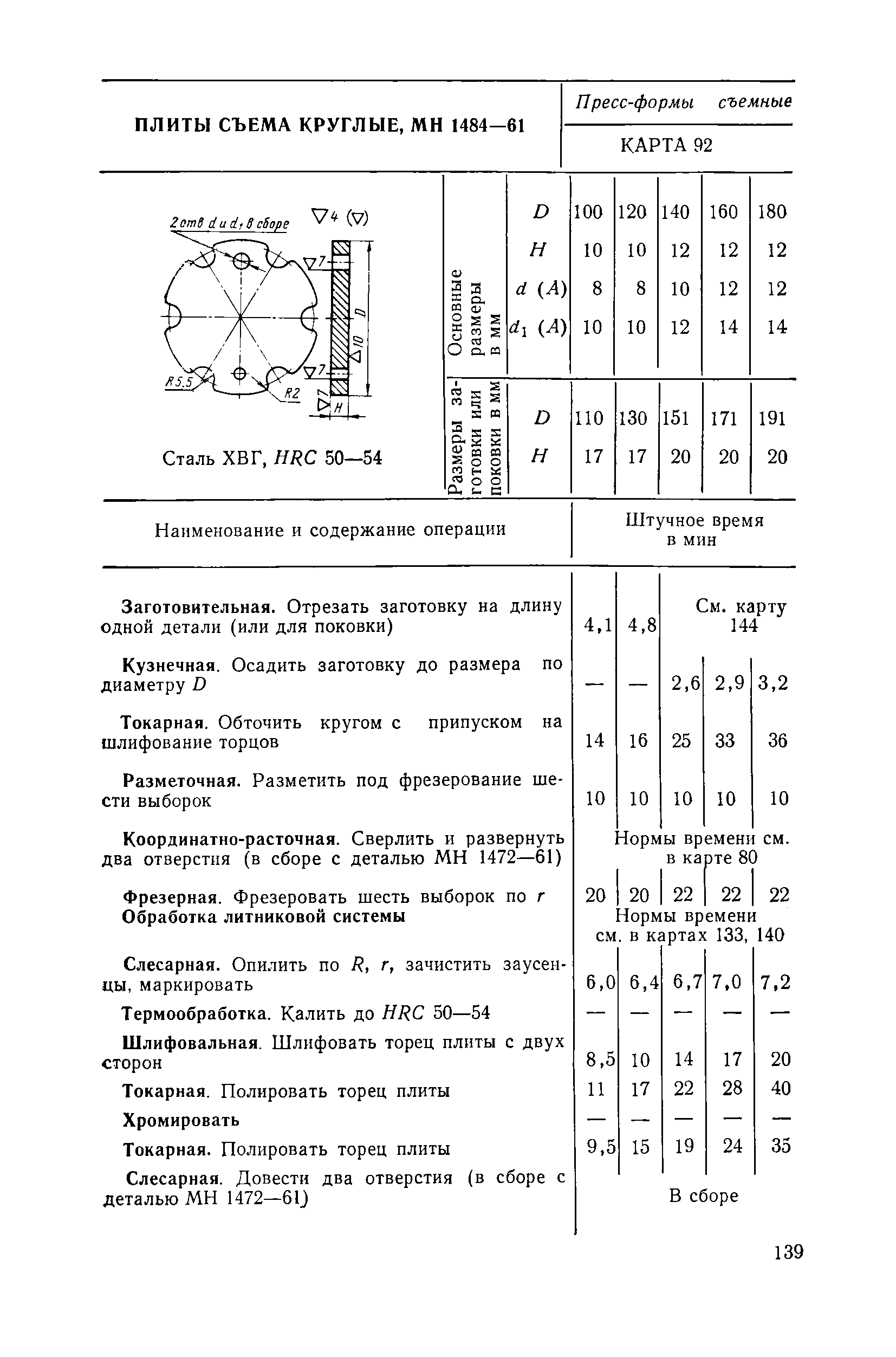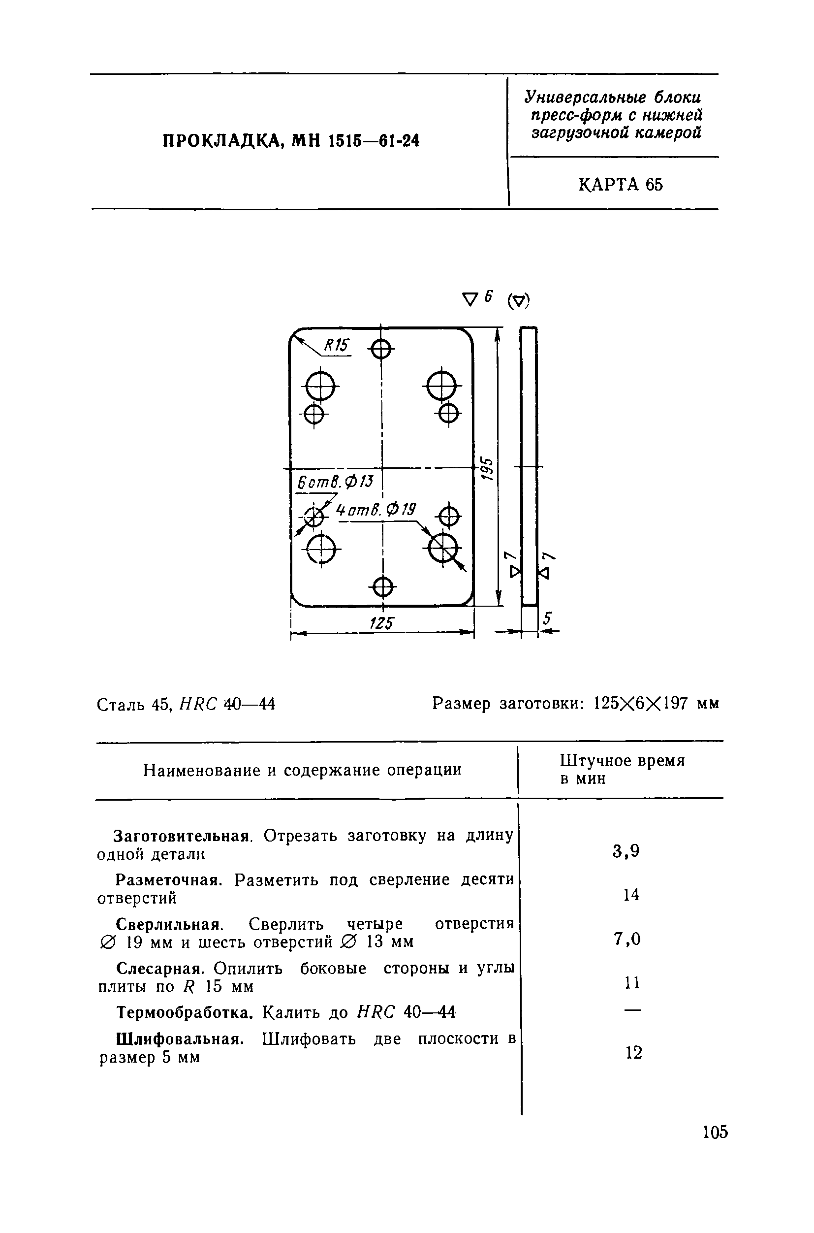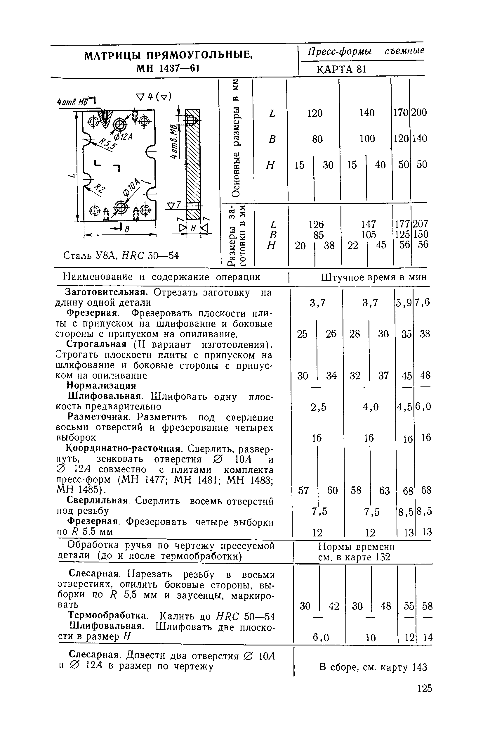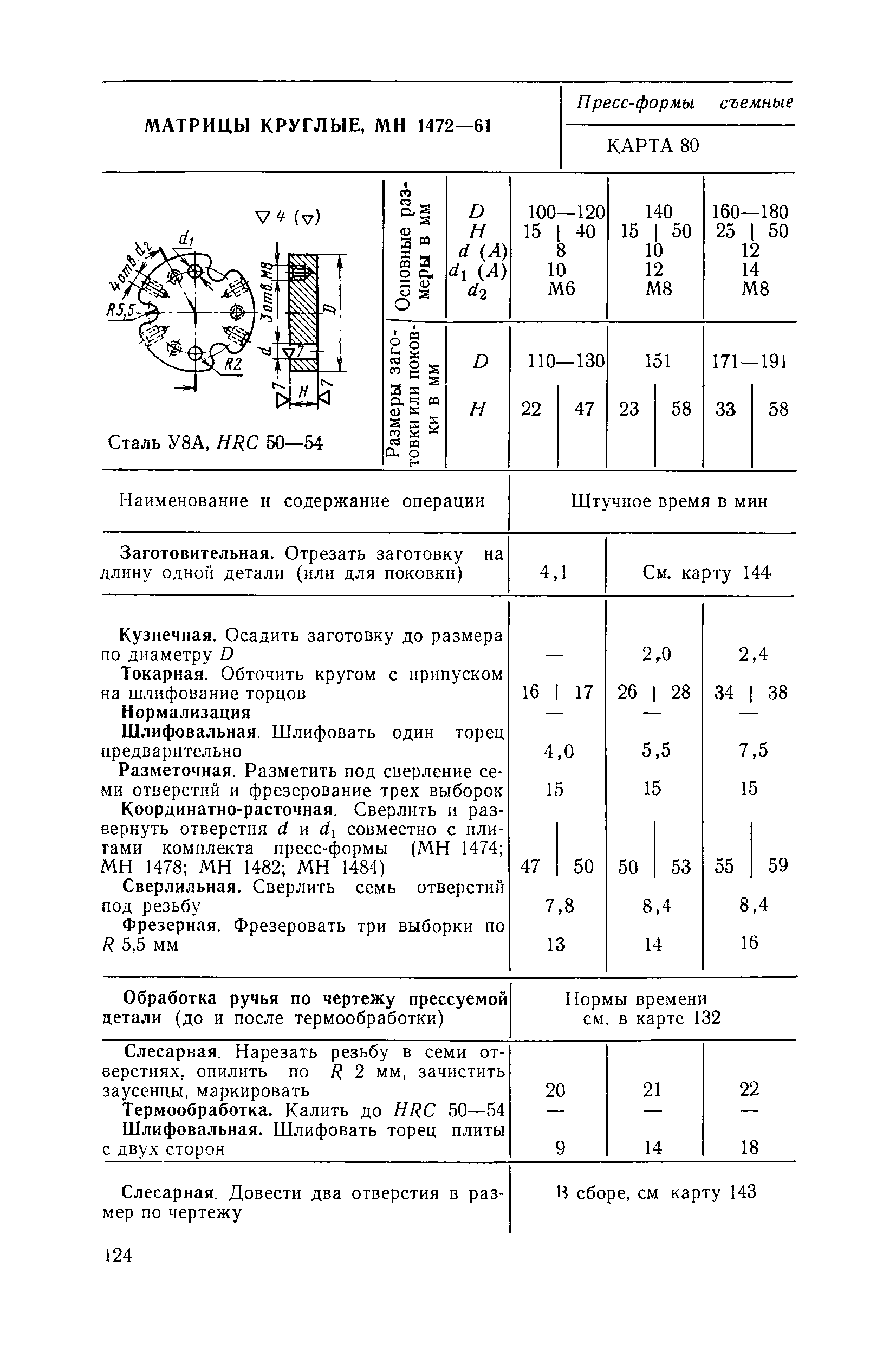 | Оглавление: | I. Типовые нормы времени на изготовление штампов II. Типовые нормы времени на изготовление пресс-форм Универсальные блоки пресс-форм с нижней загрузочной камерой Пакеты к блокам пресс-форм с нижней загрузочной камерой Пресс-формы съемные III. Нормативы неполного штучного времени и нормы времени на операции, не охваченные типовыми нормами времени IV. Подготовительно-заключительное время на партию Приложение 1. Штамп комбинированный, Трудоемкость изготовления Приложение 2. Пресс-формы для прессования изделий из реактопластов. Универсальные блоки с нижней загрузочной камерой, МН 1515-61. Трудоемкость изготовления Приложение 3. Пакеты к блокам пресс-форм с нижней загрузочной камерой, МН 1516-61 Приложение 4. Пресс-формы съемные круглые прямого прессования с двумя плоскостями разъема, МН 1452-61. Трудоемкость изготовления Приложение 5. Пресс-формы съемные прямоугольные литьевого прессования с двумя плоскостями разъема и двумя пуансонодержателями, МН 1461-61. Трудоемкость изготовления Приложение 6. Режимы резания, принятые при изготовлении штампов и пресс-форм Приложение 7. Припуски на механическую обработку Приложение 8. Перечень типовых моделей оборудования инструментального цеха штампов и пресс-форм Приложение 9. Теоретический вес заготовк |