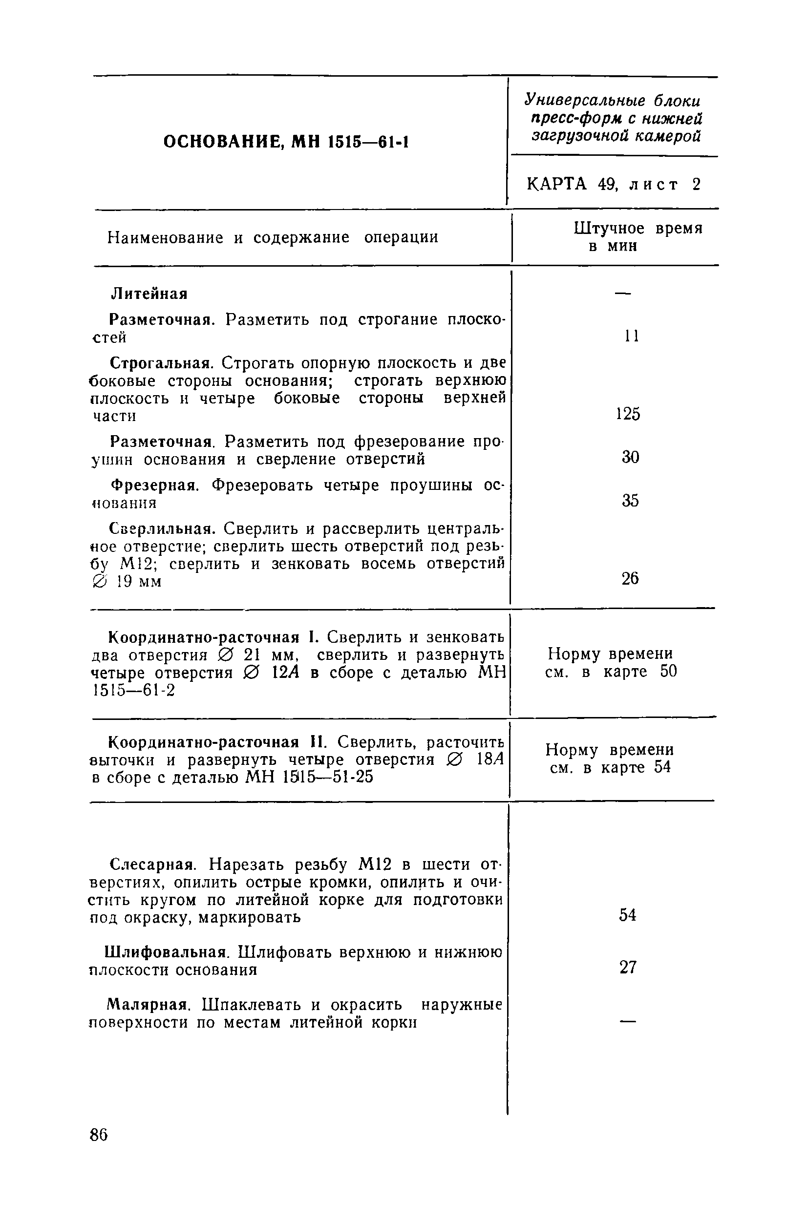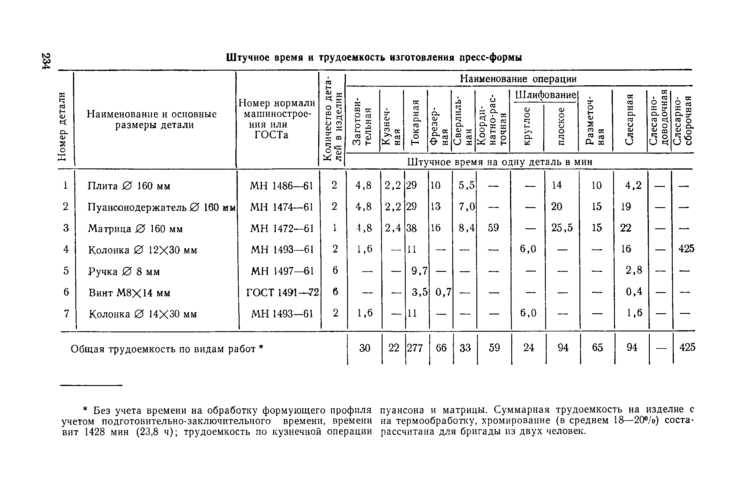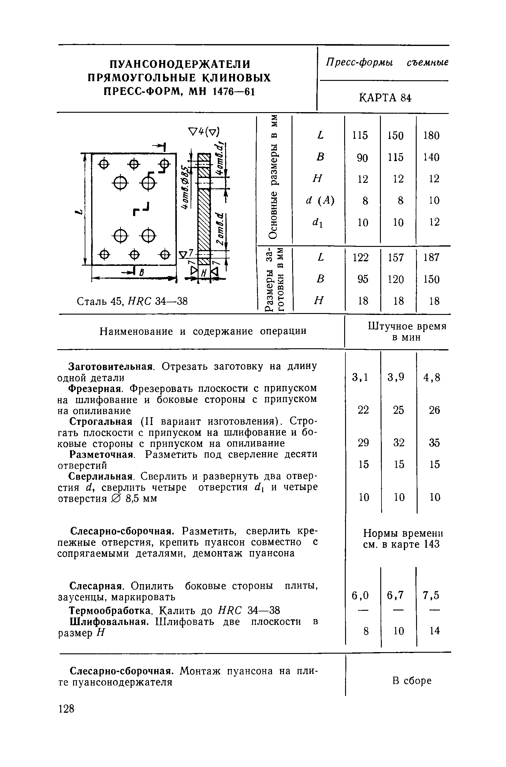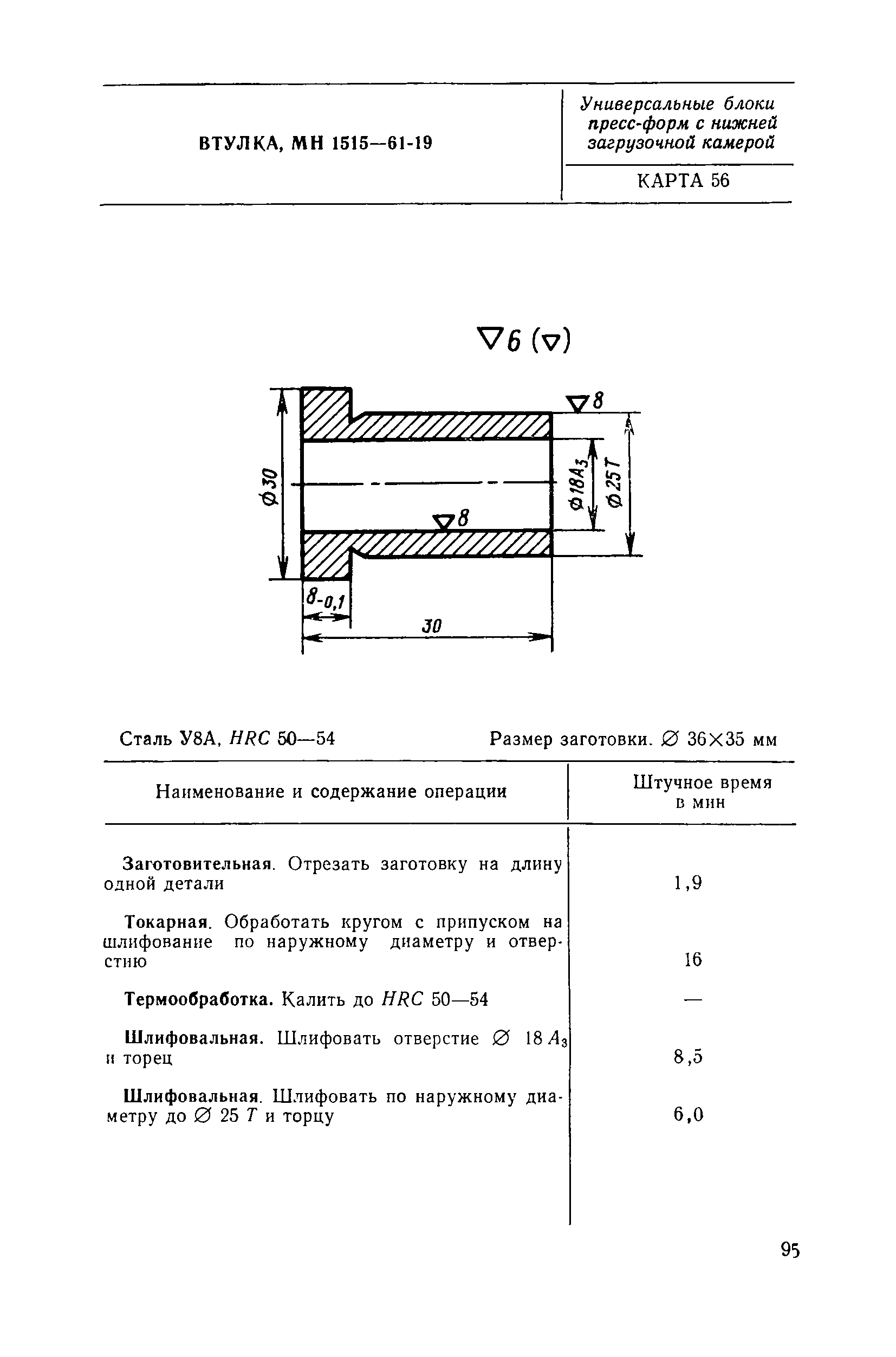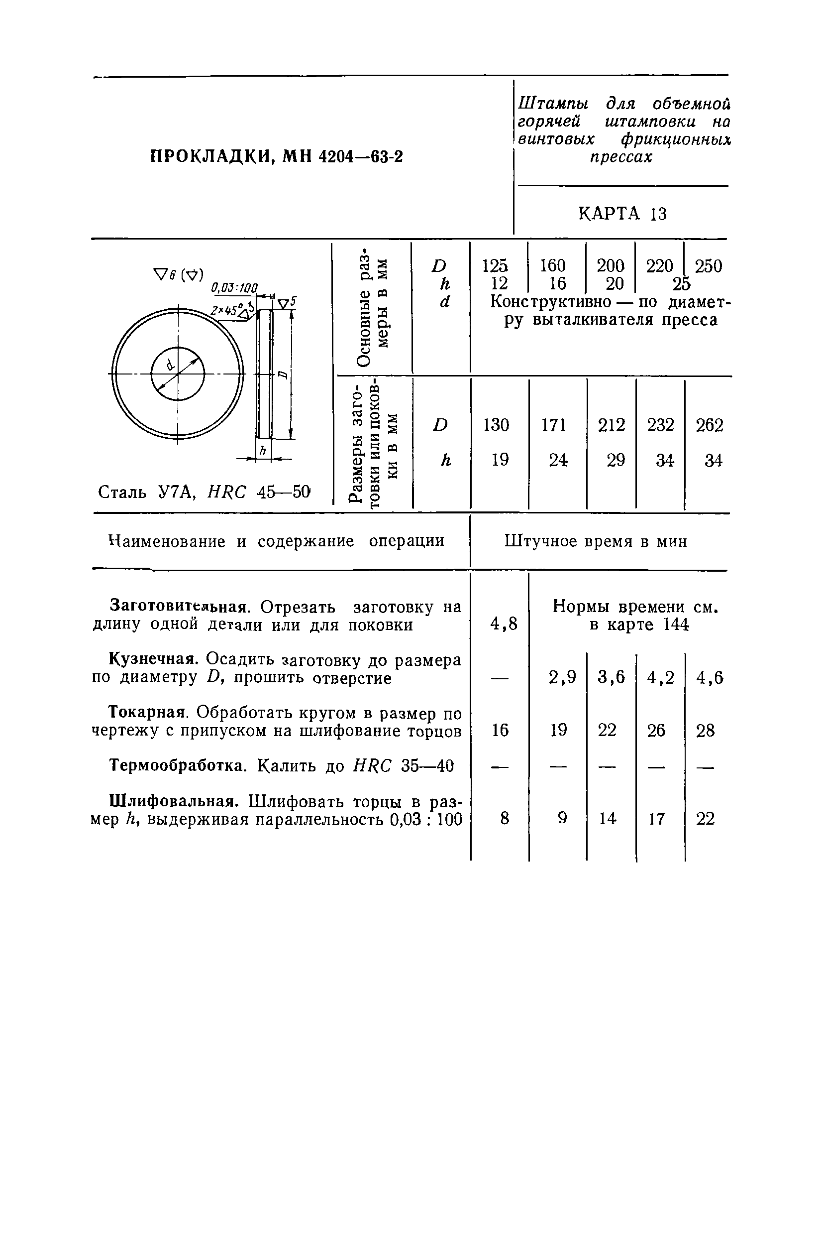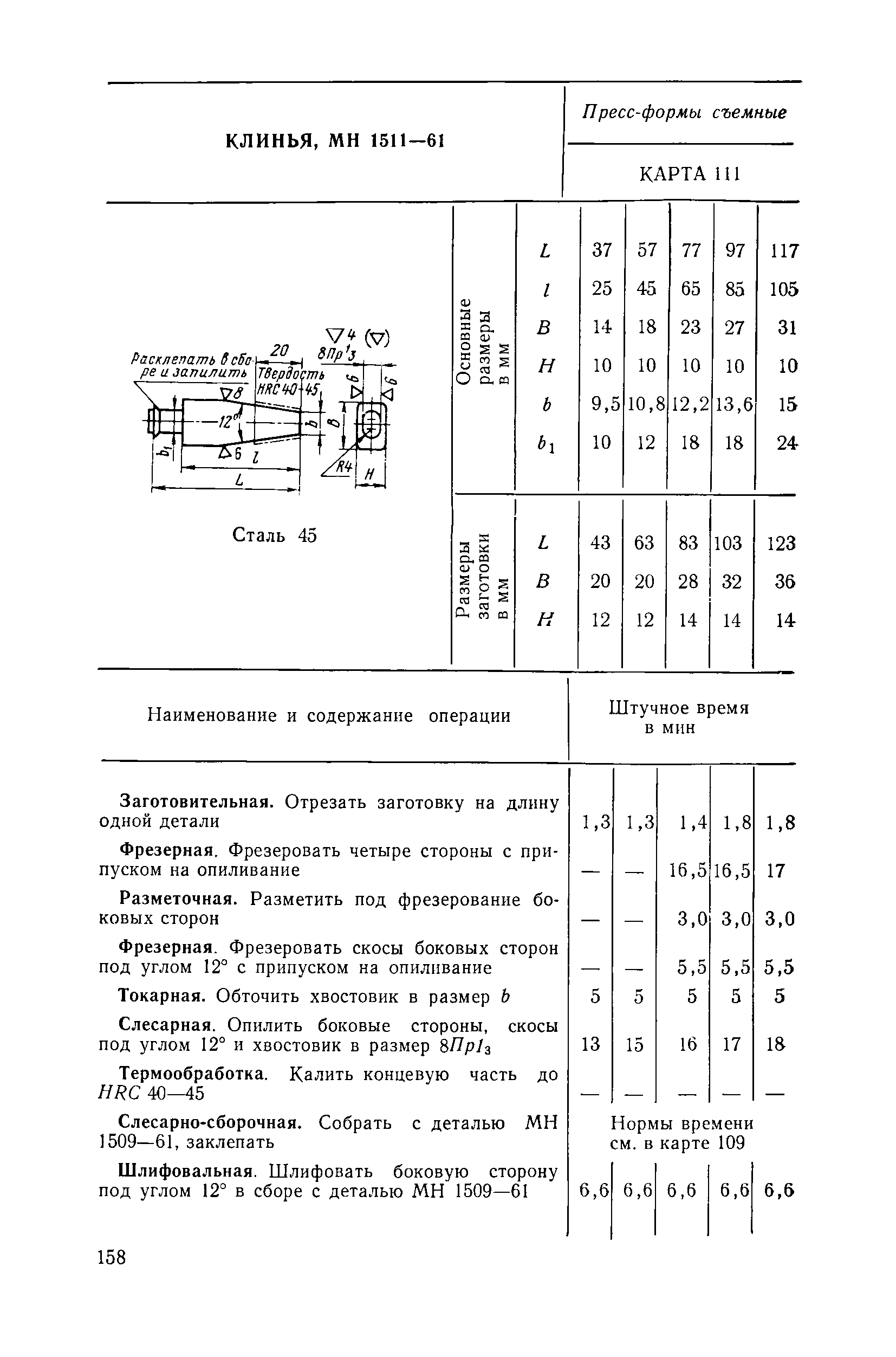 | Оглавление: | I. Типовые нормы времени на изготовление штампов II. Типовые нормы времени на изготовление пресс-форм Универсальные блоки пресс-форм с нижней загрузочной камерой Пакеты к блокам пресс-форм с нижней загрузочной камерой Пресс-формы съемные III. Нормативы неполного штучного времени и нормы времени на операции, не охваченные типовыми нормами времени IV. Подготовительно-заключительное время на партию Приложение 1. Штамп комбинированный, Трудоемкость изготовления Приложение 2. Пресс-формы для прессования изделий из реактопластов. Универсальные блоки с нижней загрузочной камерой, МН 1515-61. Трудоемкость изготовления Приложение 3. Пакеты к блокам пресс-форм с нижней загрузочной камерой, МН 1516-61 Приложение 4. Пресс-формы съемные круглые прямого прессования с двумя плоскостями разъема, МН 1452-61. Трудоемкость изготовления Приложение 5. Пресс-формы съемные прямоугольные литьевого прессования с двумя плоскостями разъема и двумя пуансонодержателями, МН 1461-61. Трудоемкость изготовления Приложение 6. Режимы резания, принятые при изготовлении штампов и пресс-форм Приложение 7. Припуски на механическую обработку Приложение 8. Перечень типовых моделей оборудования инструментального цеха штампов и пресс-форм Приложение 9. Теоретический вес заготовк |