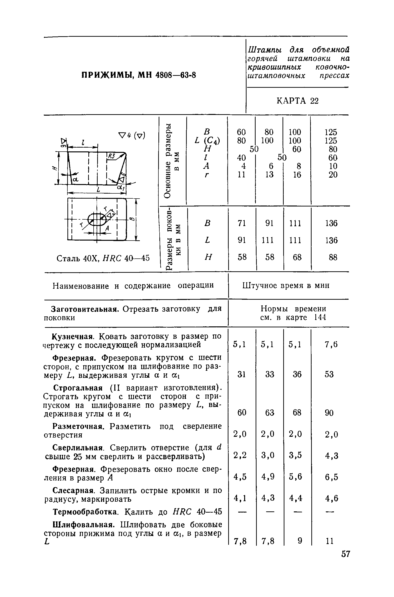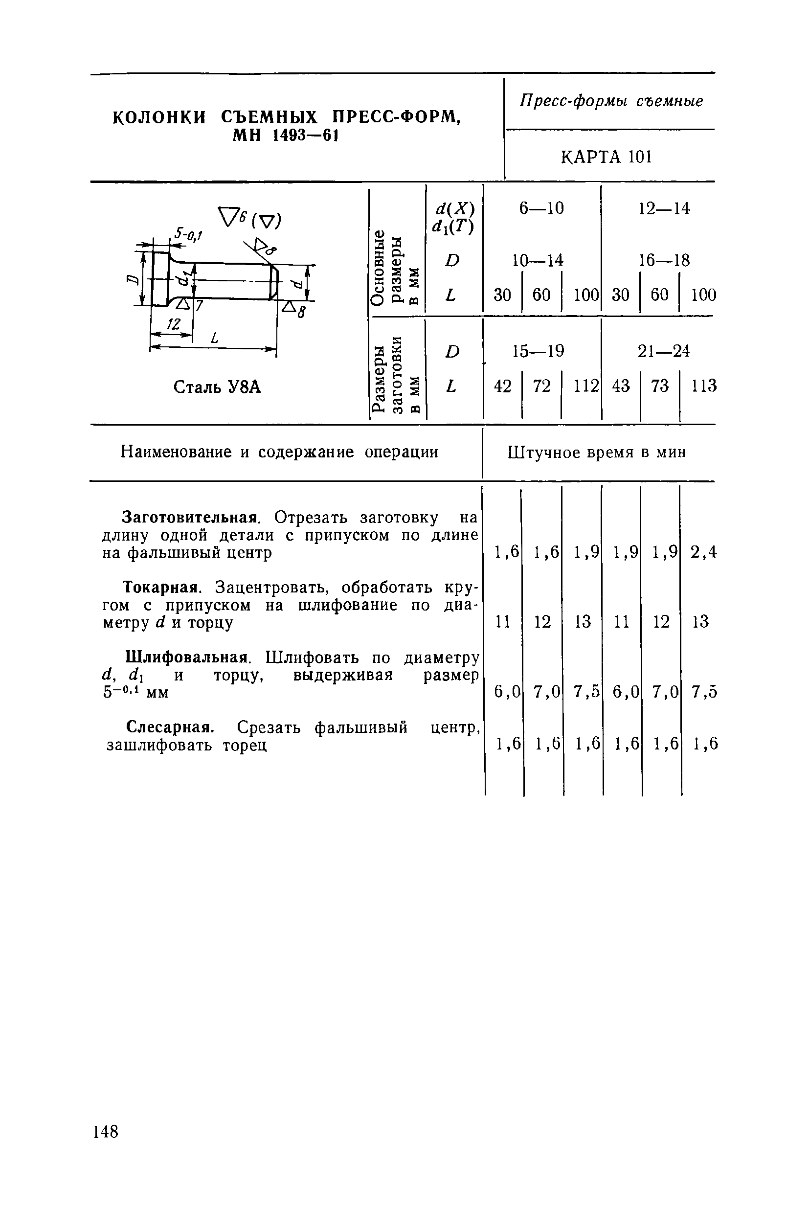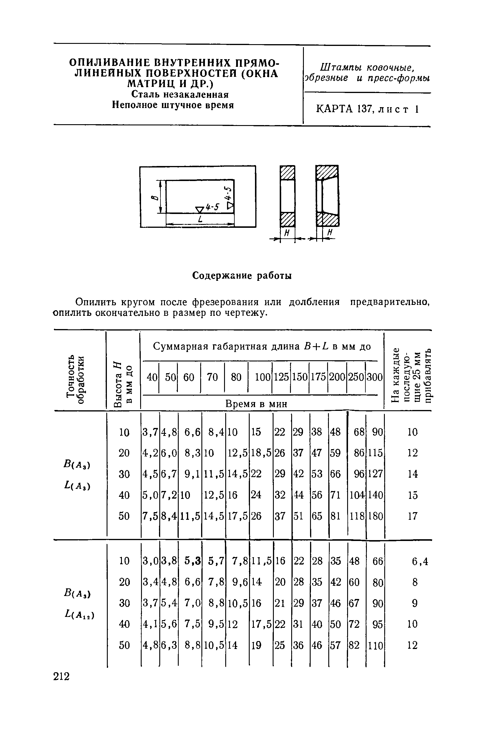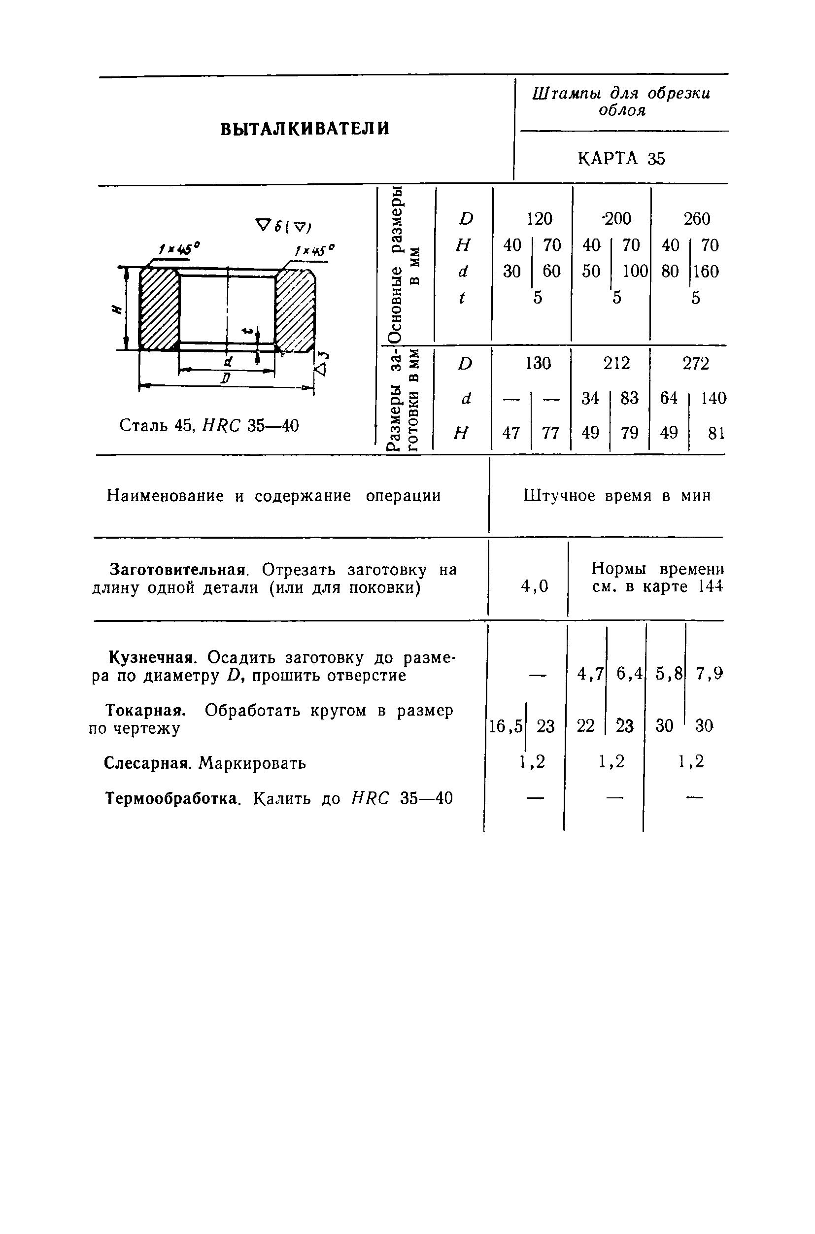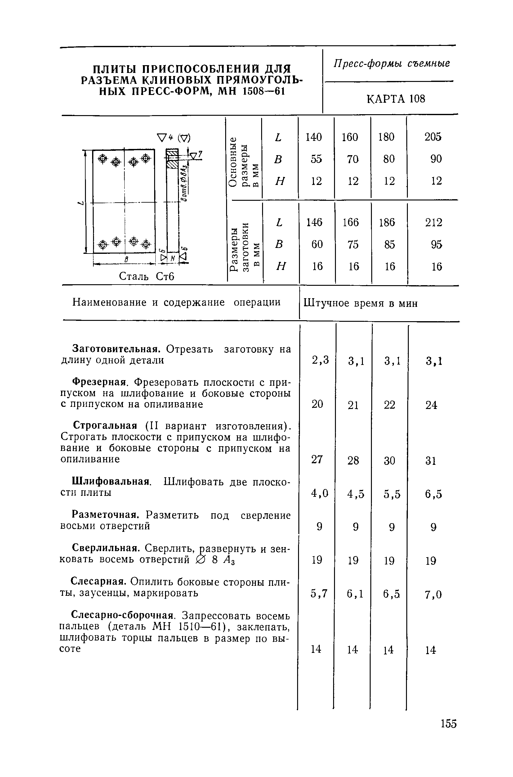 | Оглавление: | I. Типовые нормы времени на изготовление штампов II. Типовые нормы времени на изготовление пресс-форм Универсальные блоки пресс-форм с нижней загрузочной камерой Пакеты к блокам пресс-форм с нижней загрузочной камерой Пресс-формы съемные III. Нормативы неполного штучного времени и нормы времени на операции, не охваченные типовыми нормами времени IV. Подготовительно-заключительное время на партию Приложение 1. Штамп комбинированный, Трудоемкость изготовления Приложение 2. Пресс-формы для прессования изделий из реактопластов. Универсальные блоки с нижней загрузочной камерой, МН 1515-61. Трудоемкость изготовления Приложение 3. Пакеты к блокам пресс-форм с нижней загрузочной камерой, МН 1516-61 Приложение 4. Пресс-формы съемные круглые прямого прессования с двумя плоскостями разъема, МН 1452-61. Трудоемкость изготовления Приложение 5. Пресс-формы съемные прямоугольные литьевого прессования с двумя плоскостями разъема и двумя пуансонодержателями, МН 1461-61. Трудоемкость изготовления Приложение 6. Режимы резания, принятые при изготовлении штампов и пресс-форм Приложение 7. Припуски на механическую обработку Приложение 8. Перечень типовых моделей оборудования инструментального цеха штампов и пресс-форм Приложение 9. Теоретический вес заготовк |