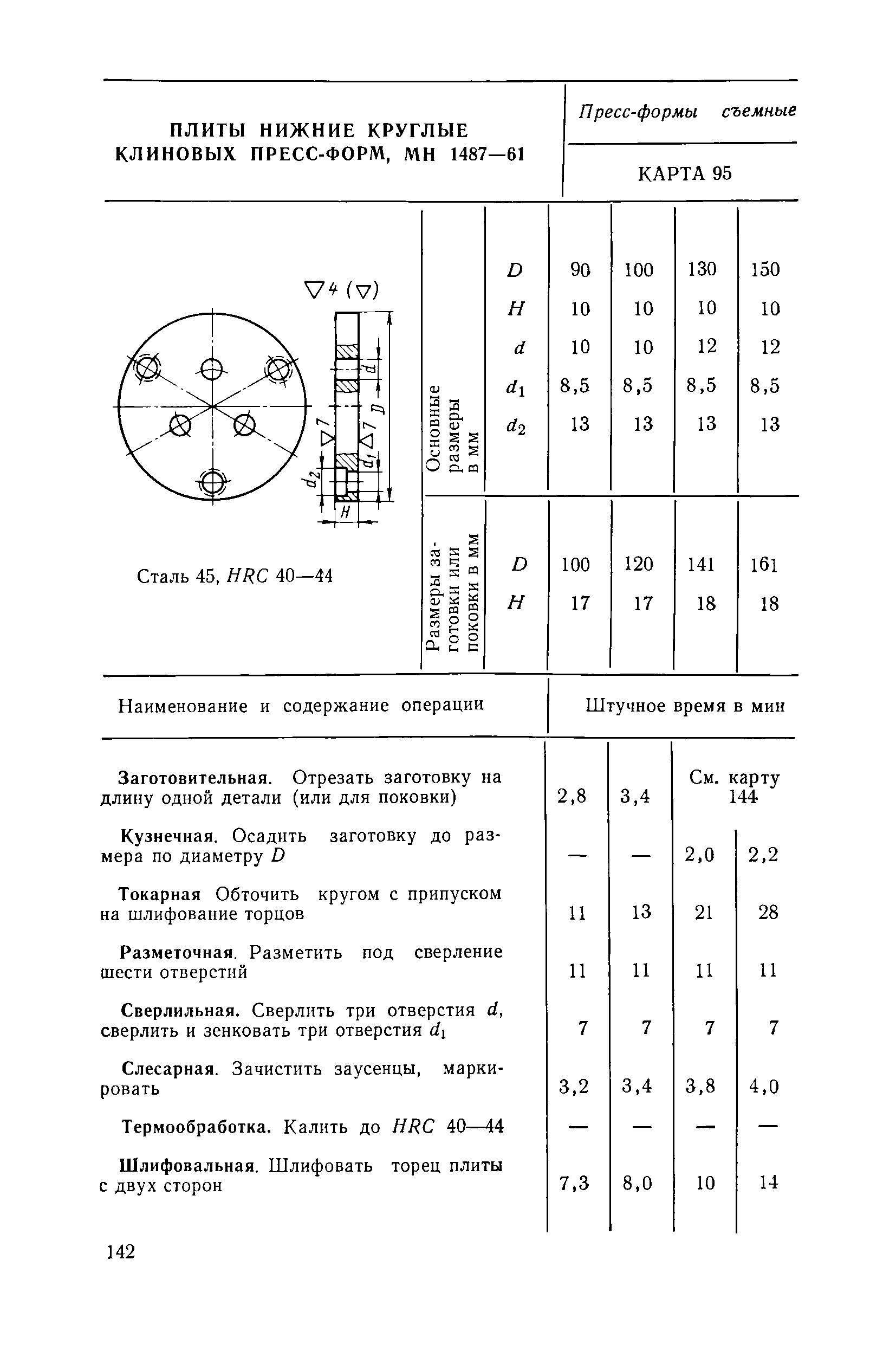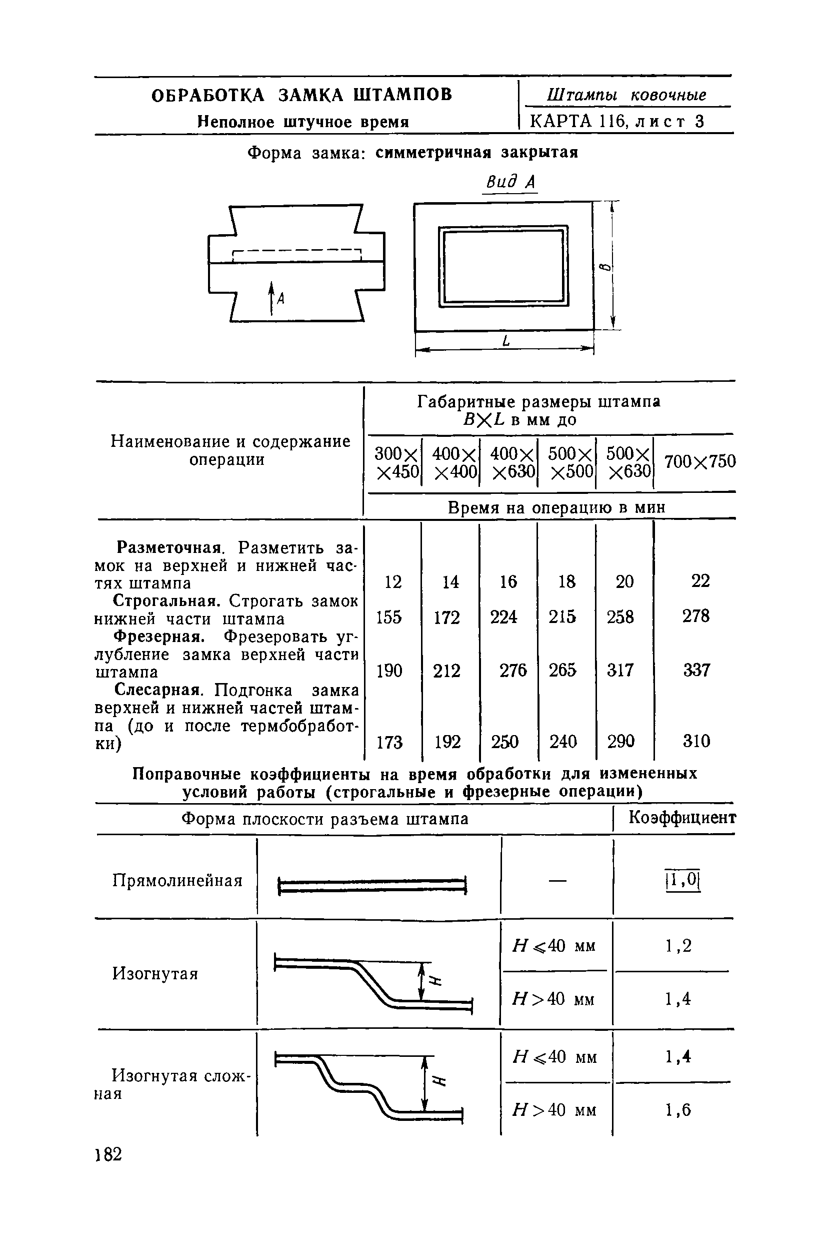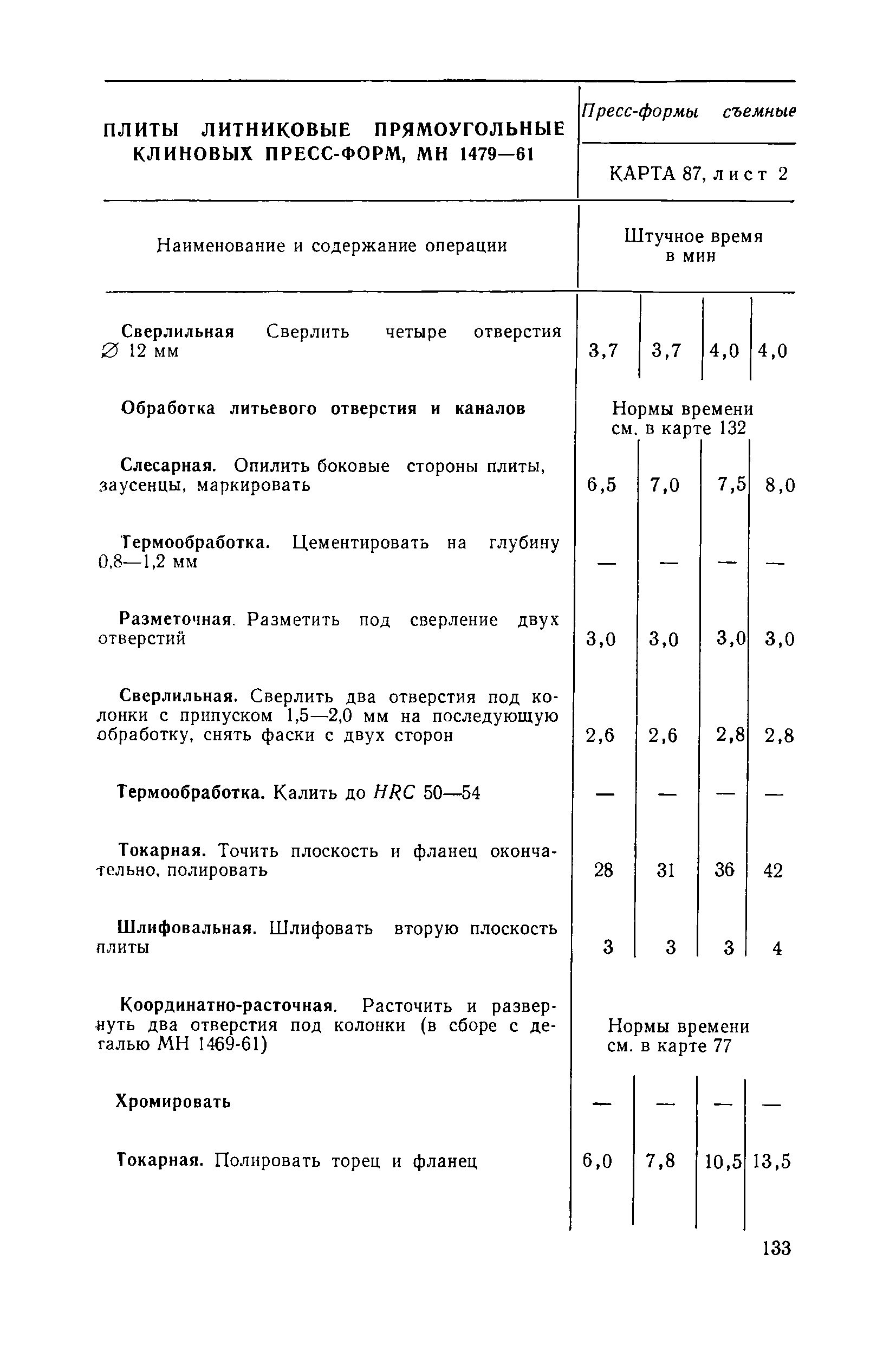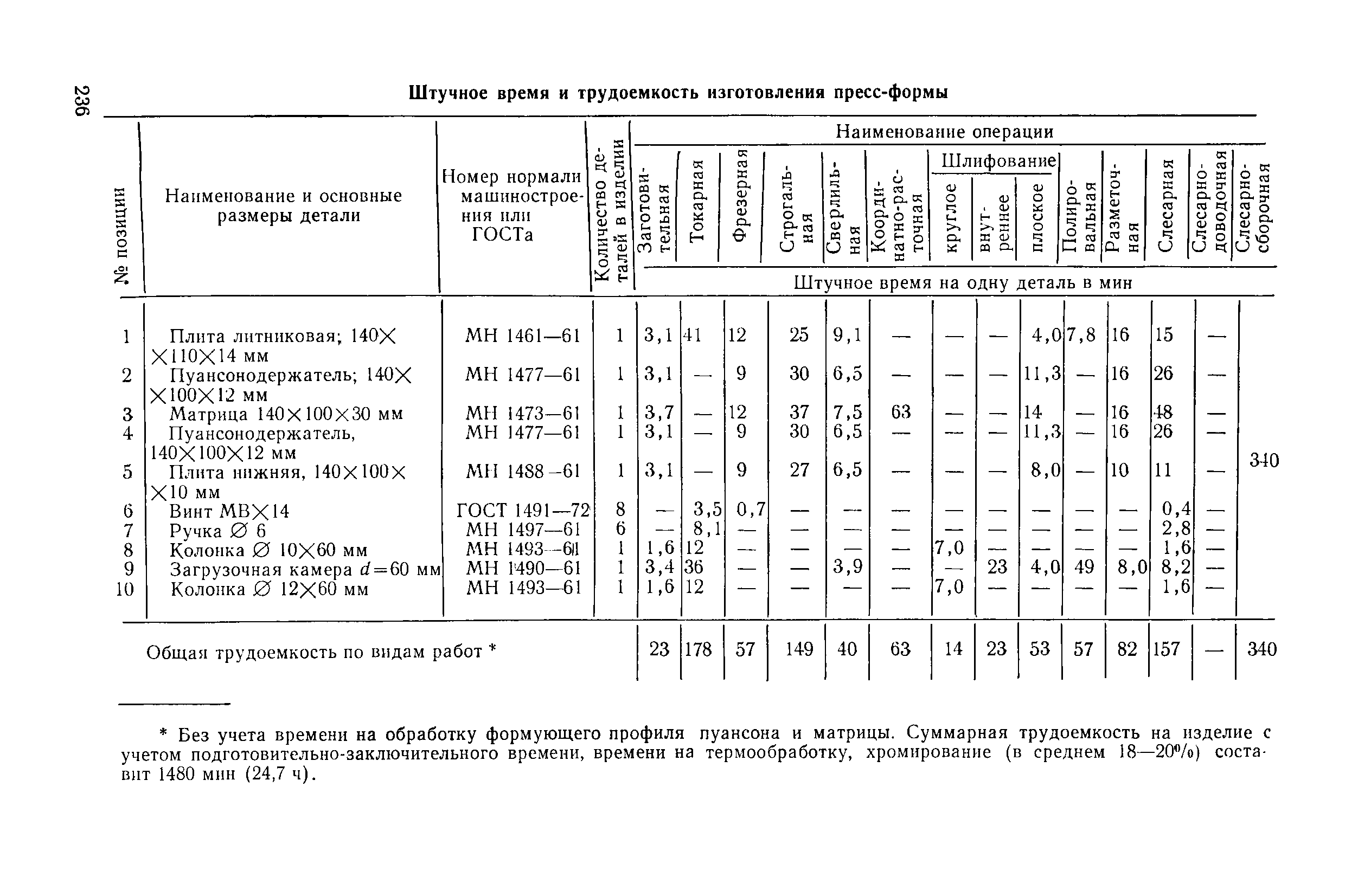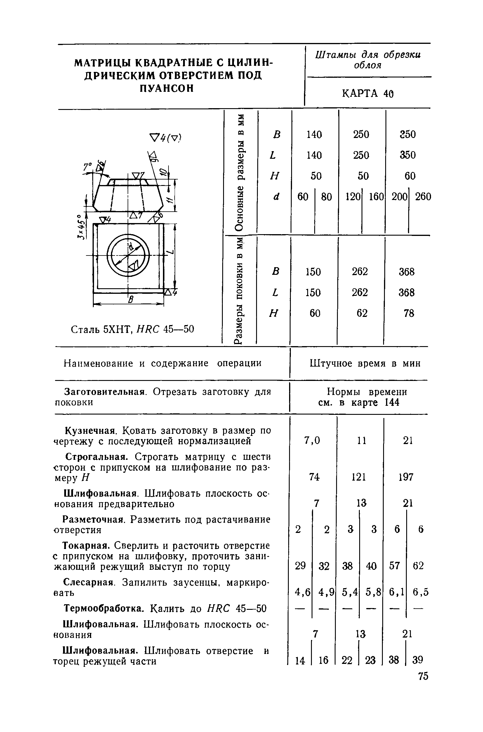 | Оглавление: | I. Типовые нормы времени на изготовление штампов II. Типовые нормы времени на изготовление пресс-форм Универсальные блоки пресс-форм с нижней загрузочной камерой Пакеты к блокам пресс-форм с нижней загрузочной камерой Пресс-формы съемные III. Нормативы неполного штучного времени и нормы времени на операции, не охваченные типовыми нормами времени IV. Подготовительно-заключительное время на партию Приложение 1. Штамп комбинированный, Трудоемкость изготовления Приложение 2. Пресс-формы для прессования изделий из реактопластов. Универсальные блоки с нижней загрузочной камерой, МН 1515-61. Трудоемкость изготовления Приложение 3. Пакеты к блокам пресс-форм с нижней загрузочной камерой, МН 1516-61 Приложение 4. Пресс-формы съемные круглые прямого прессования с двумя плоскостями разъема, МН 1452-61. Трудоемкость изготовления Приложение 5. Пресс-формы съемные прямоугольные литьевого прессования с двумя плоскостями разъема и двумя пуансонодержателями, МН 1461-61. Трудоемкость изготовления Приложение 6. Режимы резания, принятые при изготовлении штампов и пресс-форм Приложение 7. Припуски на механическую обработку Приложение 8. Перечень типовых моделей оборудования инструментального цеха штампов и пресс-форм Приложение 9. Теоретический вес заготовк |