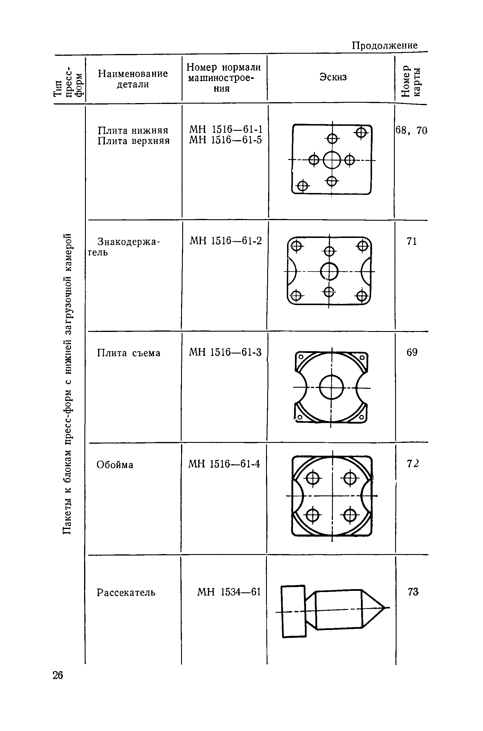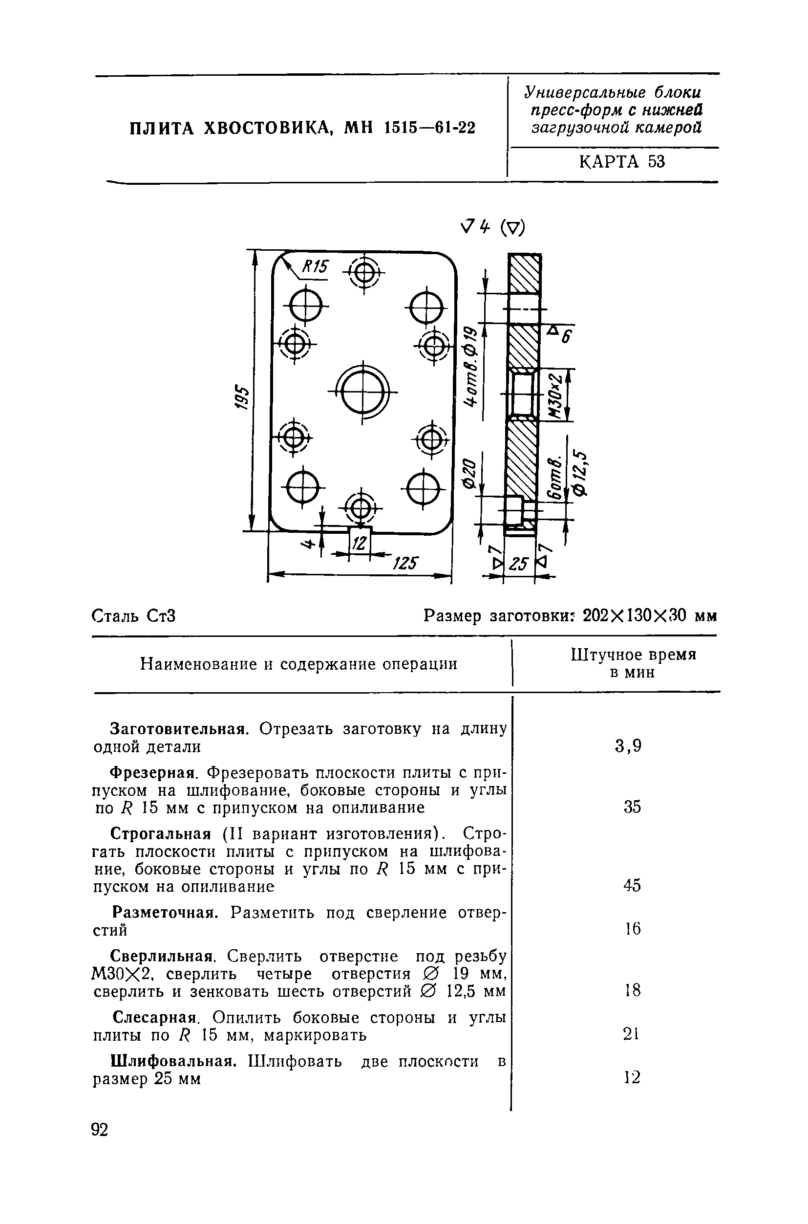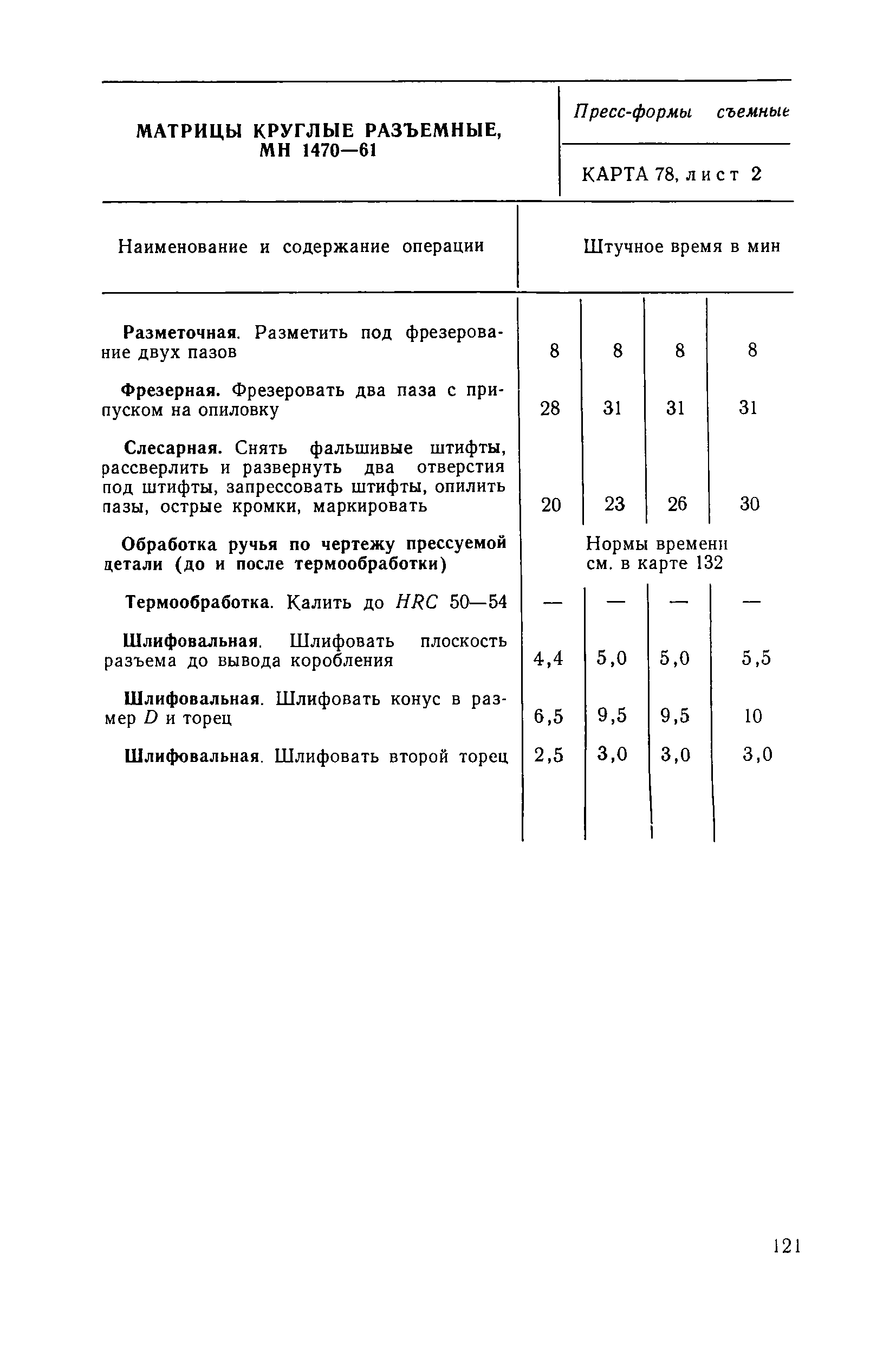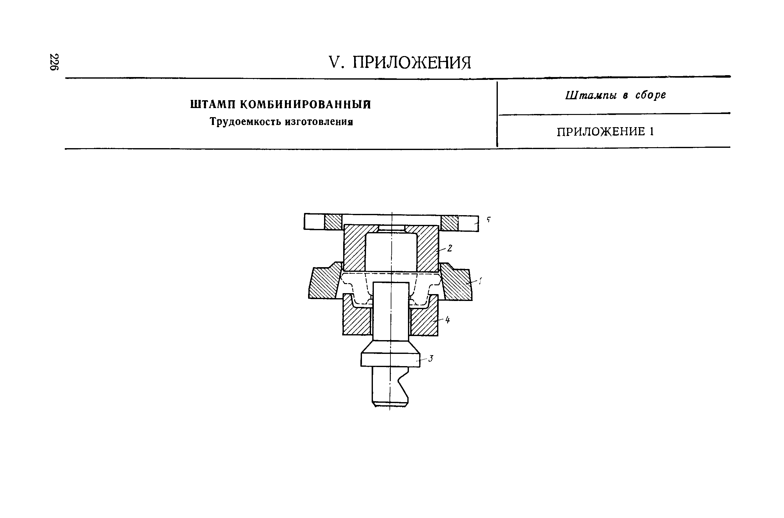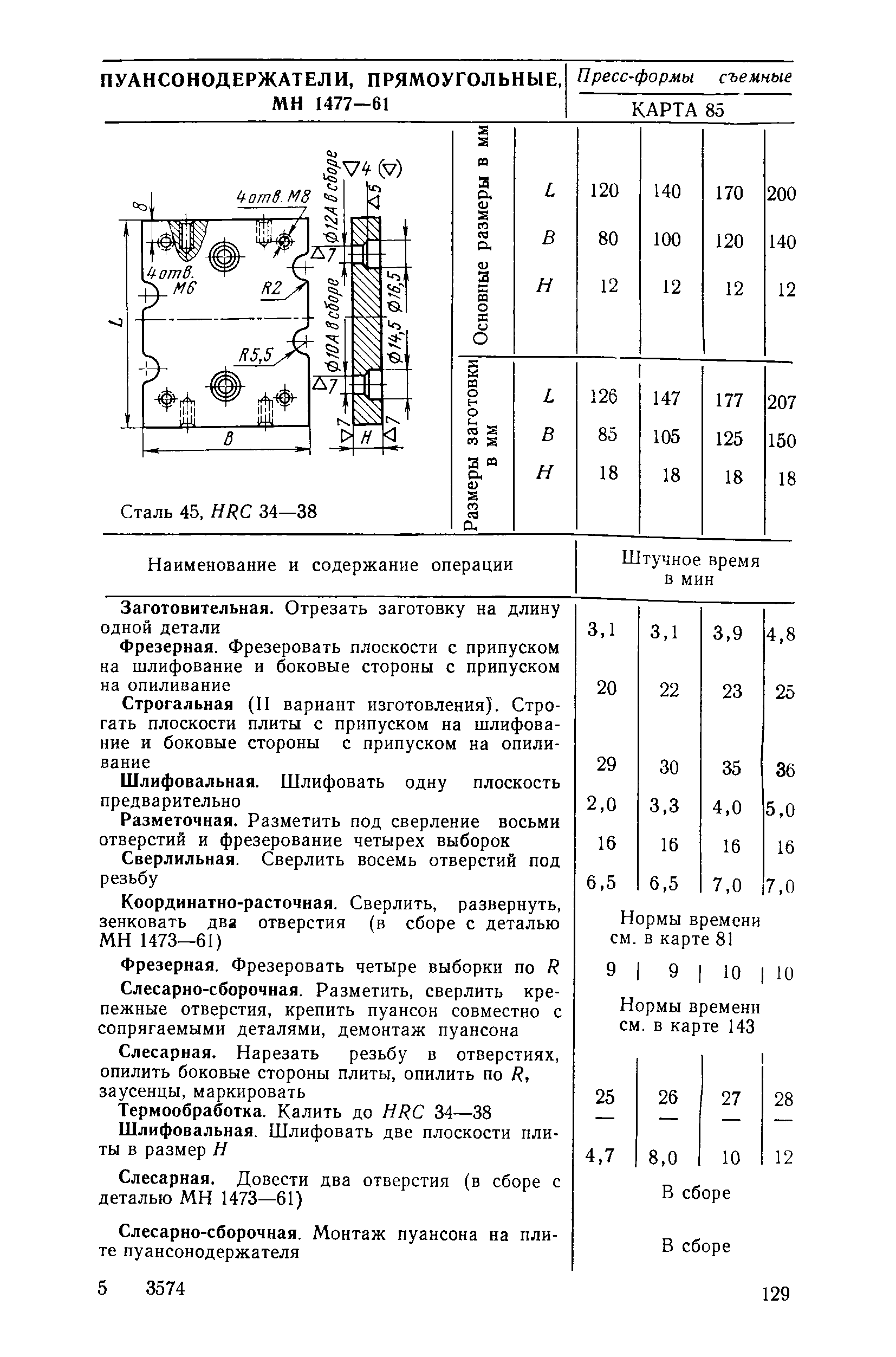 | Оглавление: | I. Типовые нормы времени на изготовление штампов II. Типовые нормы времени на изготовление пресс-форм Универсальные блоки пресс-форм с нижней загрузочной камерой Пакеты к блокам пресс-форм с нижней загрузочной камерой Пресс-формы съемные III. Нормативы неполного штучного времени и нормы времени на операции, не охваченные типовыми нормами времени IV. Подготовительно-заключительное время на партию Приложение 1. Штамп комбинированный, Трудоемкость изготовления Приложение 2. Пресс-формы для прессования изделий из реактопластов. Универсальные блоки с нижней загрузочной камерой, МН 1515-61. Трудоемкость изготовления Приложение 3. Пакеты к блокам пресс-форм с нижней загрузочной камерой, МН 1516-61 Приложение 4. Пресс-формы съемные круглые прямого прессования с двумя плоскостями разъема, МН 1452-61. Трудоемкость изготовления Приложение 5. Пресс-формы съемные прямоугольные литьевого прессования с двумя плоскостями разъема и двумя пуансонодержателями, МН 1461-61. Трудоемкость изготовления Приложение 6. Режимы резания, принятые при изготовлении штампов и пресс-форм Приложение 7. Припуски на механическую обработку Приложение 8. Перечень типовых моделей оборудования инструментального цеха штампов и пресс-форм Приложение 9. Теоретический вес заготовк |