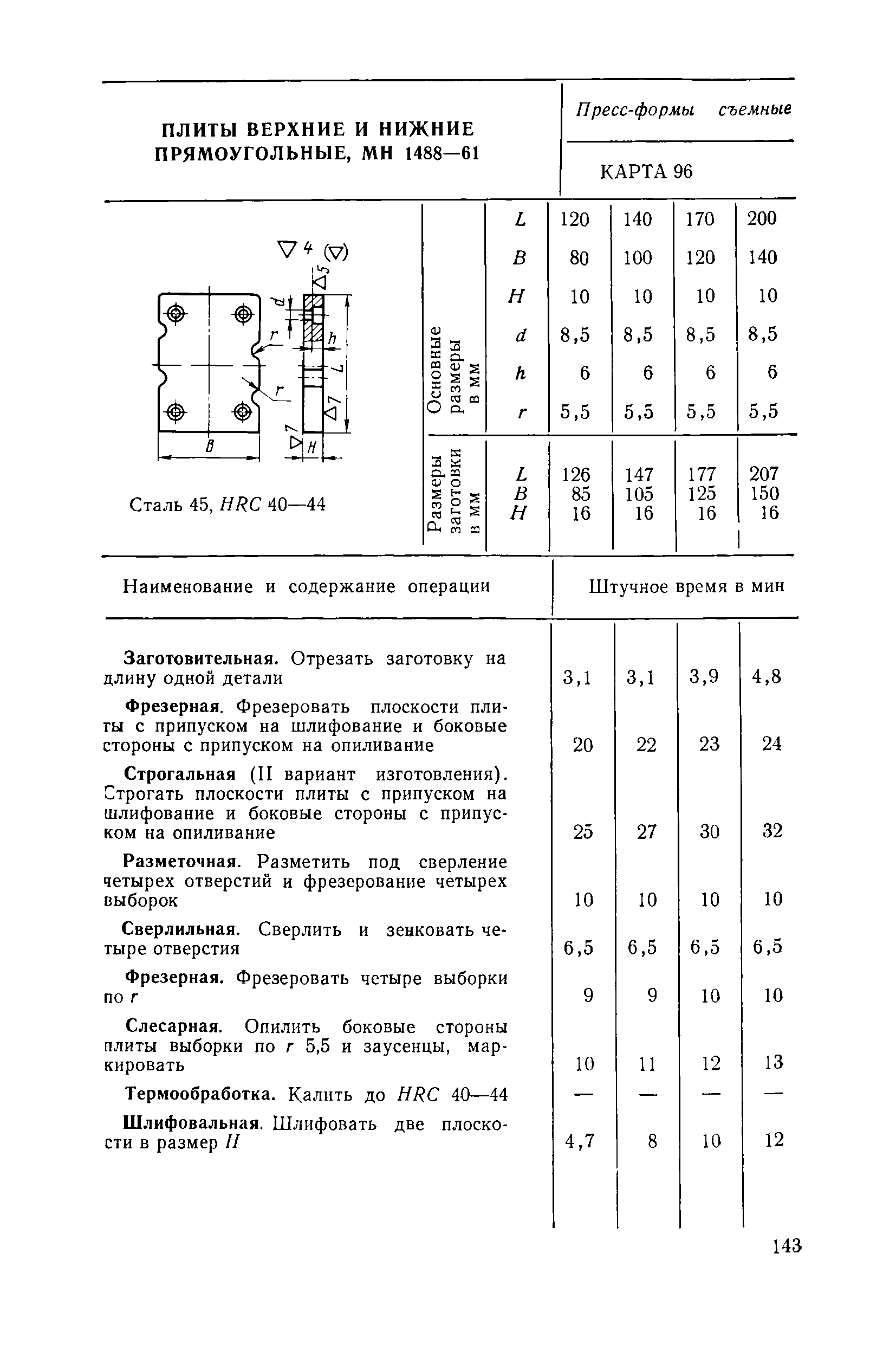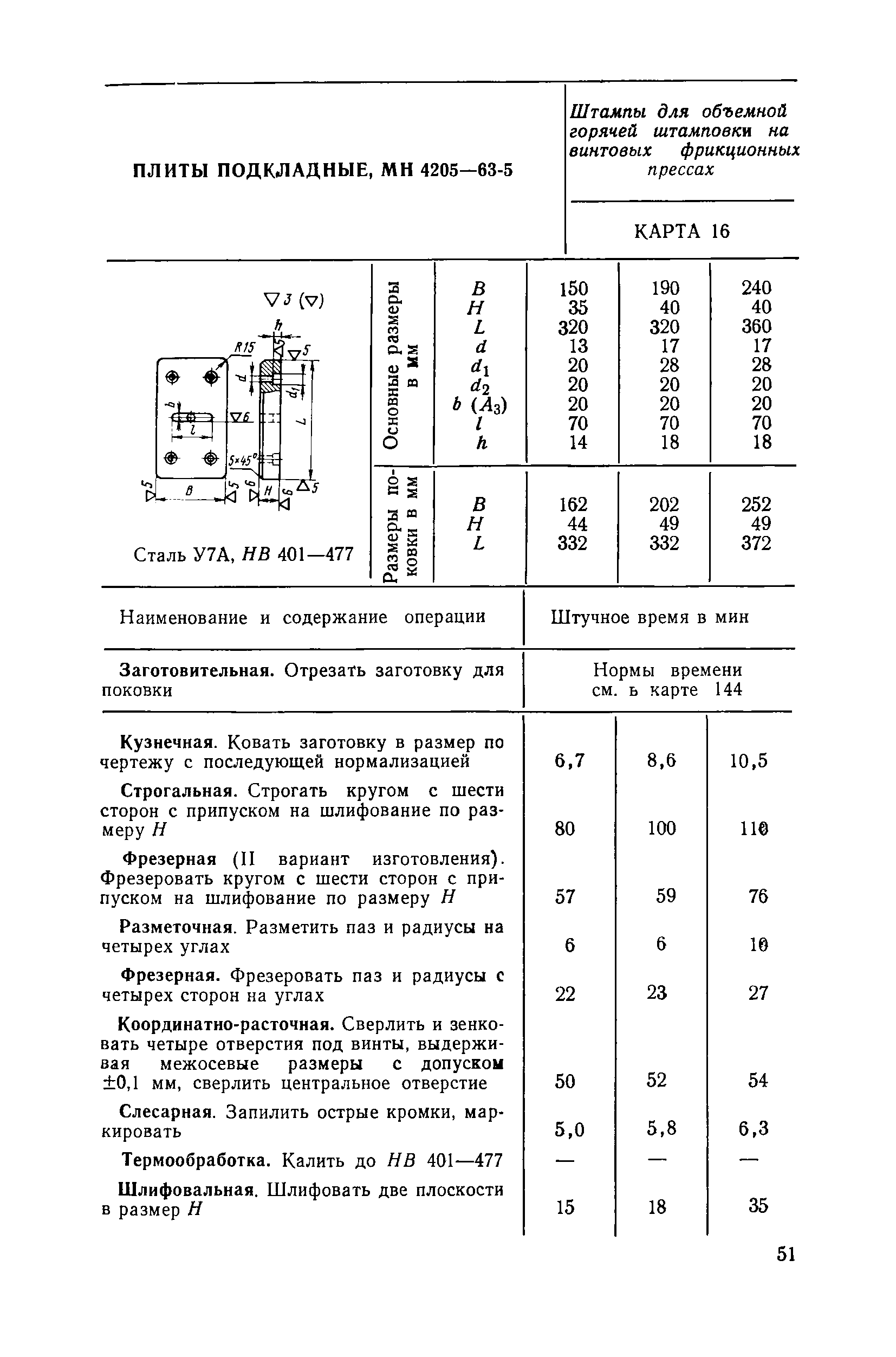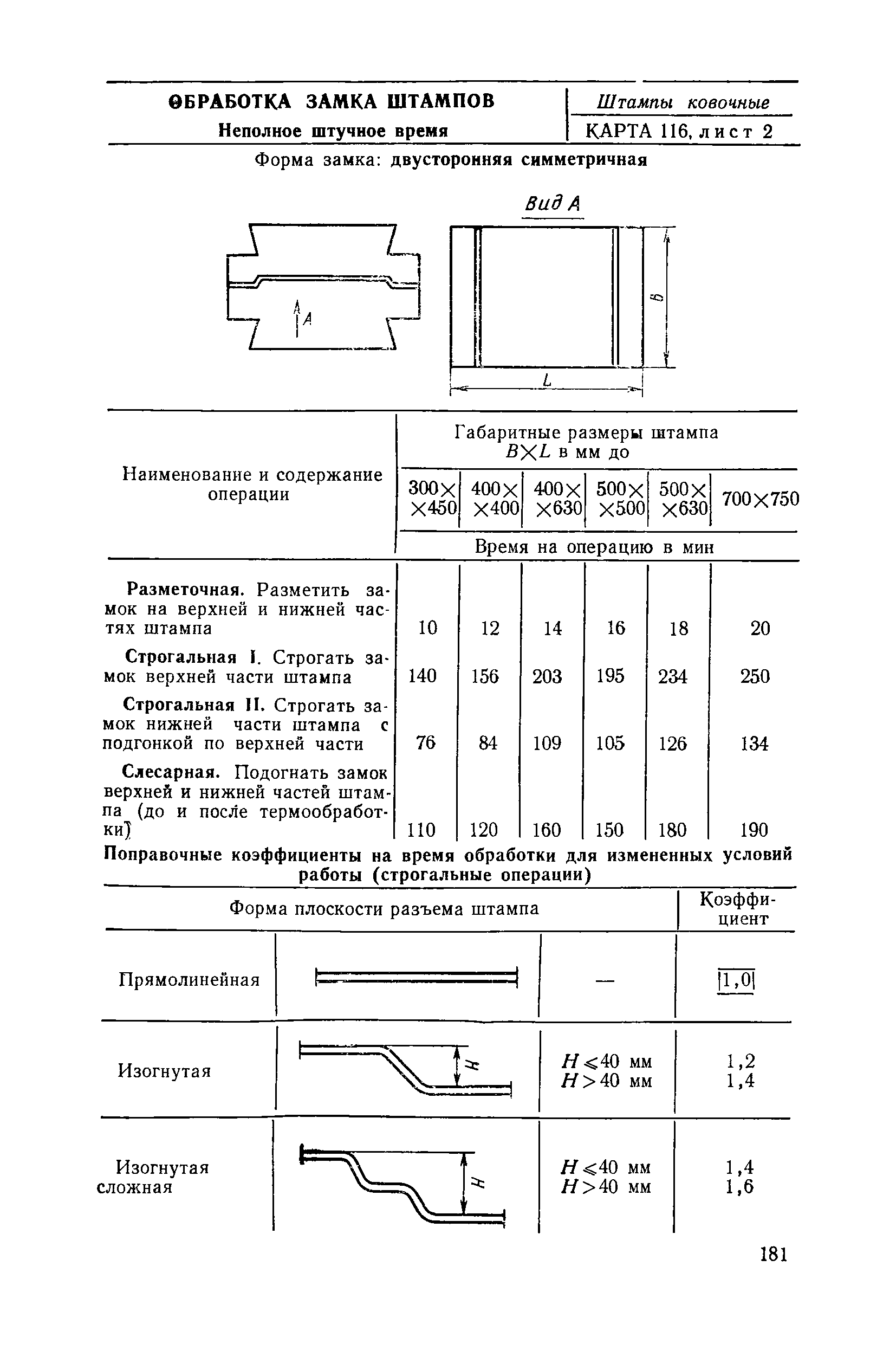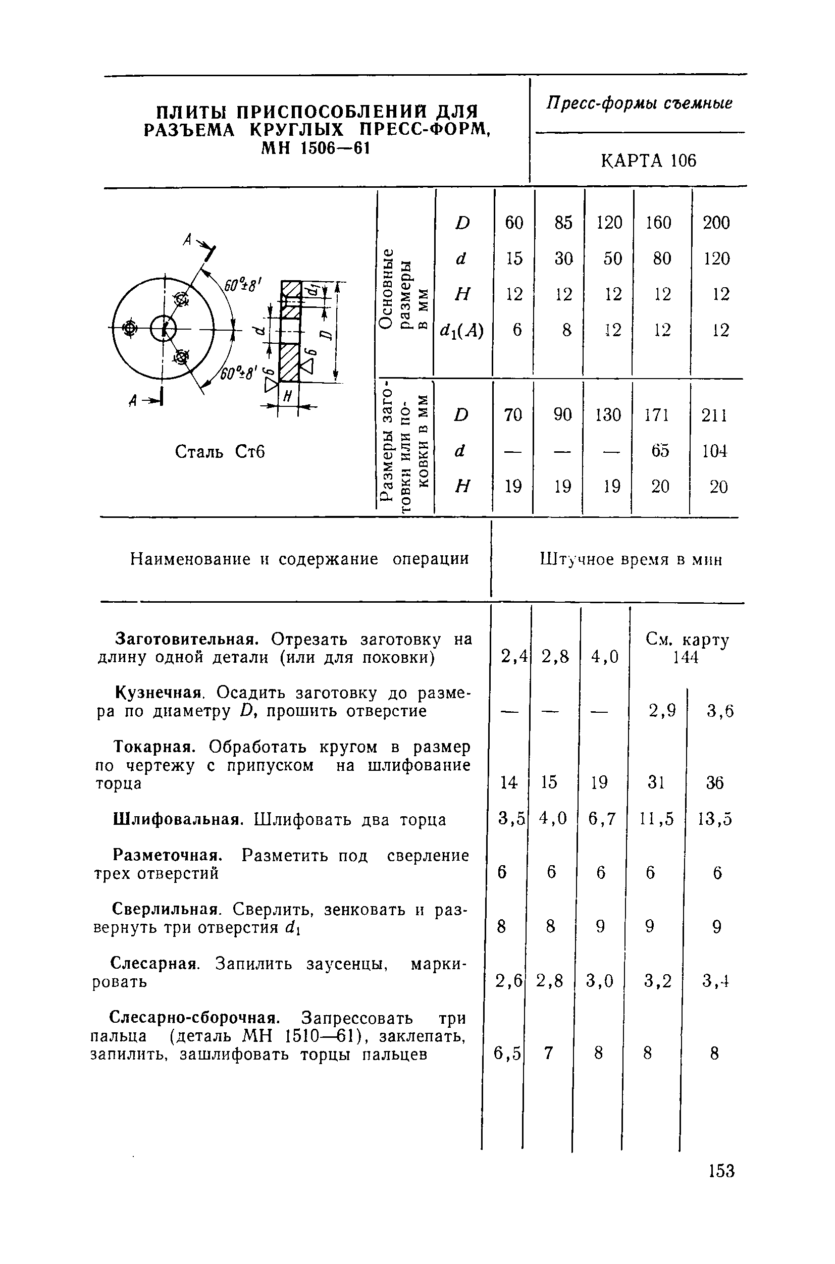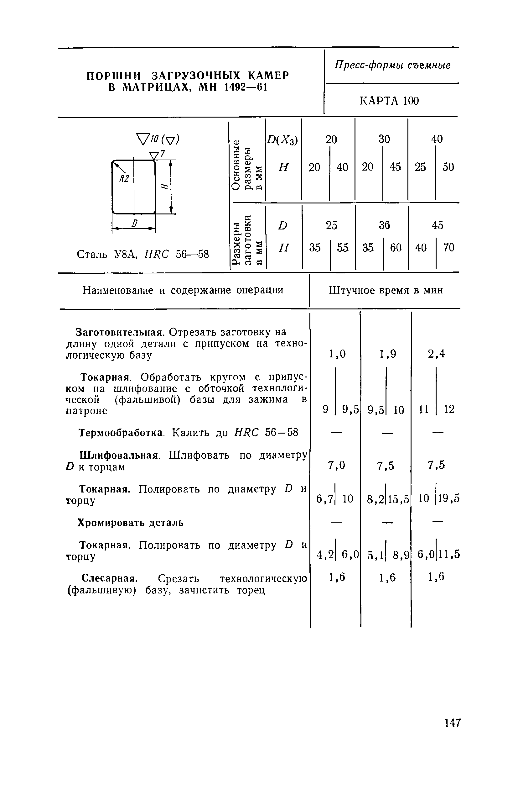 | Оглавление: | I. Типовые нормы времени на изготовление штампов II. Типовые нормы времени на изготовление пресс-форм Универсальные блоки пресс-форм с нижней загрузочной камерой Пакеты к блокам пресс-форм с нижней загрузочной камерой Пресс-формы съемные III. Нормативы неполного штучного времени и нормы времени на операции, не охваченные типовыми нормами времени IV. Подготовительно-заключительное время на партию Приложение 1. Штамп комбинированный, Трудоемкость изготовления Приложение 2. Пресс-формы для прессования изделий из реактопластов. Универсальные блоки с нижней загрузочной камерой, МН 1515-61. Трудоемкость изготовления Приложение 3. Пакеты к блокам пресс-форм с нижней загрузочной камерой, МН 1516-61 Приложение 4. Пресс-формы съемные круглые прямого прессования с двумя плоскостями разъема, МН 1452-61. Трудоемкость изготовления Приложение 5. Пресс-формы съемные прямоугольные литьевого прессования с двумя плоскостями разъема и двумя пуансонодержателями, МН 1461-61. Трудоемкость изготовления Приложение 6. Режимы резания, принятые при изготовлении штампов и пресс-форм Приложение 7. Припуски на механическую обработку Приложение 8. Перечень типовых моделей оборудования инструментального цеха штампов и пресс-форм Приложение 9. Теоретический вес заготовк |