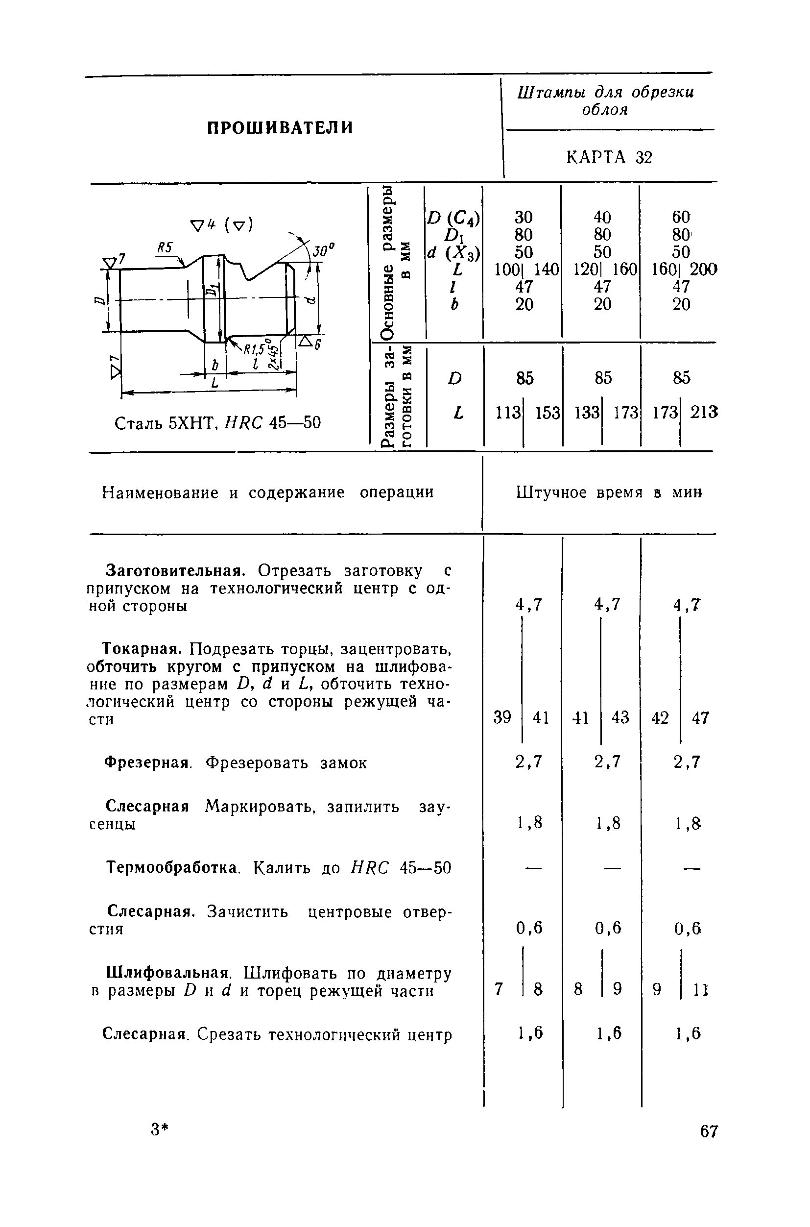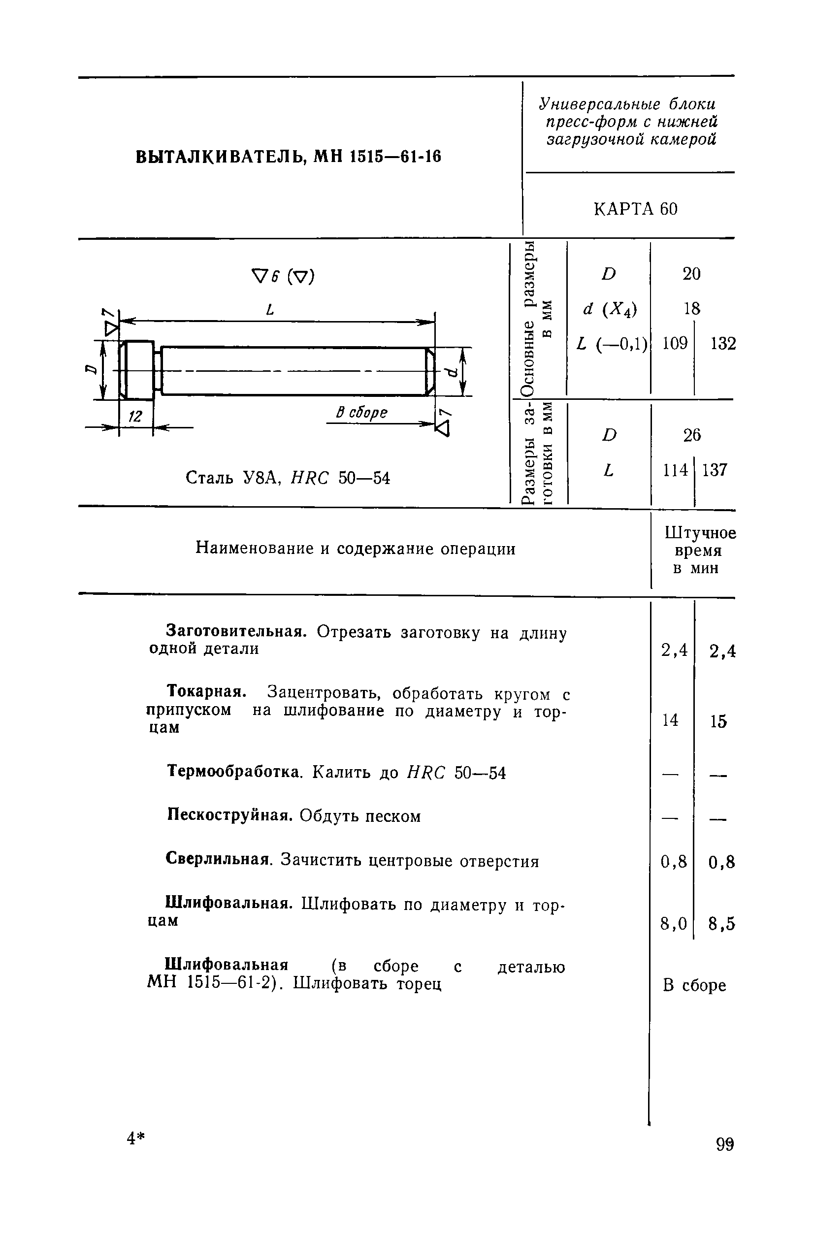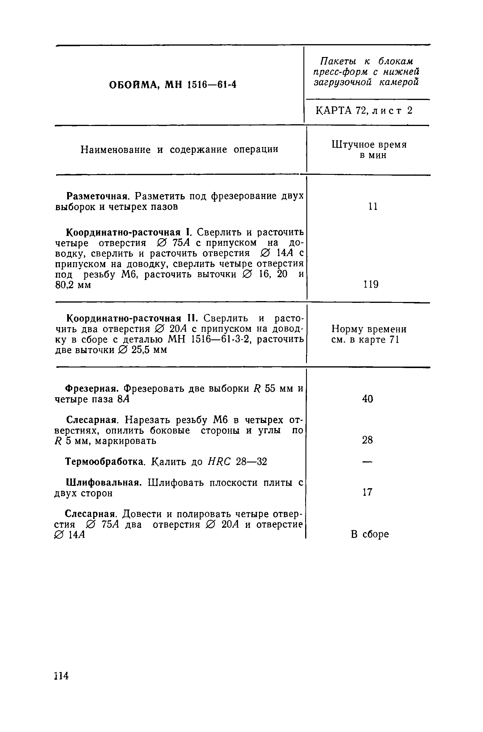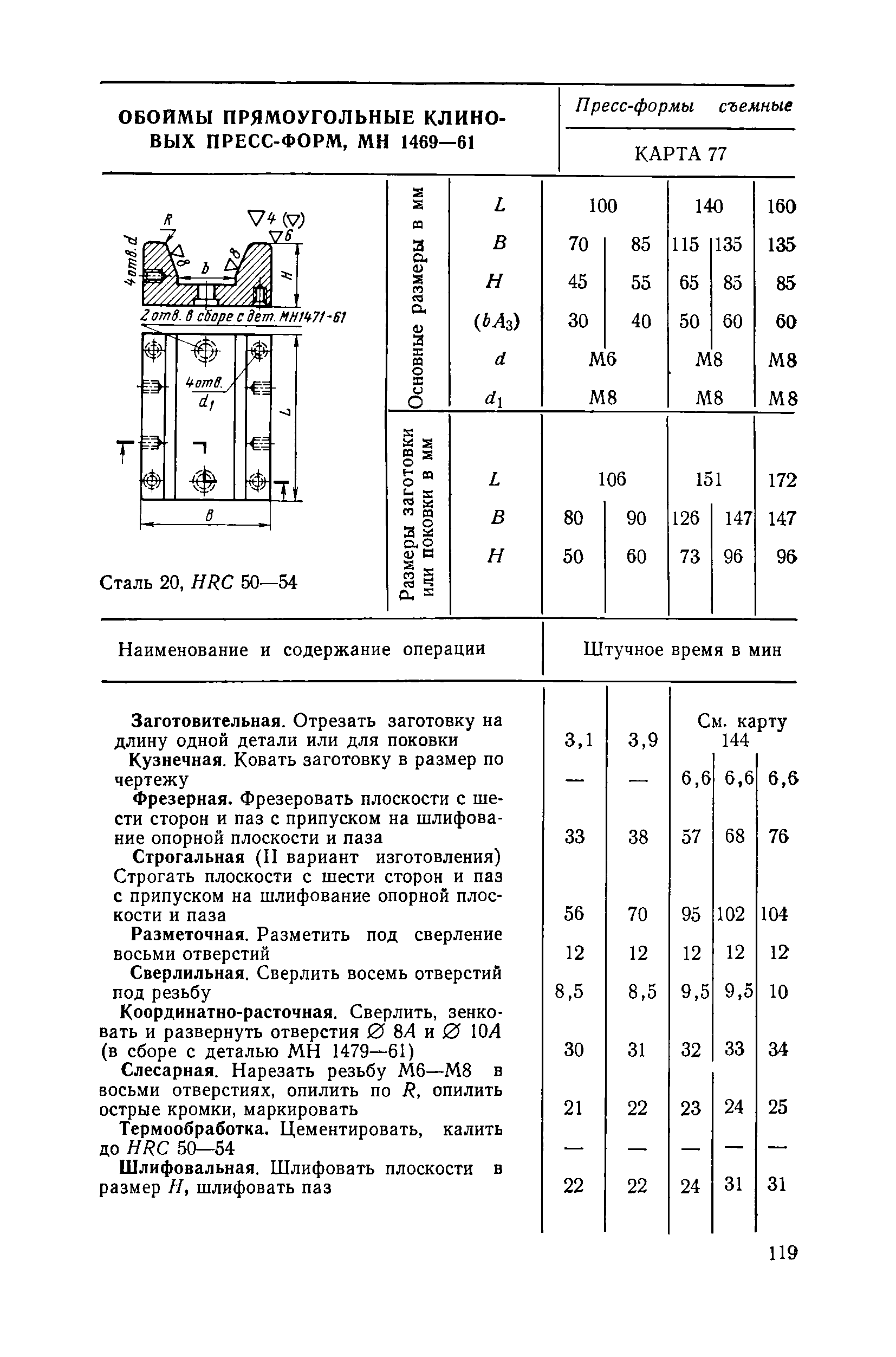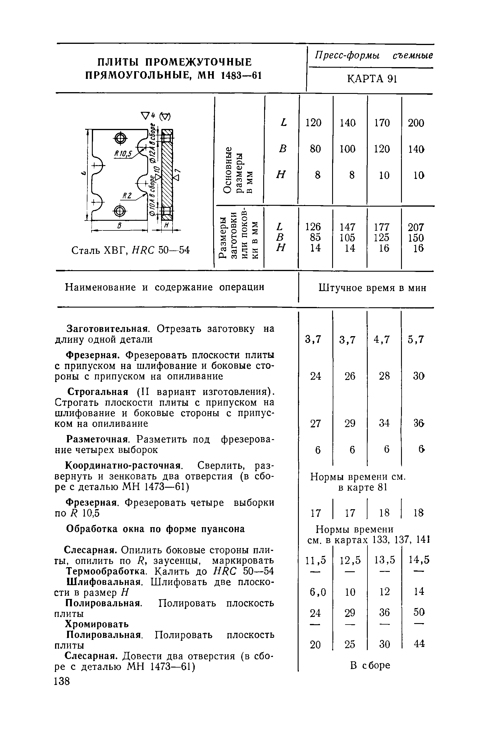 | Оглавление: | I. Типовые нормы времени на изготовление штампов II. Типовые нормы времени на изготовление пресс-форм Универсальные блоки пресс-форм с нижней загрузочной камерой Пакеты к блокам пресс-форм с нижней загрузочной камерой Пресс-формы съемные III. Нормативы неполного штучного времени и нормы времени на операции, не охваченные типовыми нормами времени IV. Подготовительно-заключительное время на партию Приложение 1. Штамп комбинированный, Трудоемкость изготовления Приложение 2. Пресс-формы для прессования изделий из реактопластов. Универсальные блоки с нижней загрузочной камерой, МН 1515-61. Трудоемкость изготовления Приложение 3. Пакеты к блокам пресс-форм с нижней загрузочной камерой, МН 1516-61 Приложение 4. Пресс-формы съемные круглые прямого прессования с двумя плоскостями разъема, МН 1452-61. Трудоемкость изготовления Приложение 5. Пресс-формы съемные прямоугольные литьевого прессования с двумя плоскостями разъема и двумя пуансонодержателями, МН 1461-61. Трудоемкость изготовления Приложение 6. Режимы резания, принятые при изготовлении штампов и пресс-форм Приложение 7. Припуски на механическую обработку Приложение 8. Перечень типовых моделей оборудования инструментального цеха штампов и пресс-форм Приложение 9. Теоретический вес заготовк |