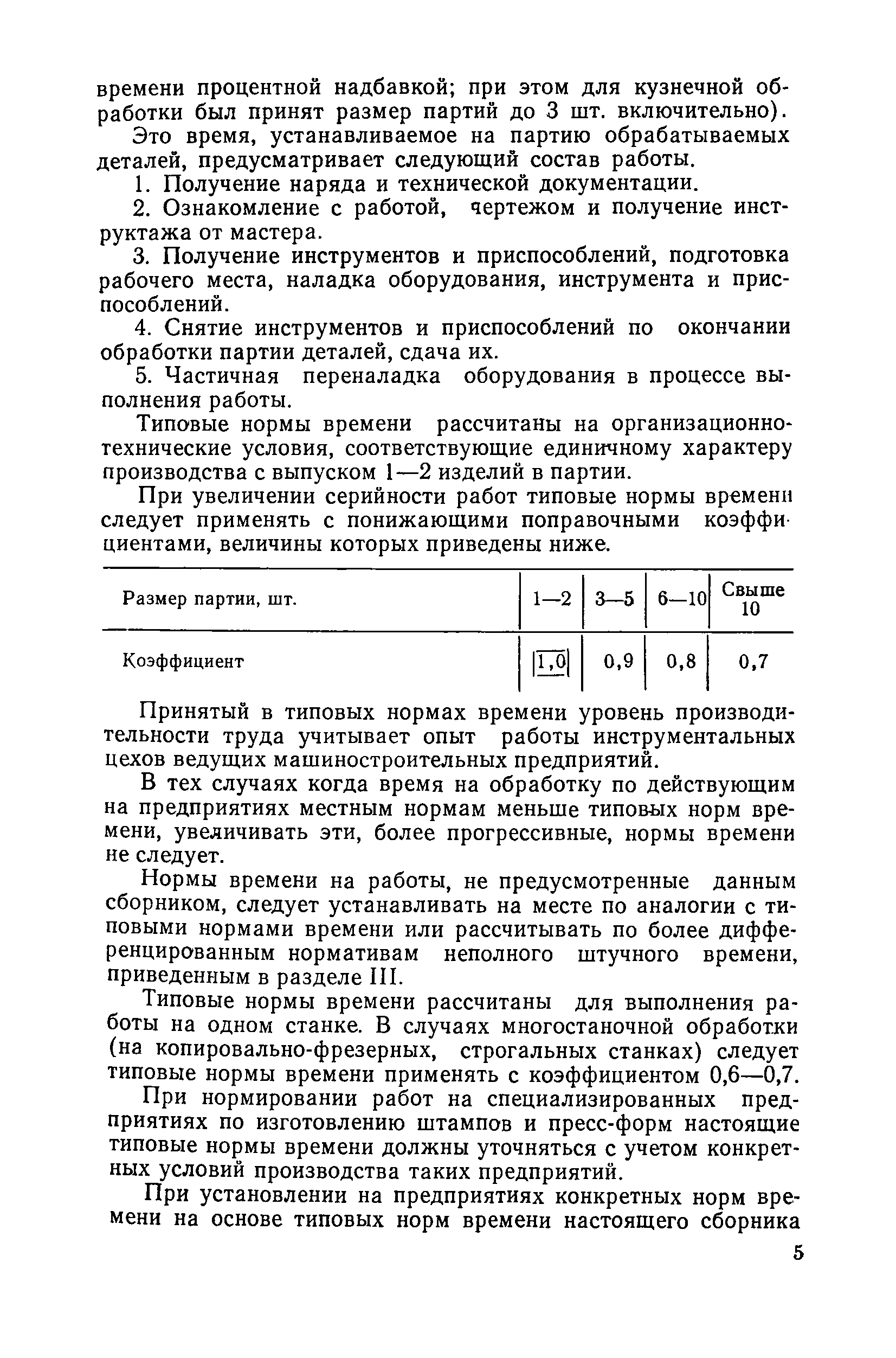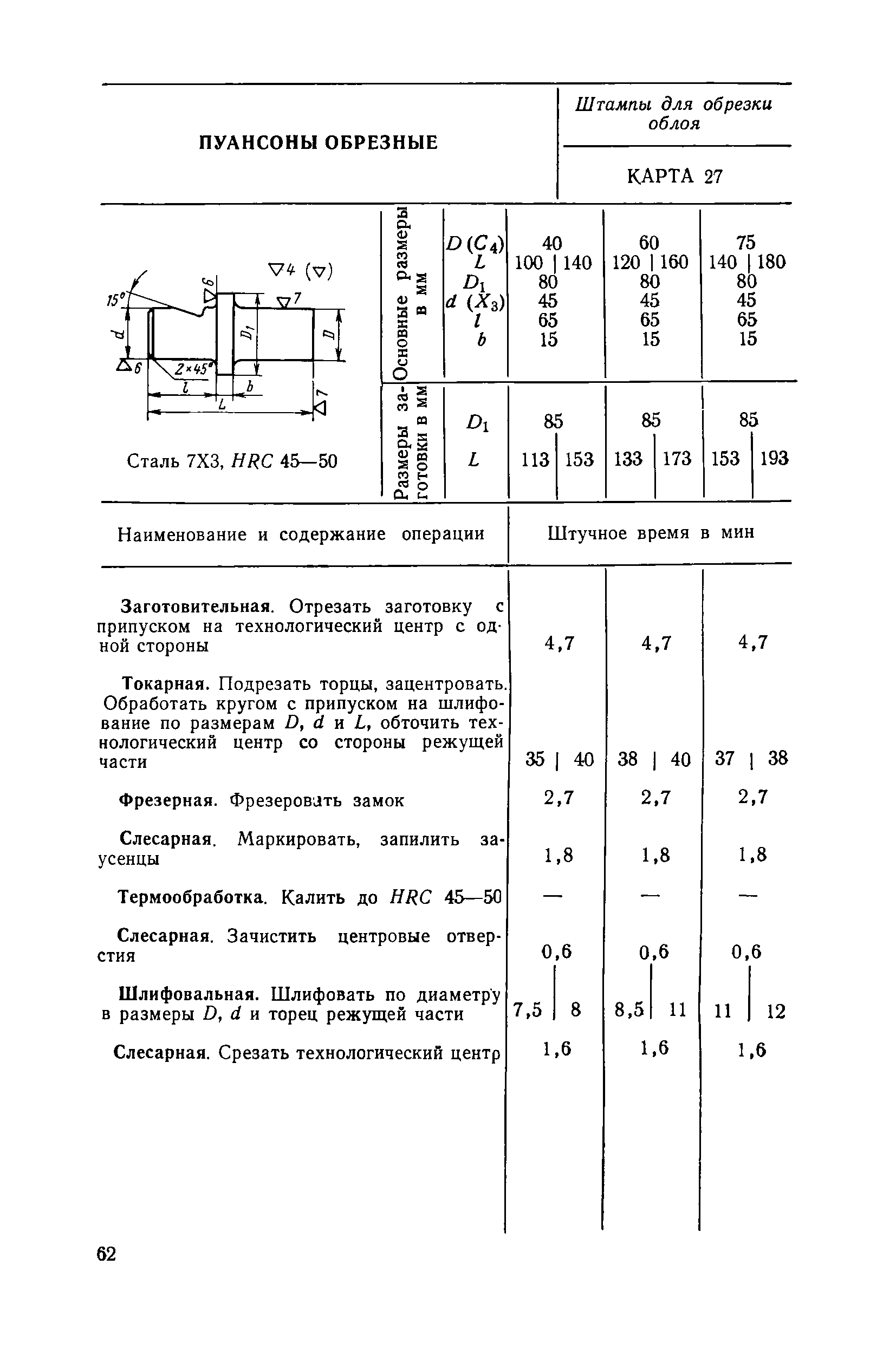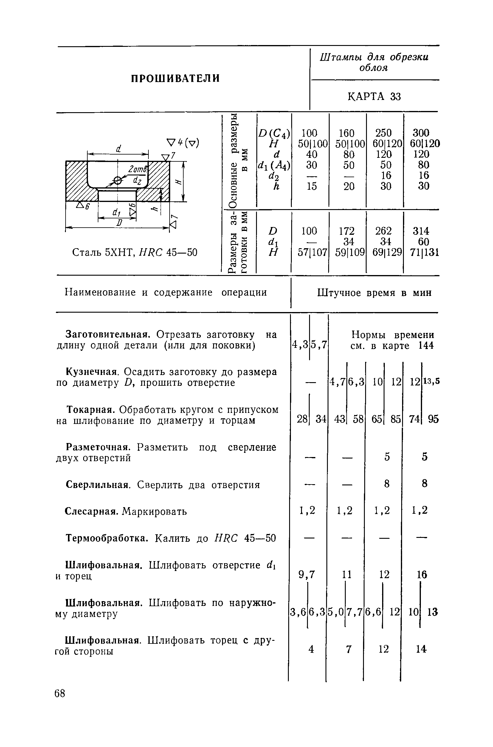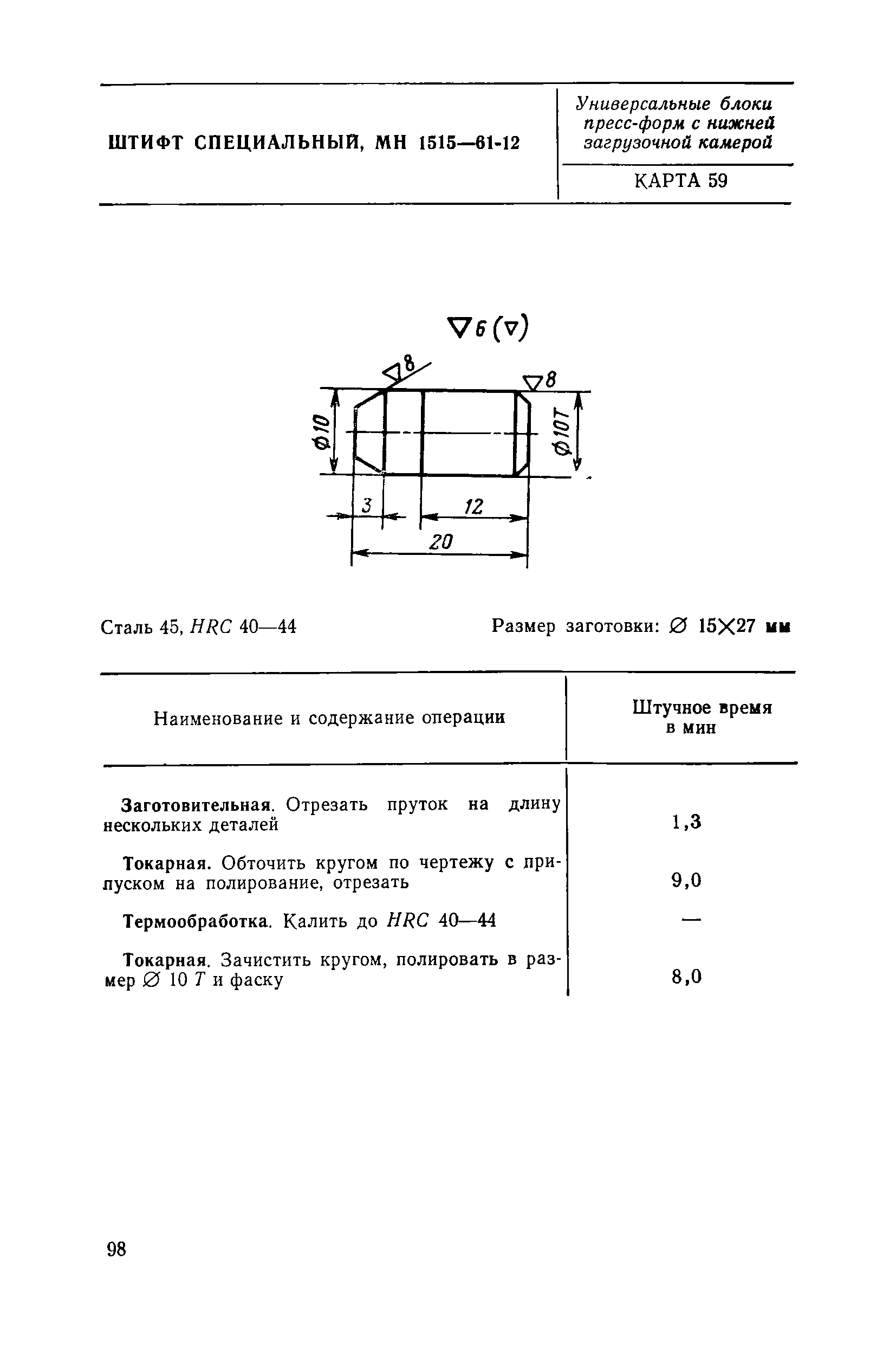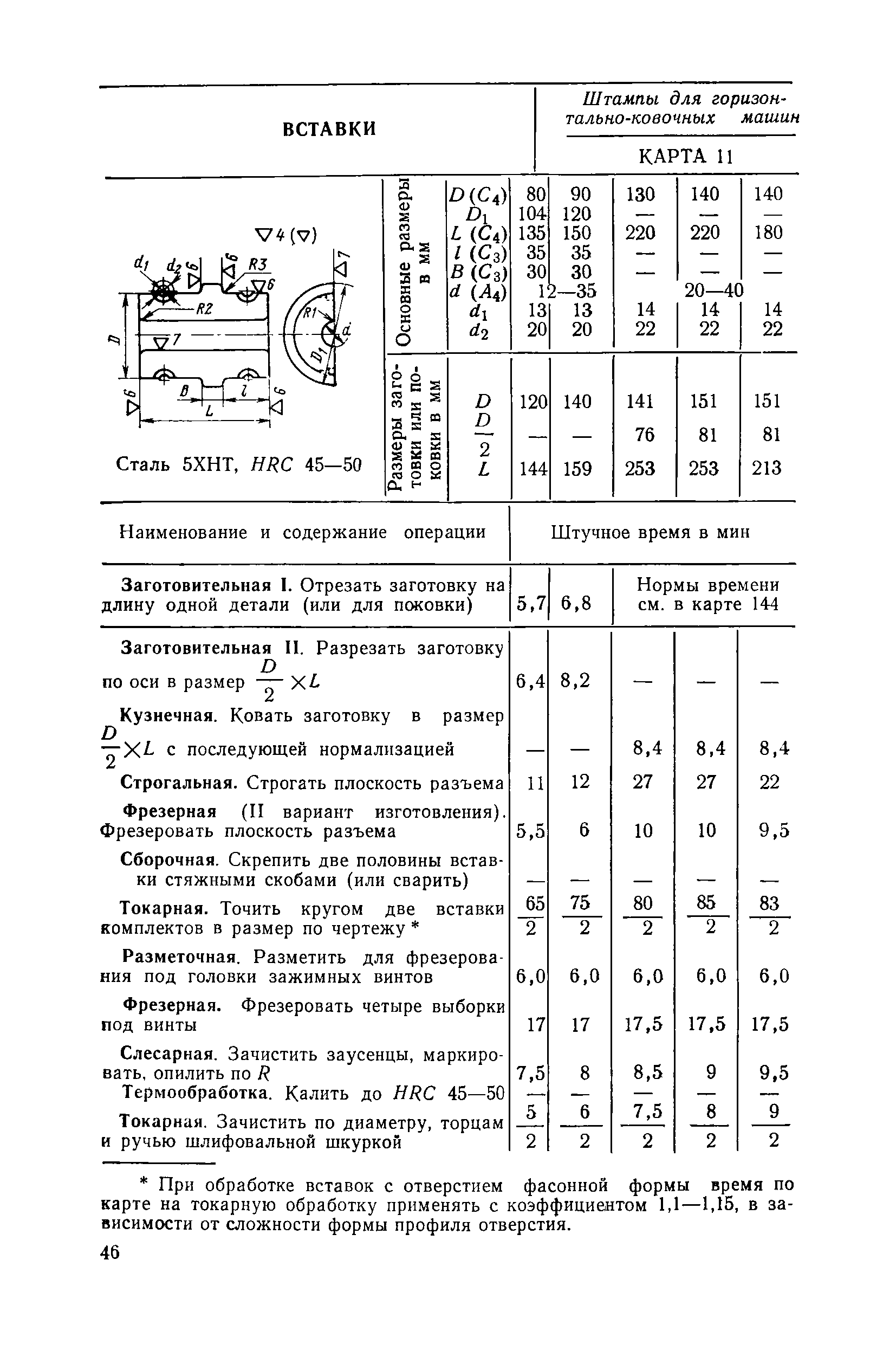 | Оглавление: | I. Типовые нормы времени на изготовление штампов II. Типовые нормы времени на изготовление пресс-форм Универсальные блоки пресс-форм с нижней загрузочной камерой Пакеты к блокам пресс-форм с нижней загрузочной камерой Пресс-формы съемные III. Нормативы неполного штучного времени и нормы времени на операции, не охваченные типовыми нормами времени IV. Подготовительно-заключительное время на партию Приложение 1. Штамп комбинированный, Трудоемкость изготовления Приложение 2. Пресс-формы для прессования изделий из реактопластов. Универсальные блоки с нижней загрузочной камерой, МН 1515-61. Трудоемкость изготовления Приложение 3. Пакеты к блокам пресс-форм с нижней загрузочной камерой, МН 1516-61 Приложение 4. Пресс-формы съемные круглые прямого прессования с двумя плоскостями разъема, МН 1452-61. Трудоемкость изготовления Приложение 5. Пресс-формы съемные прямоугольные литьевого прессования с двумя плоскостями разъема и двумя пуансонодержателями, МН 1461-61. Трудоемкость изготовления Приложение 6. Режимы резания, принятые при изготовлении штампов и пресс-форм Приложение 7. Припуски на механическую обработку Приложение 8. Перечень типовых моделей оборудования инструментального цеха штампов и пресс-форм Приложение 9. Теоретический вес заготовк |