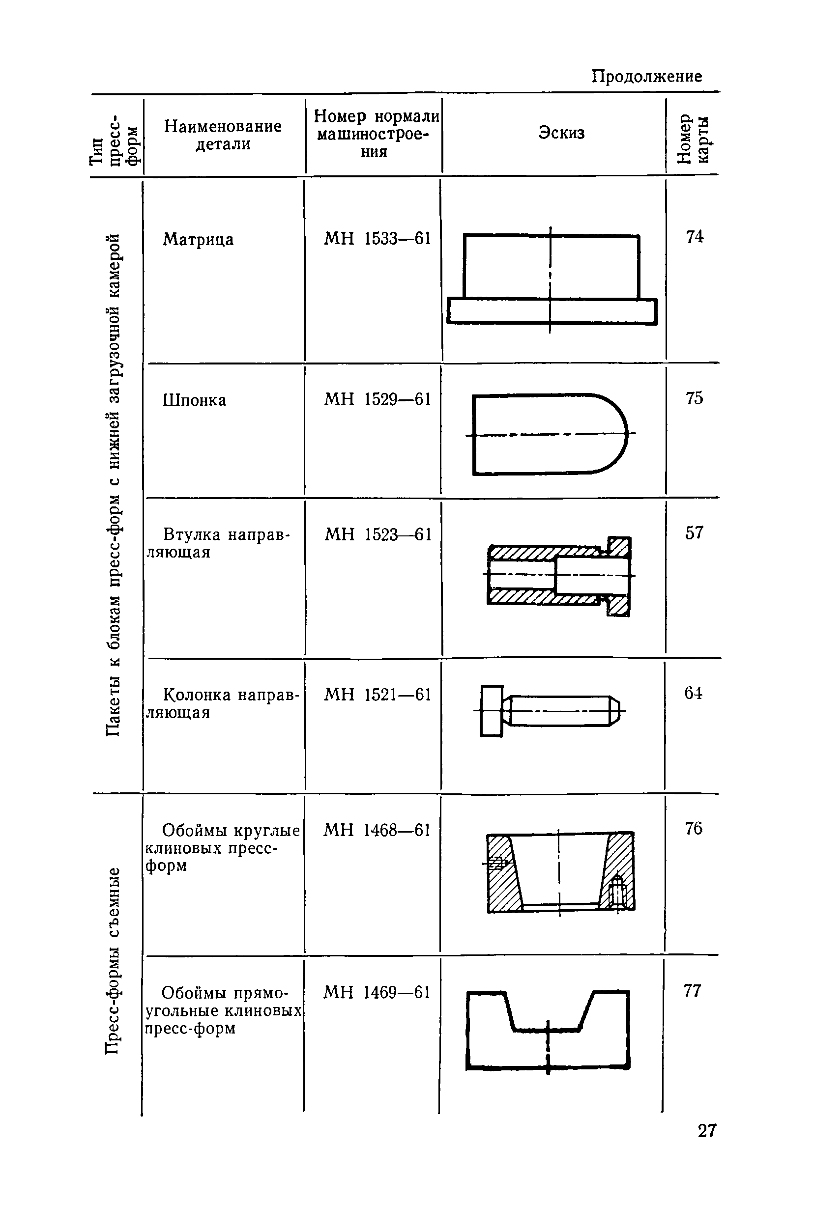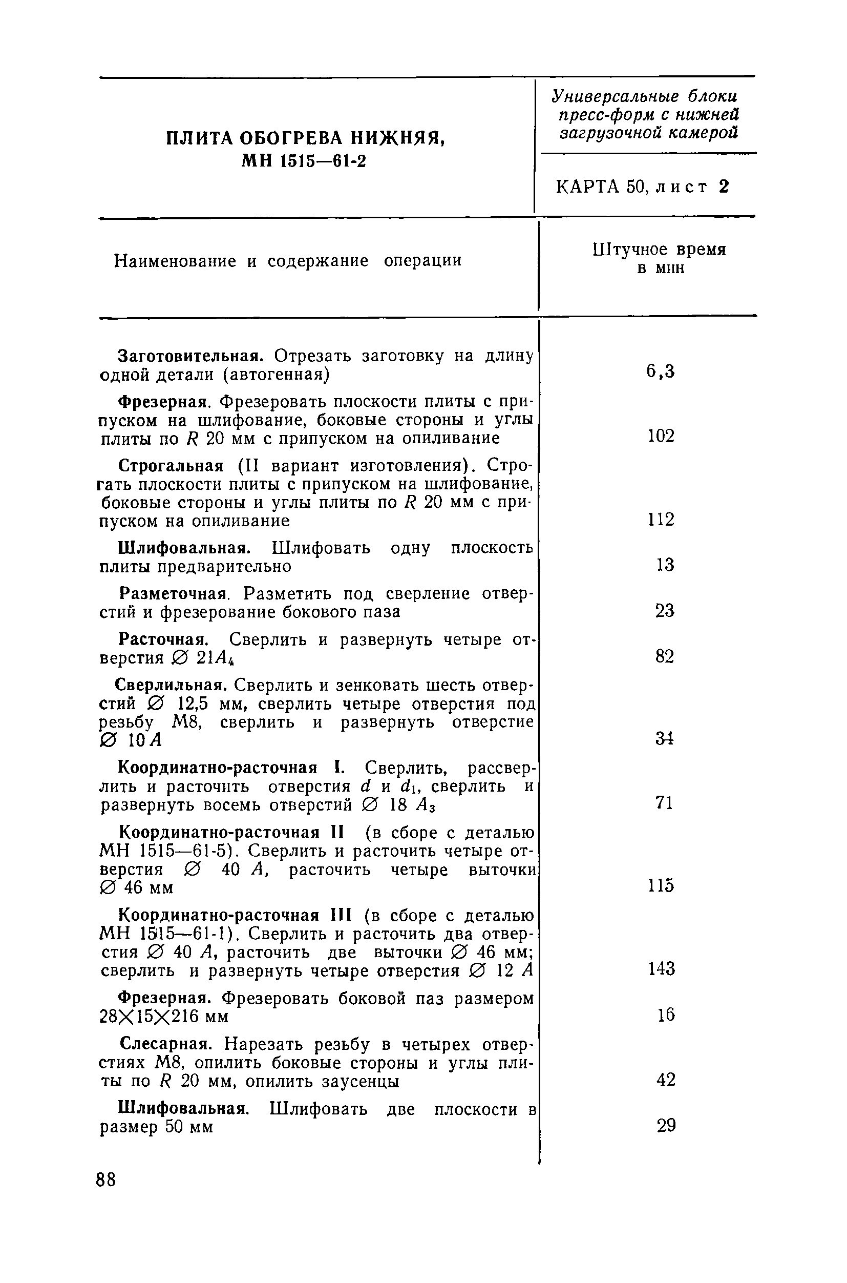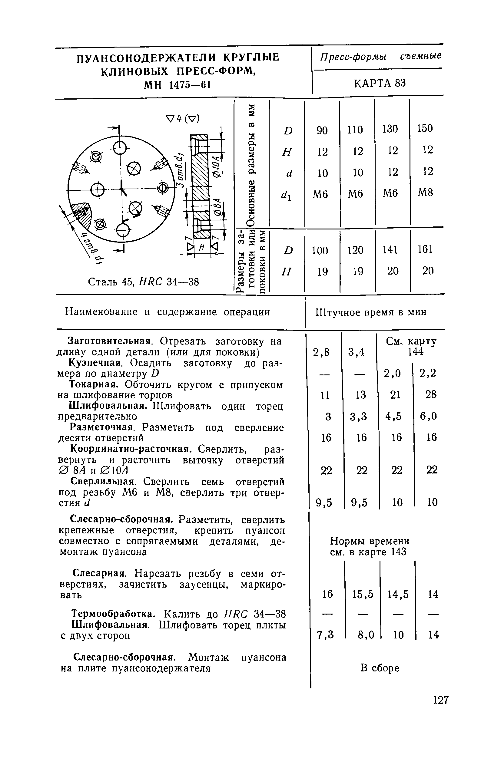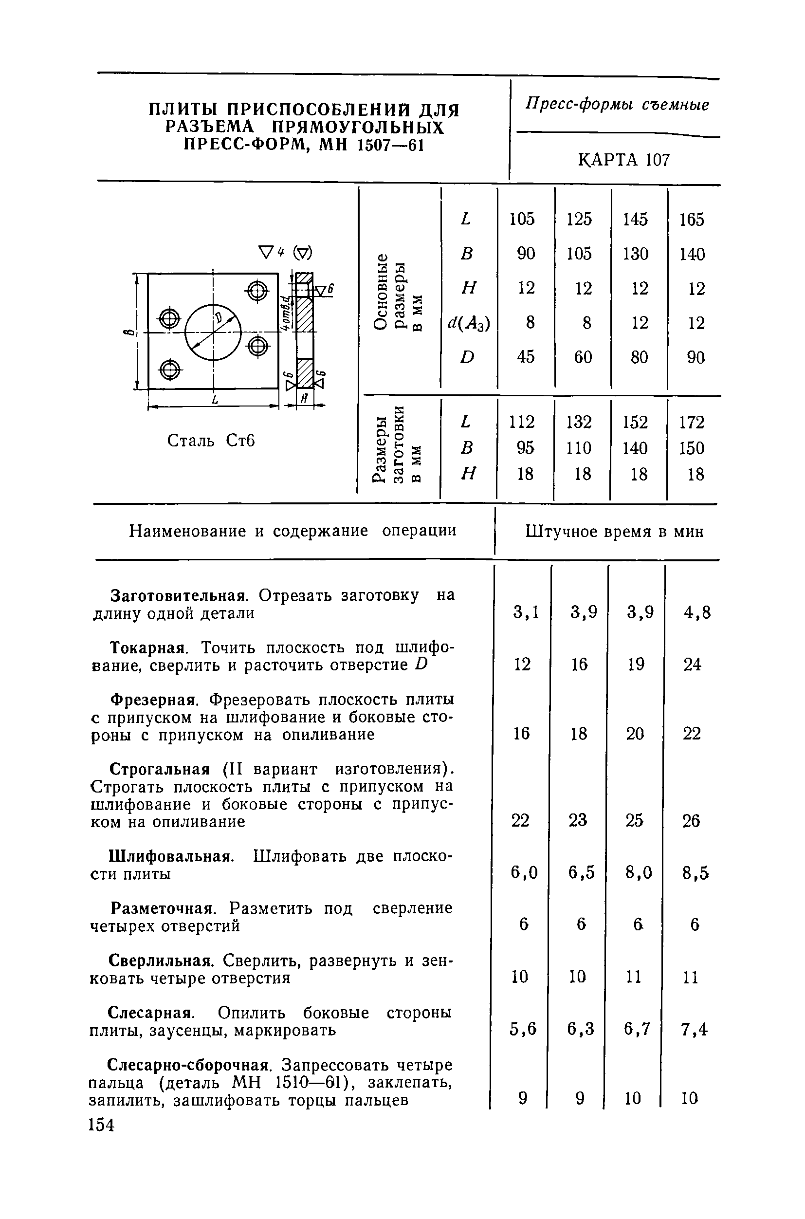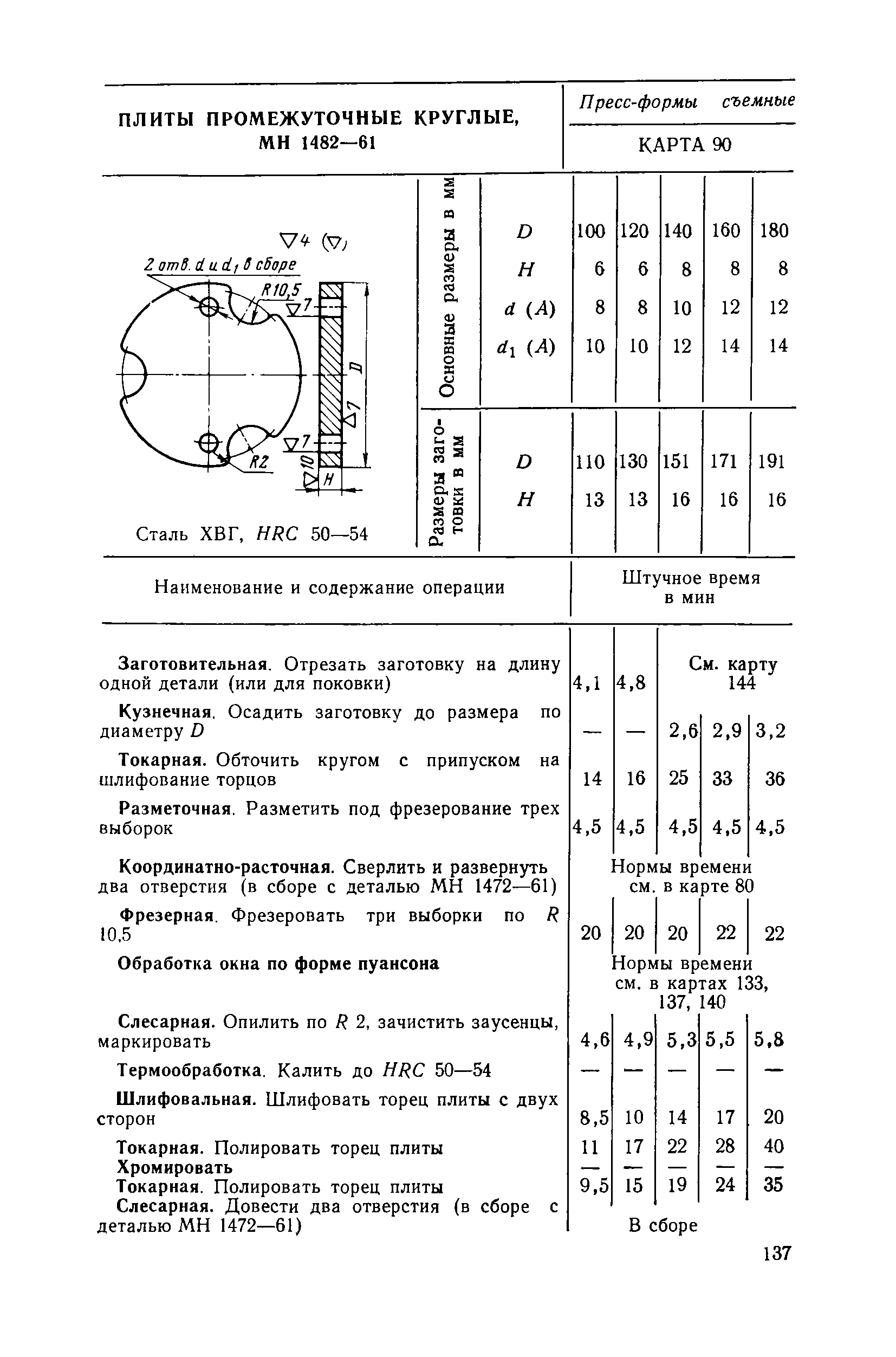 | Оглавление: | I. Типовые нормы времени на изготовление штампов II. Типовые нормы времени на изготовление пресс-форм Универсальные блоки пресс-форм с нижней загрузочной камерой Пакеты к блокам пресс-форм с нижней загрузочной камерой Пресс-формы съемные III. Нормативы неполного штучного времени и нормы времени на операции, не охваченные типовыми нормами времени IV. Подготовительно-заключительное время на партию Приложение 1. Штамп комбинированный, Трудоемкость изготовления Приложение 2. Пресс-формы для прессования изделий из реактопластов. Универсальные блоки с нижней загрузочной камерой, МН 1515-61. Трудоемкость изготовления Приложение 3. Пакеты к блокам пресс-форм с нижней загрузочной камерой, МН 1516-61 Приложение 4. Пресс-формы съемные круглые прямого прессования с двумя плоскостями разъема, МН 1452-61. Трудоемкость изготовления Приложение 5. Пресс-формы съемные прямоугольные литьевого прессования с двумя плоскостями разъема и двумя пуансонодержателями, МН 1461-61. Трудоемкость изготовления Приложение 6. Режимы резания, принятые при изготовлении штампов и пресс-форм Приложение 7. Припуски на механическую обработку Приложение 8. Перечень типовых моделей оборудования инструментального цеха штампов и пресс-форм Приложение 9. Теоретический вес заготовк |