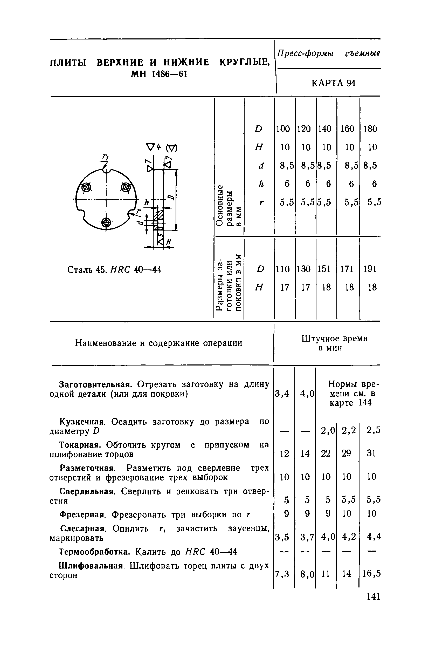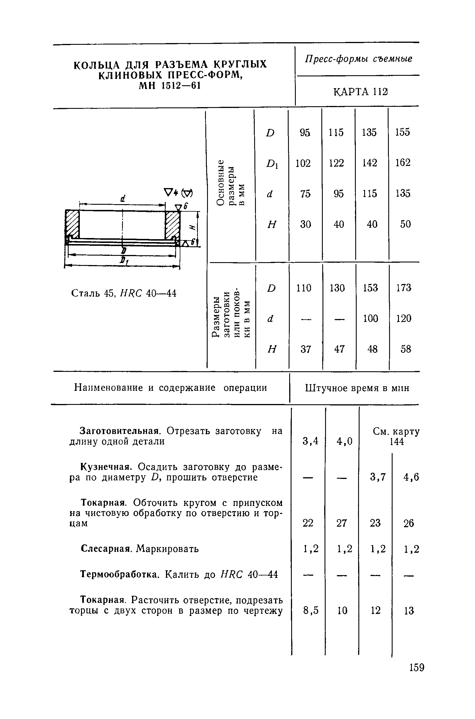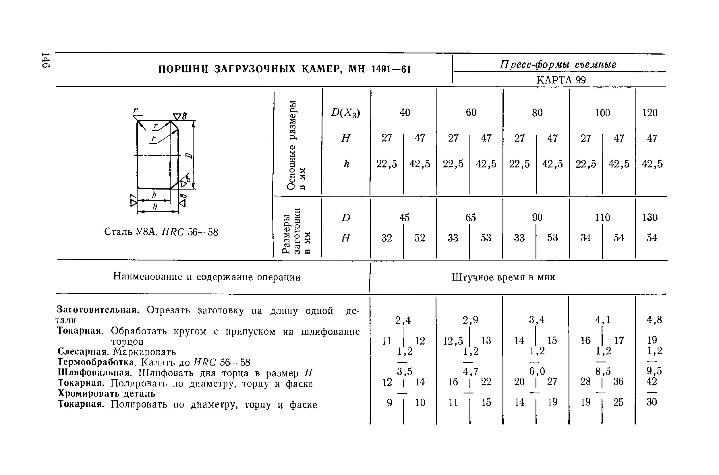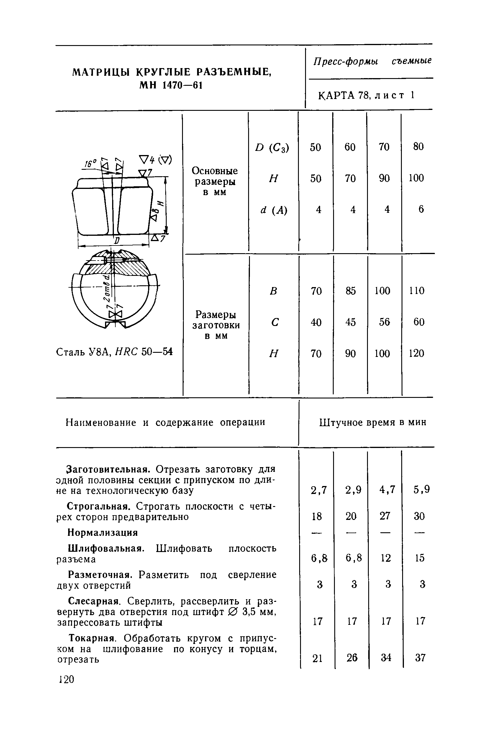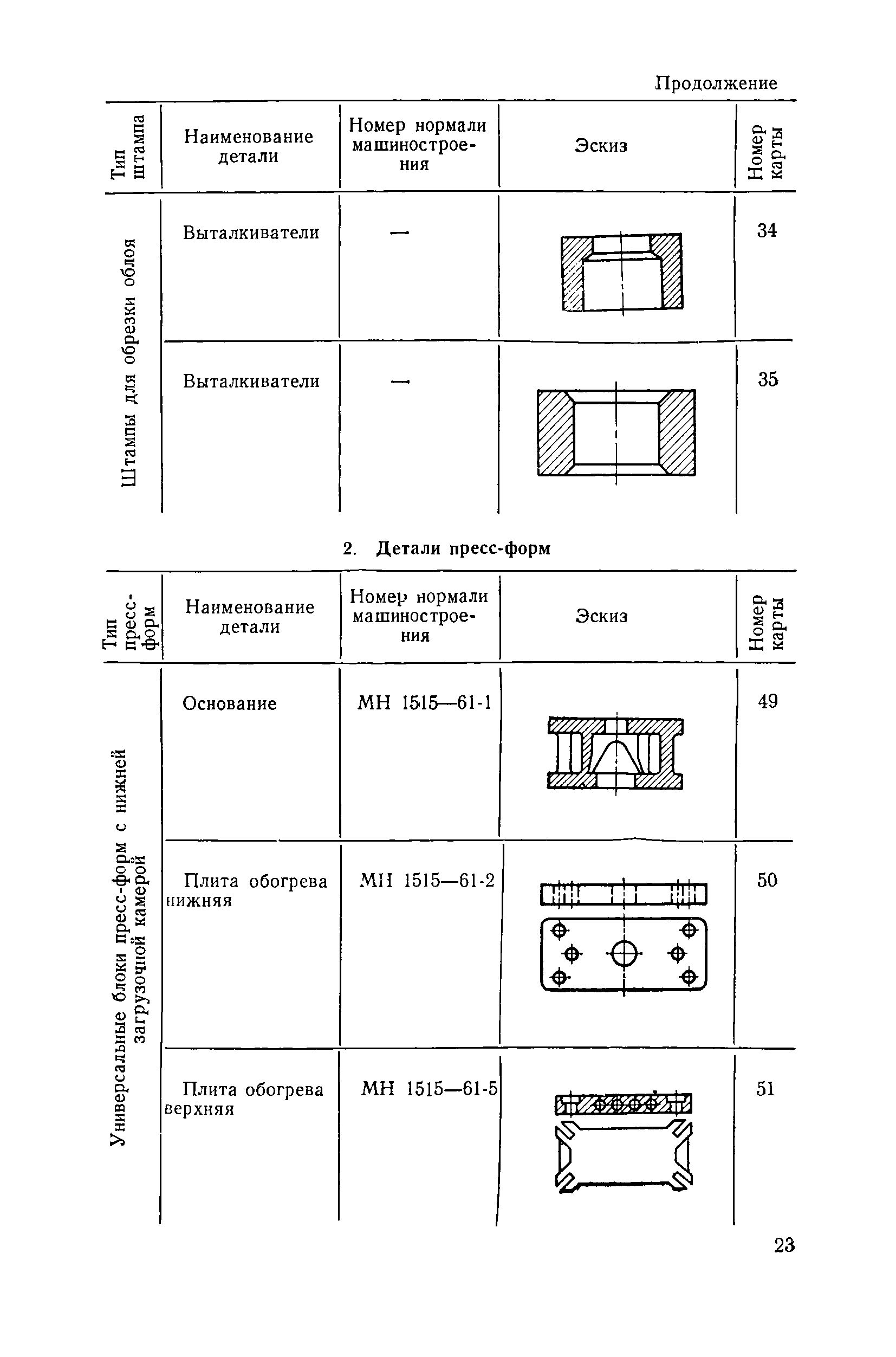 | Оглавление: | I. Типовые нормы времени на изготовление штампов II. Типовые нормы времени на изготовление пресс-форм Универсальные блоки пресс-форм с нижней загрузочной камерой Пакеты к блокам пресс-форм с нижней загрузочной камерой Пресс-формы съемные III. Нормативы неполного штучного времени и нормы времени на операции, не охваченные типовыми нормами времени IV. Подготовительно-заключительное время на партию Приложение 1. Штамп комбинированный, Трудоемкость изготовления Приложение 2. Пресс-формы для прессования изделий из реактопластов. Универсальные блоки с нижней загрузочной камерой, МН 1515-61. Трудоемкость изготовления Приложение 3. Пакеты к блокам пресс-форм с нижней загрузочной камерой, МН 1516-61 Приложение 4. Пресс-формы съемные круглые прямого прессования с двумя плоскостями разъема, МН 1452-61. Трудоемкость изготовления Приложение 5. Пресс-формы съемные прямоугольные литьевого прессования с двумя плоскостями разъема и двумя пуансонодержателями, МН 1461-61. Трудоемкость изготовления Приложение 6. Режимы резания, принятые при изготовлении штампов и пресс-форм Приложение 7. Припуски на механическую обработку Приложение 8. Перечень типовых моделей оборудования инструментального цеха штампов и пресс-форм Приложение 9. Теоретический вес заготовк |