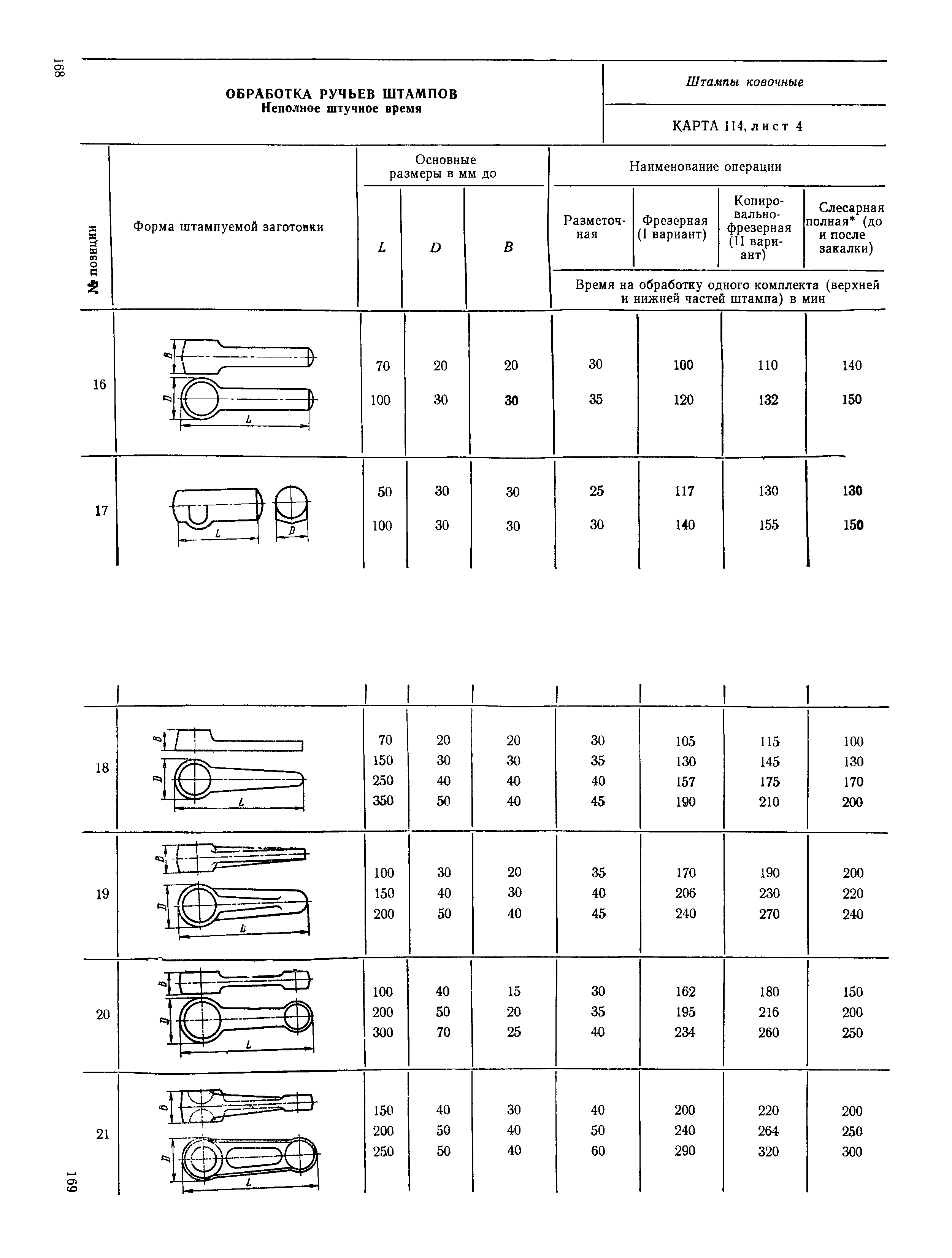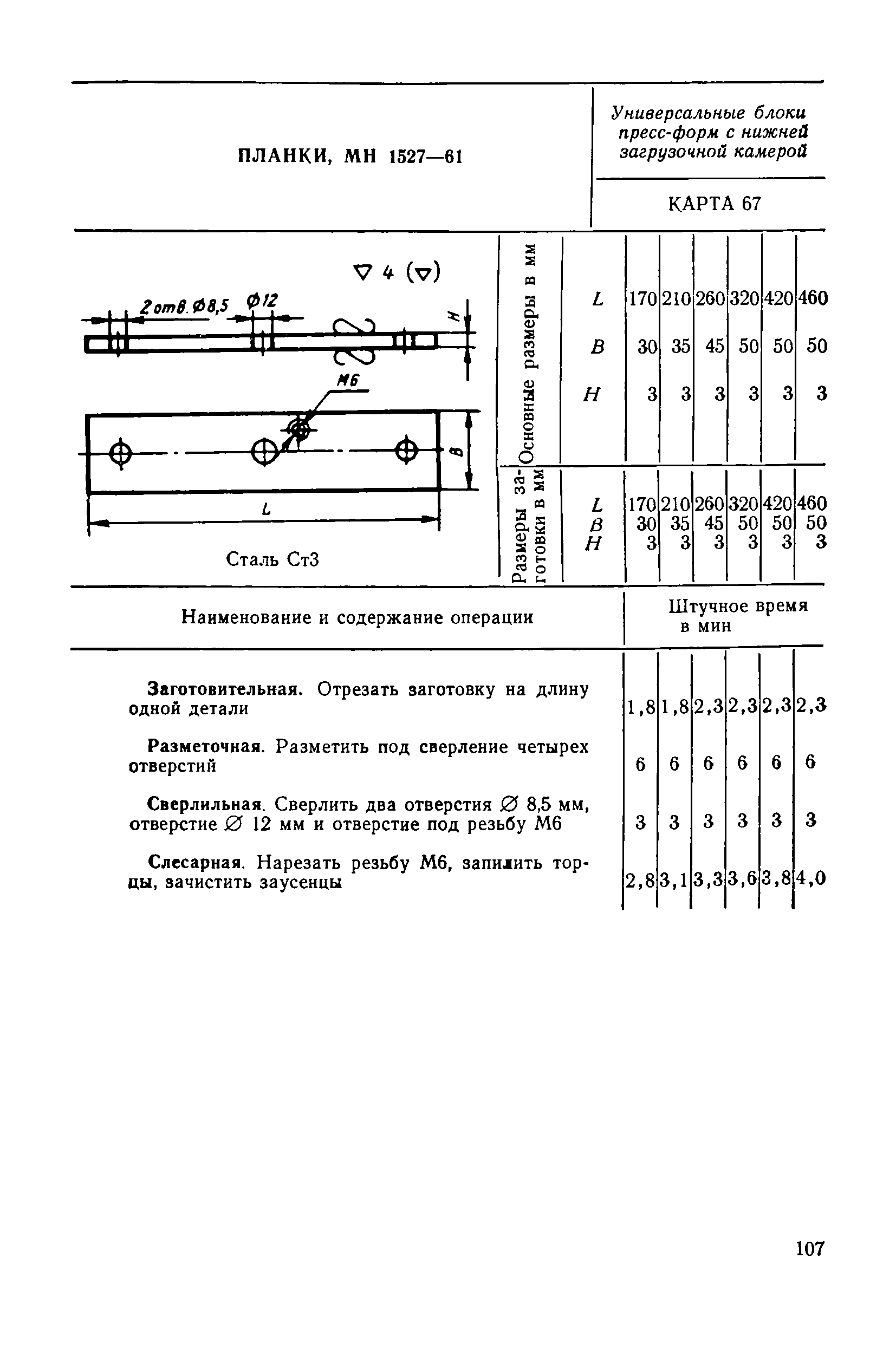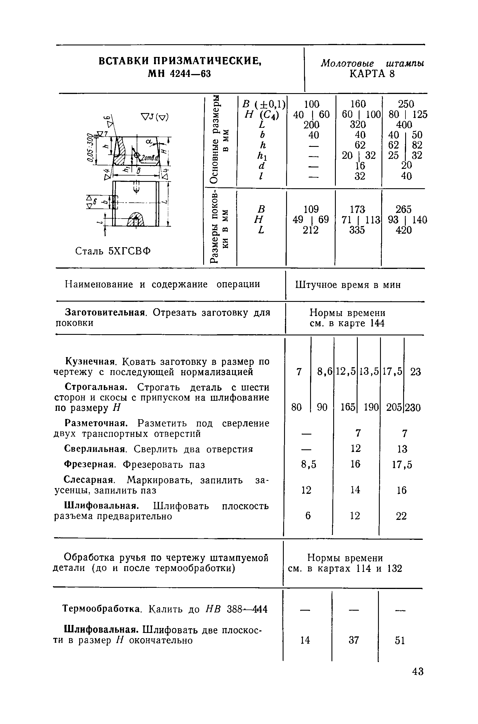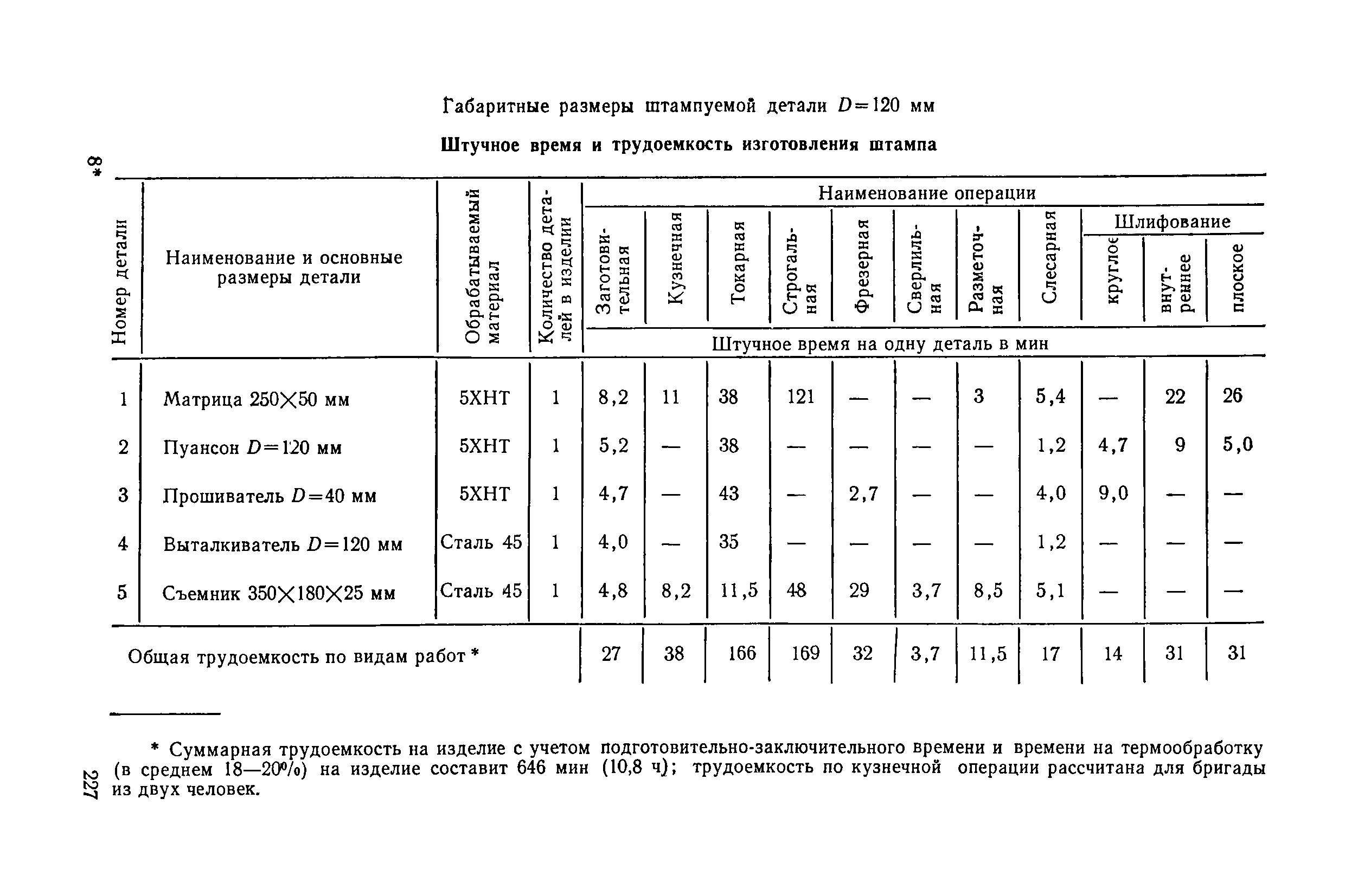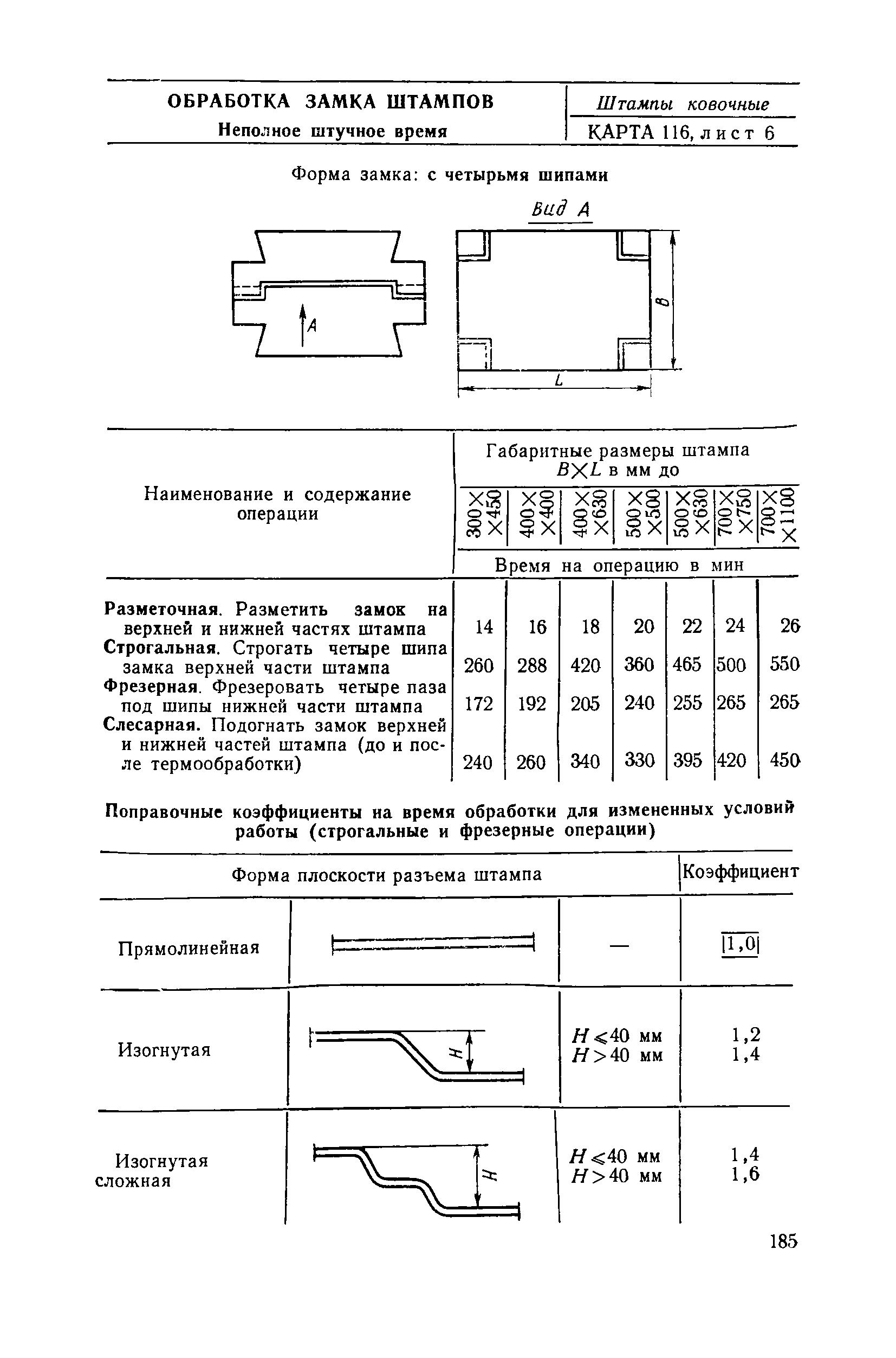 | Оглавление: | I. Типовые нормы времени на изготовление штампов II. Типовые нормы времени на изготовление пресс-форм Универсальные блоки пресс-форм с нижней загрузочной камерой Пакеты к блокам пресс-форм с нижней загрузочной камерой Пресс-формы съемные III. Нормативы неполного штучного времени и нормы времени на операции, не охваченные типовыми нормами времени IV. Подготовительно-заключительное время на партию Приложение 1. Штамп комбинированный, Трудоемкость изготовления Приложение 2. Пресс-формы для прессования изделий из реактопластов. Универсальные блоки с нижней загрузочной камерой, МН 1515-61. Трудоемкость изготовления Приложение 3. Пакеты к блокам пресс-форм с нижней загрузочной камерой, МН 1516-61 Приложение 4. Пресс-формы съемные круглые прямого прессования с двумя плоскостями разъема, МН 1452-61. Трудоемкость изготовления Приложение 5. Пресс-формы съемные прямоугольные литьевого прессования с двумя плоскостями разъема и двумя пуансонодержателями, МН 1461-61. Трудоемкость изготовления Приложение 6. Режимы резания, принятые при изготовлении штампов и пресс-форм Приложение 7. Припуски на механическую обработку Приложение 8. Перечень типовых моделей оборудования инструментального цеха штампов и пресс-форм Приложение 9. Теоретический вес заготовк |