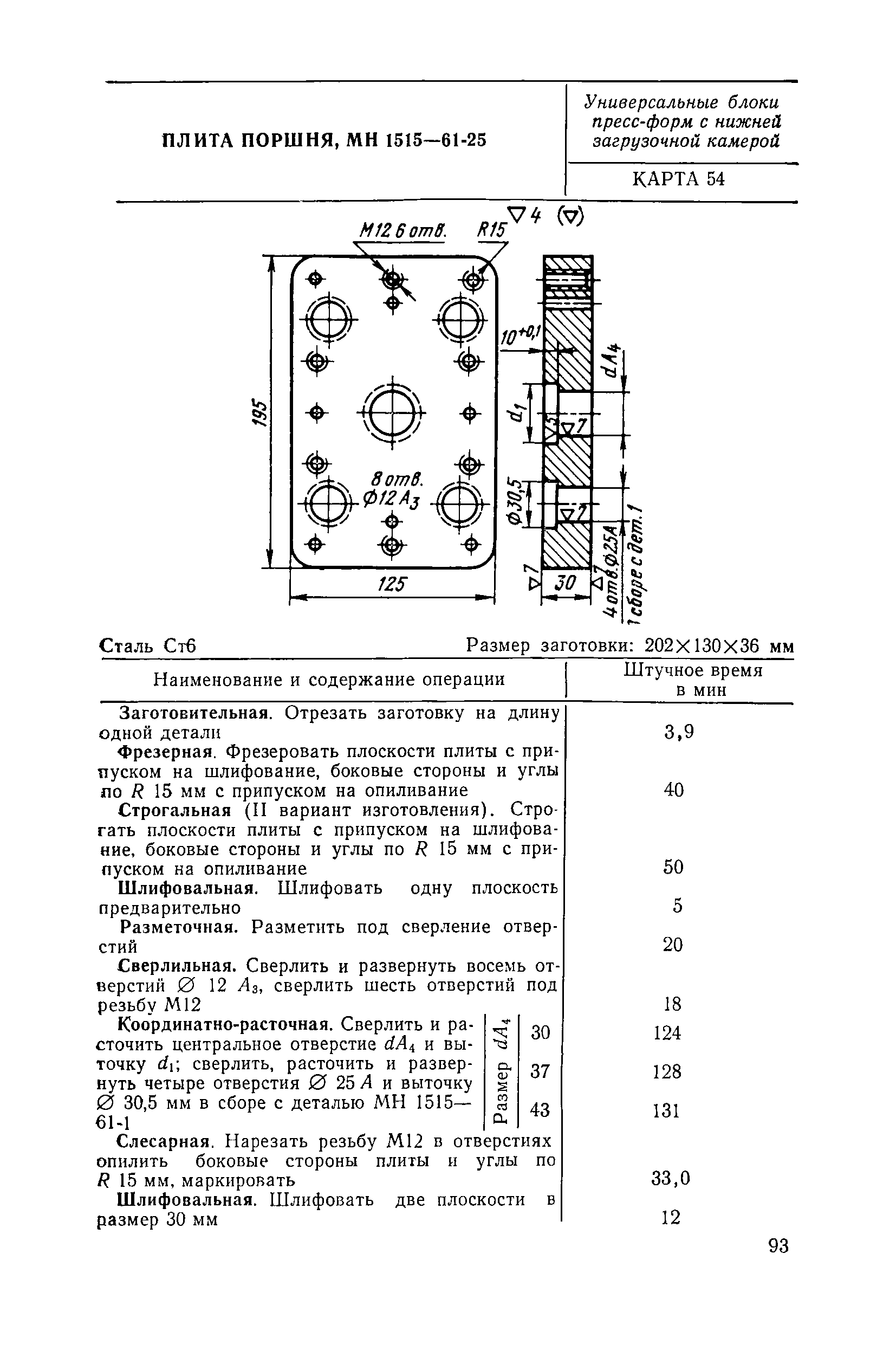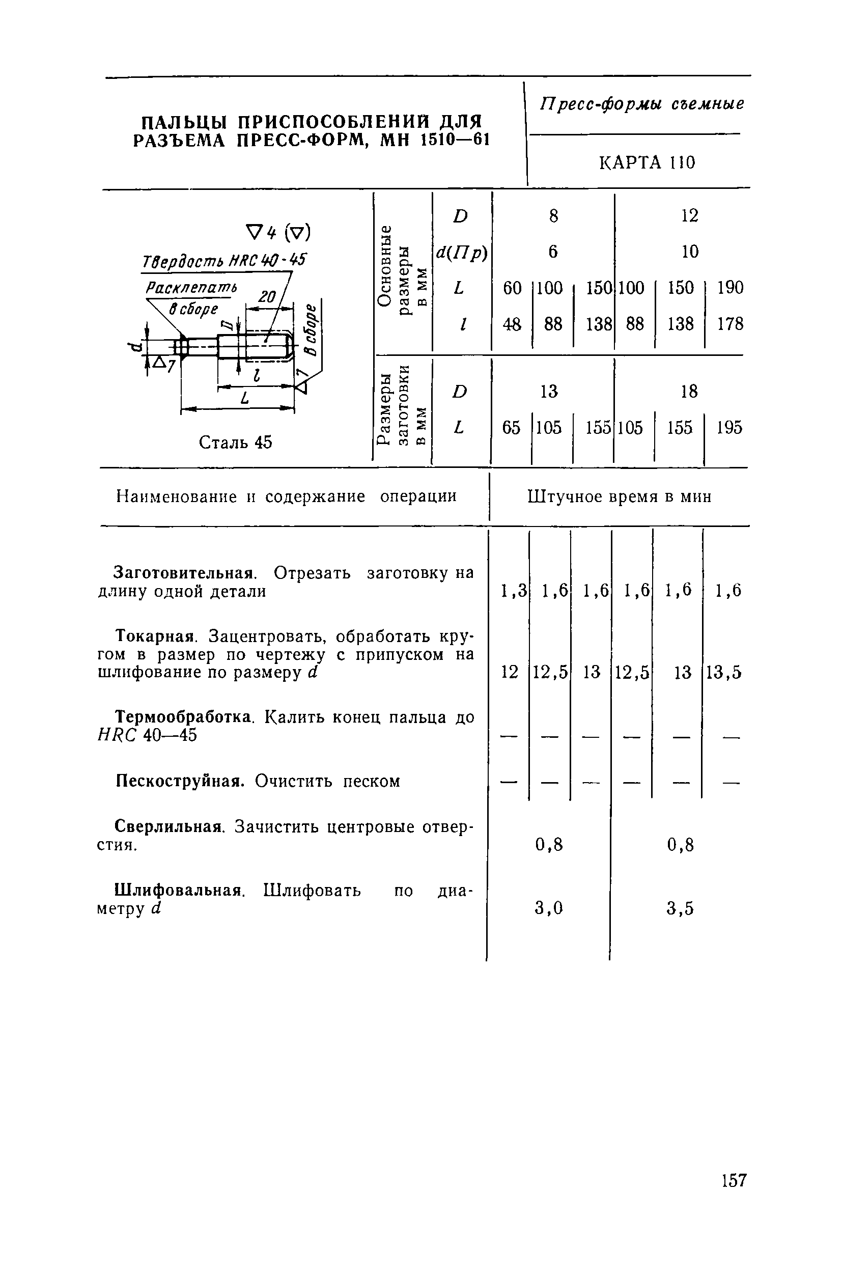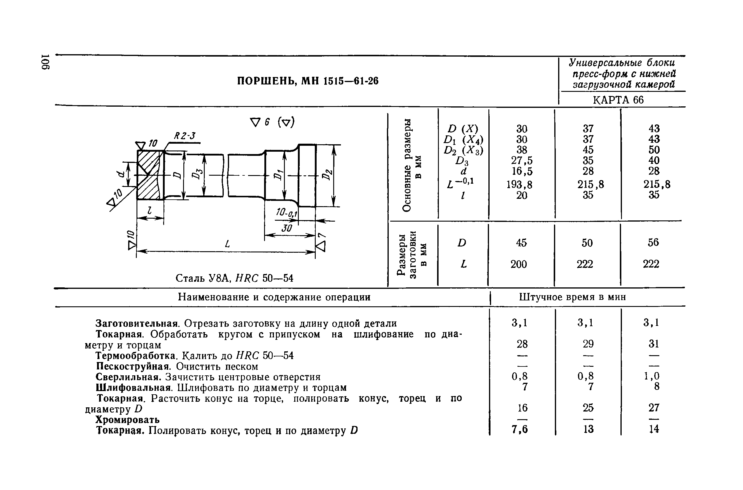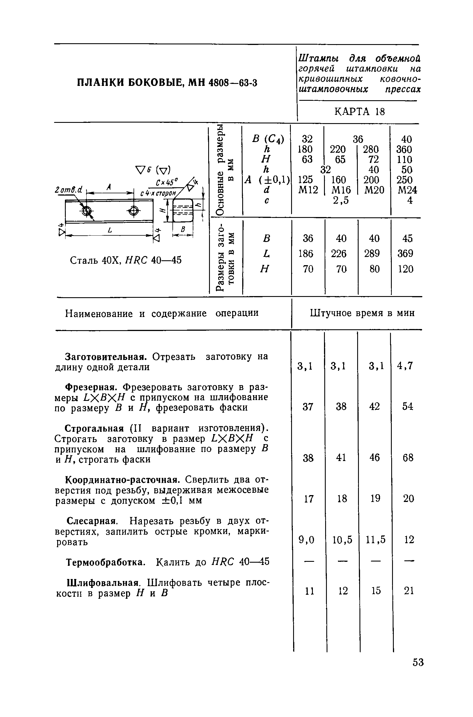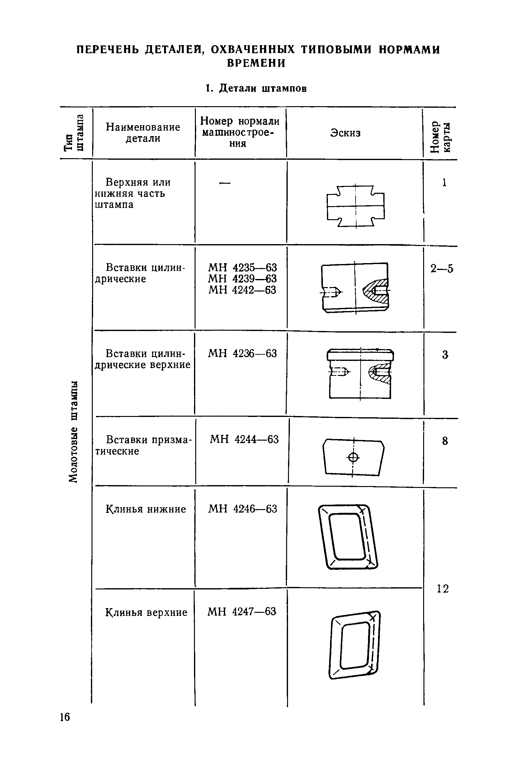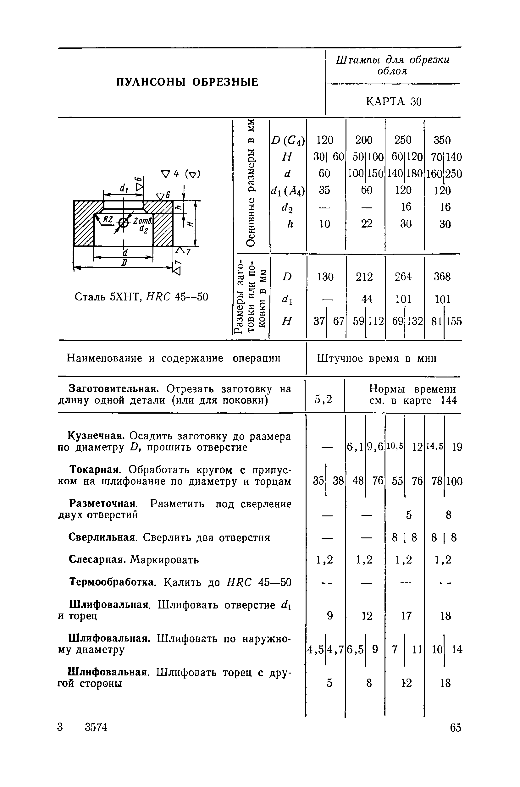 | Оглавление: | I. Типовые нормы времени на изготовление штампов II. Типовые нормы времени на изготовление пресс-форм Универсальные блоки пресс-форм с нижней загрузочной камерой Пакеты к блокам пресс-форм с нижней загрузочной камерой Пресс-формы съемные III. Нормативы неполного штучного времени и нормы времени на операции, не охваченные типовыми нормами времени IV. Подготовительно-заключительное время на партию Приложение 1. Штамп комбинированный, Трудоемкость изготовления Приложение 2. Пресс-формы для прессования изделий из реактопластов. Универсальные блоки с нижней загрузочной камерой, МН 1515-61. Трудоемкость изготовления Приложение 3. Пакеты к блокам пресс-форм с нижней загрузочной камерой, МН 1516-61 Приложение 4. Пресс-формы съемные круглые прямого прессования с двумя плоскостями разъема, МН 1452-61. Трудоемкость изготовления Приложение 5. Пресс-формы съемные прямоугольные литьевого прессования с двумя плоскостями разъема и двумя пуансонодержателями, МН 1461-61. Трудоемкость изготовления Приложение 6. Режимы резания, принятые при изготовлении штампов и пресс-форм Приложение 7. Припуски на механическую обработку Приложение 8. Перечень типовых моделей оборудования инструментального цеха штампов и пресс-форм Приложение 9. Теоретический вес заготовк |