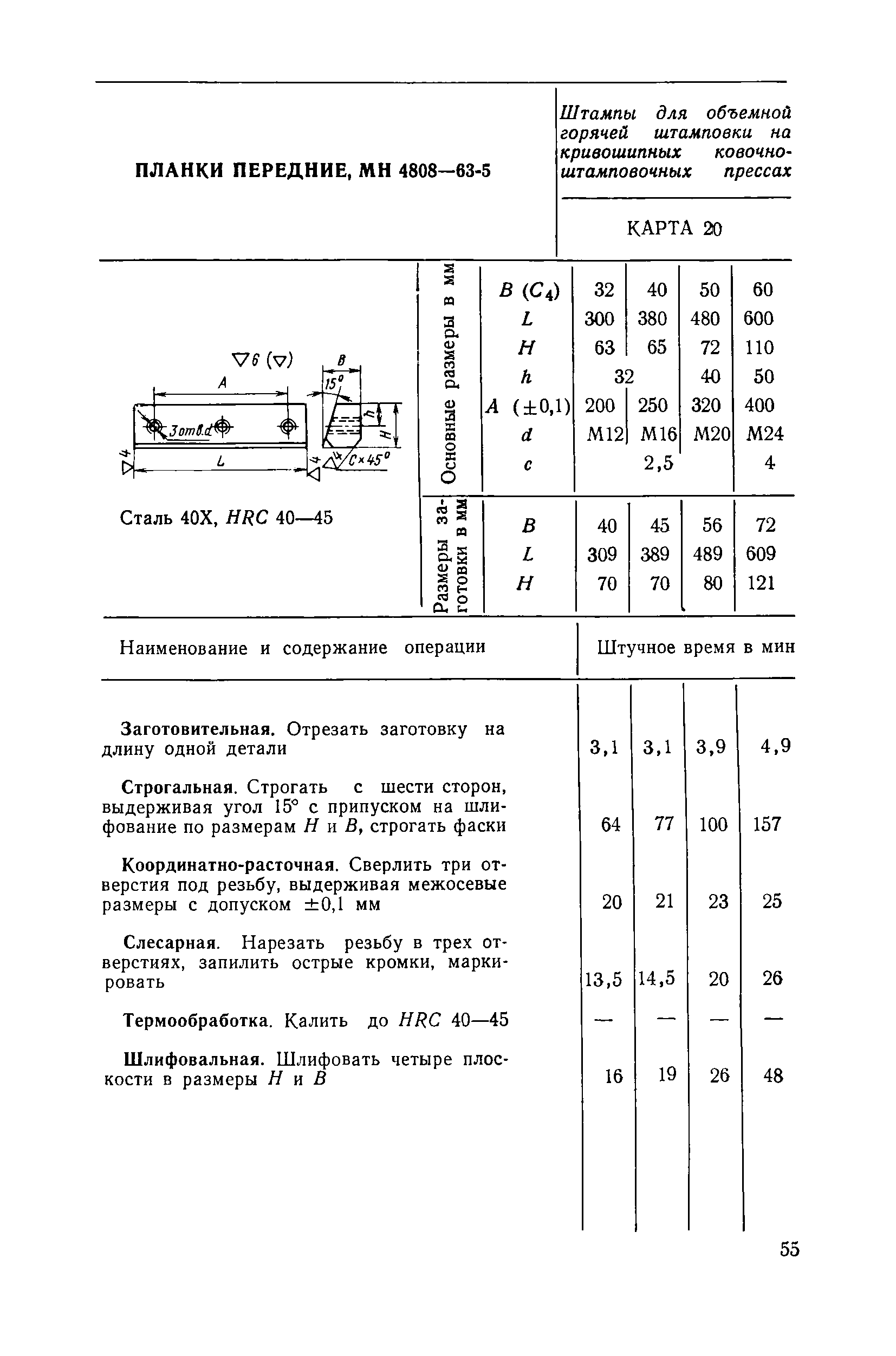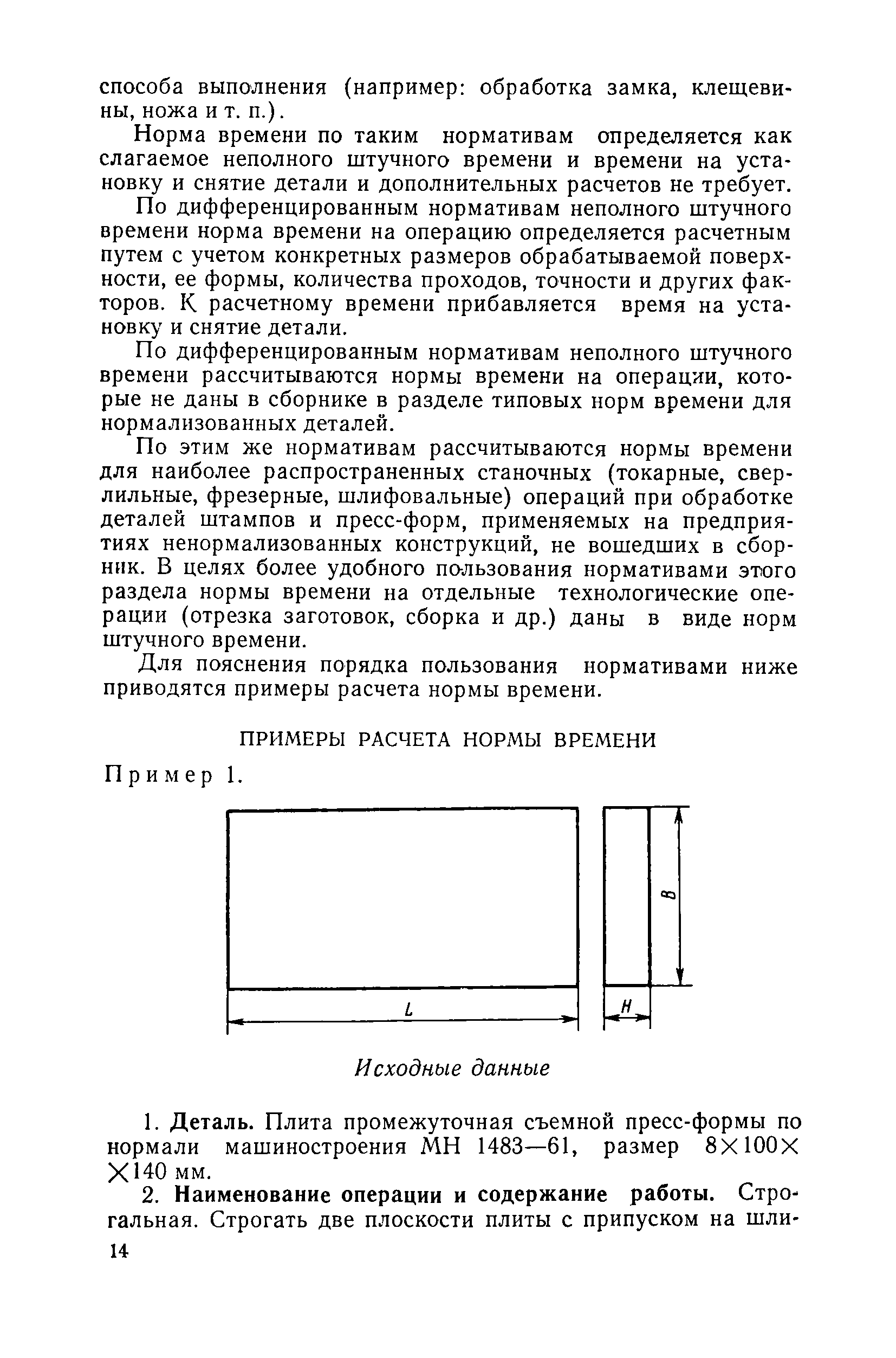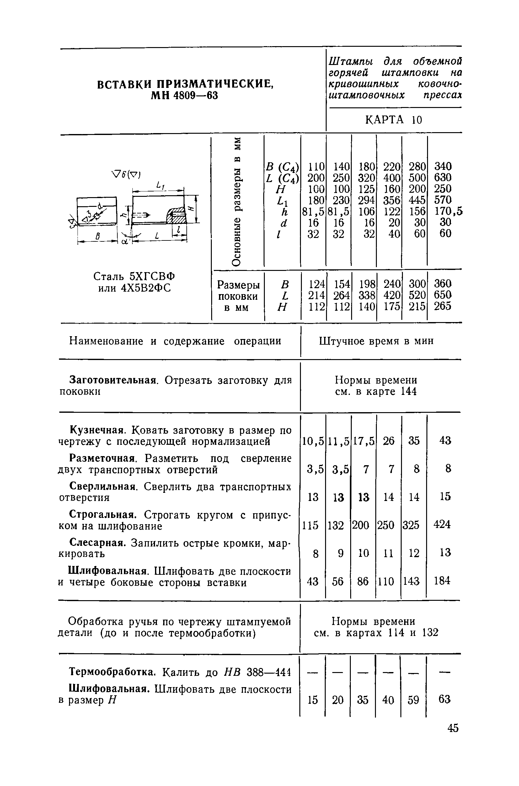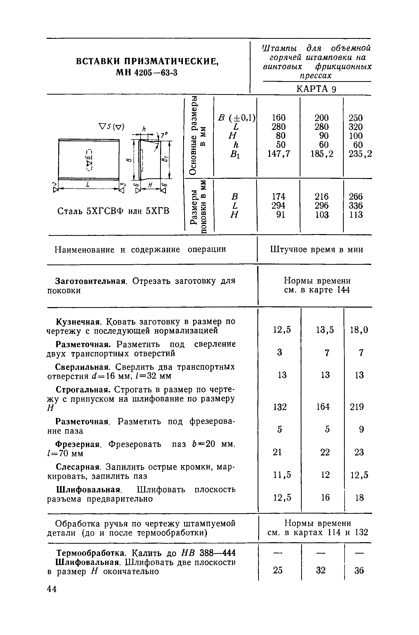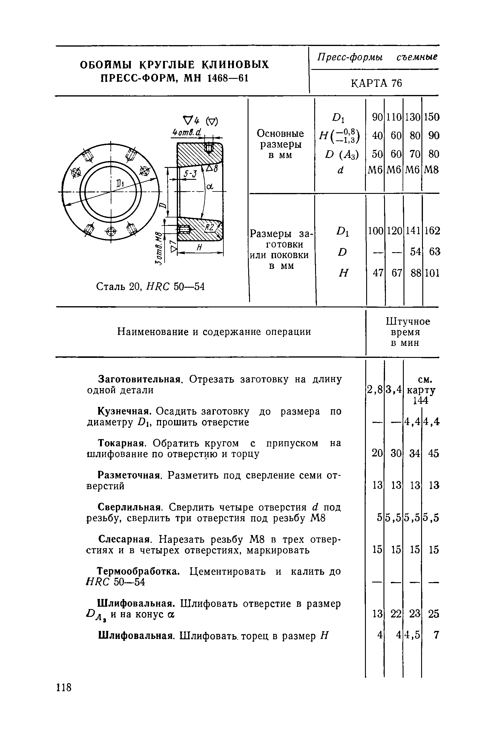| Оглавление: | I. Типовые нормы времени на изготовление штампов II. Типовые нормы времени на изготовление пресс-форм Универсальные блоки пресс-форм с нижней загрузочной камерой Пакеты к блокам пресс-форм с нижней загрузочной камерой Пресс-формы съемные III. Нормативы неполного штучного времени и нормы времени на операции, не охваченные типовыми нормами времени IV. Подготовительно-заключительное время на партию Приложение 1. Штамп комбинированный, Трудоемкость изготовления Приложение 2. Пресс-формы для прессования изделий из реактопластов. Универсальные блоки с нижней загрузочной камерой, МН 1515-61. Трудоемкость изготовления Приложение 3. Пакеты к блокам пресс-форм с нижней загрузочной камерой, МН 1516-61 Приложение 4. Пресс-формы съемные круглые прямого прессования с двумя плоскостями разъема, МН 1452-61. Трудоемкость изготовления Приложение 5. Пресс-формы съемные прямоугольные литьевого прессования с двумя плоскостями разъема и двумя пуансонодержателями, МН 1461-61. Трудоемкость изготовления Приложение 6. Режимы резания, принятые при изготовлении штампов и пресс-форм Приложение 7. Припуски на механическую обработку Приложение 8. Перечень типовых моделей оборудования инструментального цеха штампов и пресс-форм Приложение 9. Теоретический вес заготовк |