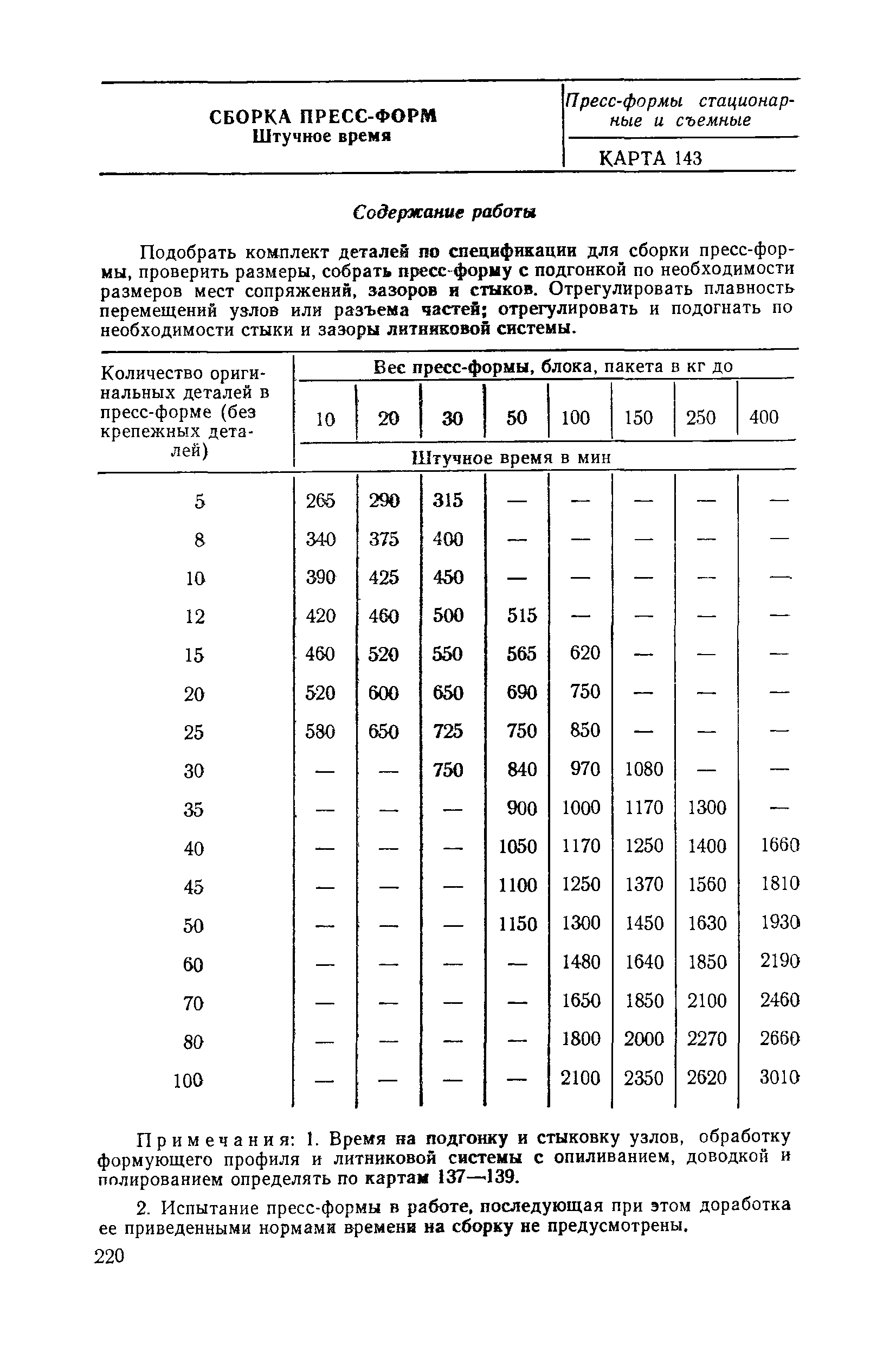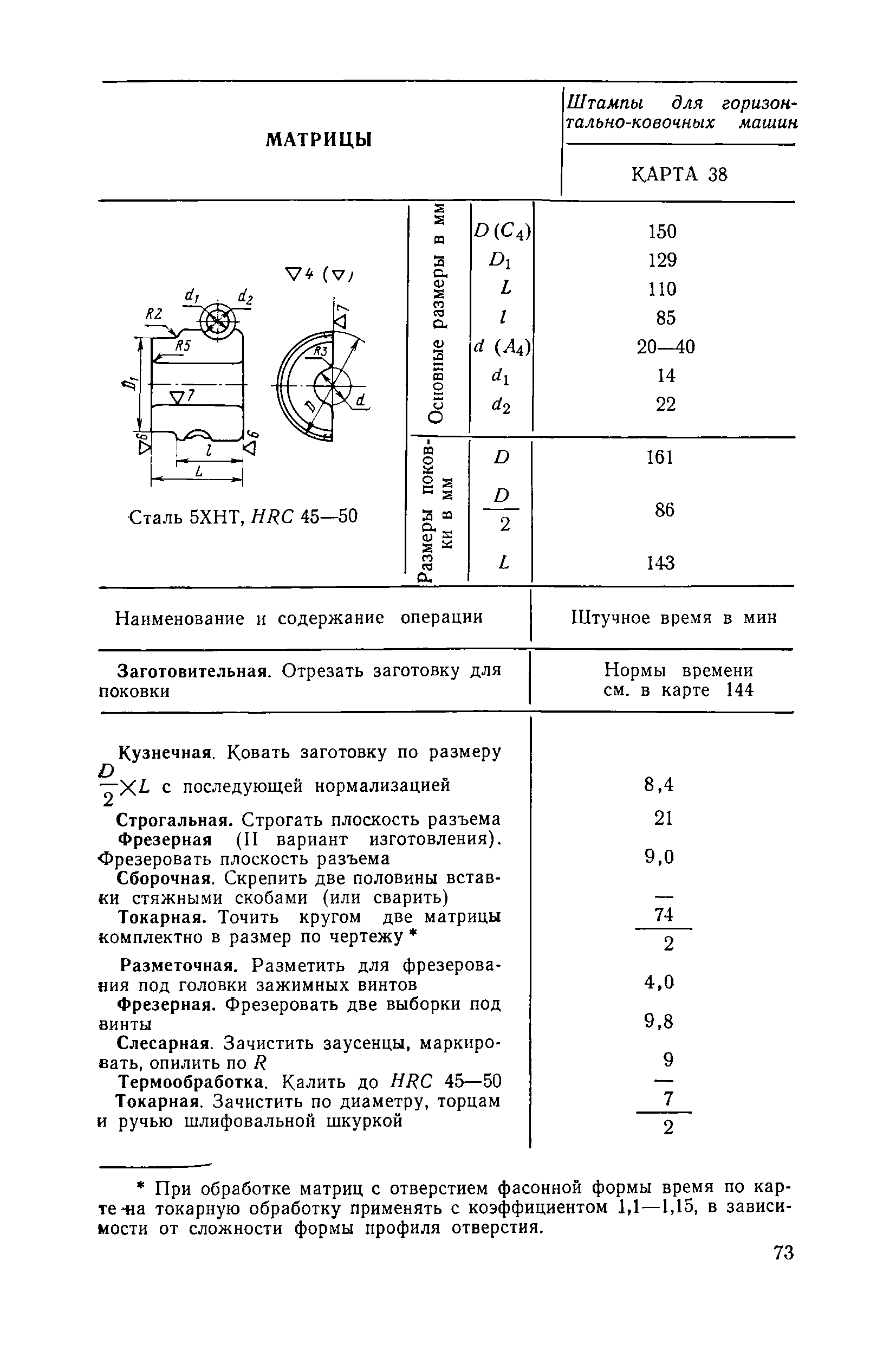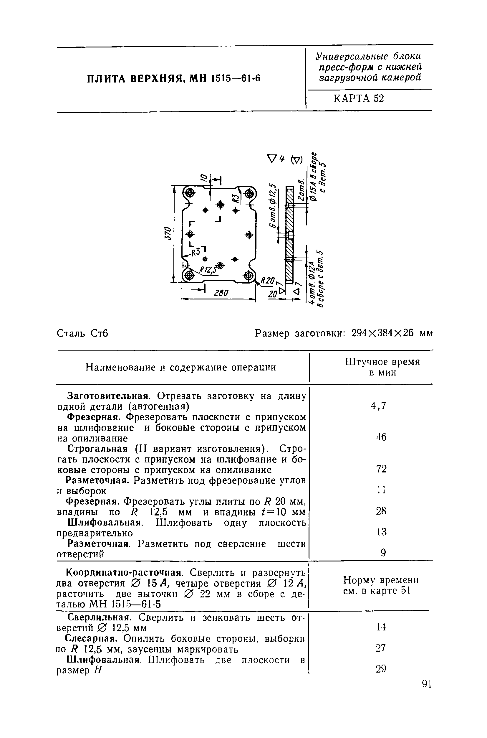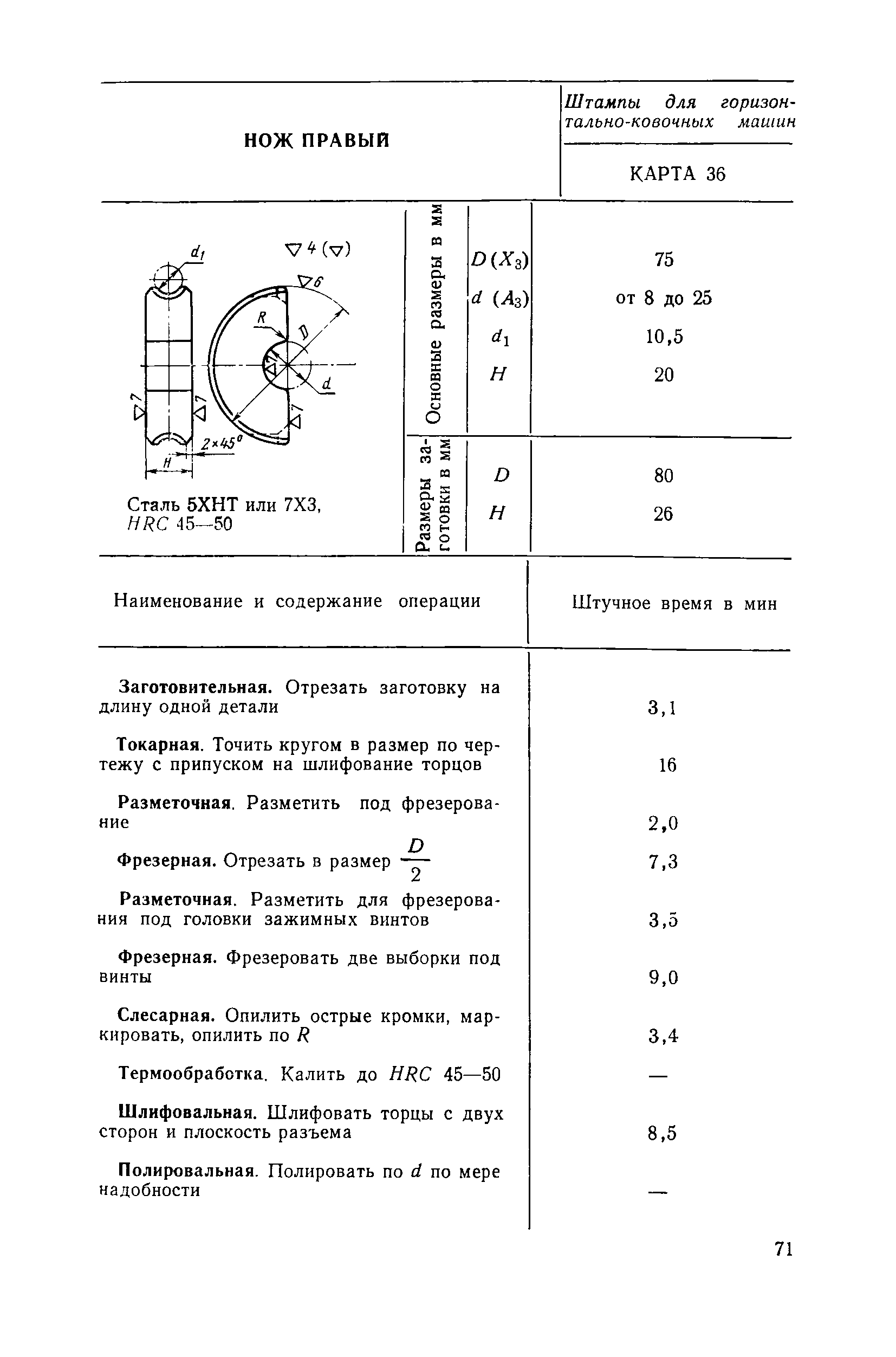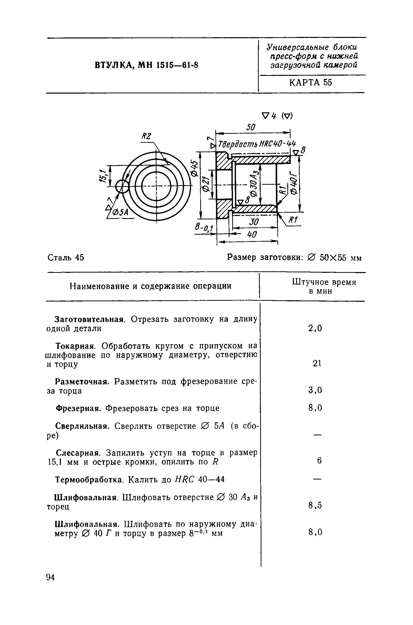 | Оглавление: | I. Типовые нормы времени на изготовление штампов II. Типовые нормы времени на изготовление пресс-форм Универсальные блоки пресс-форм с нижней загрузочной камерой Пакеты к блокам пресс-форм с нижней загрузочной камерой Пресс-формы съемные III. Нормативы неполного штучного времени и нормы времени на операции, не охваченные типовыми нормами времени IV. Подготовительно-заключительное время на партию Приложение 1. Штамп комбинированный, Трудоемкость изготовления Приложение 2. Пресс-формы для прессования изделий из реактопластов. Универсальные блоки с нижней загрузочной камерой, МН 1515-61. Трудоемкость изготовления Приложение 3. Пакеты к блокам пресс-форм с нижней загрузочной камерой, МН 1516-61 Приложение 4. Пресс-формы съемные круглые прямого прессования с двумя плоскостями разъема, МН 1452-61. Трудоемкость изготовления Приложение 5. Пресс-формы съемные прямоугольные литьевого прессования с двумя плоскостями разъема и двумя пуансонодержателями, МН 1461-61. Трудоемкость изготовления Приложение 6. Режимы резания, принятые при изготовлении штампов и пресс-форм Приложение 7. Припуски на механическую обработку Приложение 8. Перечень типовых моделей оборудования инструментального цеха штампов и пресс-форм Приложение 9. Теоретический вес заготовк |