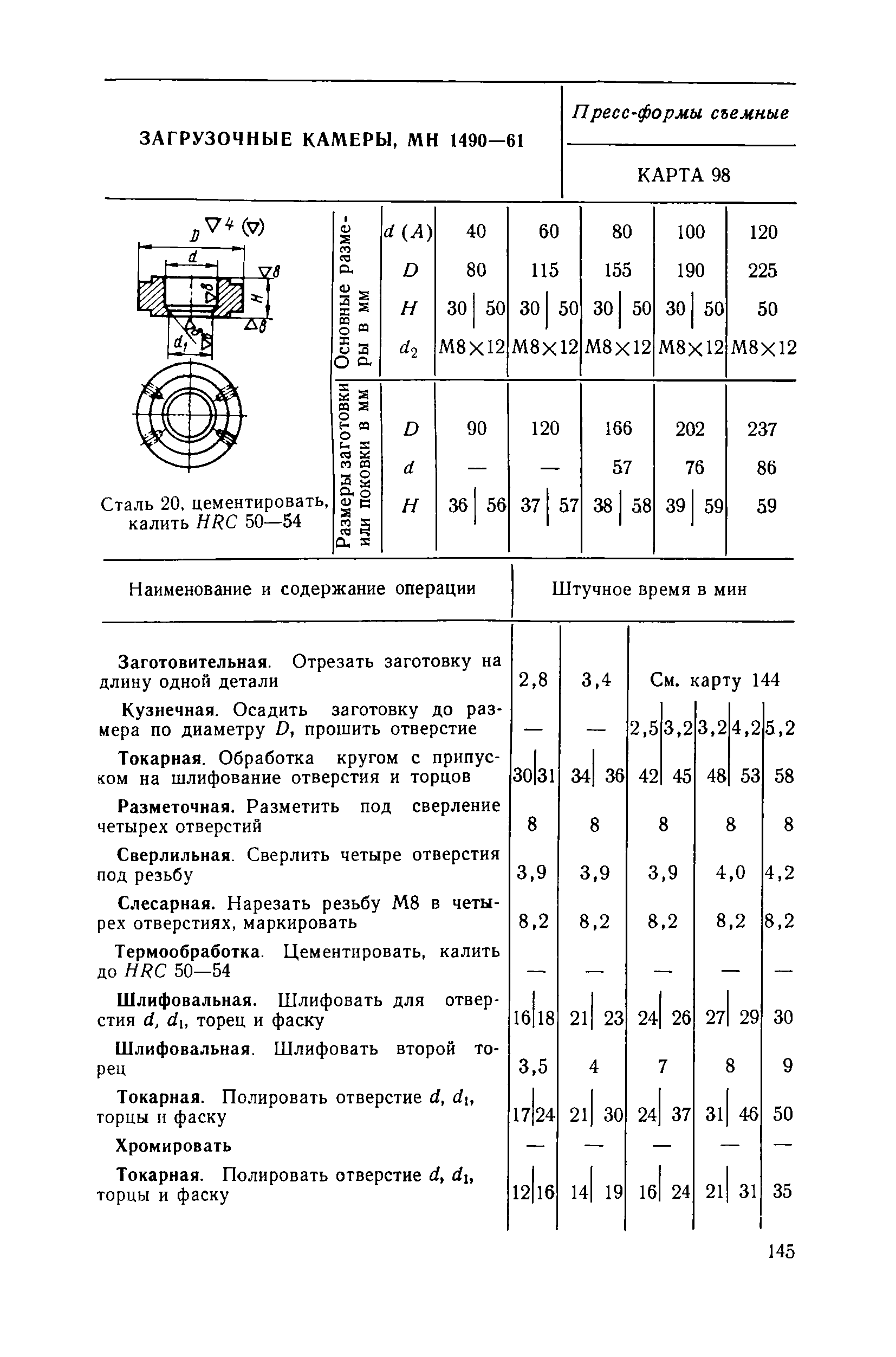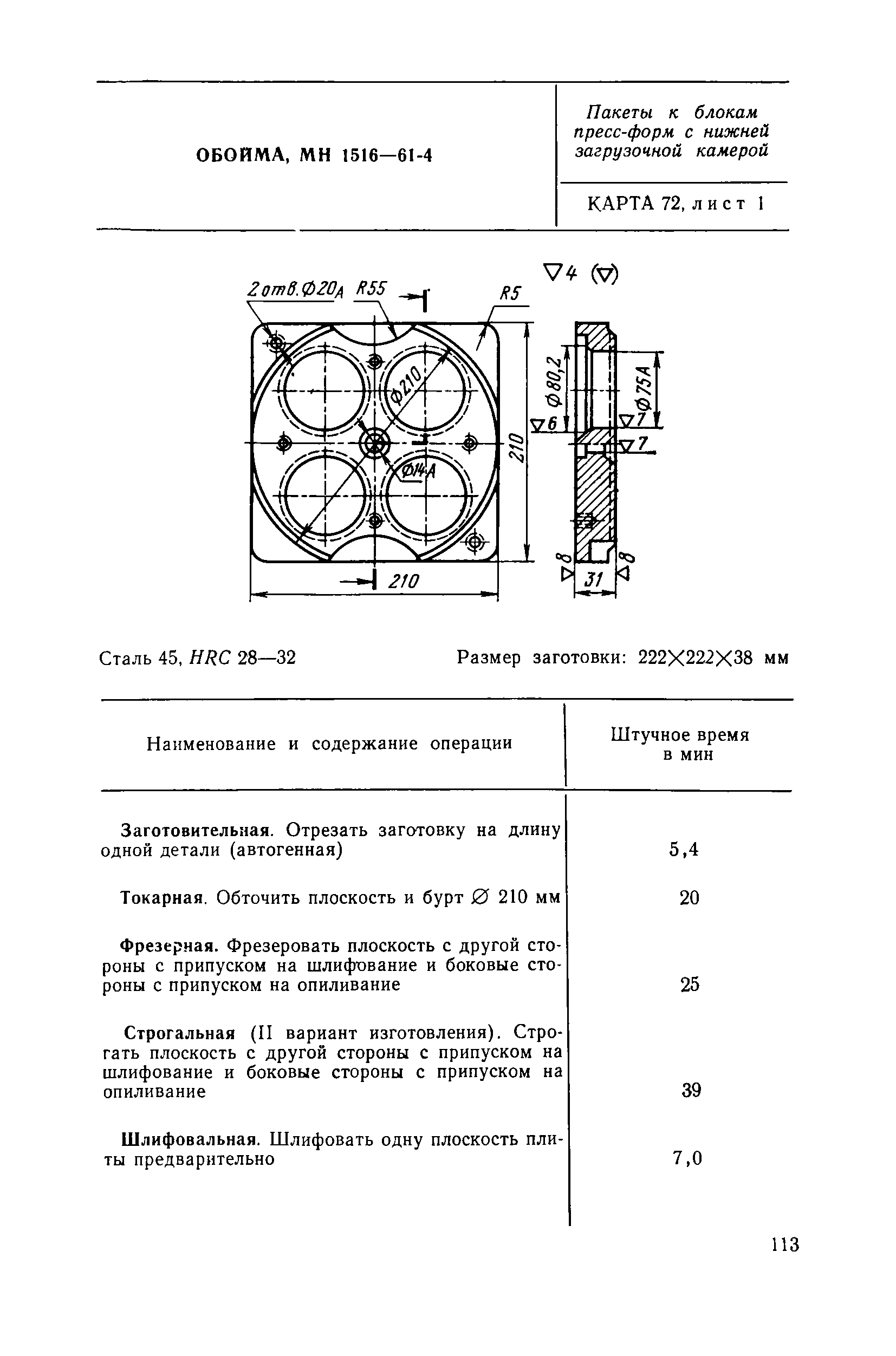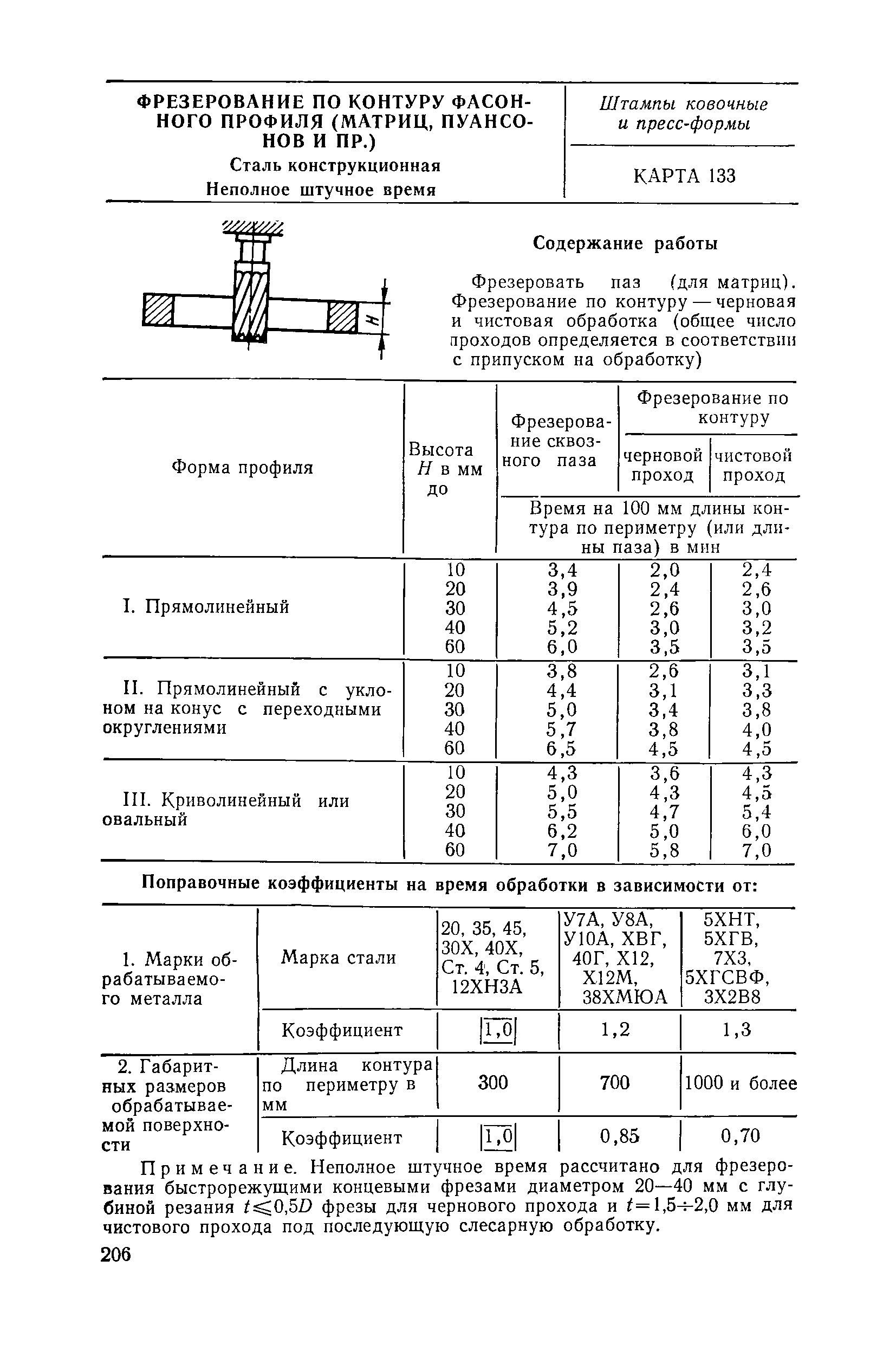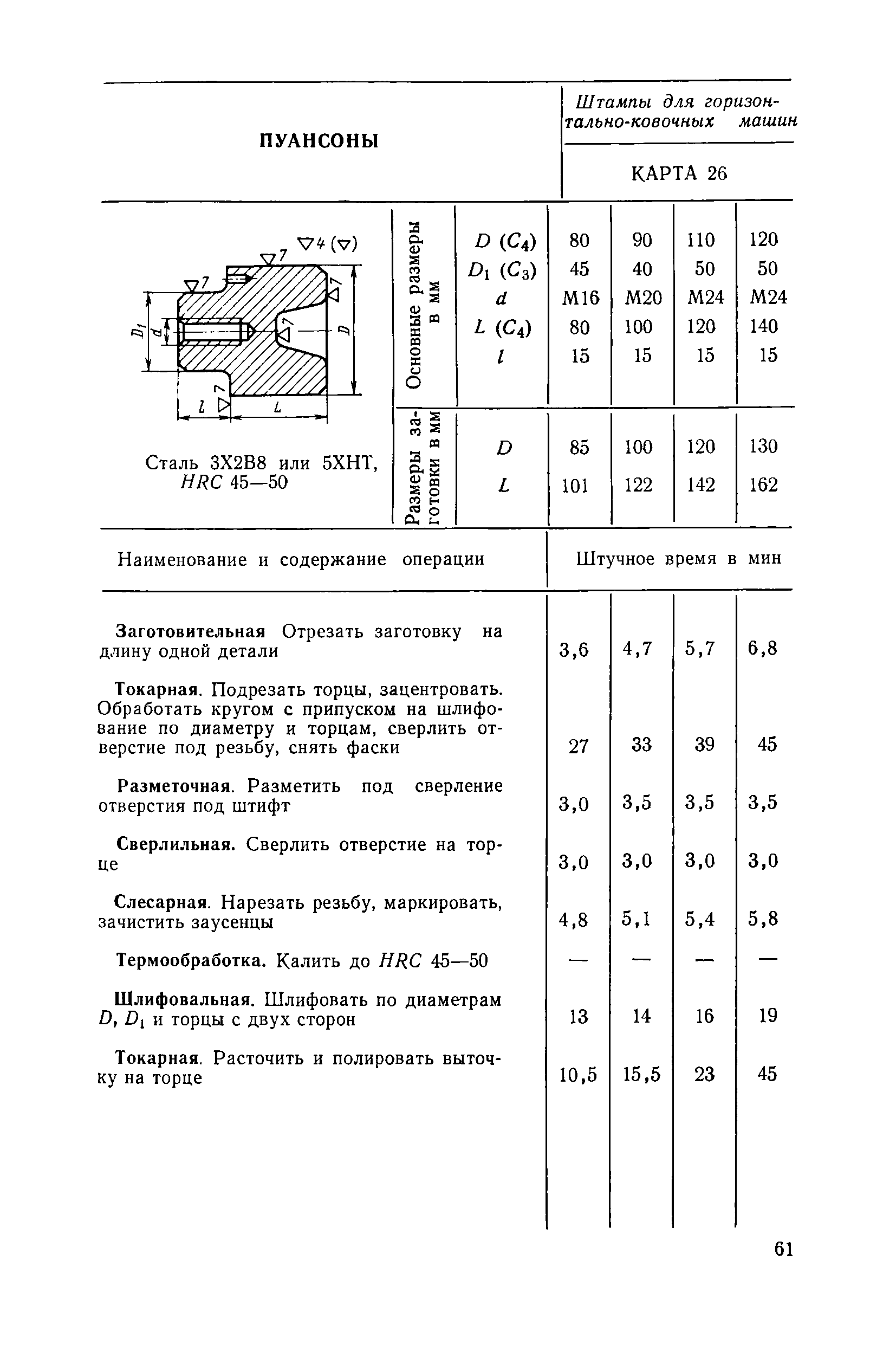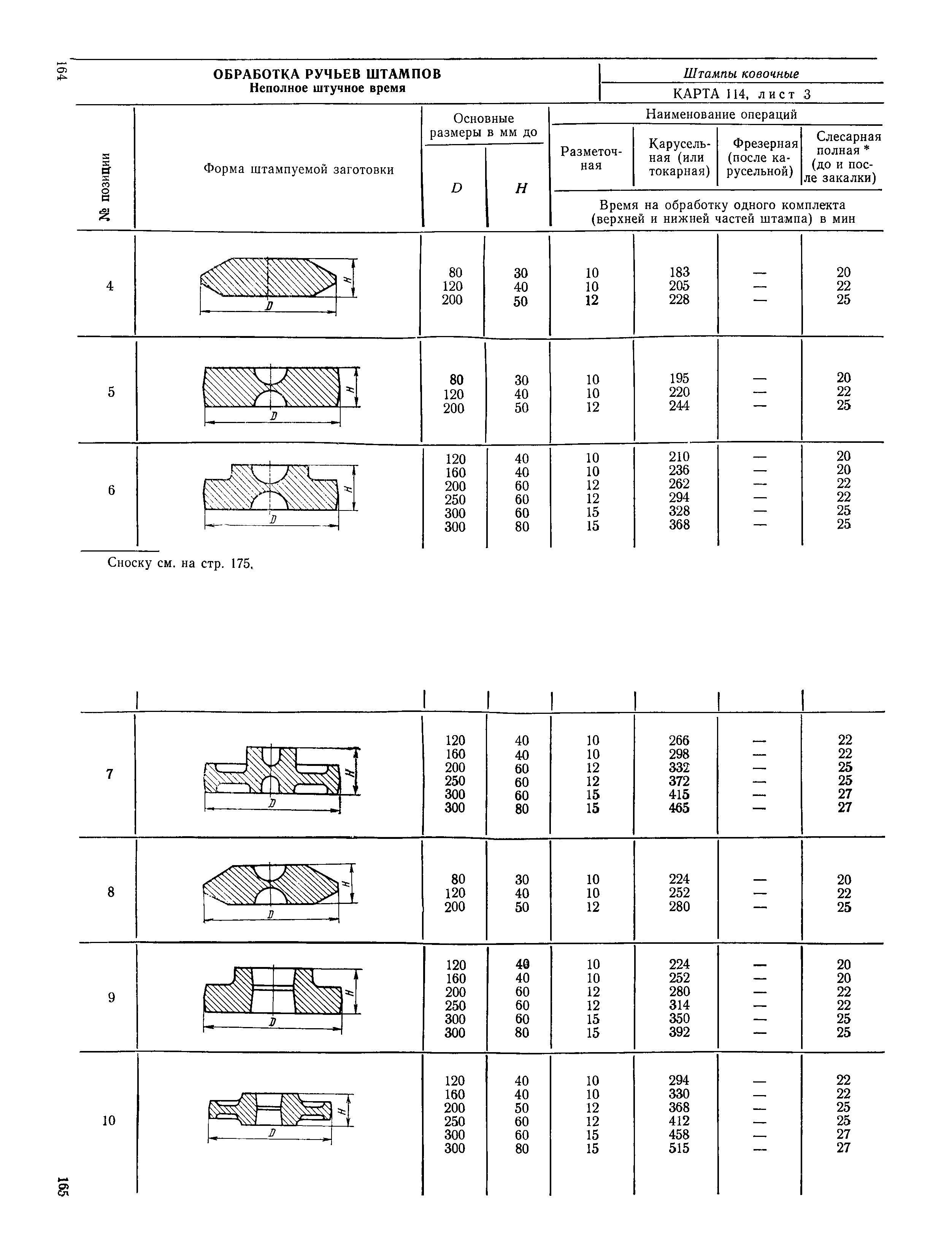 | Оглавление: | I. Типовые нормы времени на изготовление штампов II. Типовые нормы времени на изготовление пресс-форм Универсальные блоки пресс-форм с нижней загрузочной камерой Пакеты к блокам пресс-форм с нижней загрузочной камерой Пресс-формы съемные III. Нормативы неполного штучного времени и нормы времени на операции, не охваченные типовыми нормами времени IV. Подготовительно-заключительное время на партию Приложение 1. Штамп комбинированный, Трудоемкость изготовления Приложение 2. Пресс-формы для прессования изделий из реактопластов. Универсальные блоки с нижней загрузочной камерой, МН 1515-61. Трудоемкость изготовления Приложение 3. Пакеты к блокам пресс-форм с нижней загрузочной камерой, МН 1516-61 Приложение 4. Пресс-формы съемные круглые прямого прессования с двумя плоскостями разъема, МН 1452-61. Трудоемкость изготовления Приложение 5. Пресс-формы съемные прямоугольные литьевого прессования с двумя плоскостями разъема и двумя пуансонодержателями, МН 1461-61. Трудоемкость изготовления Приложение 6. Режимы резания, принятые при изготовлении штампов и пресс-форм Приложение 7. Припуски на механическую обработку Приложение 8. Перечень типовых моделей оборудования инструментального цеха штампов и пресс-форм Приложение 9. Теоретический вес заготовк |