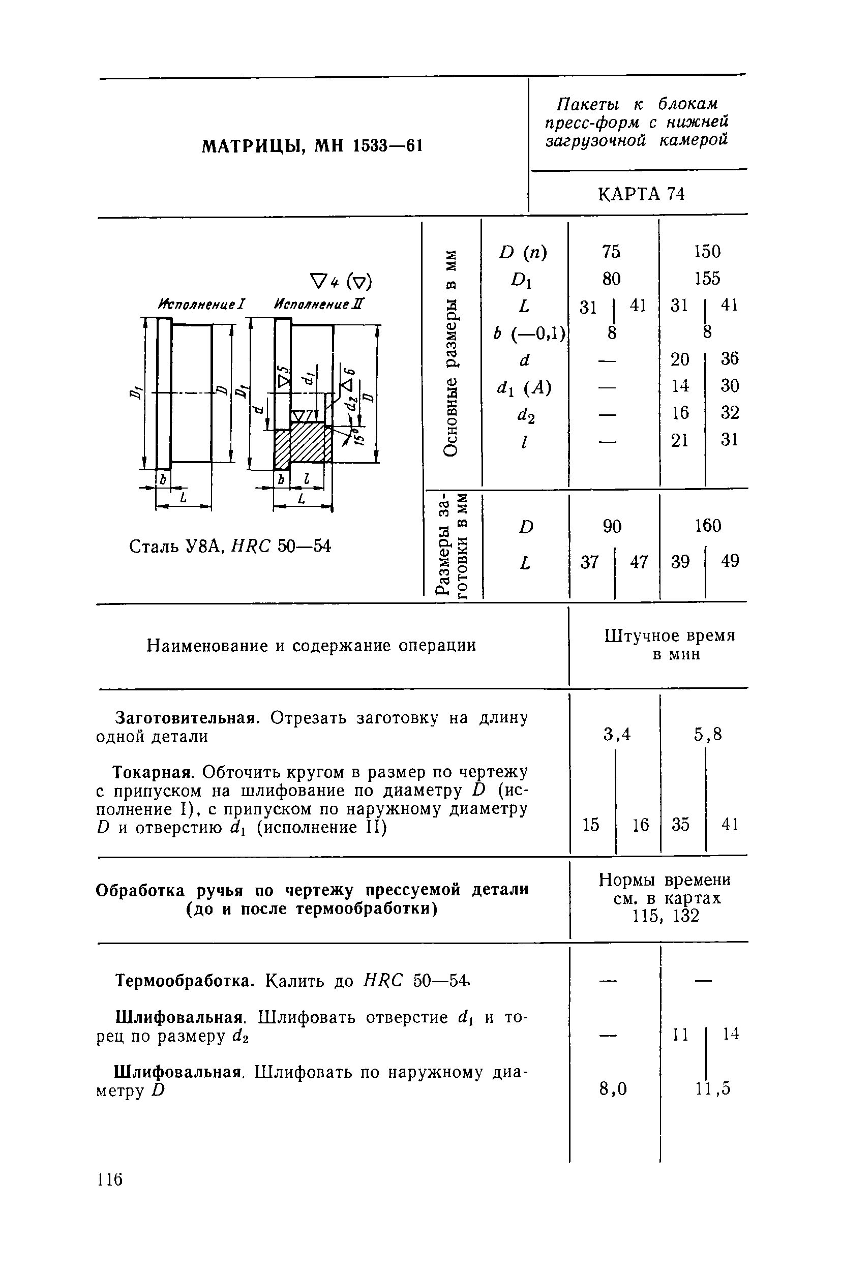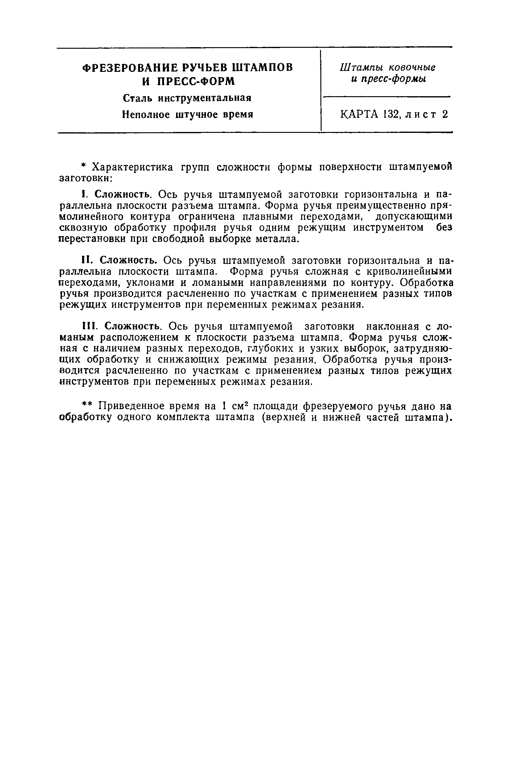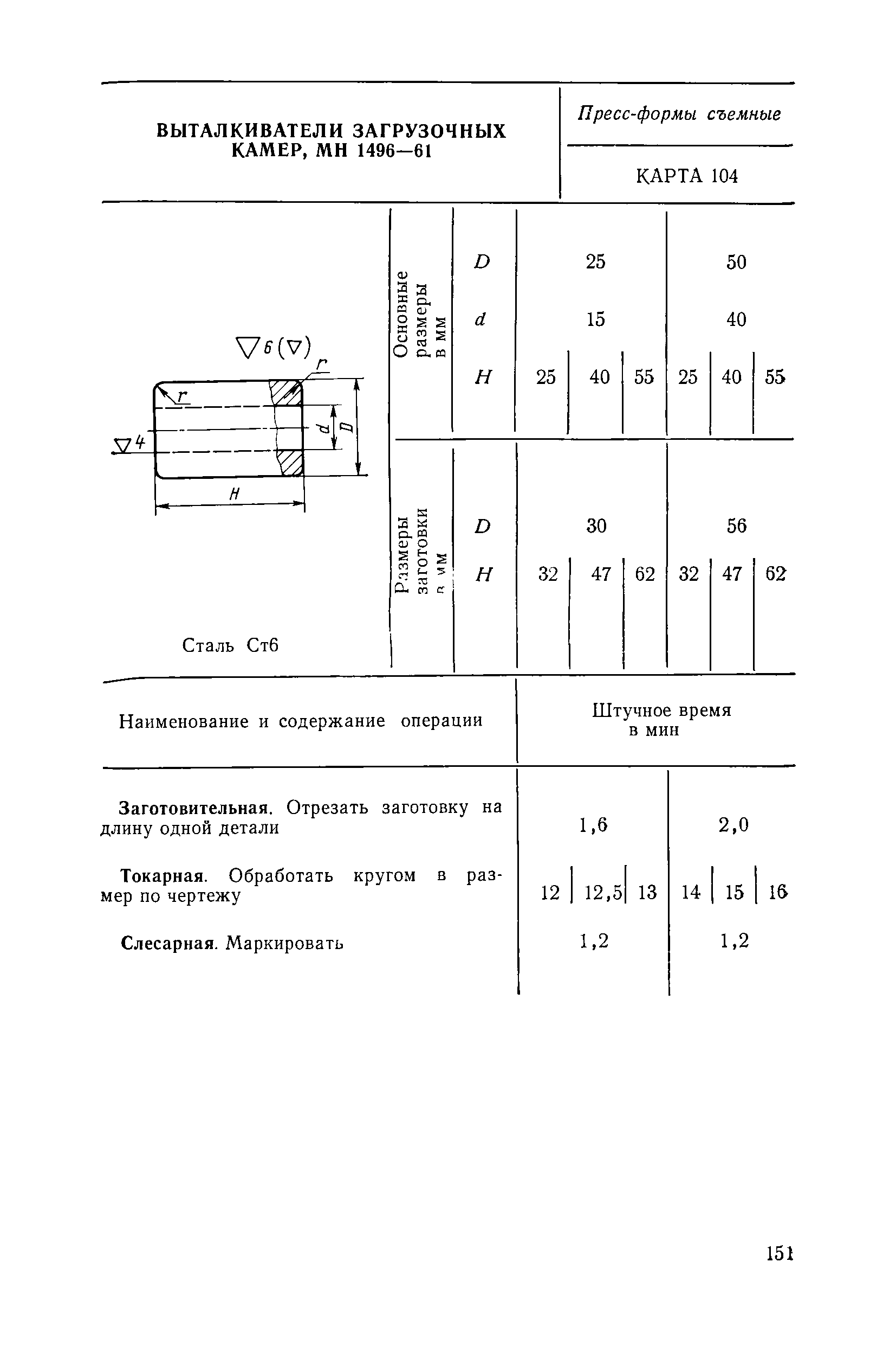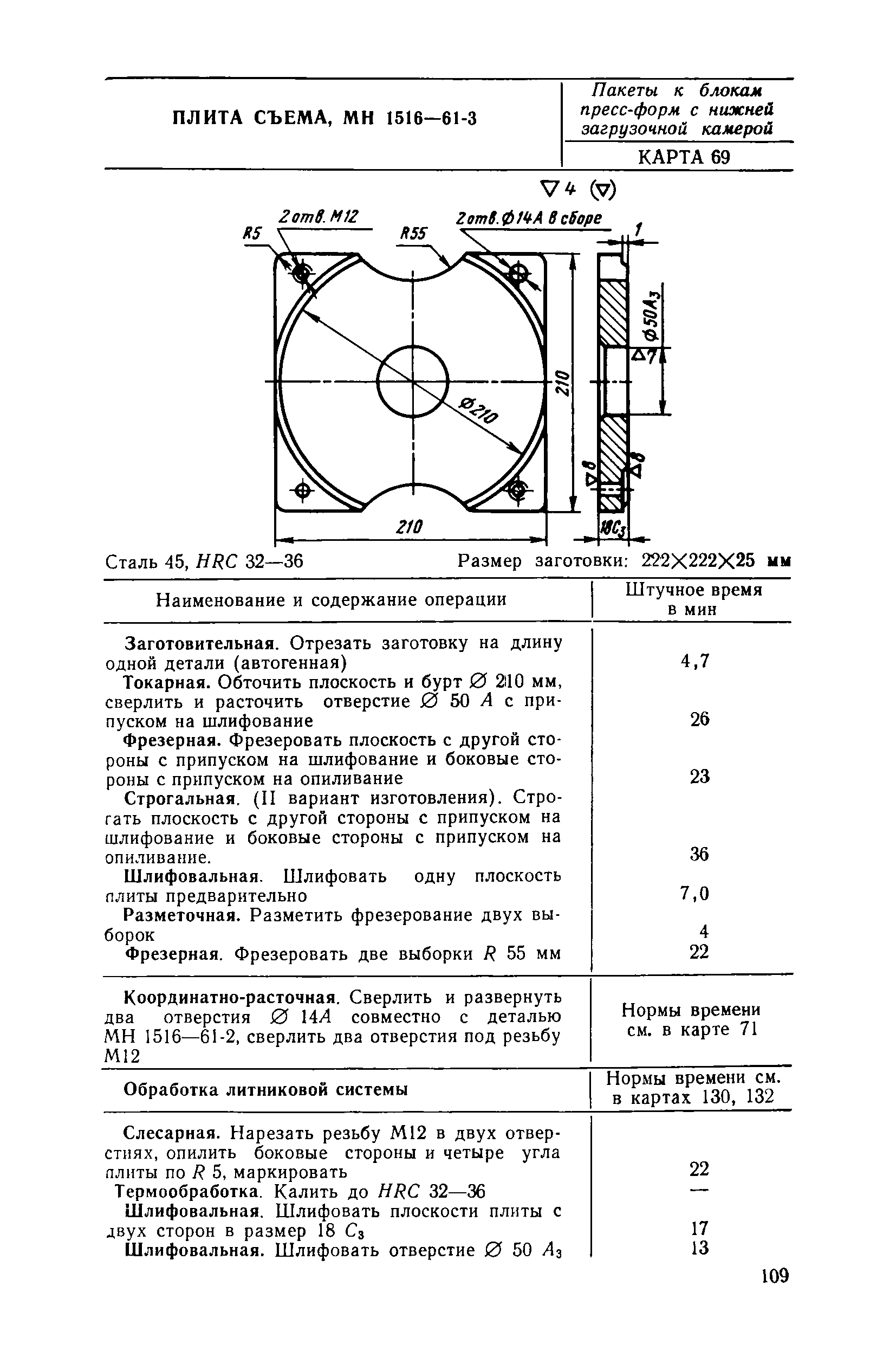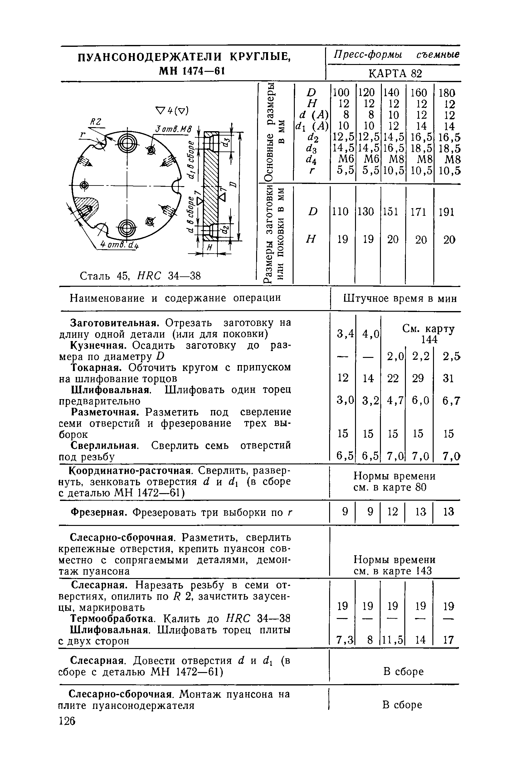 | Оглавление: | I. Типовые нормы времени на изготовление штампов II. Типовые нормы времени на изготовление пресс-форм Универсальные блоки пресс-форм с нижней загрузочной камерой Пакеты к блокам пресс-форм с нижней загрузочной камерой Пресс-формы съемные III. Нормативы неполного штучного времени и нормы времени на операции, не охваченные типовыми нормами времени IV. Подготовительно-заключительное время на партию Приложение 1. Штамп комбинированный, Трудоемкость изготовления Приложение 2. Пресс-формы для прессования изделий из реактопластов. Универсальные блоки с нижней загрузочной камерой, МН 1515-61. Трудоемкость изготовления Приложение 3. Пакеты к блокам пресс-форм с нижней загрузочной камерой, МН 1516-61 Приложение 4. Пресс-формы съемные круглые прямого прессования с двумя плоскостями разъема, МН 1452-61. Трудоемкость изготовления Приложение 5. Пресс-формы съемные прямоугольные литьевого прессования с двумя плоскостями разъема и двумя пуансонодержателями, МН 1461-61. Трудоемкость изготовления Приложение 6. Режимы резания, принятые при изготовлении штампов и пресс-форм Приложение 7. Припуски на механическую обработку Приложение 8. Перечень типовых моделей оборудования инструментального цеха штампов и пресс-форм Приложение 9. Теоретический вес заготовк |