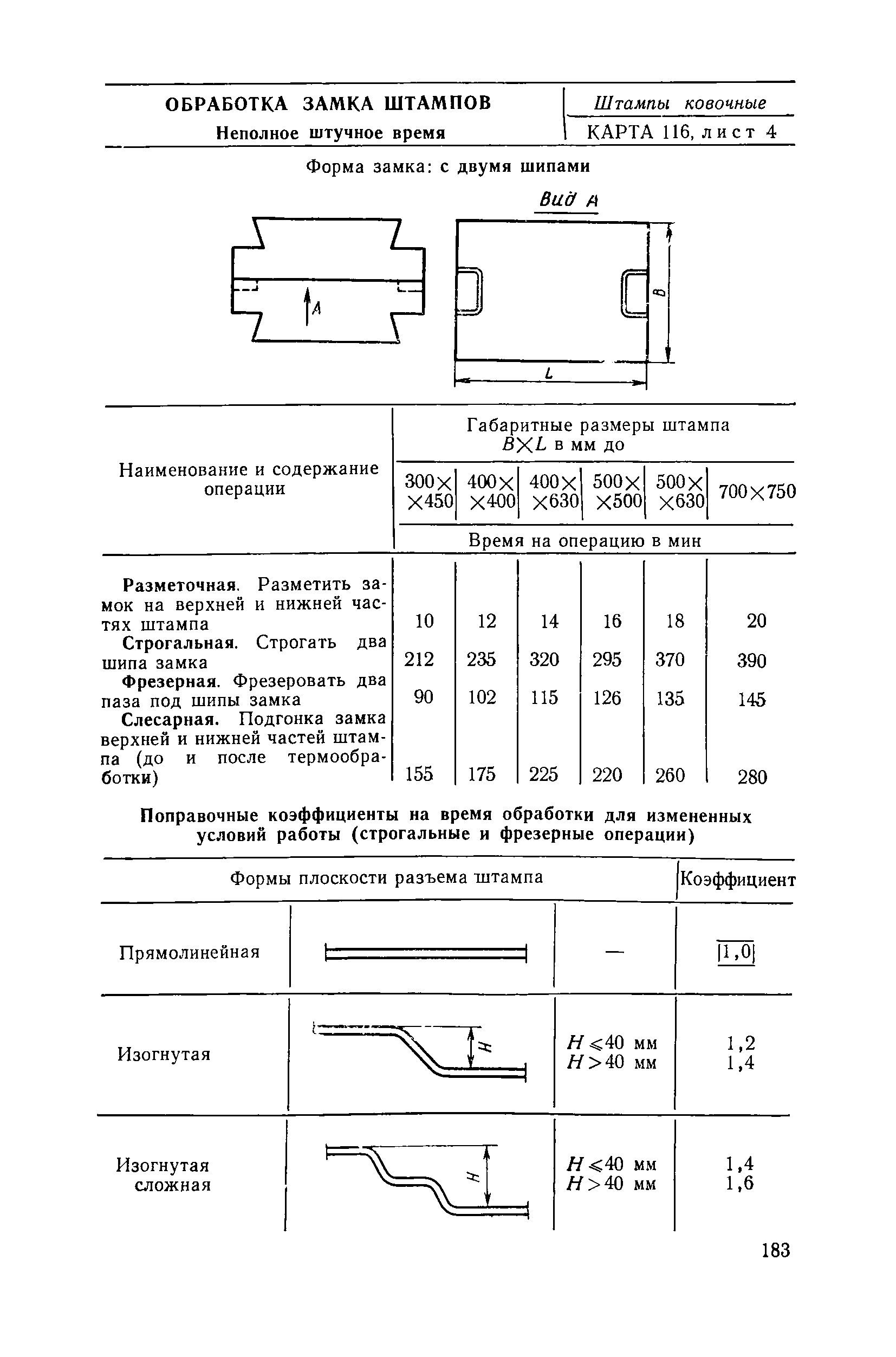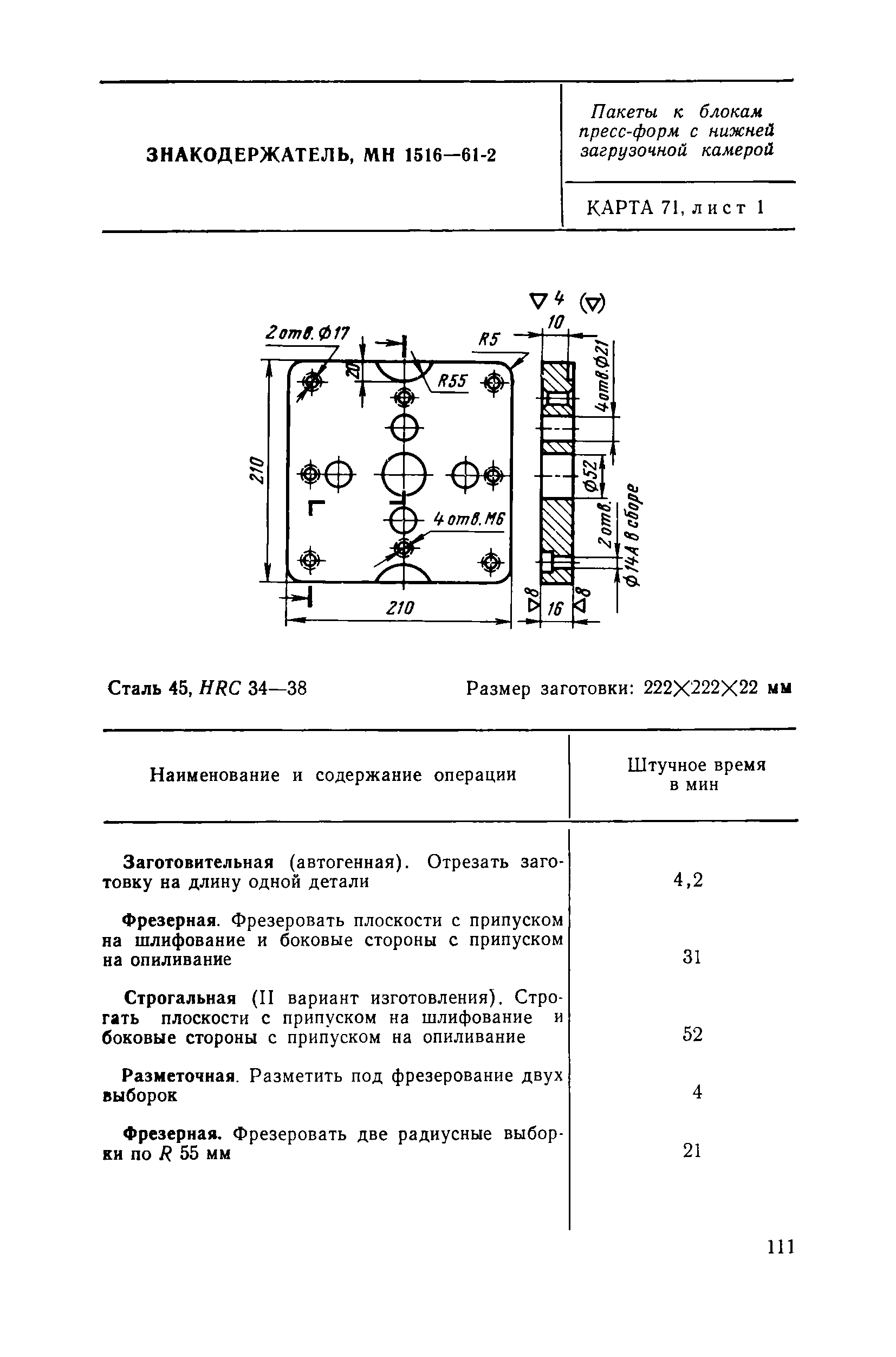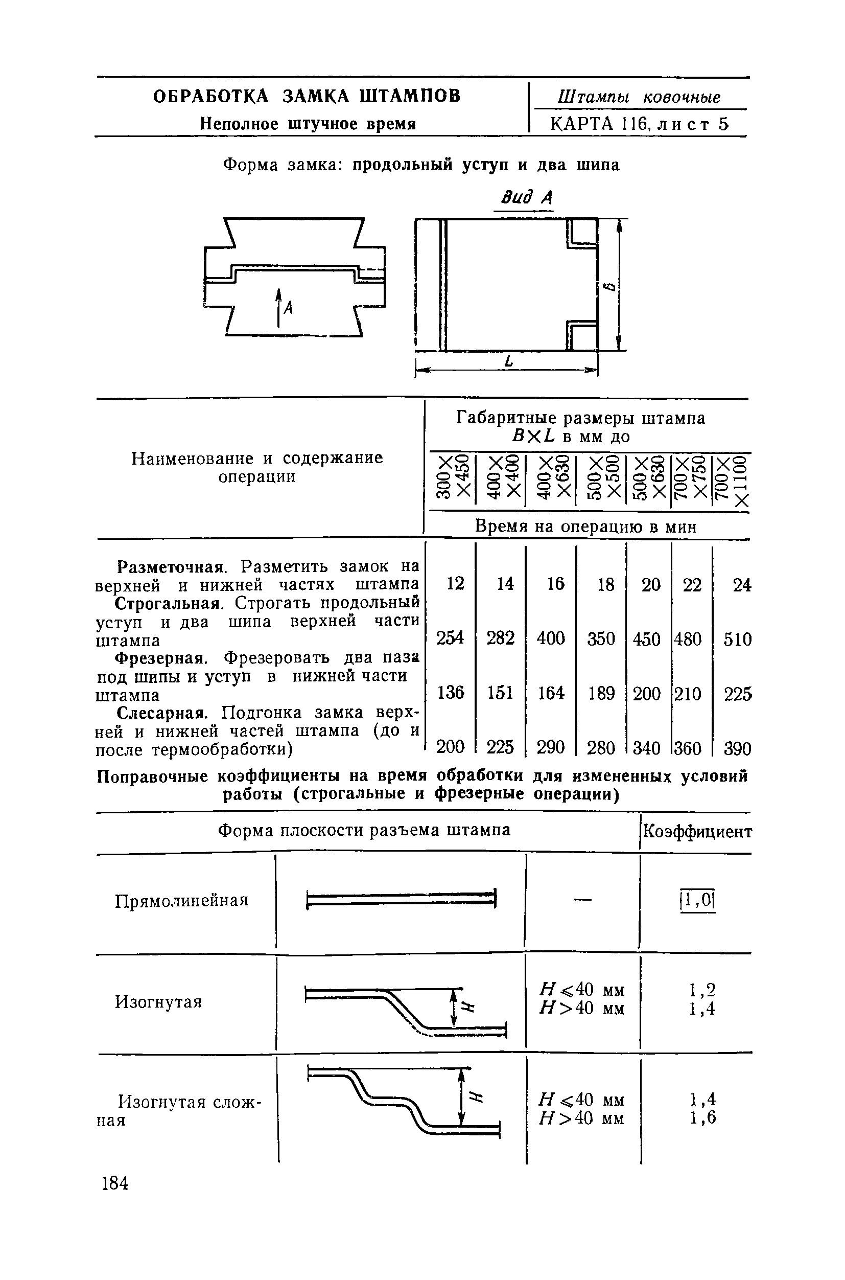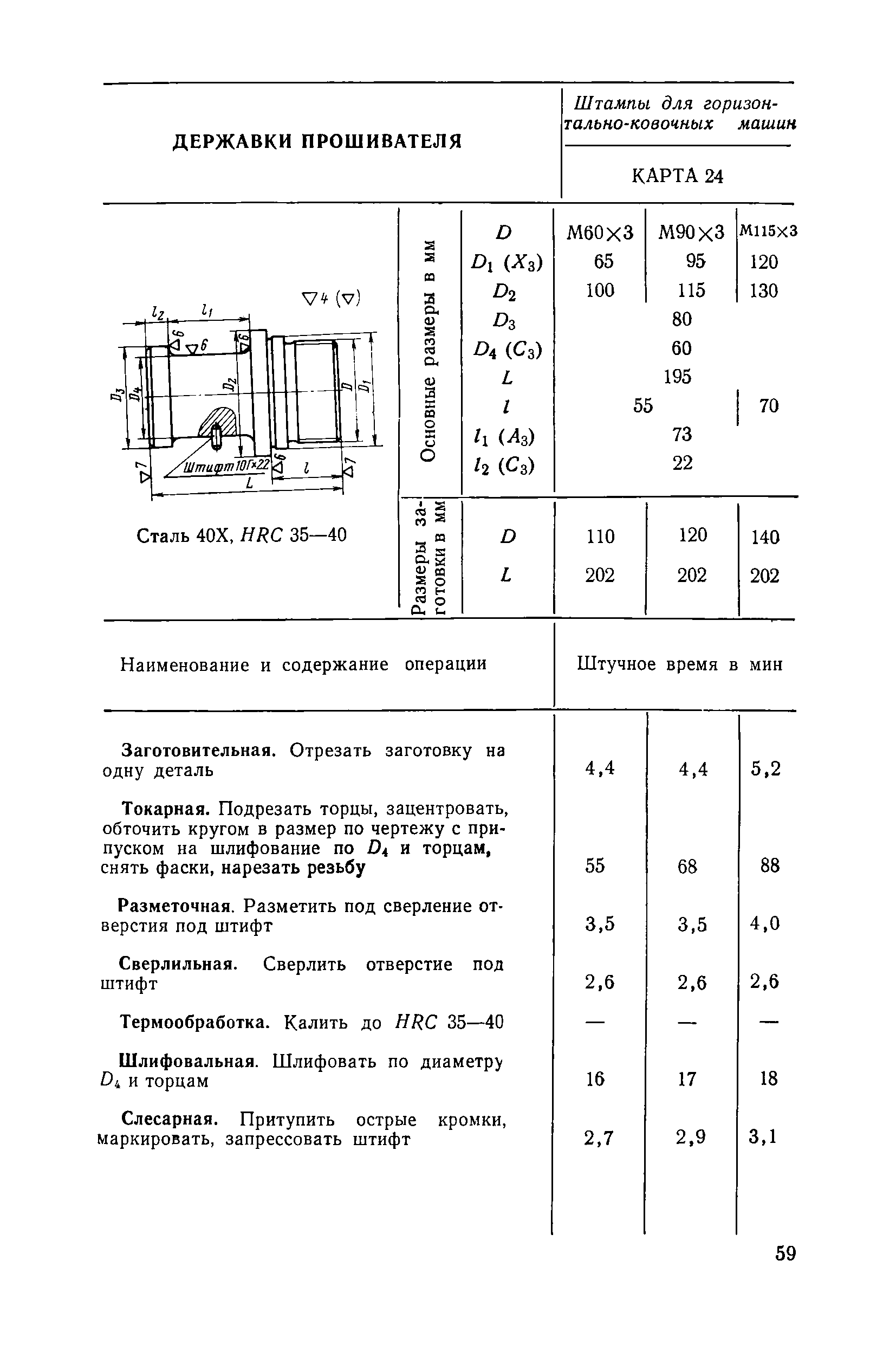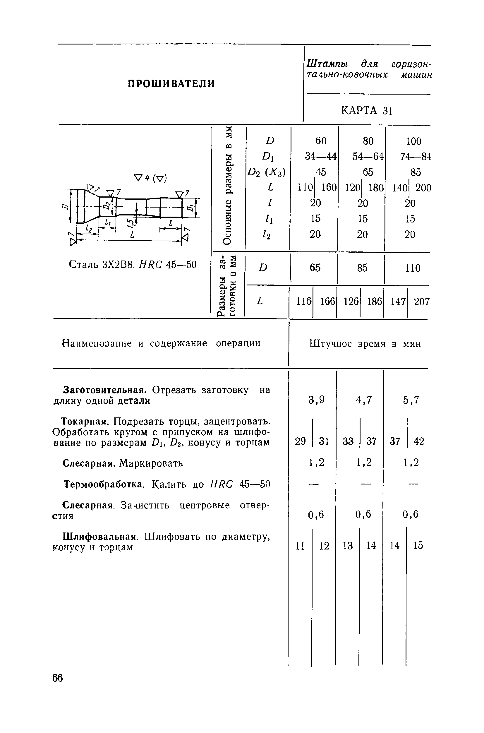 | Оглавление: | I. Типовые нормы времени на изготовление штампов II. Типовые нормы времени на изготовление пресс-форм Универсальные блоки пресс-форм с нижней загрузочной камерой Пакеты к блокам пресс-форм с нижней загрузочной камерой Пресс-формы съемные III. Нормативы неполного штучного времени и нормы времени на операции, не охваченные типовыми нормами времени IV. Подготовительно-заключительное время на партию Приложение 1. Штамп комбинированный, Трудоемкость изготовления Приложение 2. Пресс-формы для прессования изделий из реактопластов. Универсальные блоки с нижней загрузочной камерой, МН 1515-61. Трудоемкость изготовления Приложение 3. Пакеты к блокам пресс-форм с нижней загрузочной камерой, МН 1516-61 Приложение 4. Пресс-формы съемные круглые прямого прессования с двумя плоскостями разъема, МН 1452-61. Трудоемкость изготовления Приложение 5. Пресс-формы съемные прямоугольные литьевого прессования с двумя плоскостями разъема и двумя пуансонодержателями, МН 1461-61. Трудоемкость изготовления Приложение 6. Режимы резания, принятые при изготовлении штампов и пресс-форм Приложение 7. Припуски на механическую обработку Приложение 8. Перечень типовых моделей оборудования инструментального цеха штампов и пресс-форм Приложение 9. Теоретический вес заготовк |