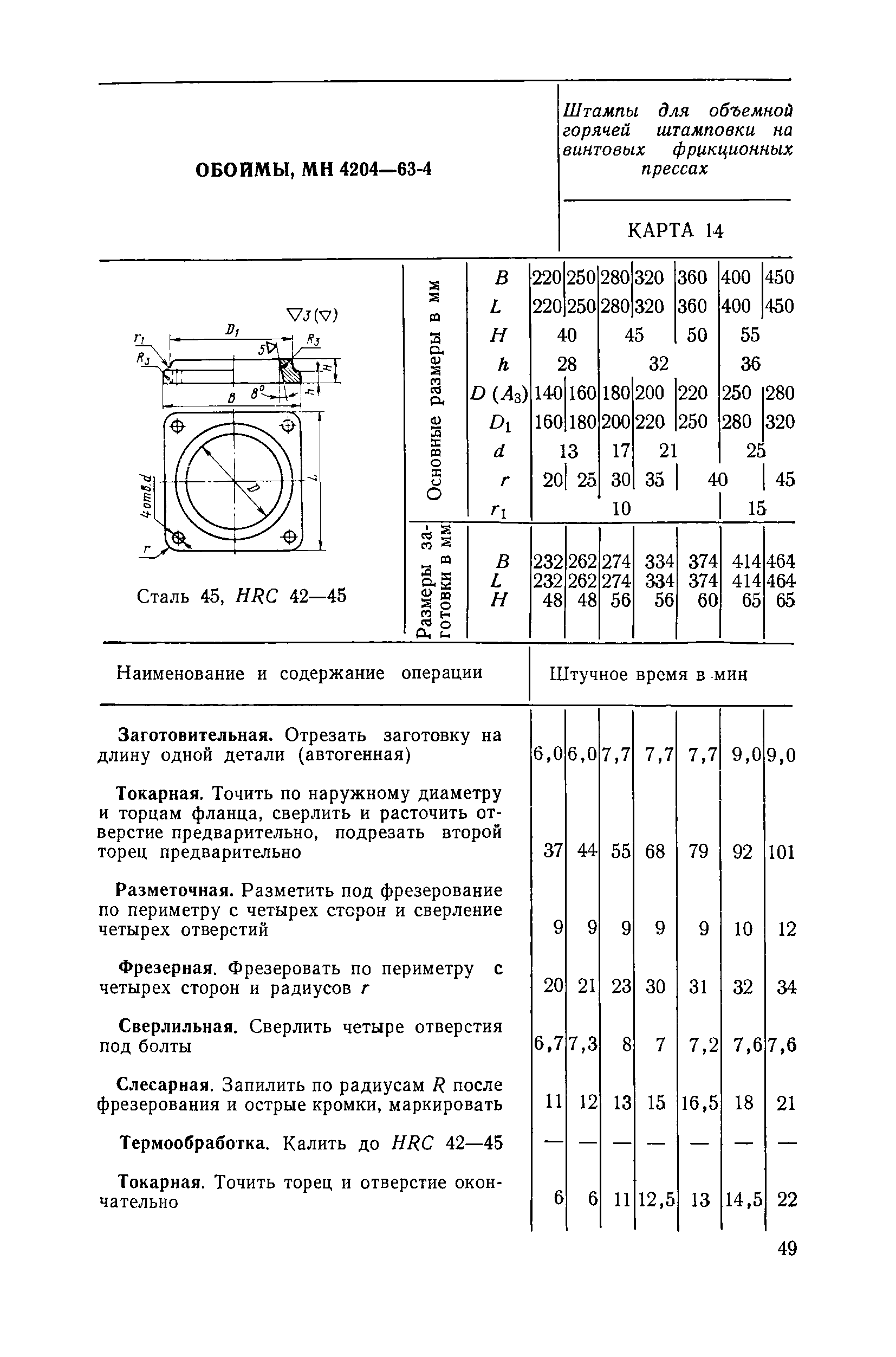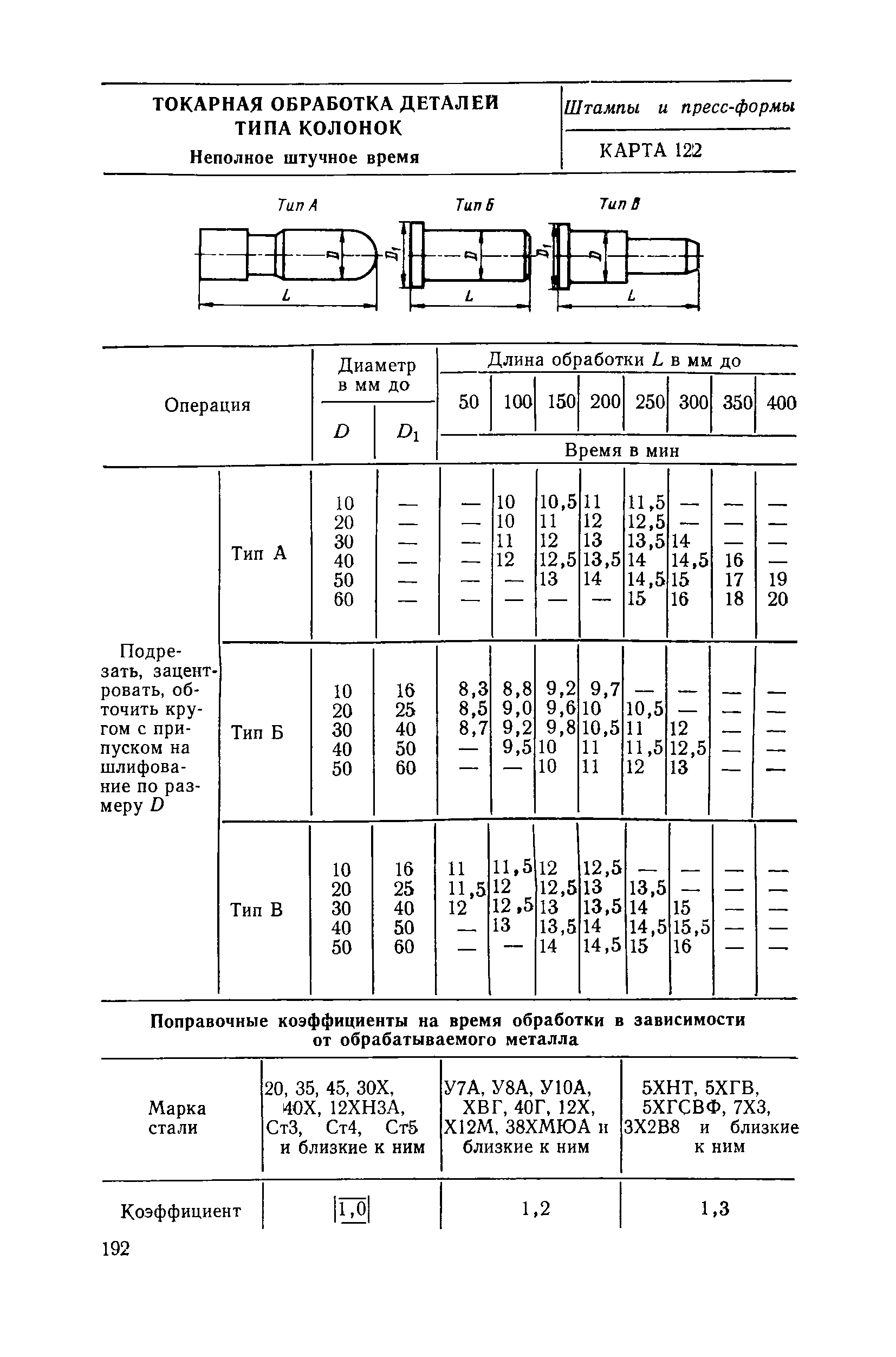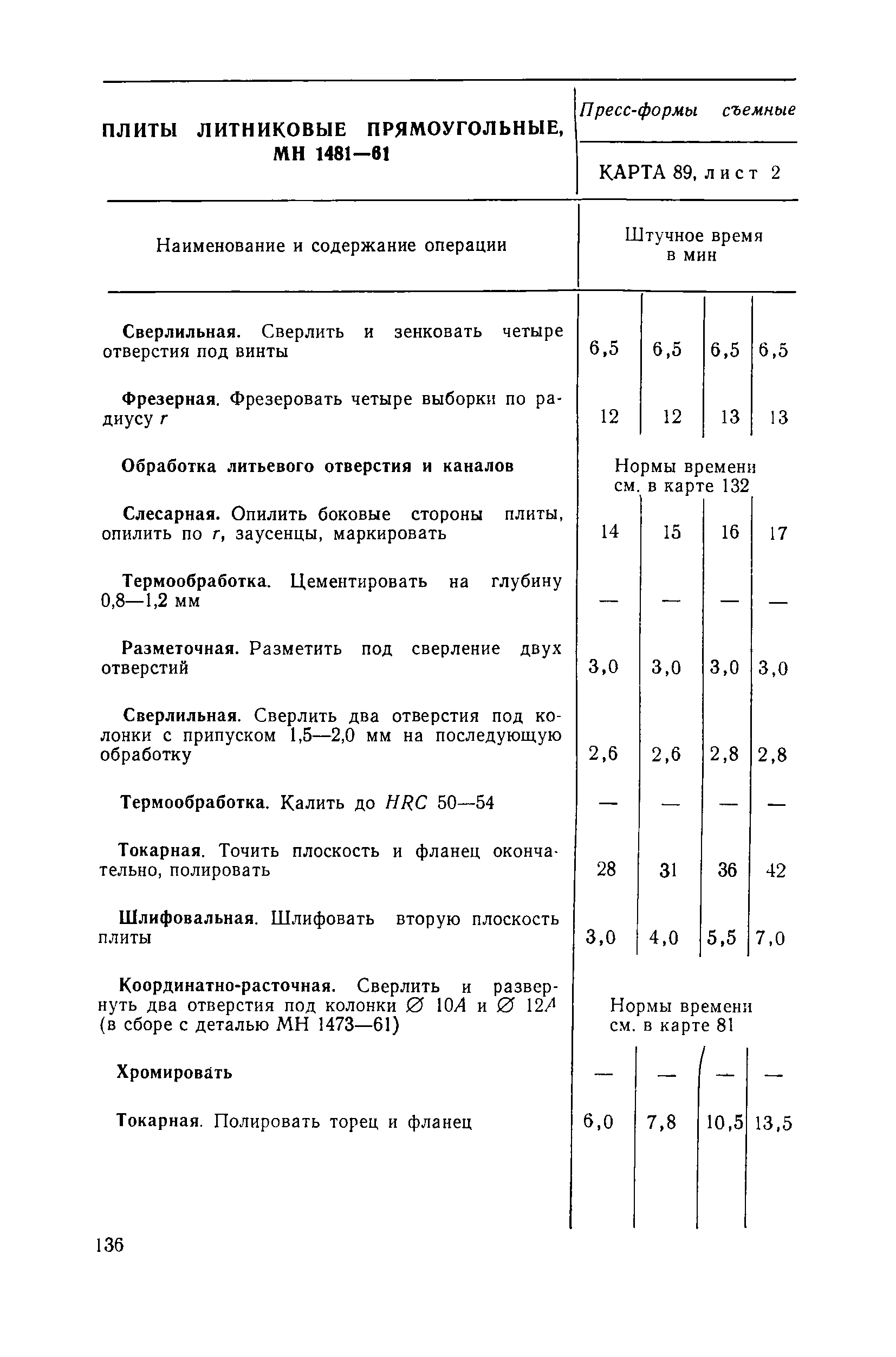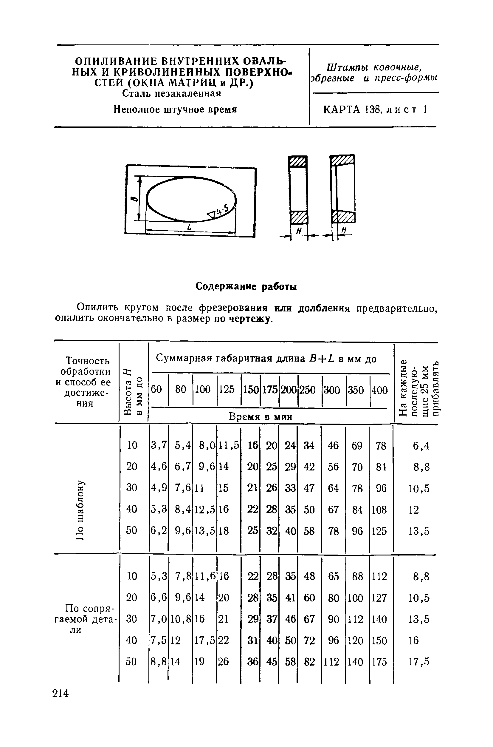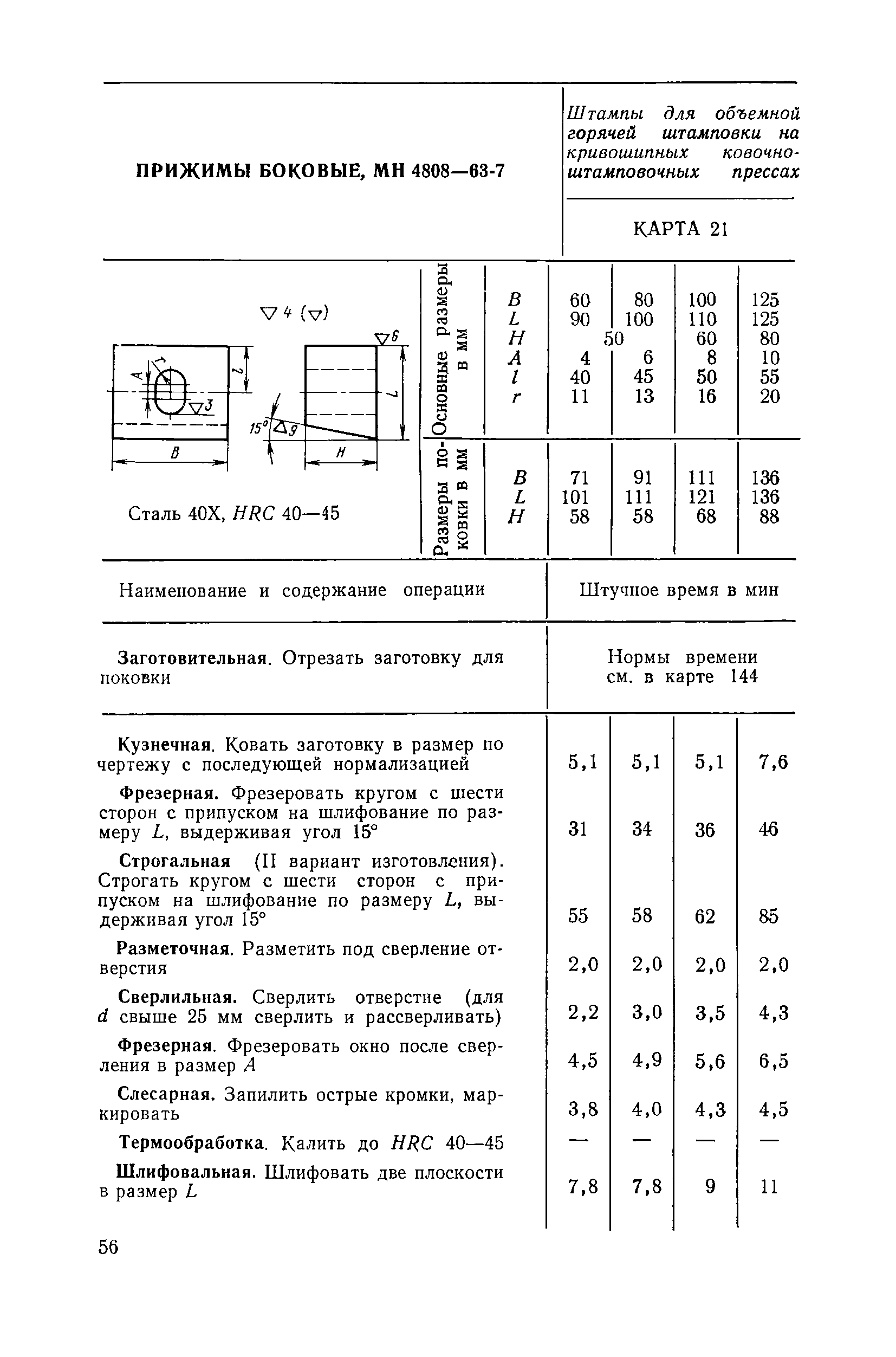 | Оглавление: | I. Типовые нормы времени на изготовление штампов II. Типовые нормы времени на изготовление пресс-форм Универсальные блоки пресс-форм с нижней загрузочной камерой Пакеты к блокам пресс-форм с нижней загрузочной камерой Пресс-формы съемные III. Нормативы неполного штучного времени и нормы времени на операции, не охваченные типовыми нормами времени IV. Подготовительно-заключительное время на партию Приложение 1. Штамп комбинированный, Трудоемкость изготовления Приложение 2. Пресс-формы для прессования изделий из реактопластов. Универсальные блоки с нижней загрузочной камерой, МН 1515-61. Трудоемкость изготовления Приложение 3. Пакеты к блокам пресс-форм с нижней загрузочной камерой, МН 1516-61 Приложение 4. Пресс-формы съемные круглые прямого прессования с двумя плоскостями разъема, МН 1452-61. Трудоемкость изготовления Приложение 5. Пресс-формы съемные прямоугольные литьевого прессования с двумя плоскостями разъема и двумя пуансонодержателями, МН 1461-61. Трудоемкость изготовления Приложение 6. Режимы резания, принятые при изготовлении штампов и пресс-форм Приложение 7. Припуски на механическую обработку Приложение 8. Перечень типовых моделей оборудования инструментального цеха штампов и пресс-форм Приложение 9. Теоретический вес заготовк |