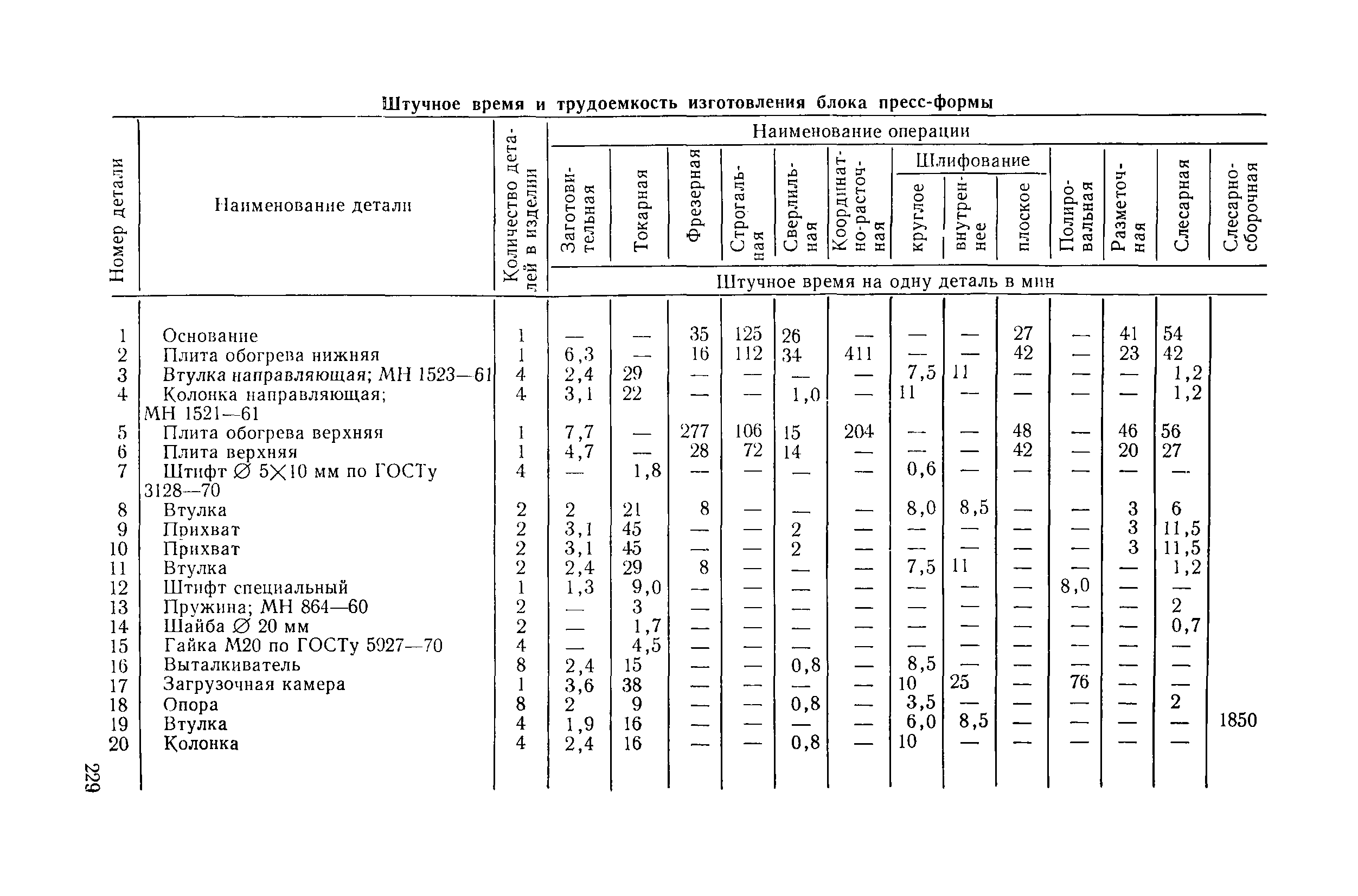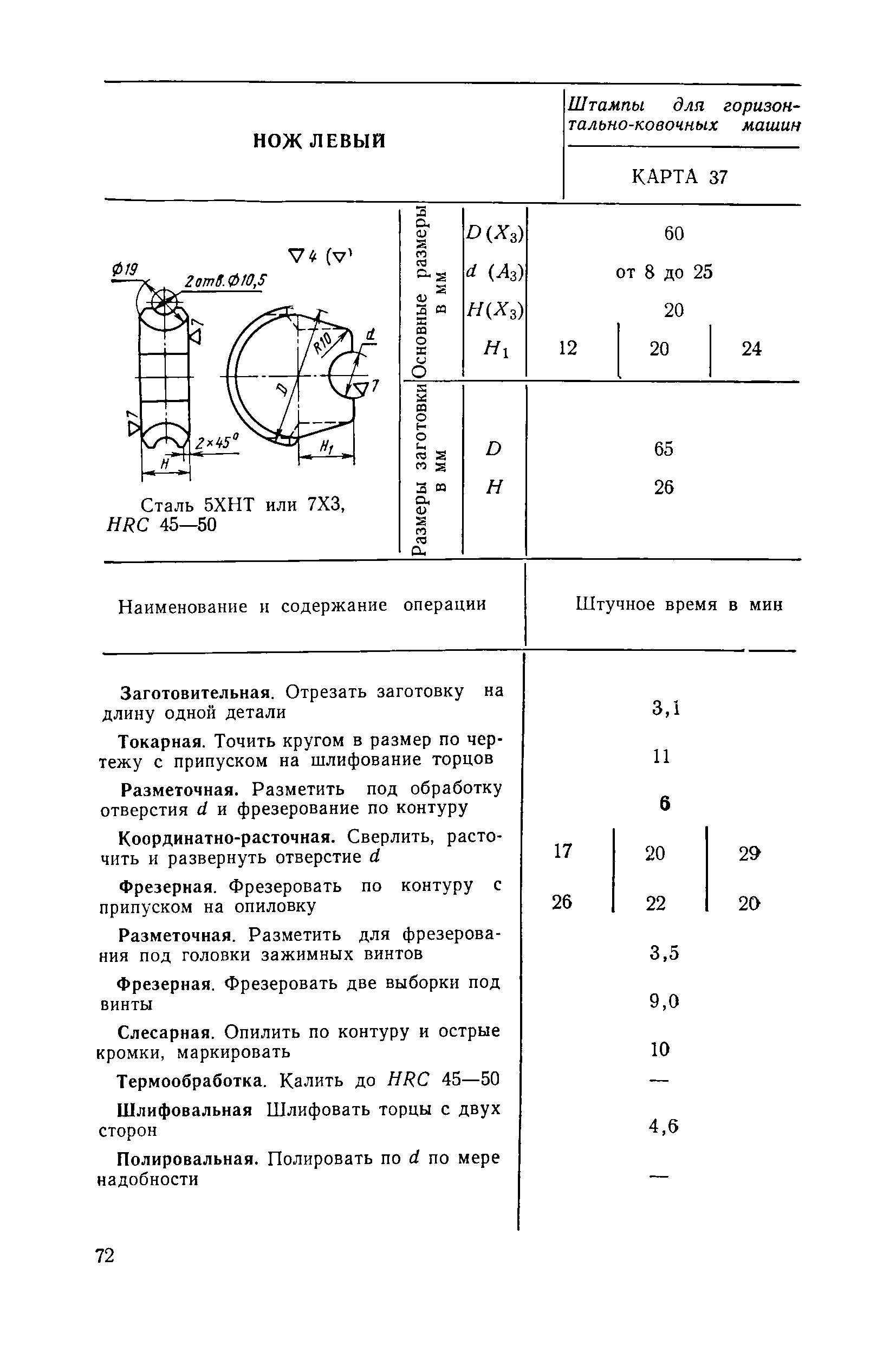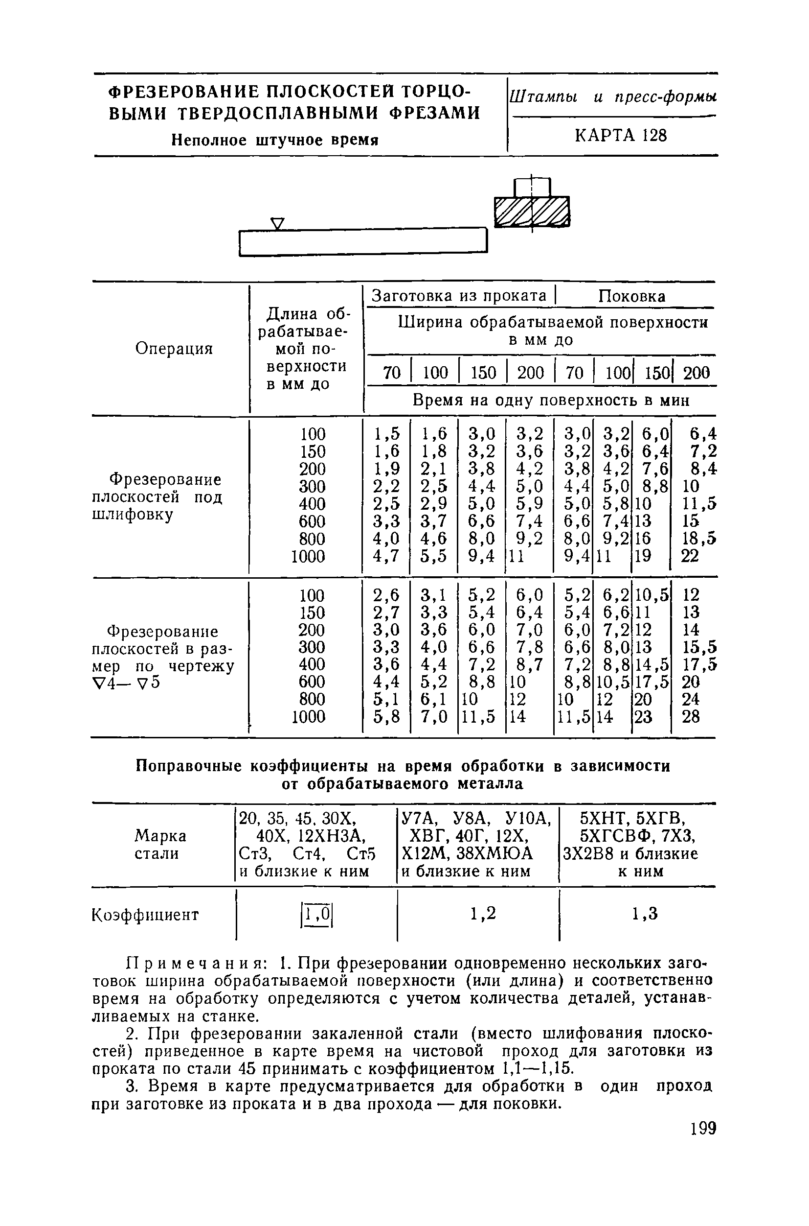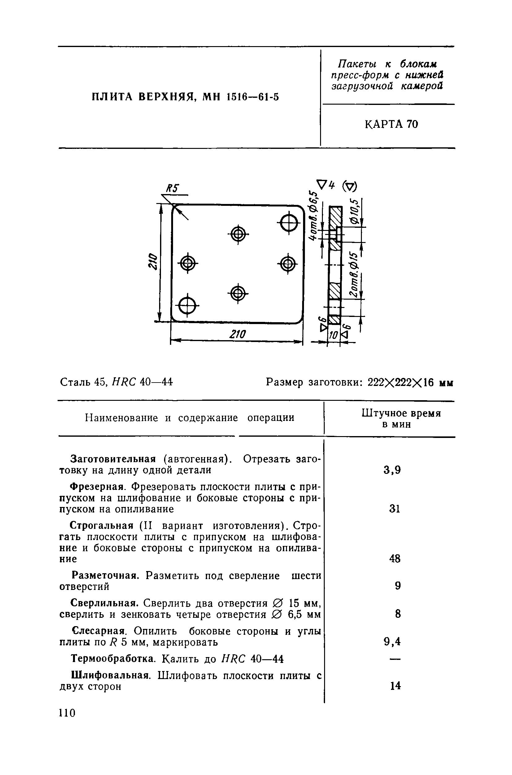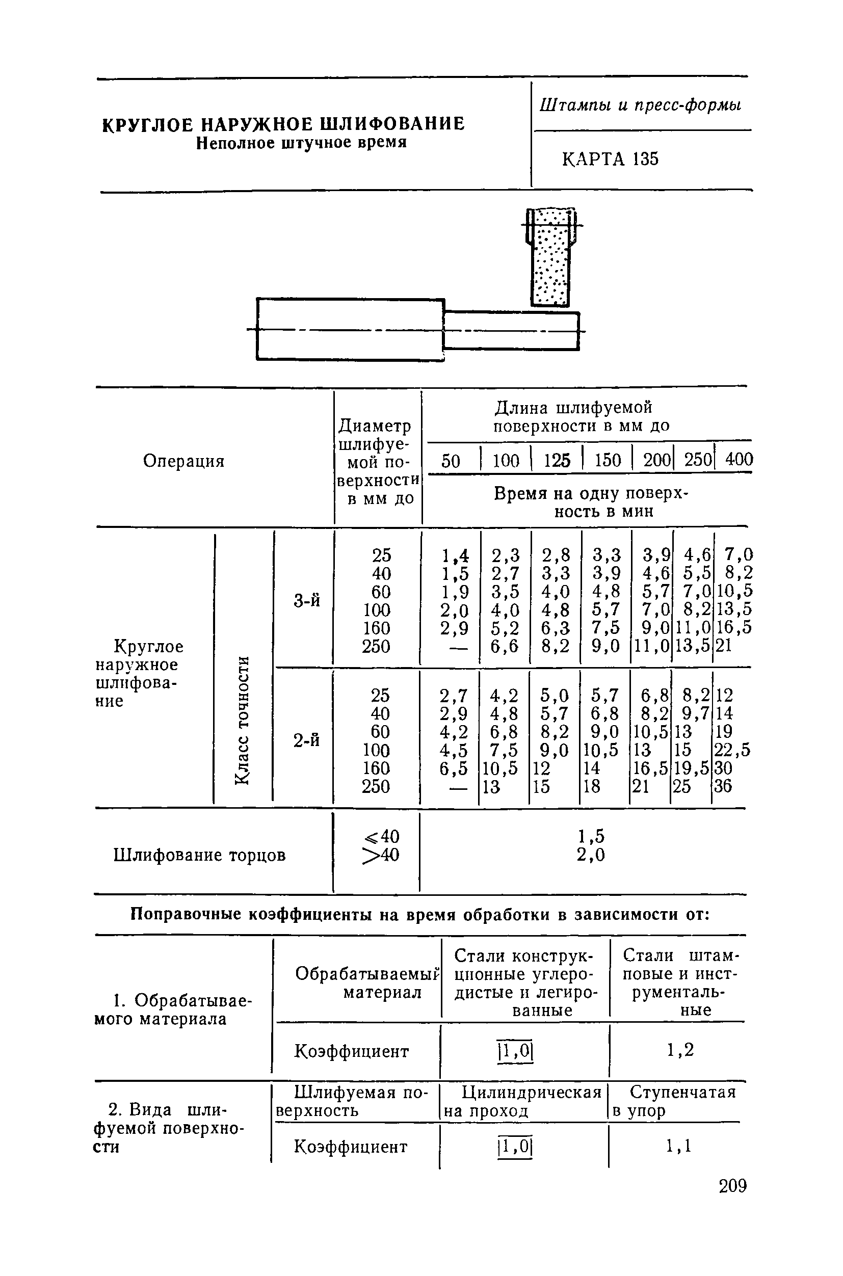 | Оглавление: | I. Типовые нормы времени на изготовление штампов II. Типовые нормы времени на изготовление пресс-форм Универсальные блоки пресс-форм с нижней загрузочной камерой Пакеты к блокам пресс-форм с нижней загрузочной камерой Пресс-формы съемные III. Нормативы неполного штучного времени и нормы времени на операции, не охваченные типовыми нормами времени IV. Подготовительно-заключительное время на партию Приложение 1. Штамп комбинированный, Трудоемкость изготовления Приложение 2. Пресс-формы для прессования изделий из реактопластов. Универсальные блоки с нижней загрузочной камерой, МН 1515-61. Трудоемкость изготовления Приложение 3. Пакеты к блокам пресс-форм с нижней загрузочной камерой, МН 1516-61 Приложение 4. Пресс-формы съемные круглые прямого прессования с двумя плоскостями разъема, МН 1452-61. Трудоемкость изготовления Приложение 5. Пресс-формы съемные прямоугольные литьевого прессования с двумя плоскостями разъема и двумя пуансонодержателями, МН 1461-61. Трудоемкость изготовления Приложение 6. Режимы резания, принятые при изготовлении штампов и пресс-форм Приложение 7. Припуски на механическую обработку Приложение 8. Перечень типовых моделей оборудования инструментального цеха штампов и пресс-форм Приложение 9. Теоретический вес заготовк |